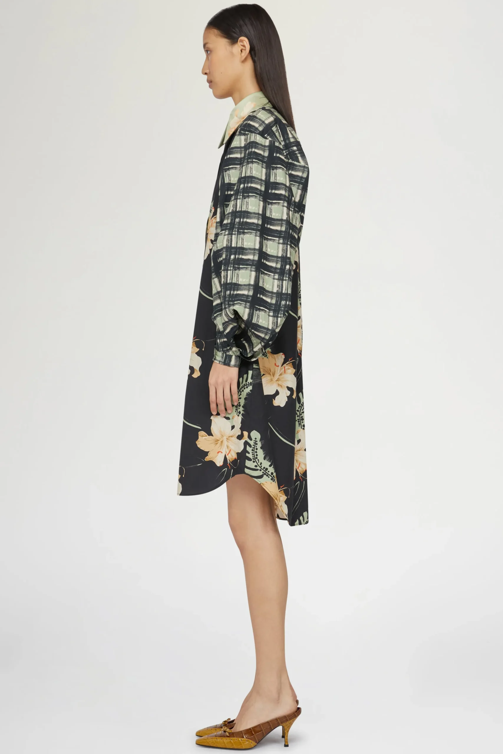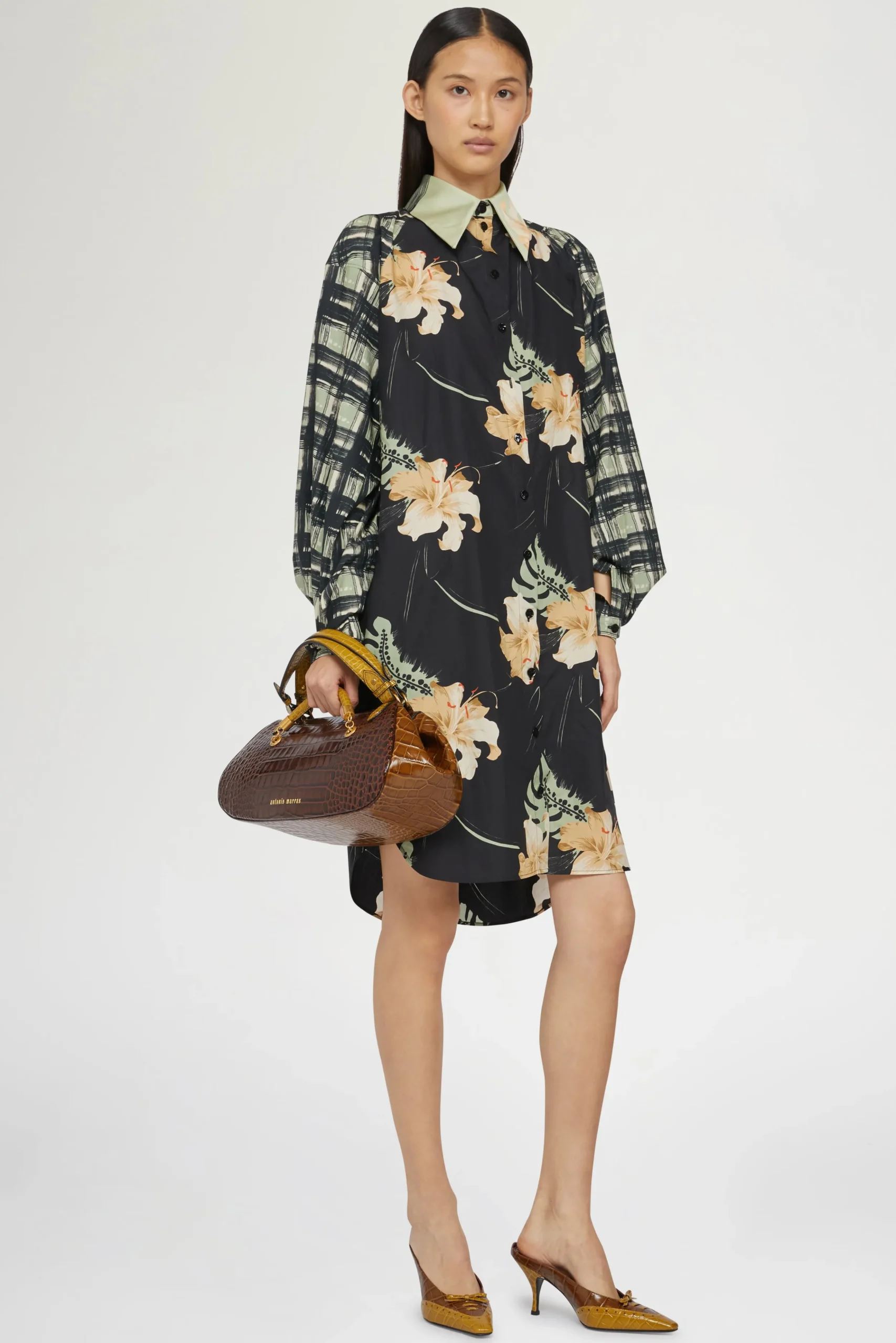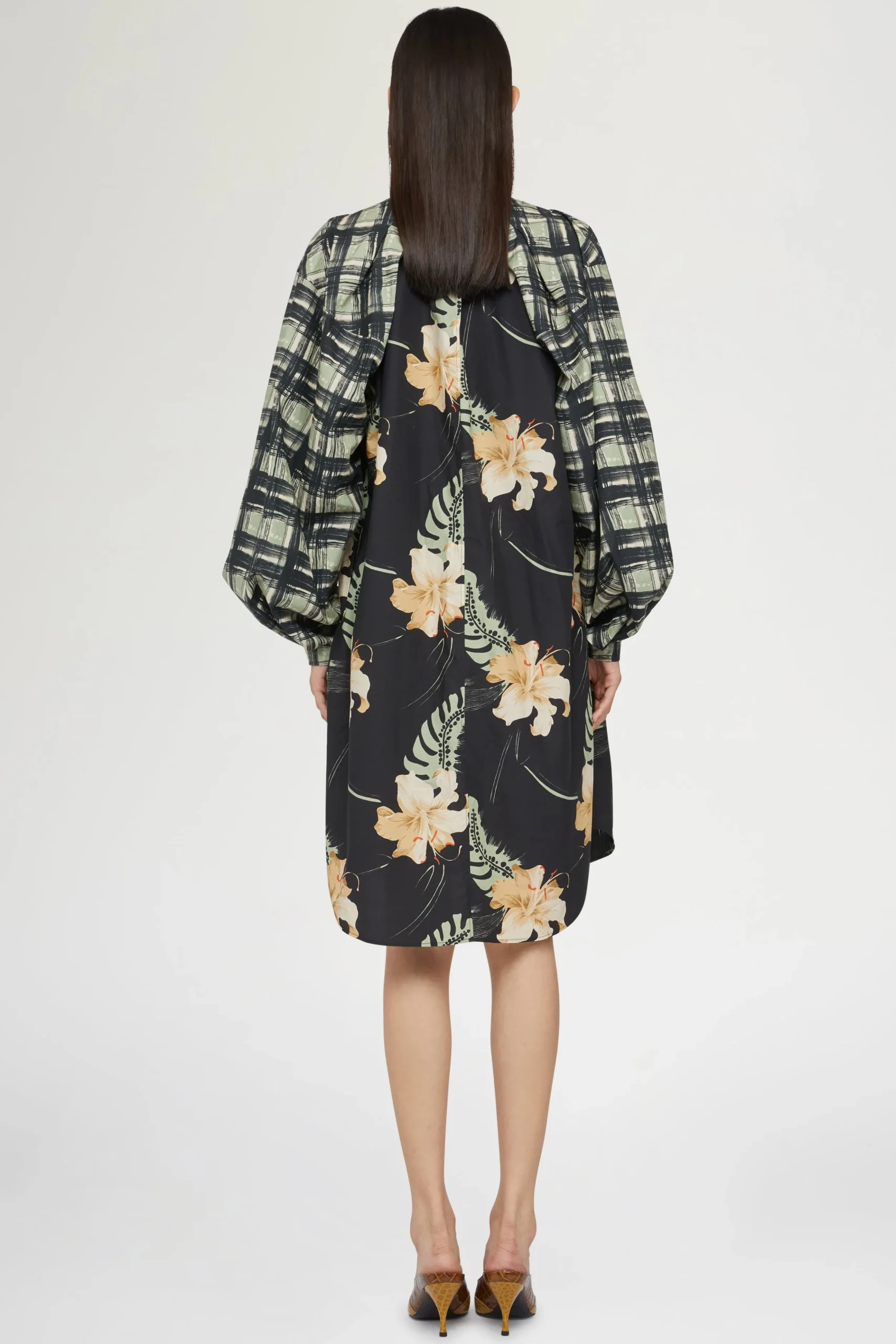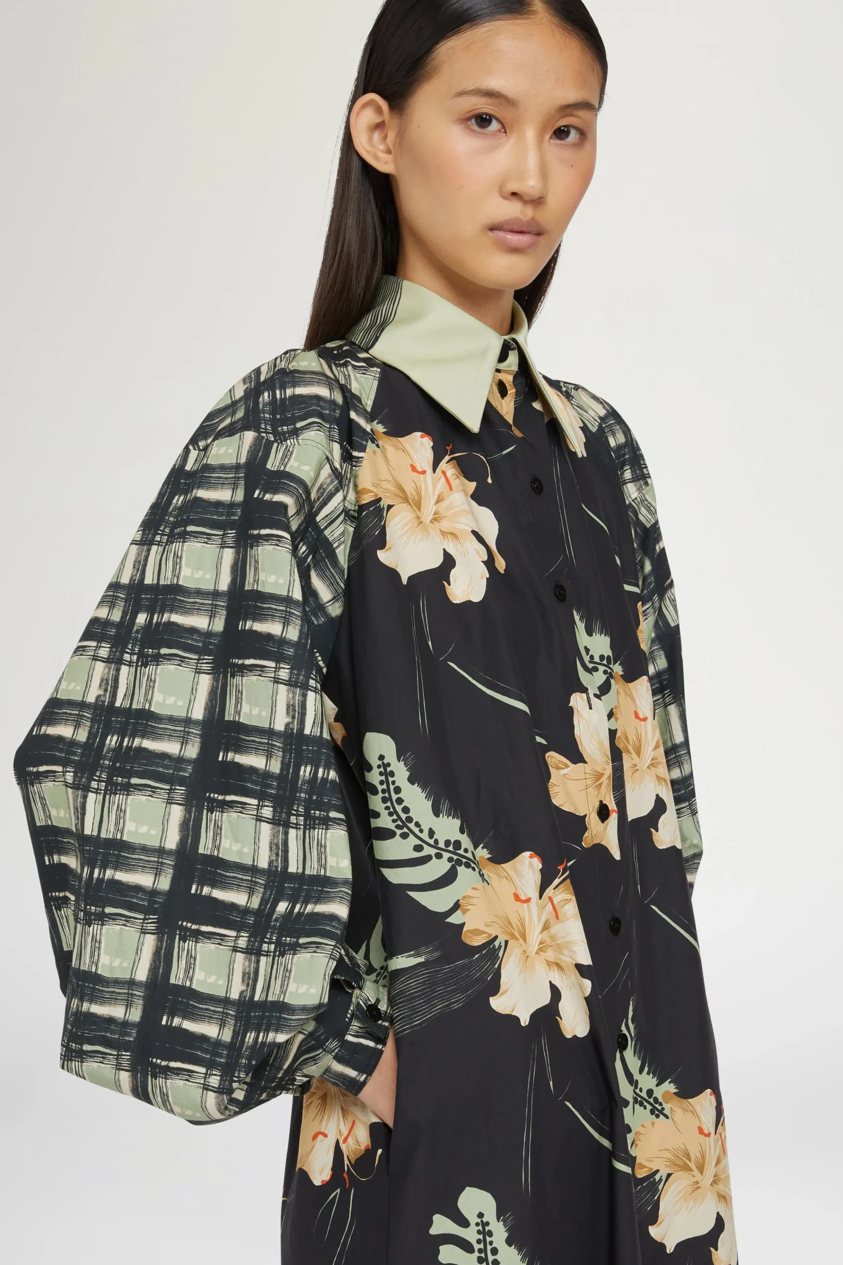 Abito camicia in cotone con stampa floreale tropicale e maniche a quadri.