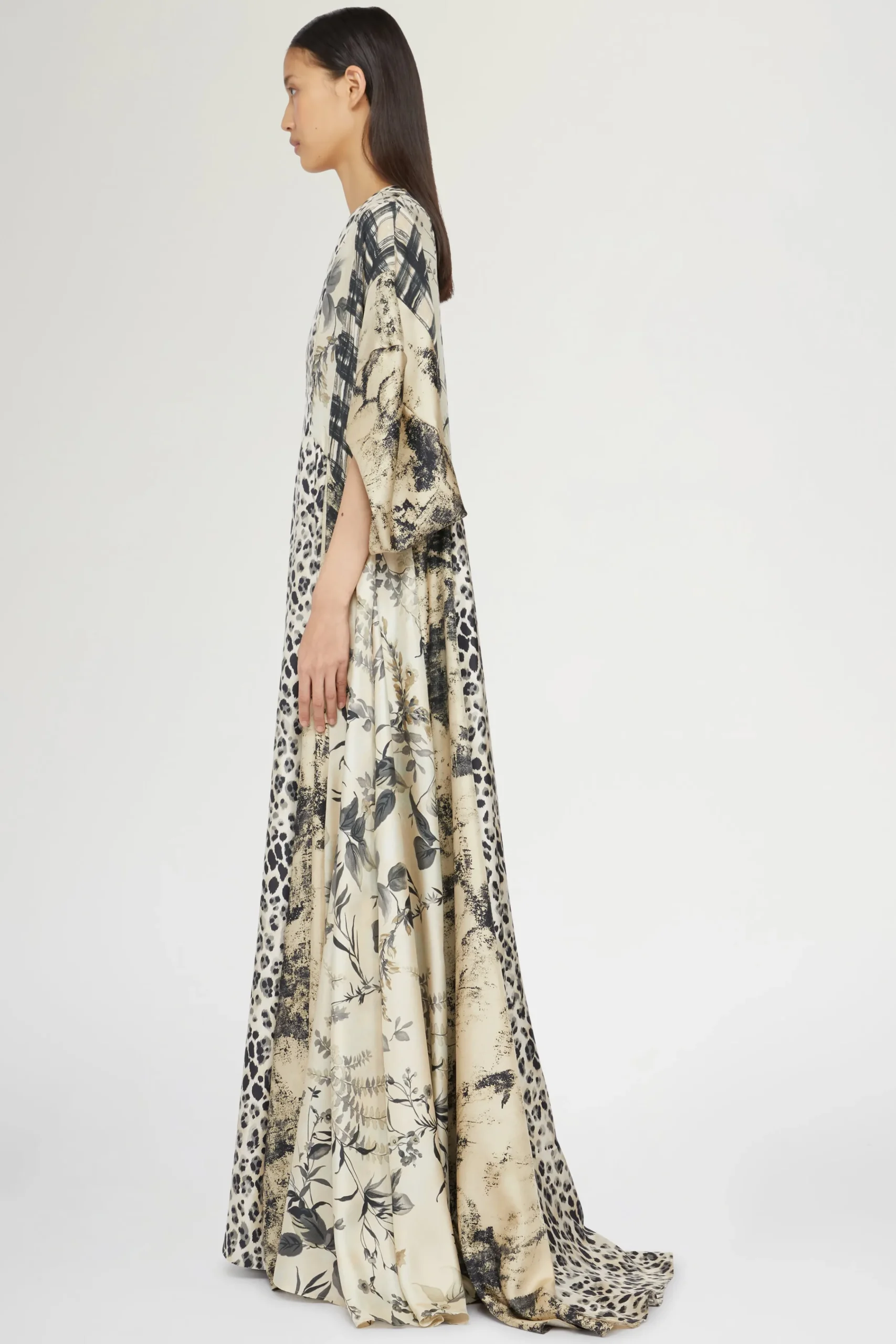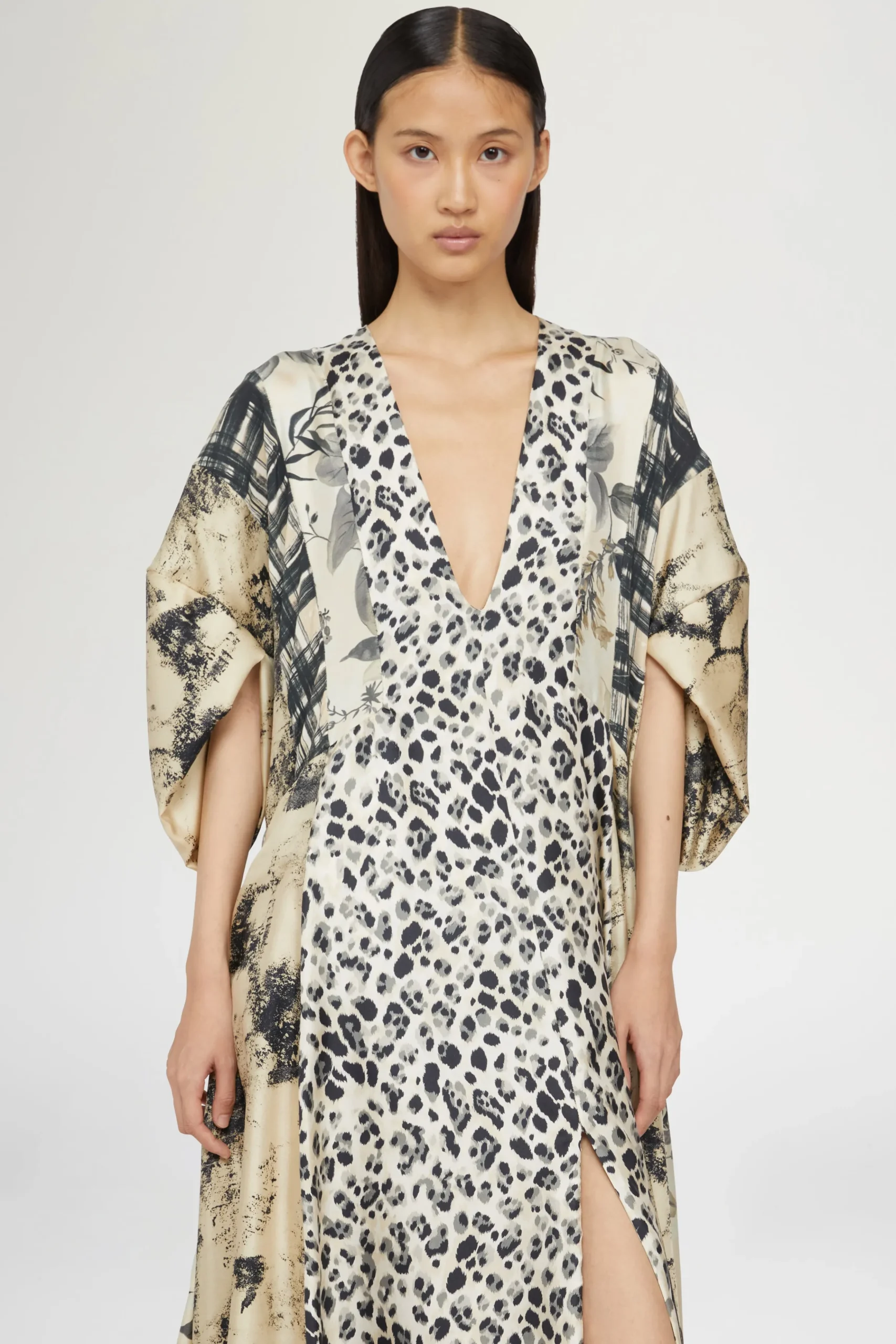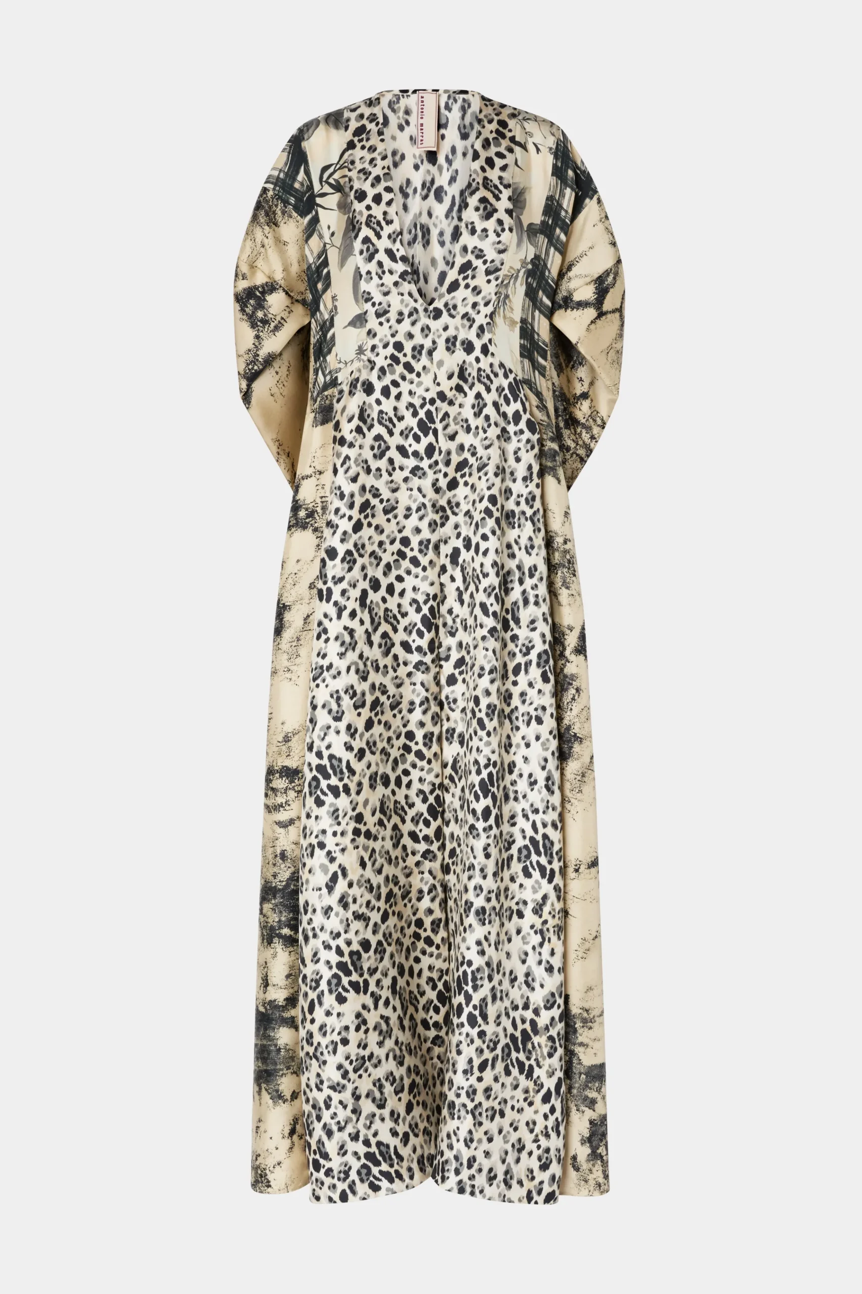 Abito maxi realizzato in 100% seta con spacco frontale, scollatura a V e stampa leopardata.