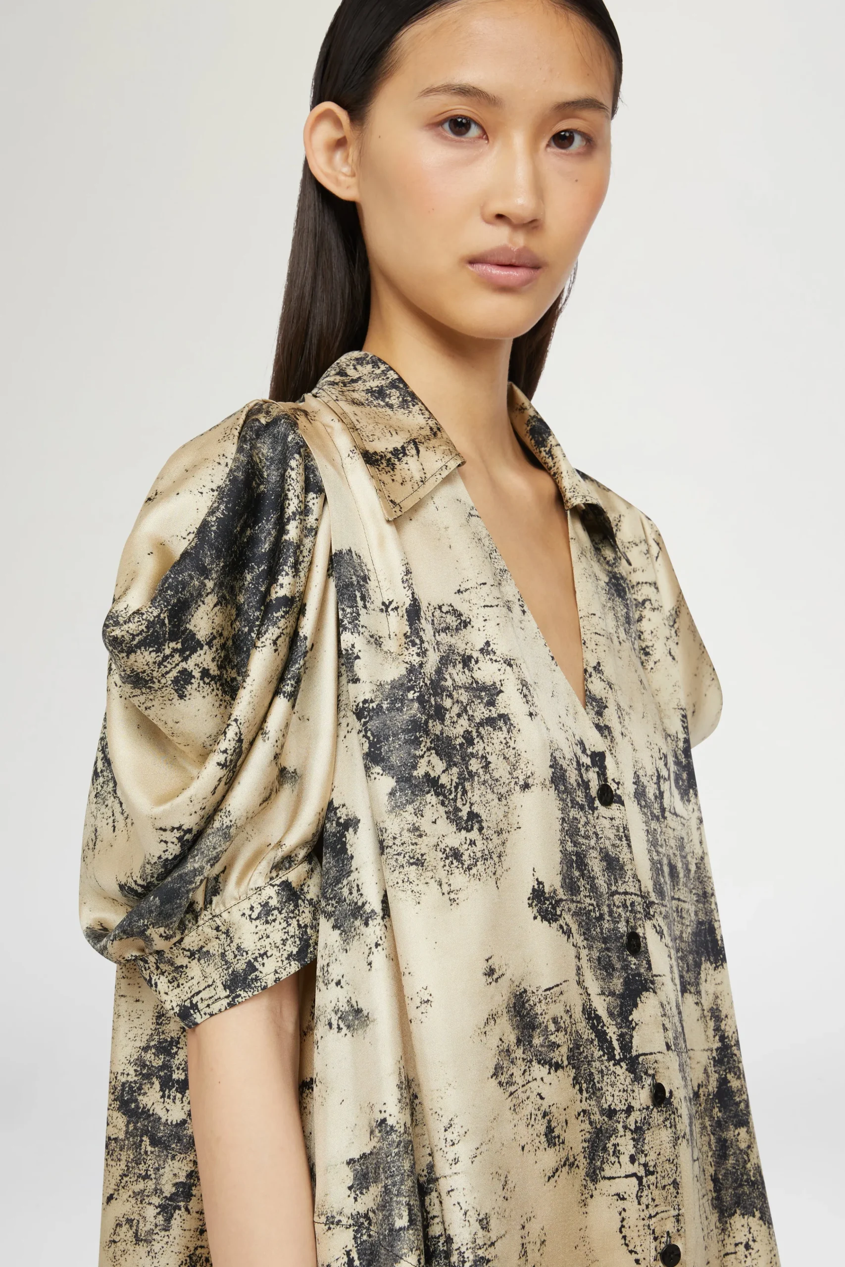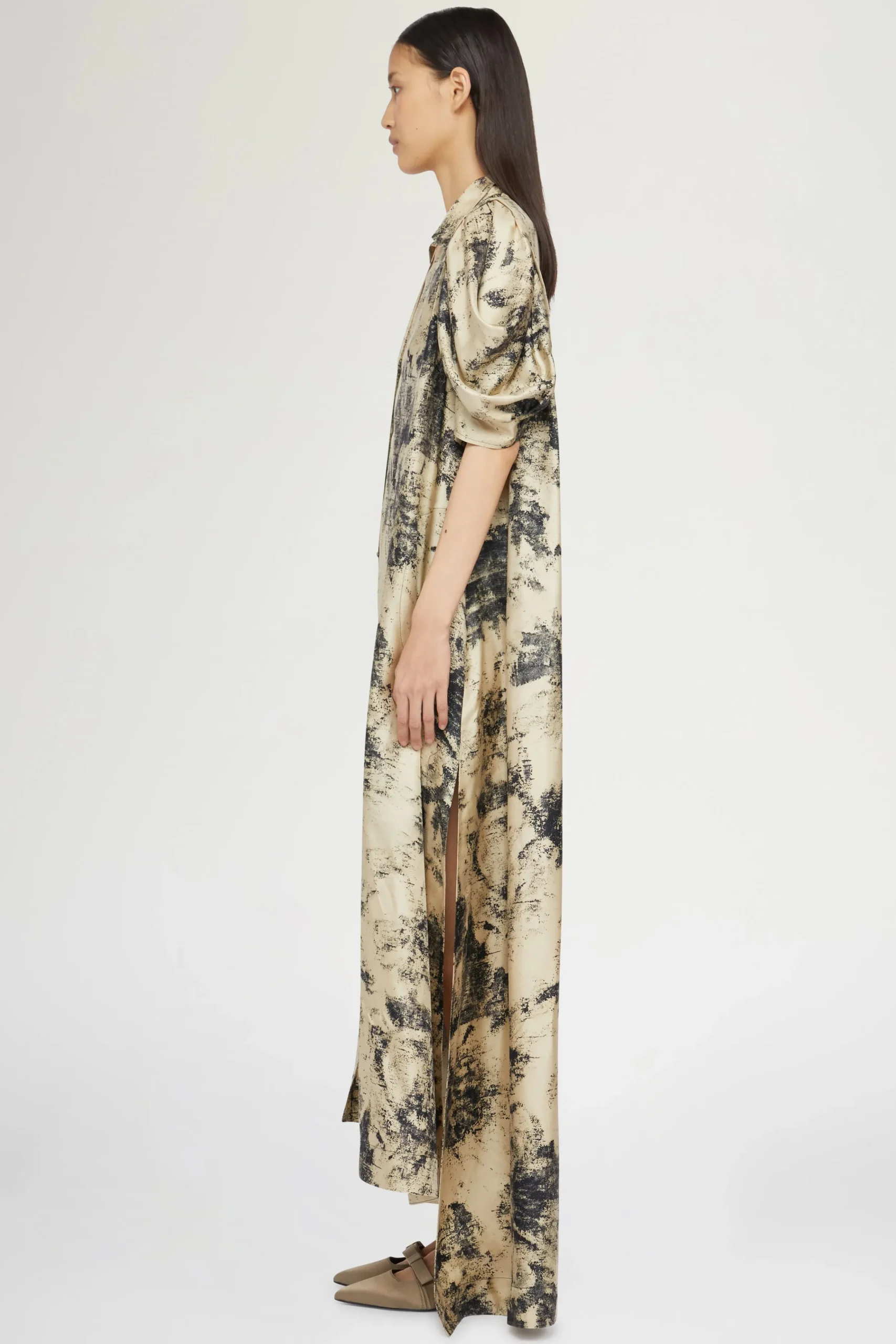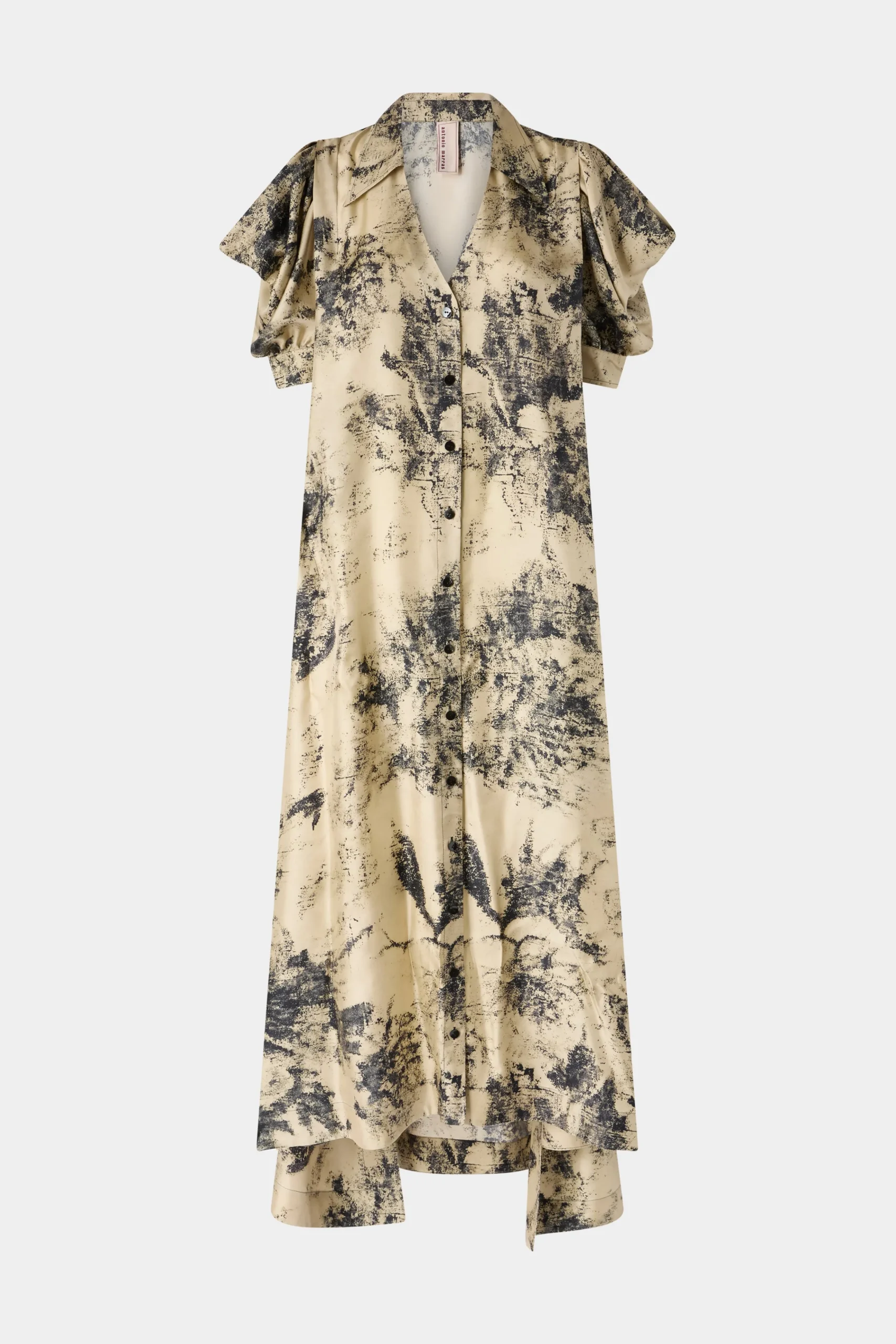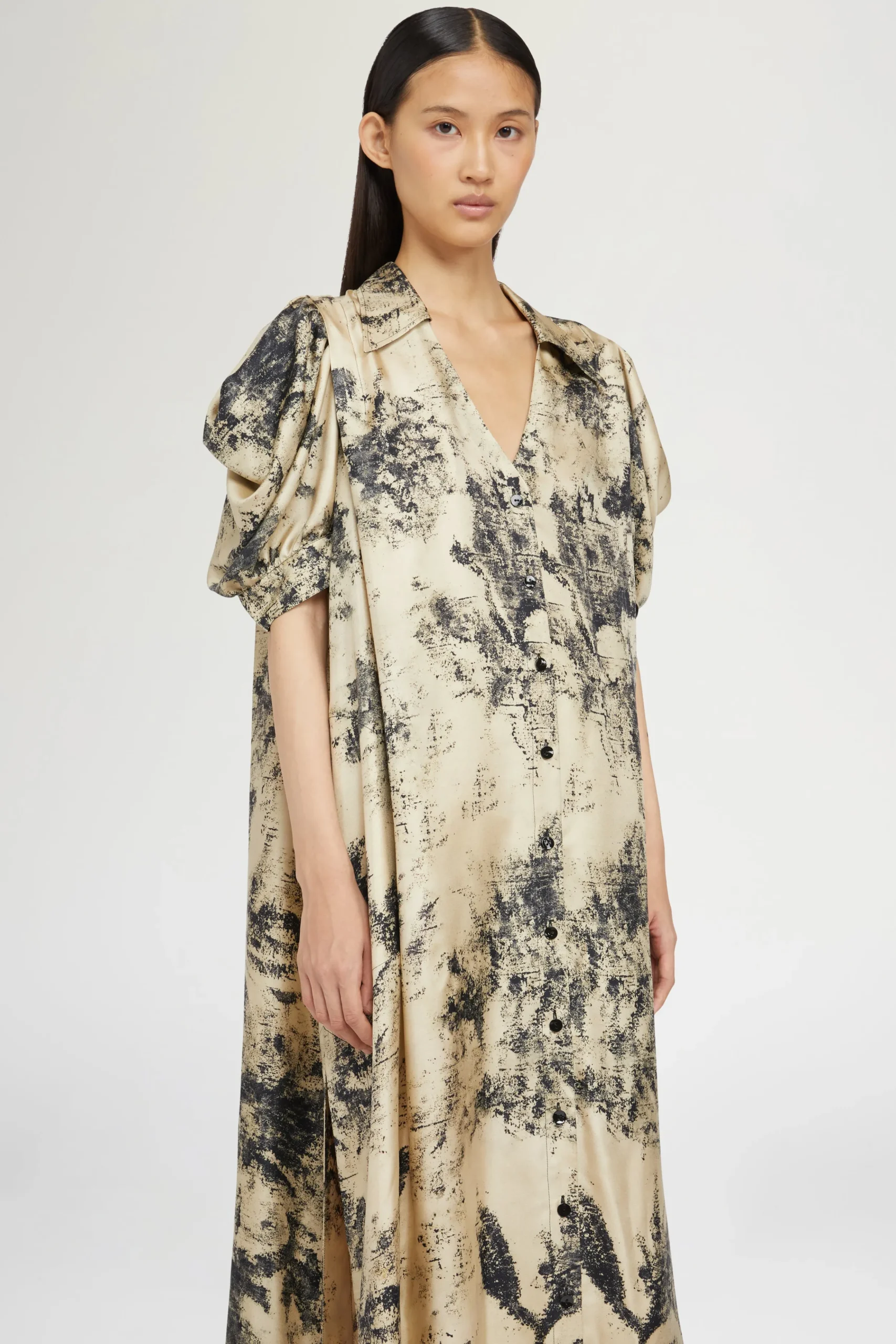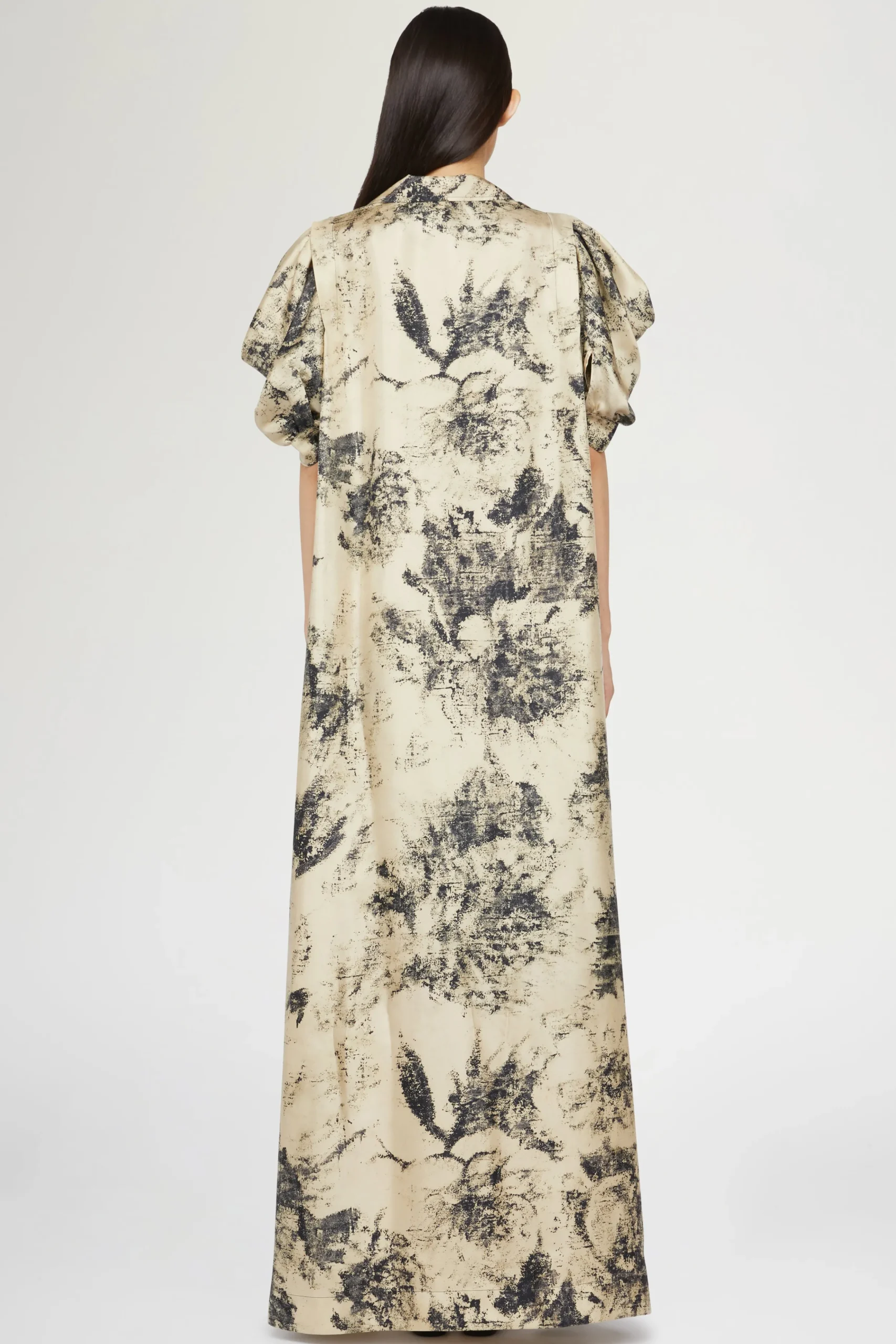 Abito chemisier lungo e ampio in 100% lussuosa seta con stampa tropicale.