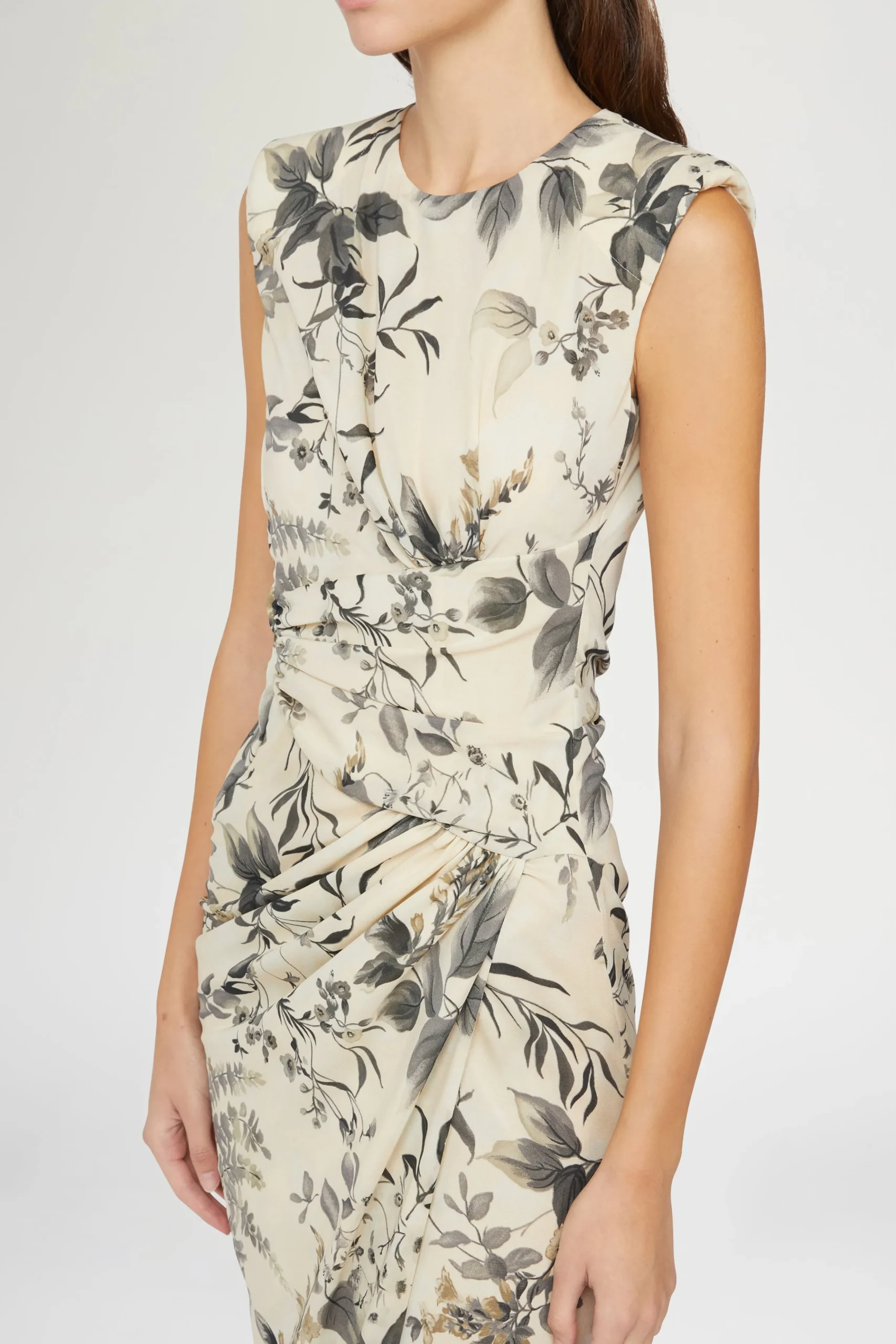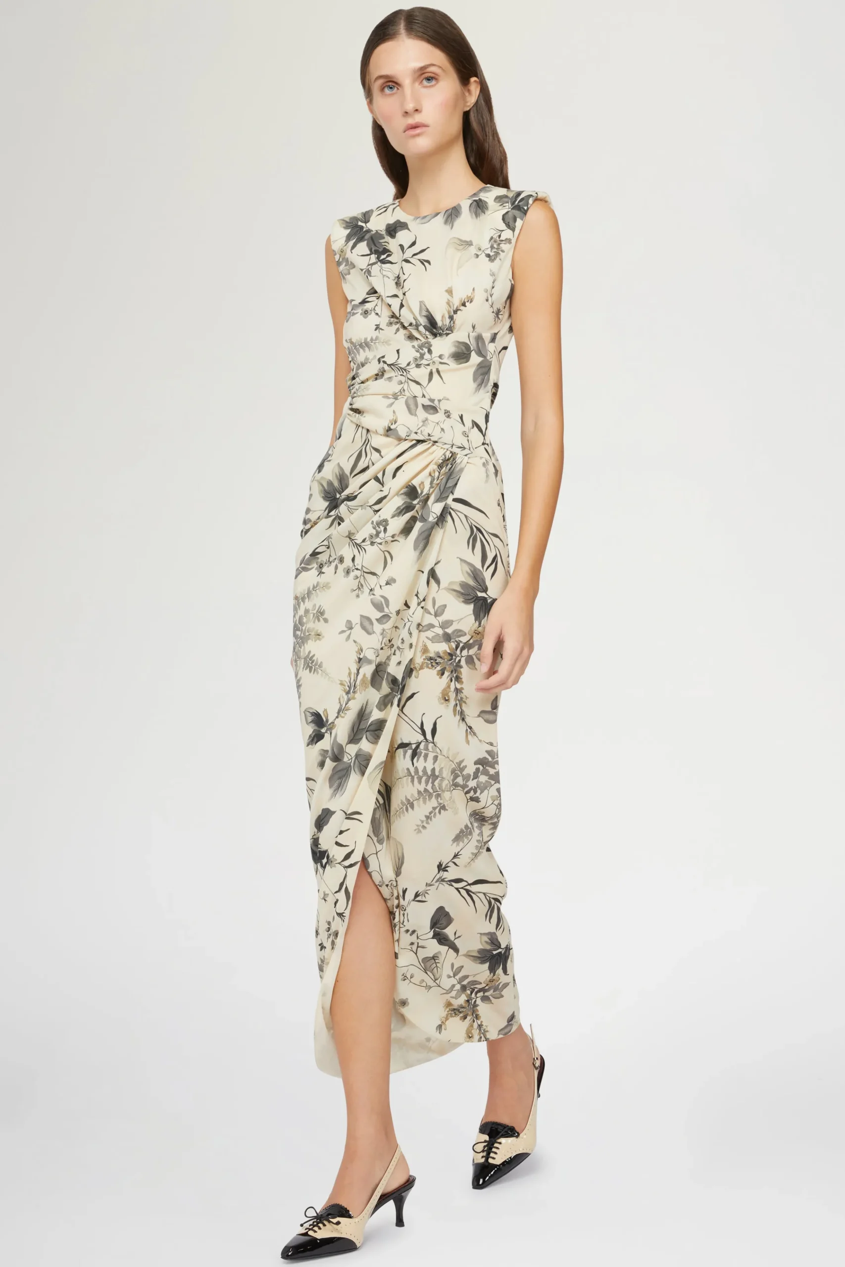 Abito midi senza maniche in satin con stampa floreale, drappeggi eleganti e uno spacco frontale per una silhouette raffinata e femminile. La raccolta asimmetrica in vita esalta la figura con un movimento grazioso.