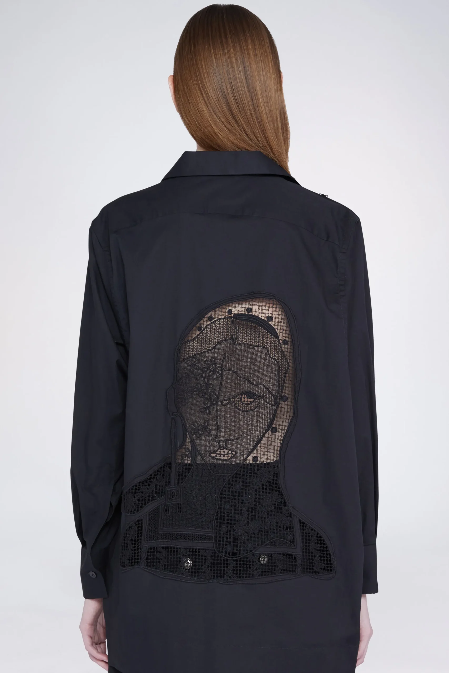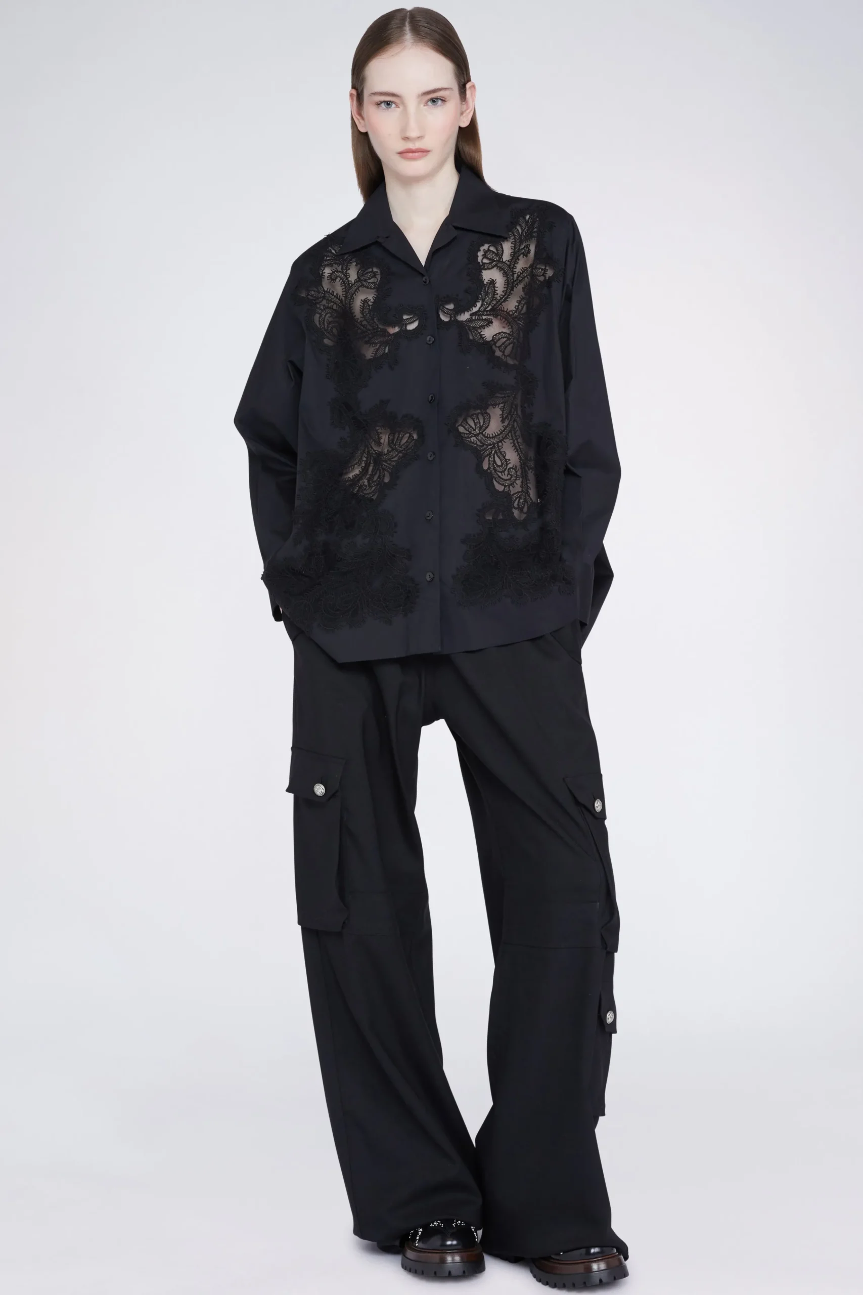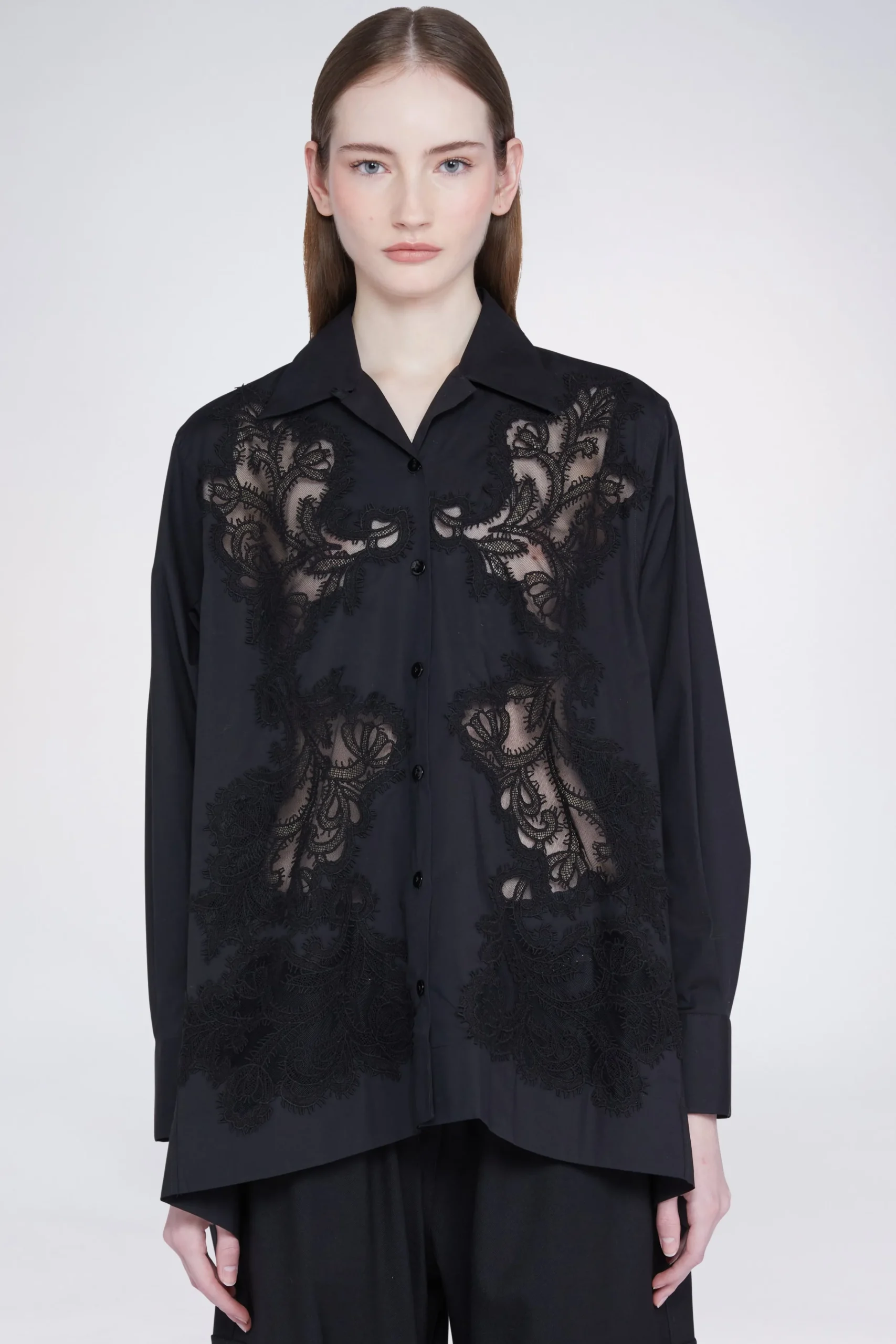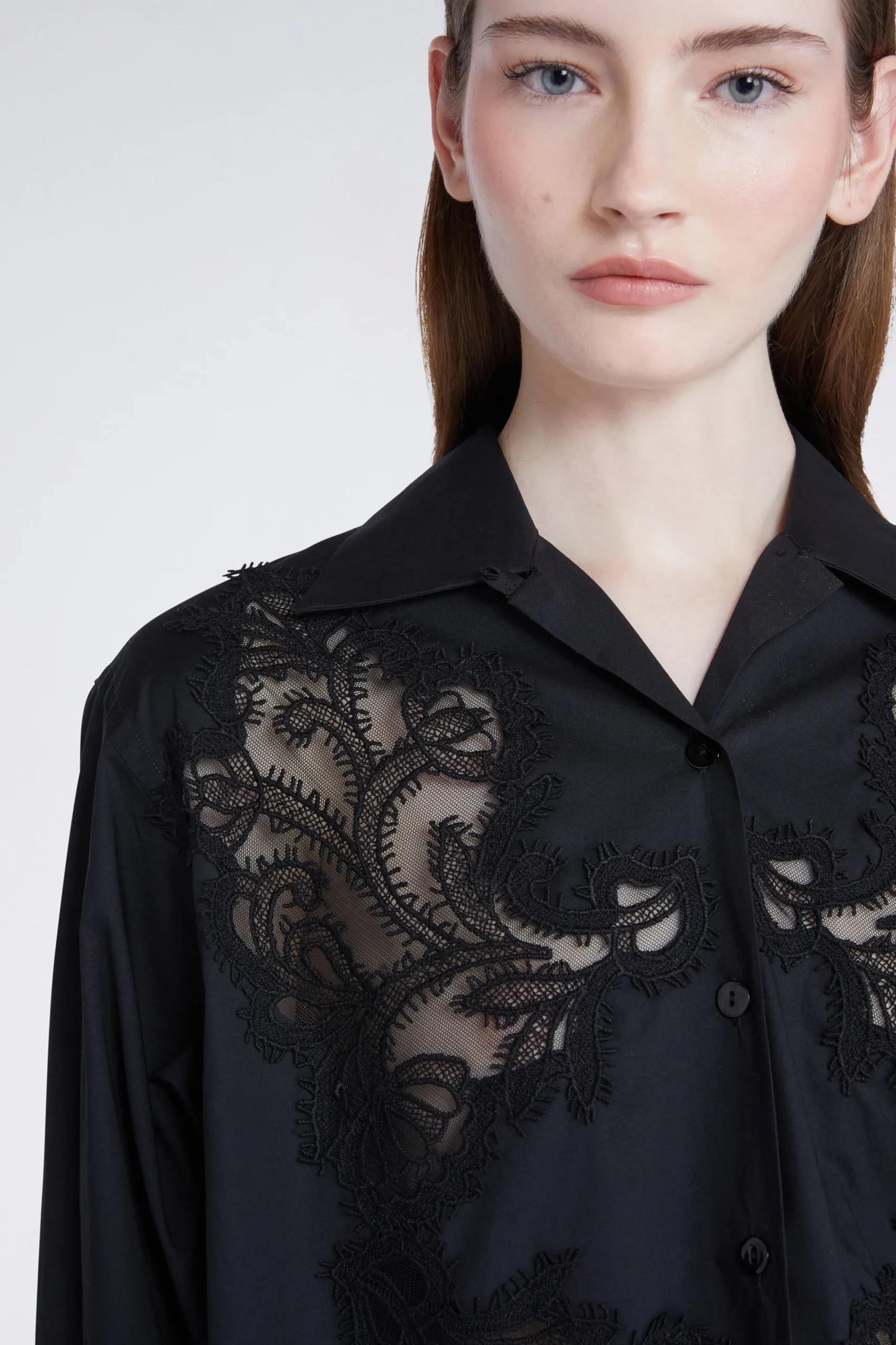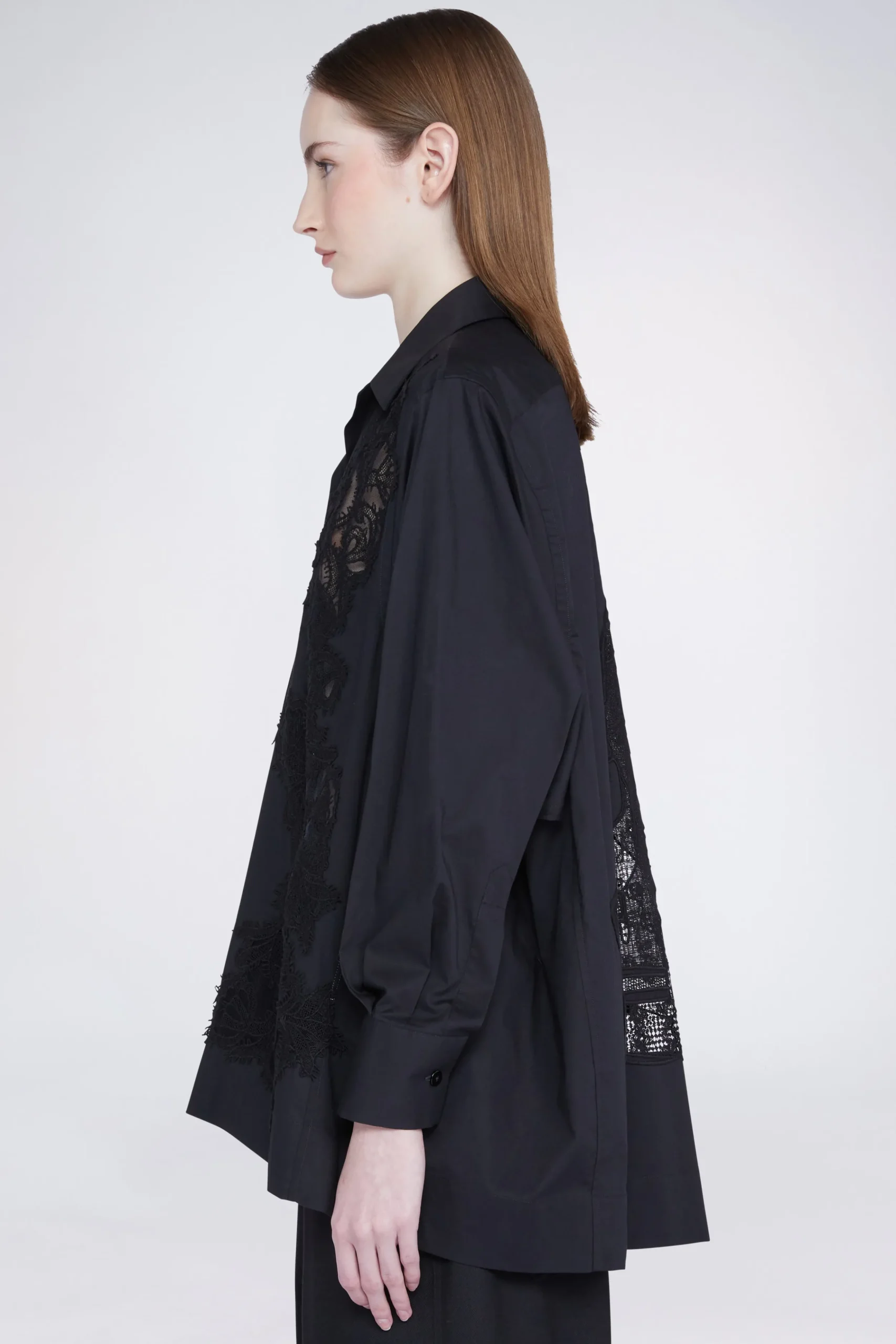Camicia nera in cotone dalla vestibilità oversize, caratterizzata da intricati pannelli in pizzo e dettagli in macramè sul retro.