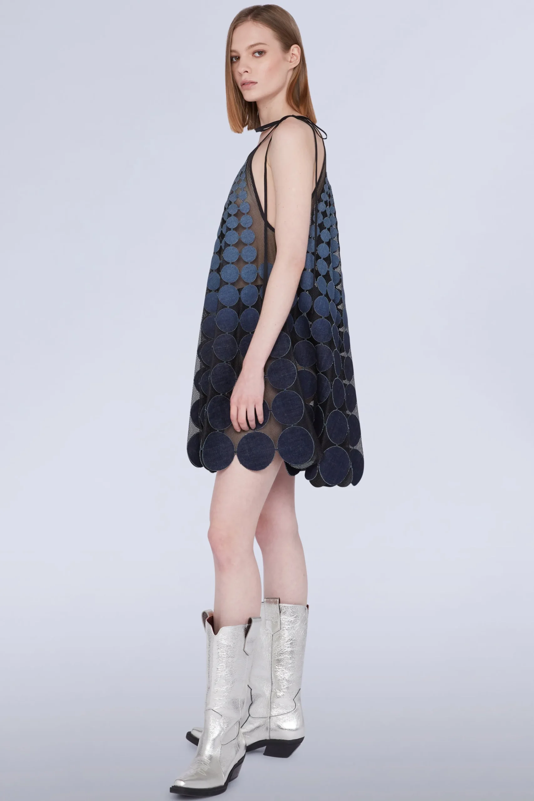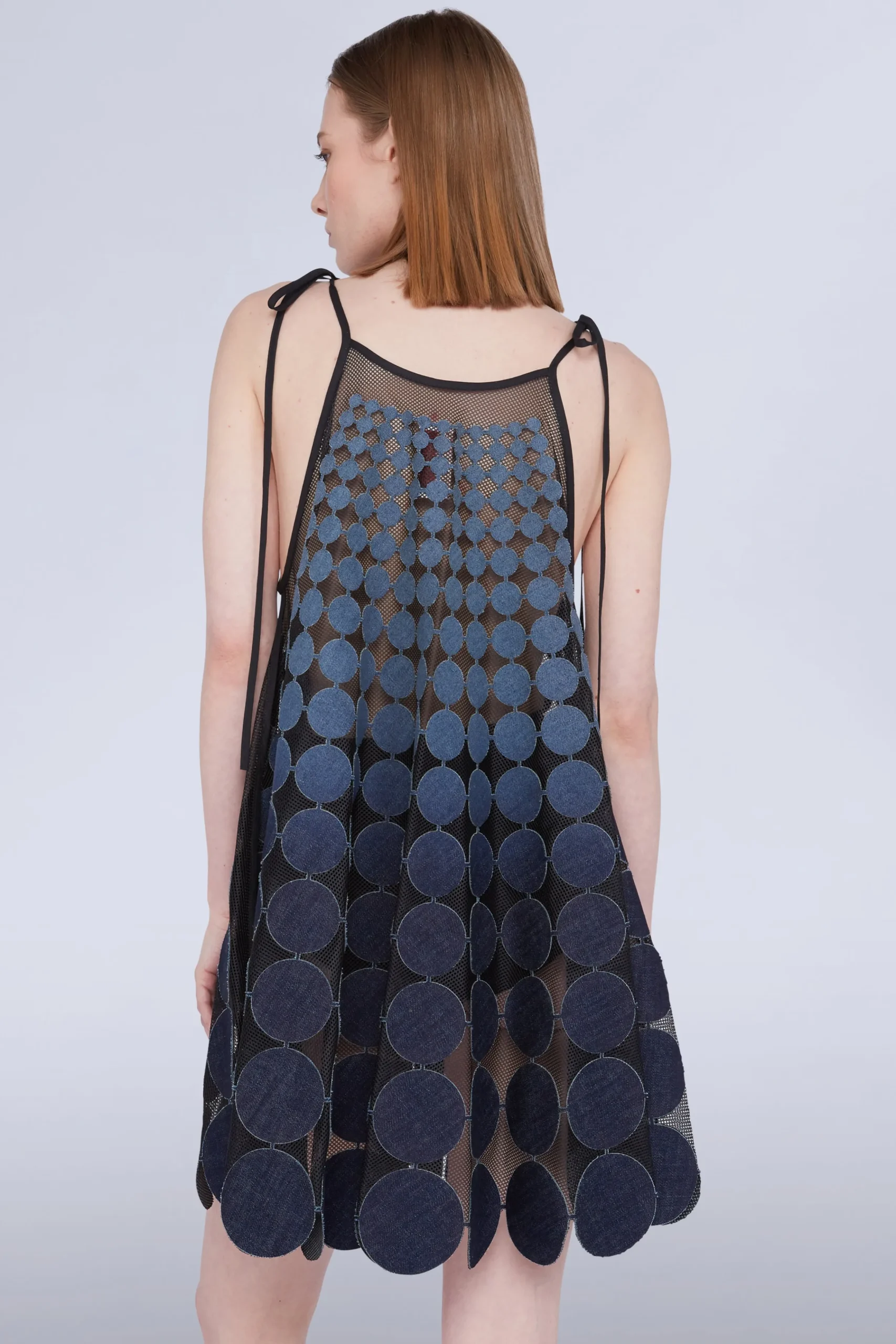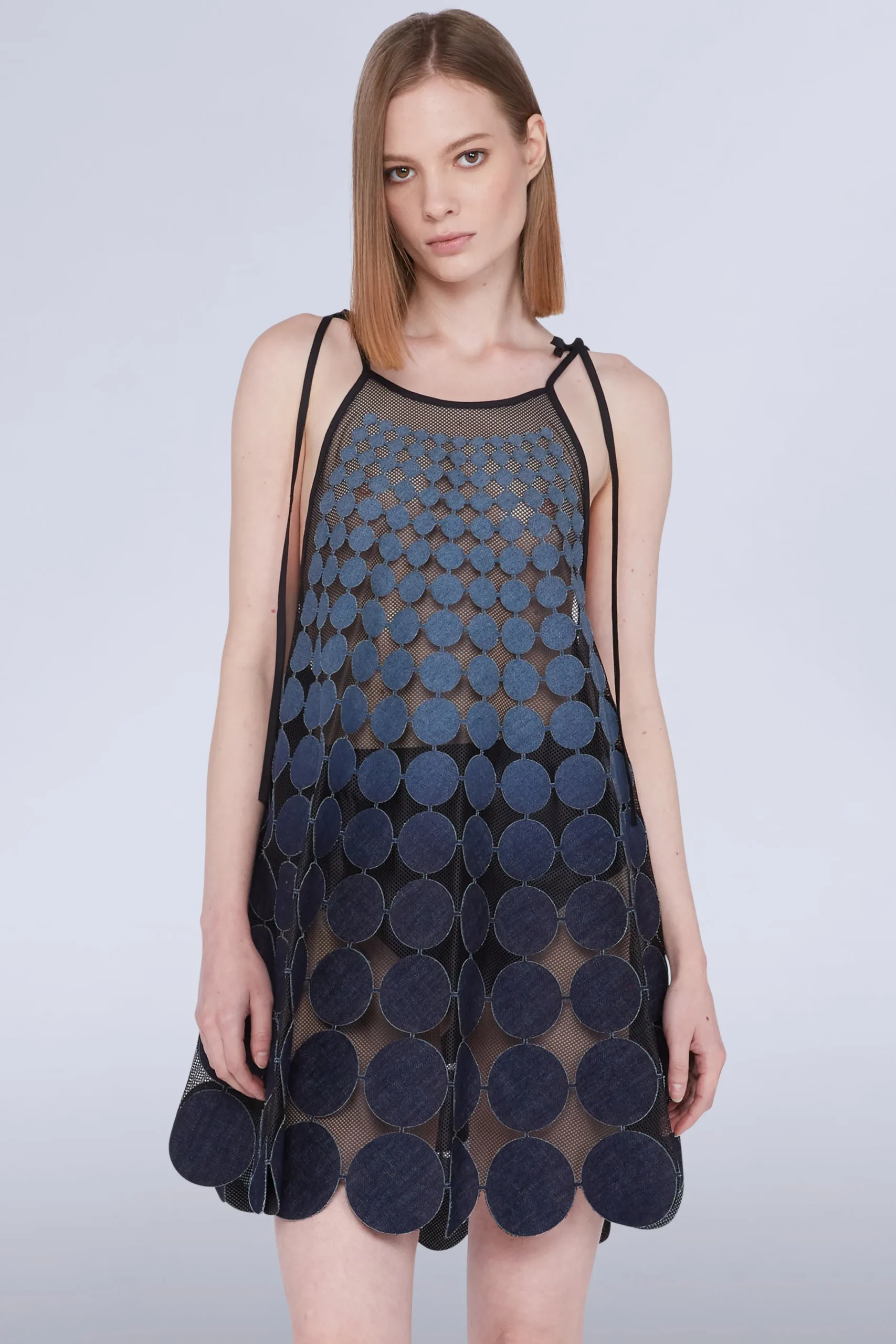 Abito mini senza maniche con dischi circolari blu disposti su un tessuto a rete trasparente.