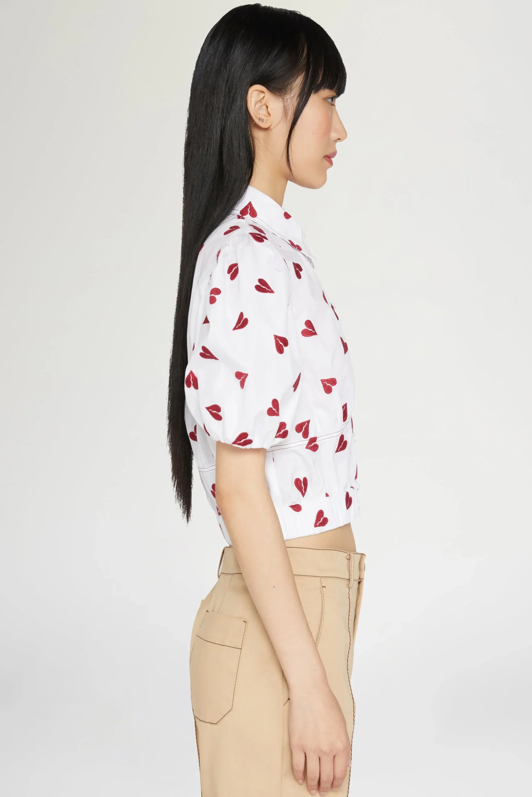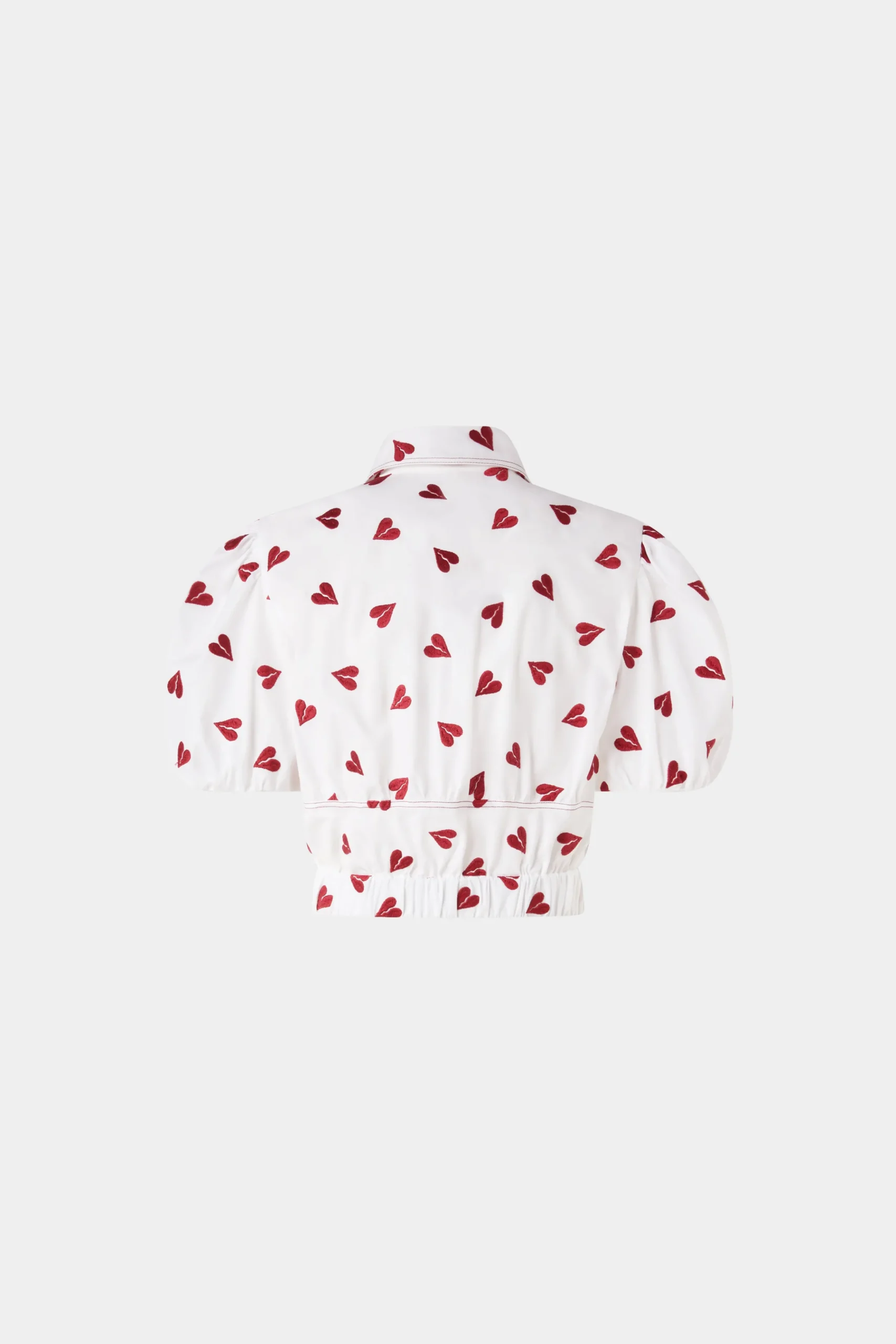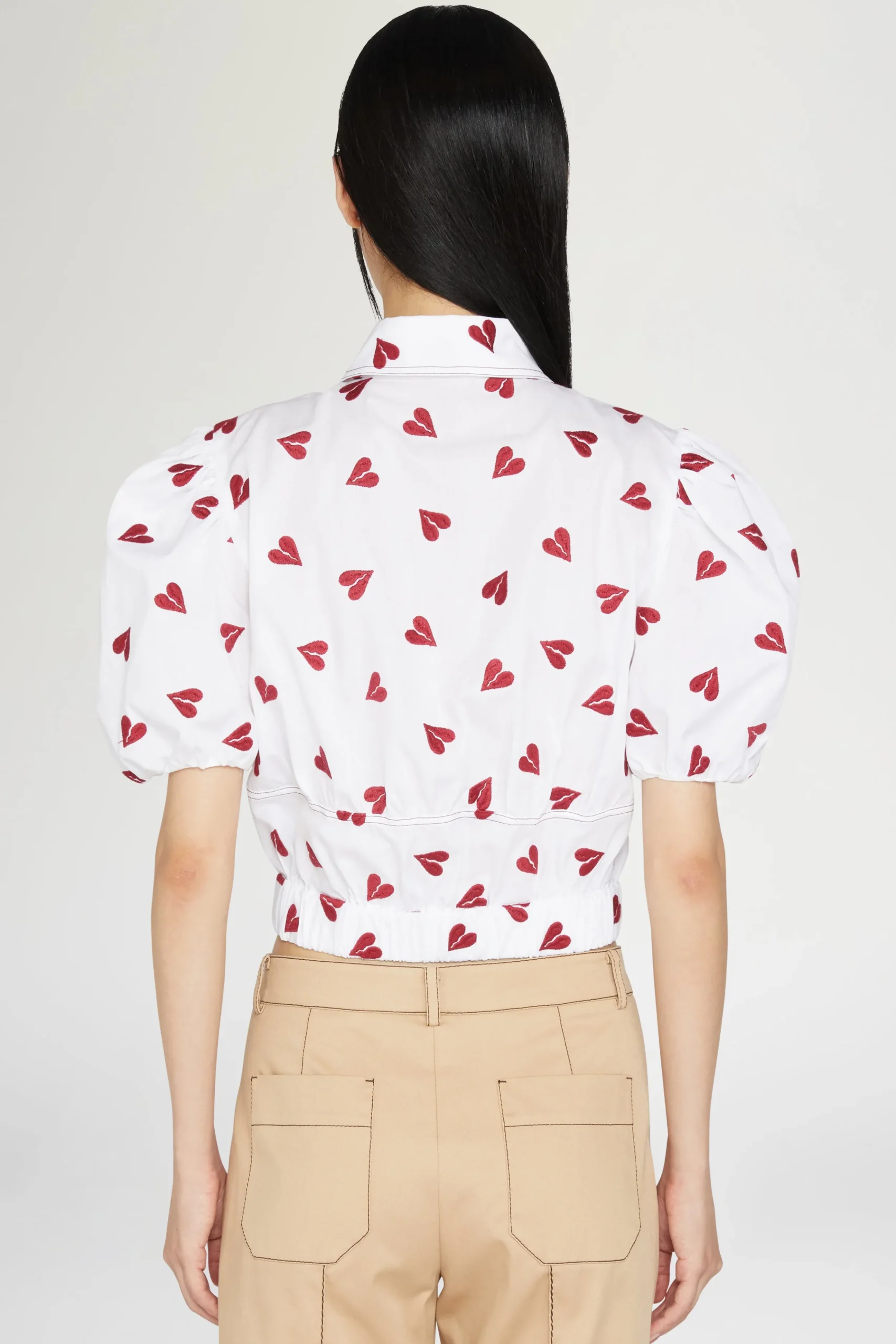 Camicia bianca cropped con maniche a sbuffo voluminose, caratterizzata da ricami a forma di cuore rossi e una vita aderente per una silhouette lusinghiera.