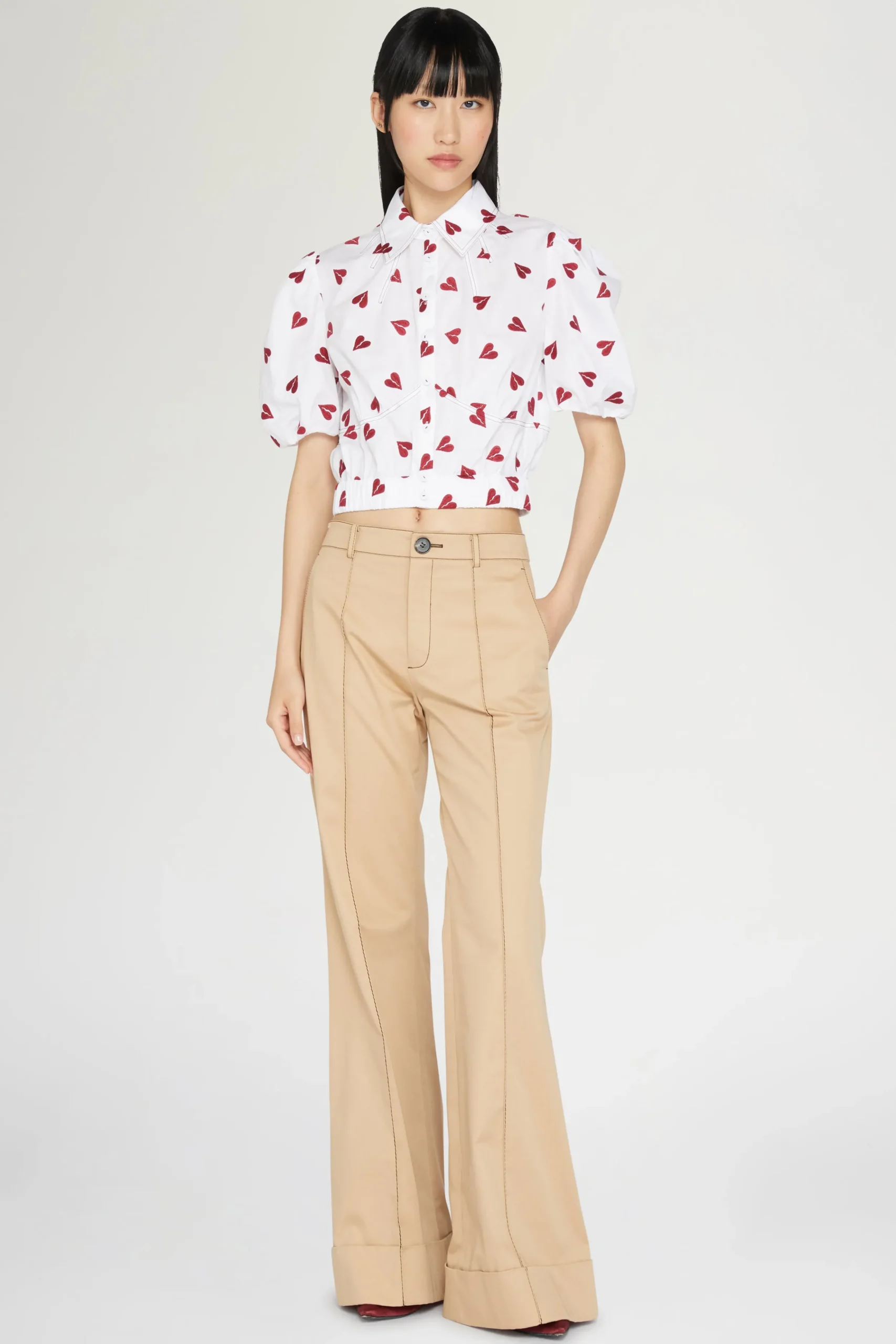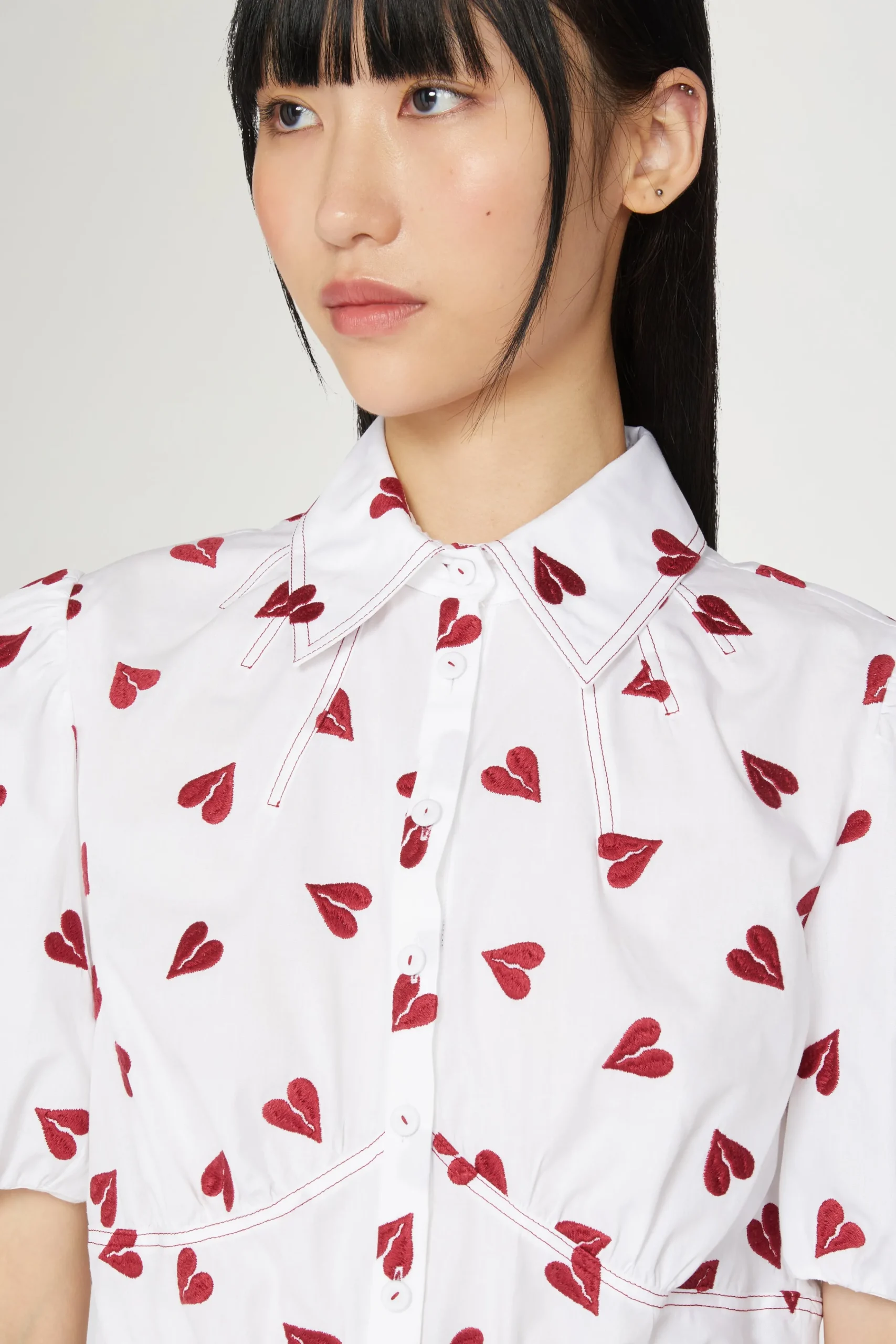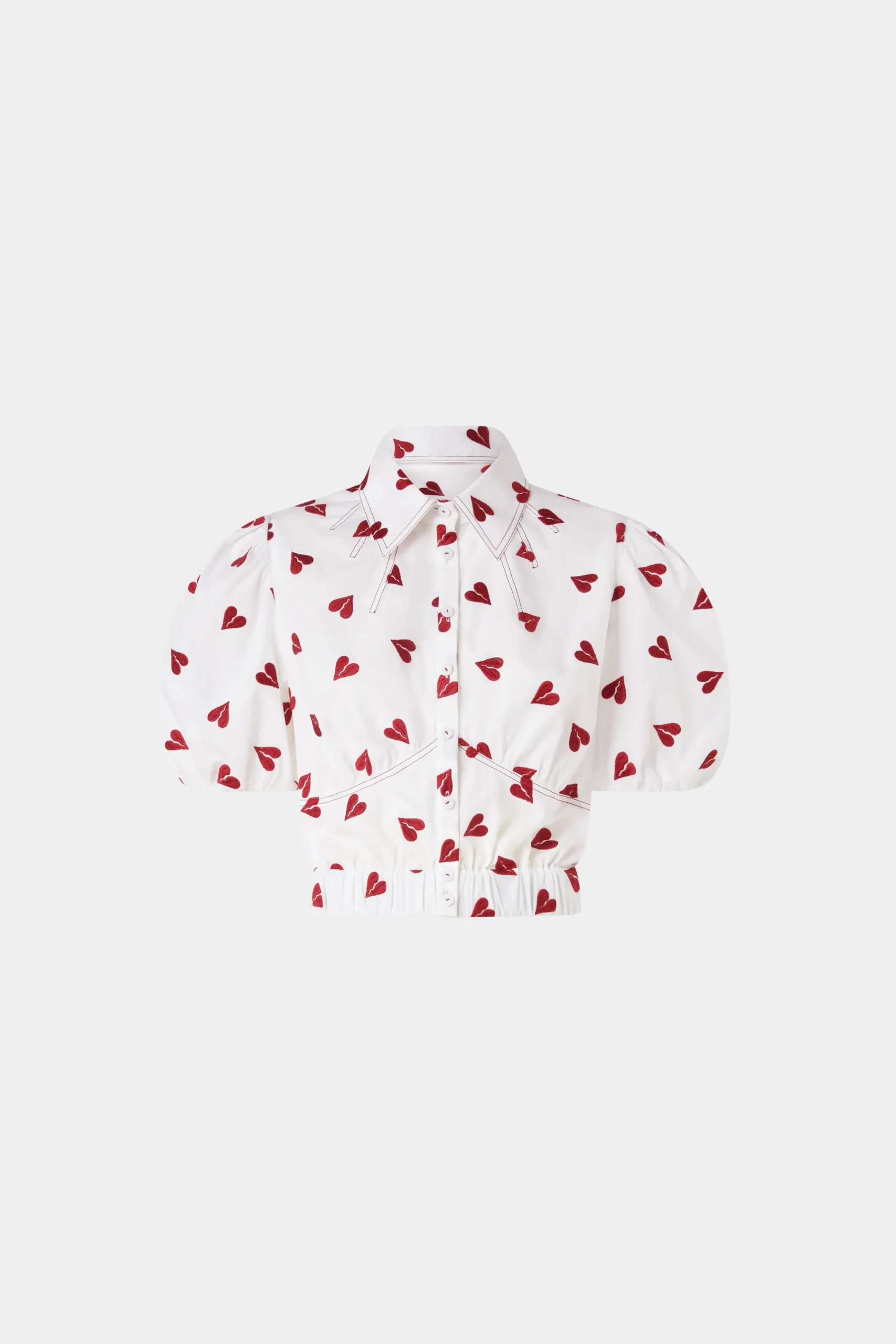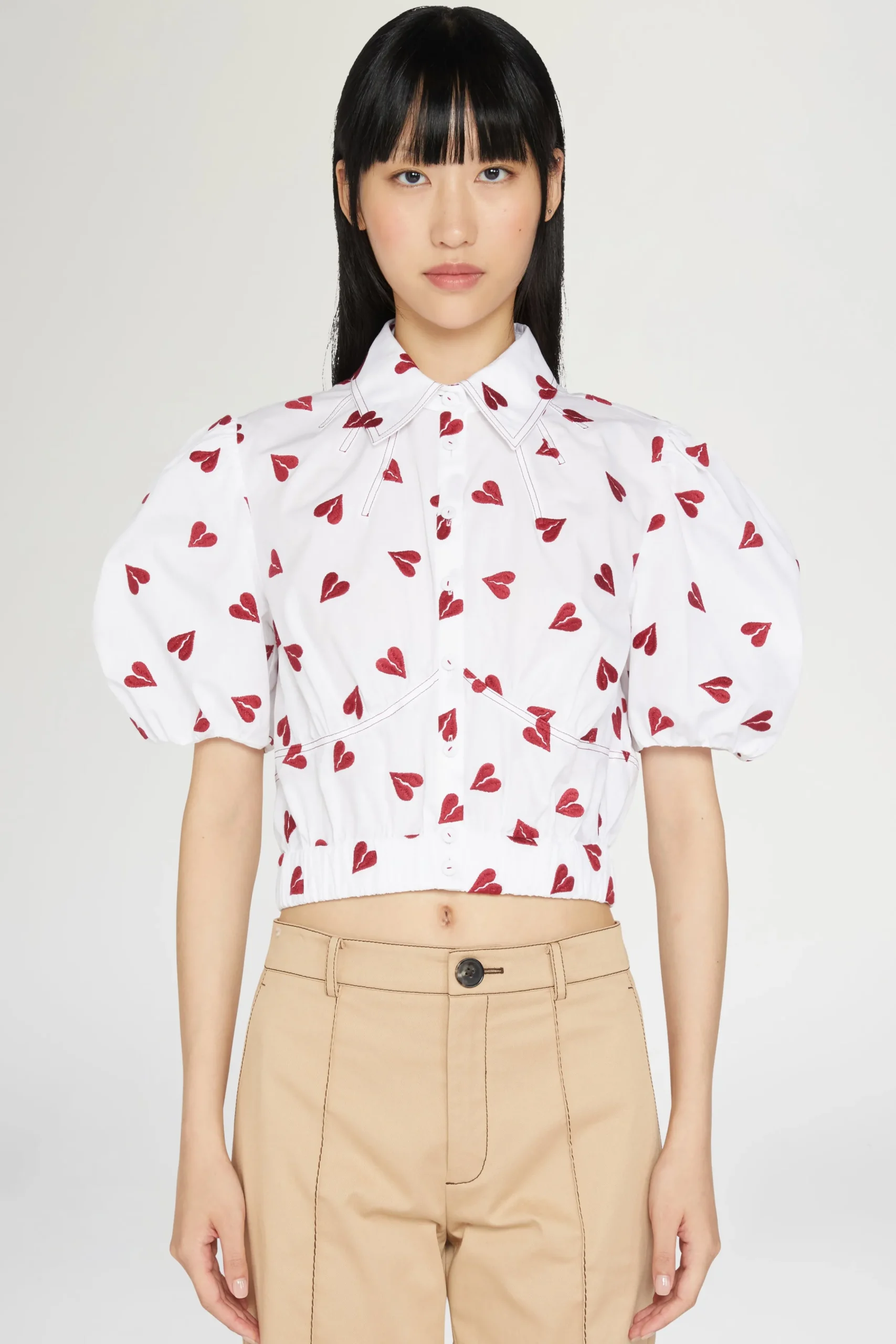 Camicia bianca cropped con maniche a sbuffo voluminose, caratterizzata da ricami a forma di cuore rossi e una vita aderente per una silhouette lusinghiera.