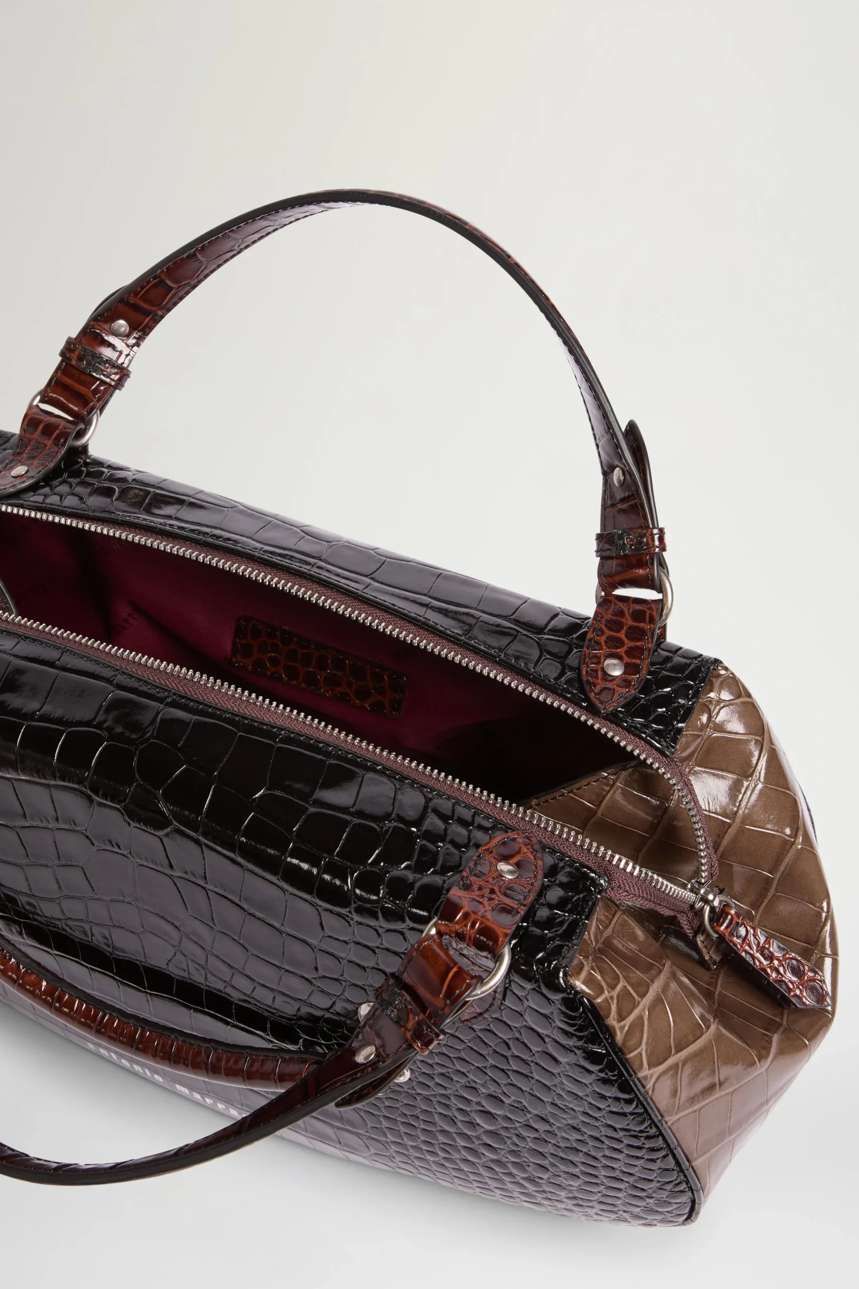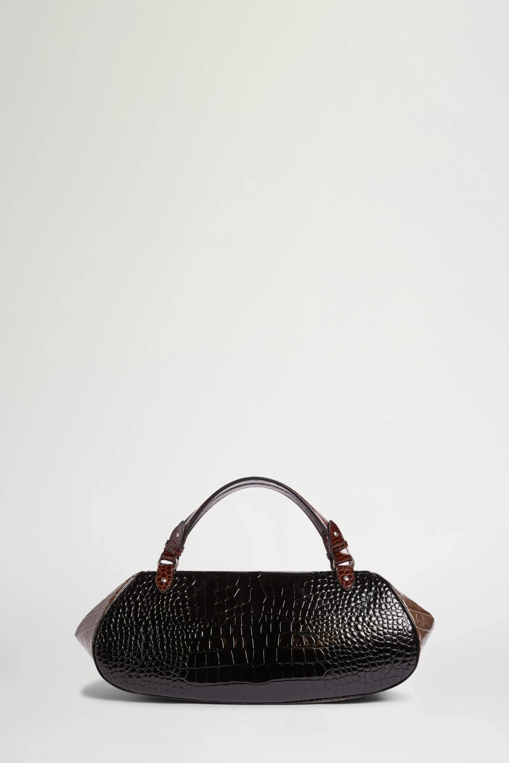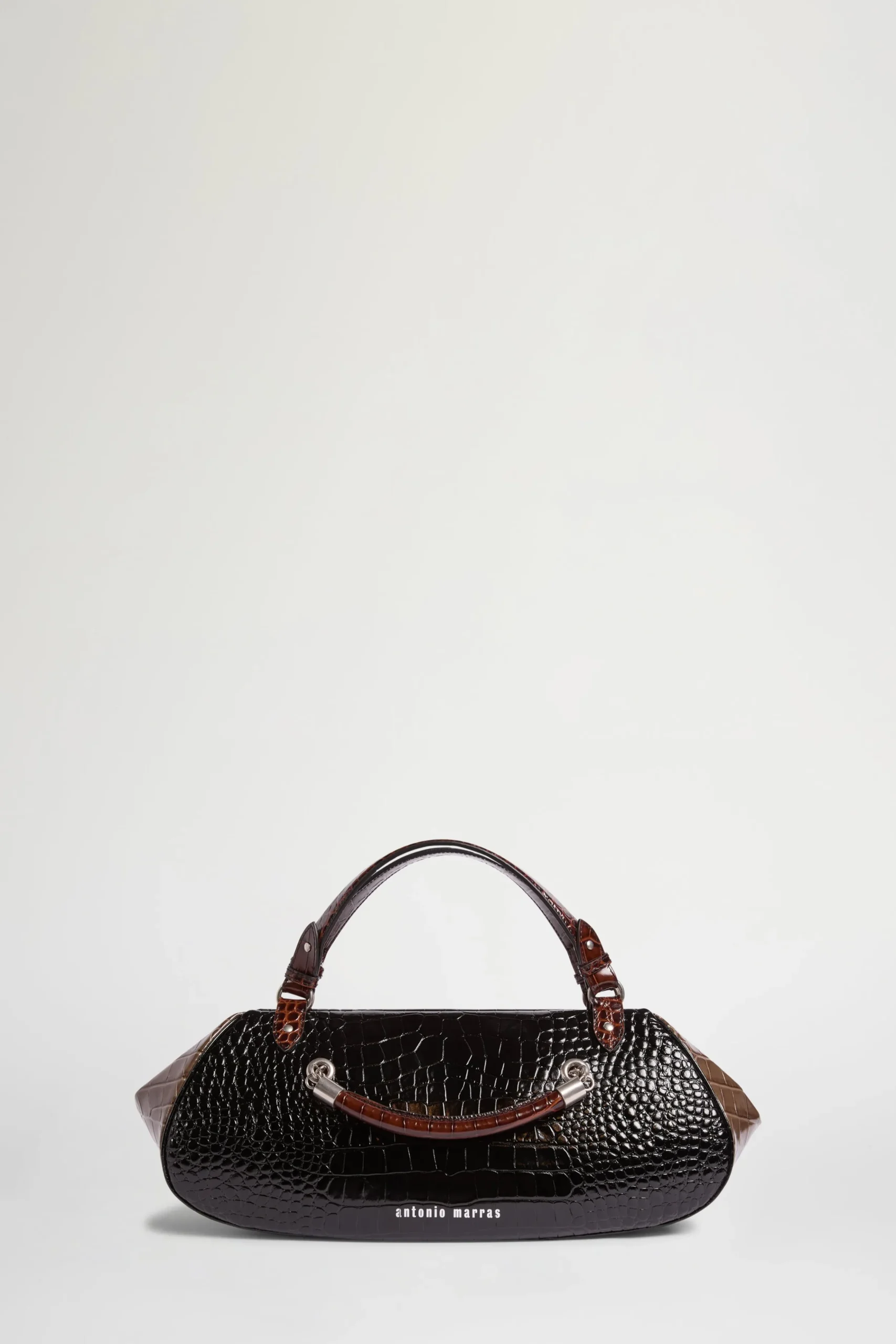 Borsa a mano elegante in pelle stampa coccodrillo, nera con motivo marrone e silhouette curva.