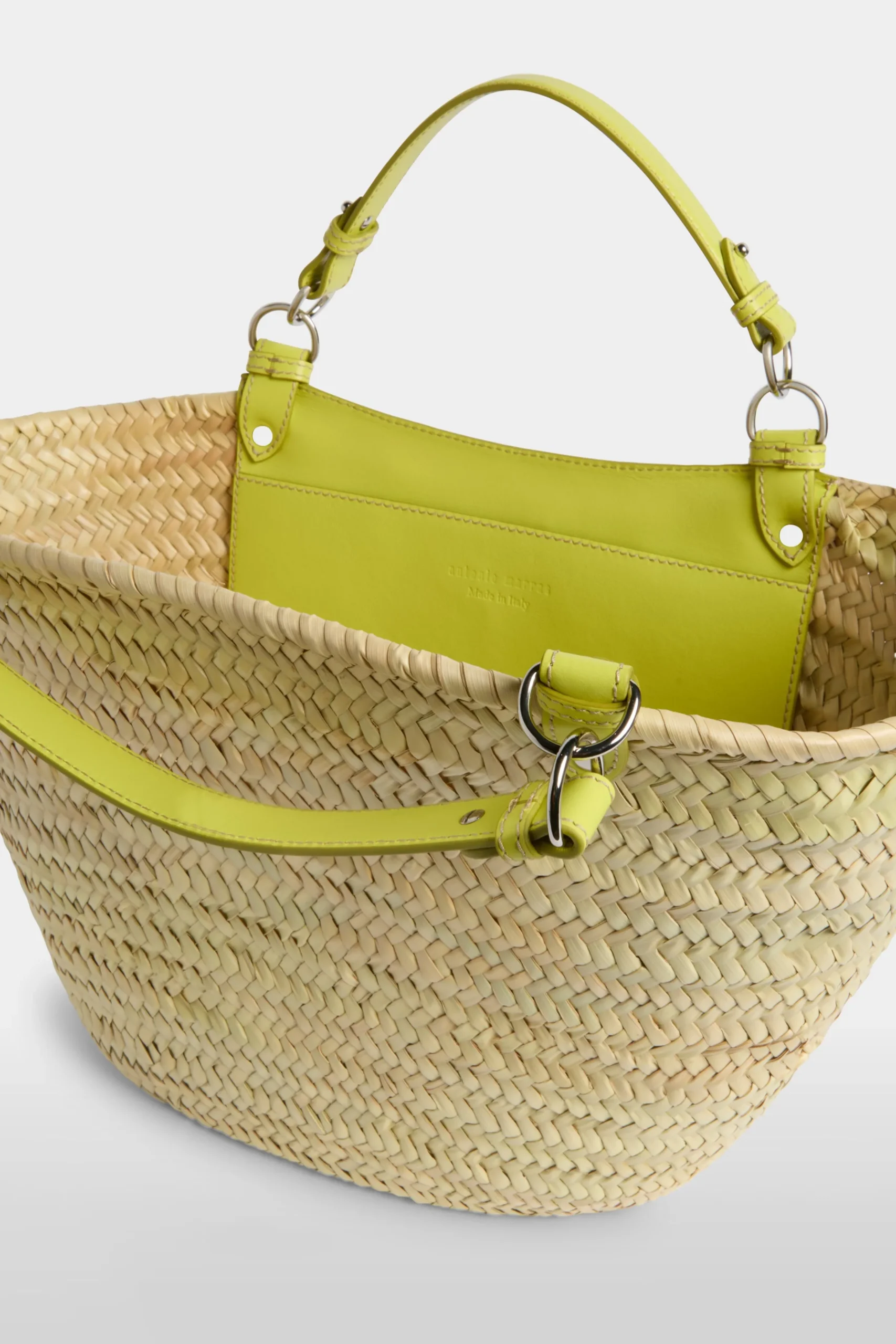 Borsa grande a cestino con corpo in paglia intrecciata a mano, inserti in pelle e manici in vitello doppi. L’interno non foderato presenta una tasca pratica. Ogni pezzo è unico e diverso dagli altri.