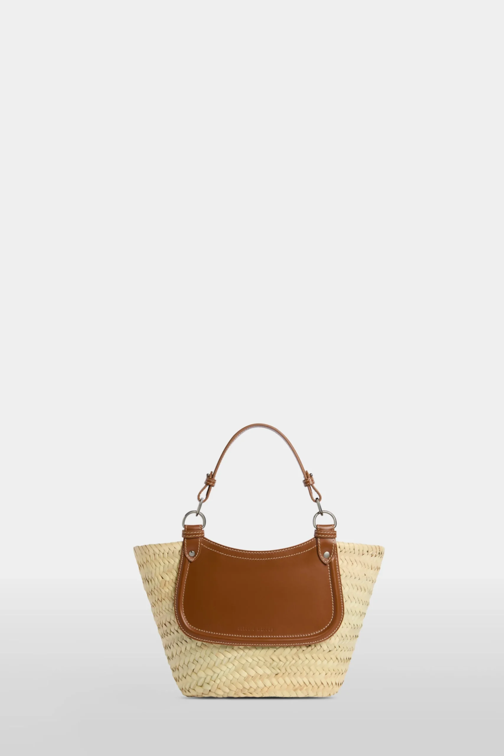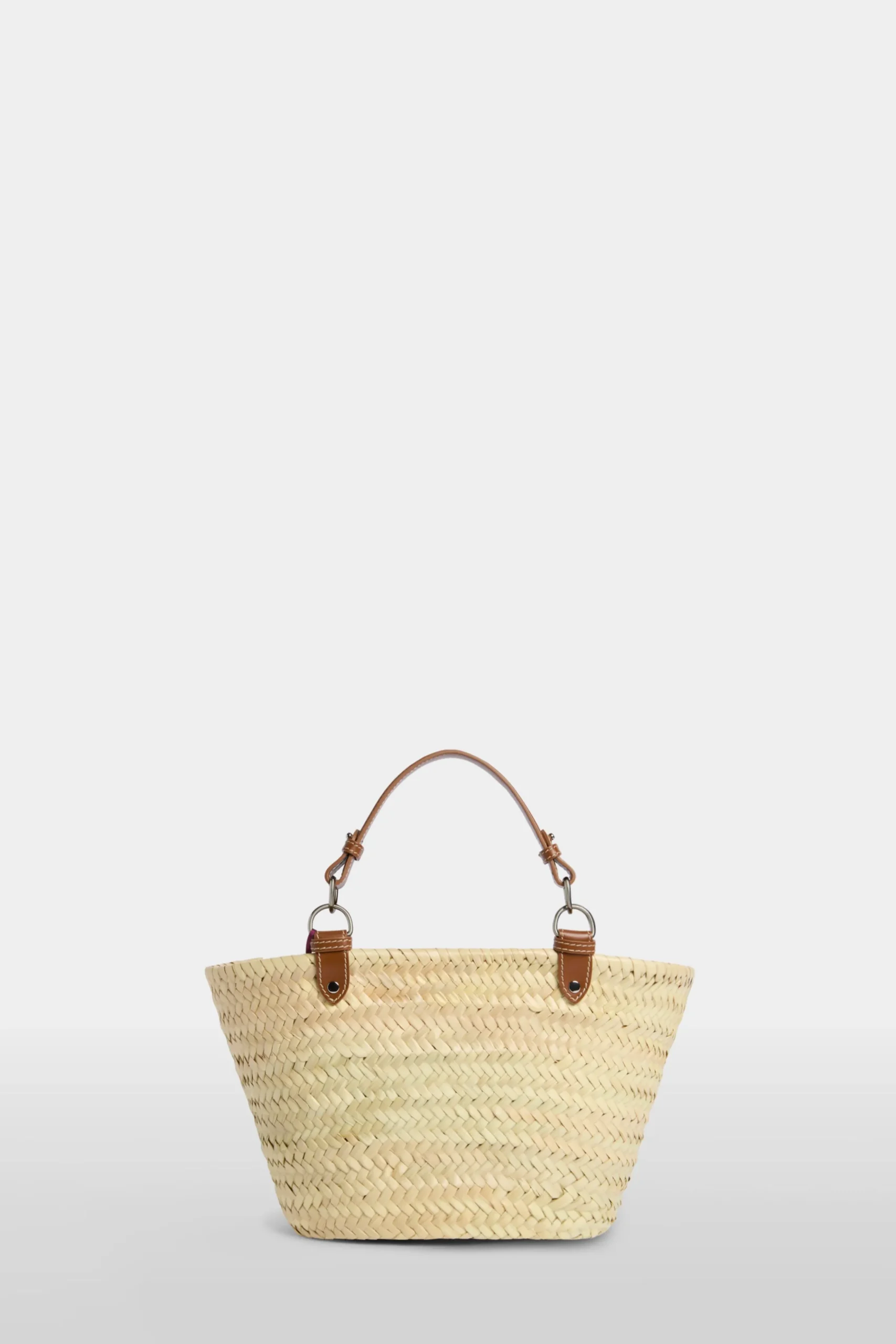 Borsa a cestino di medie dimensioni con corpo in paglia intrecciata a mano, inserti in pelle e manici in vitello doppi. L’interno non foderato presenta una tasca pratica. Ogni pezzo è unico e diverso dagli altri.