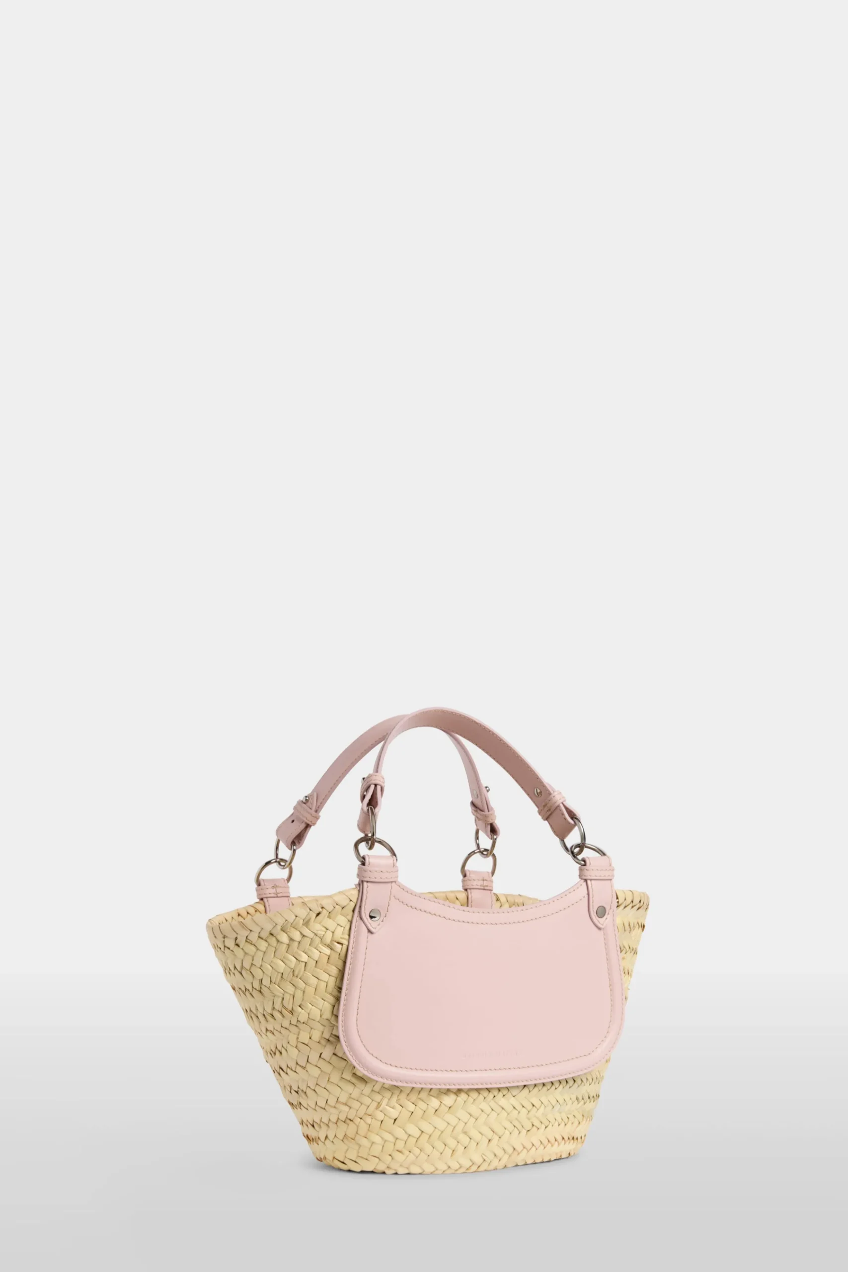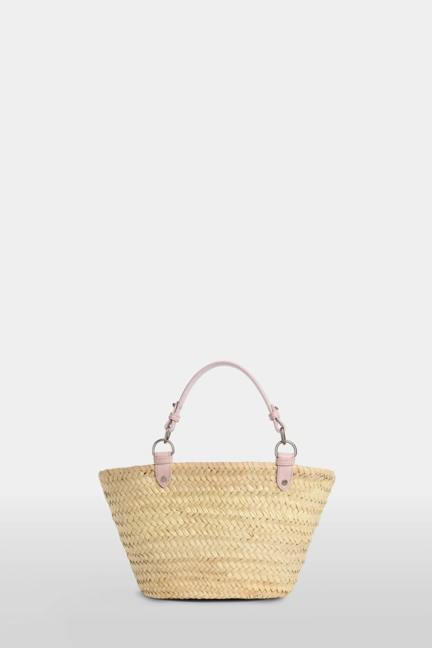 Borsa a cestino di medie dimensioni con corpo in paglia intrecciata a mano, inserti in pelle e manici in vitello doppi. L’interno non foderato presenta una tasca pratica. Ogni pezzo è unico e diverso dagli altri.