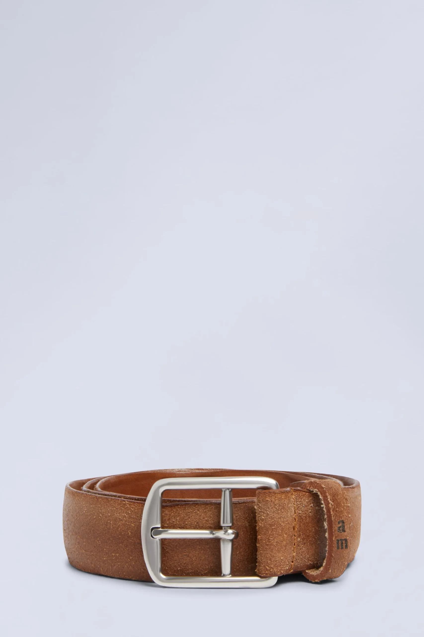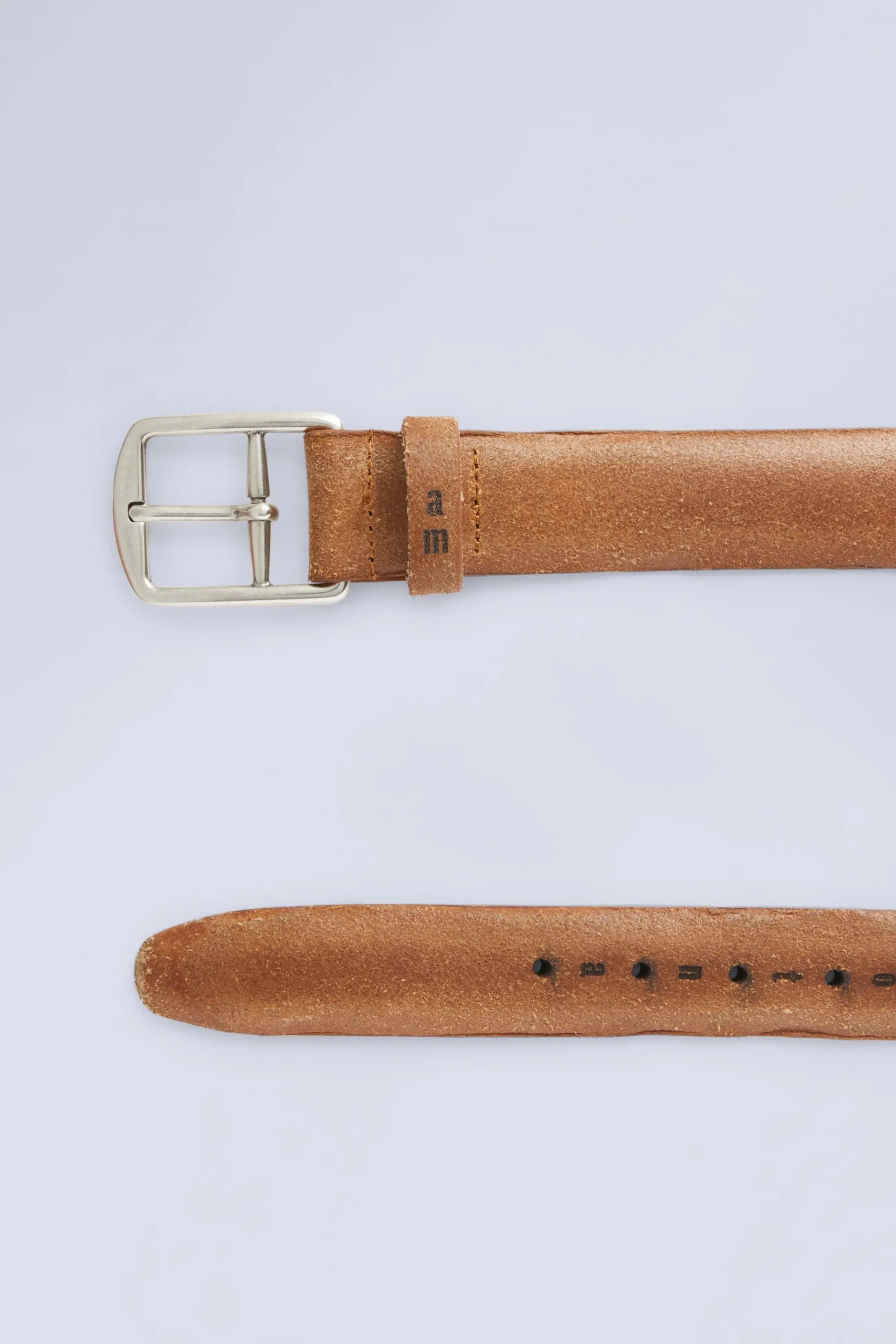 Cintura in pelle bovina color cognac, lavorata artigianalmente per ottenere un effetto vintage, con fibbia galvanizzata color argento antico e incisione del logo a laser