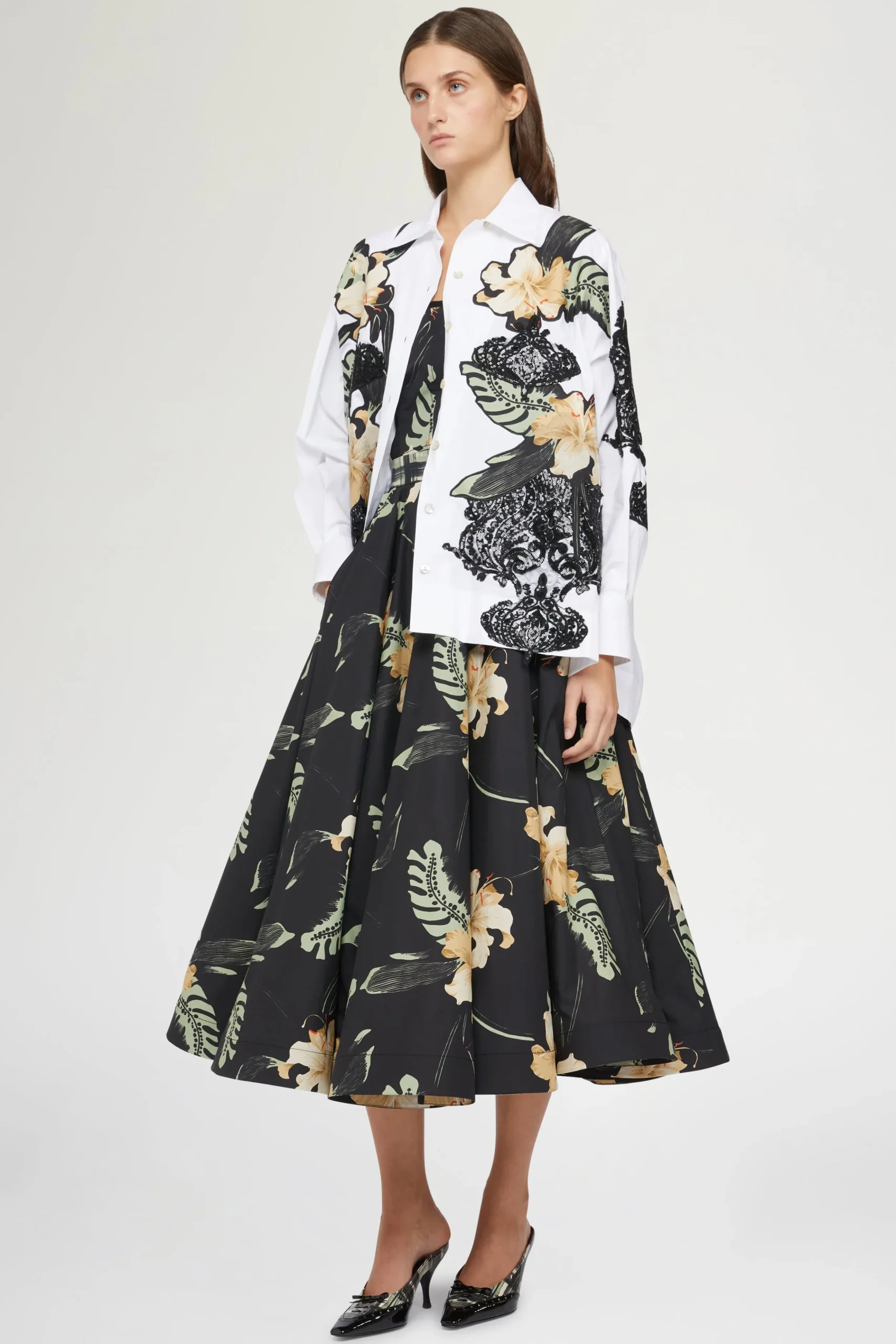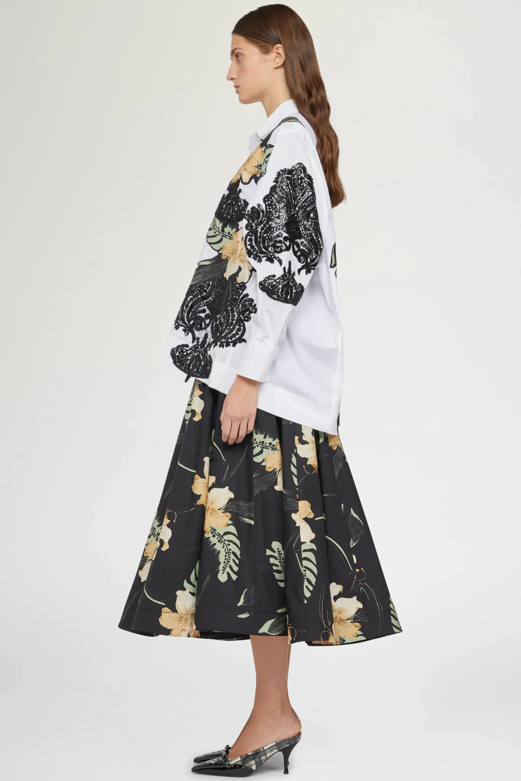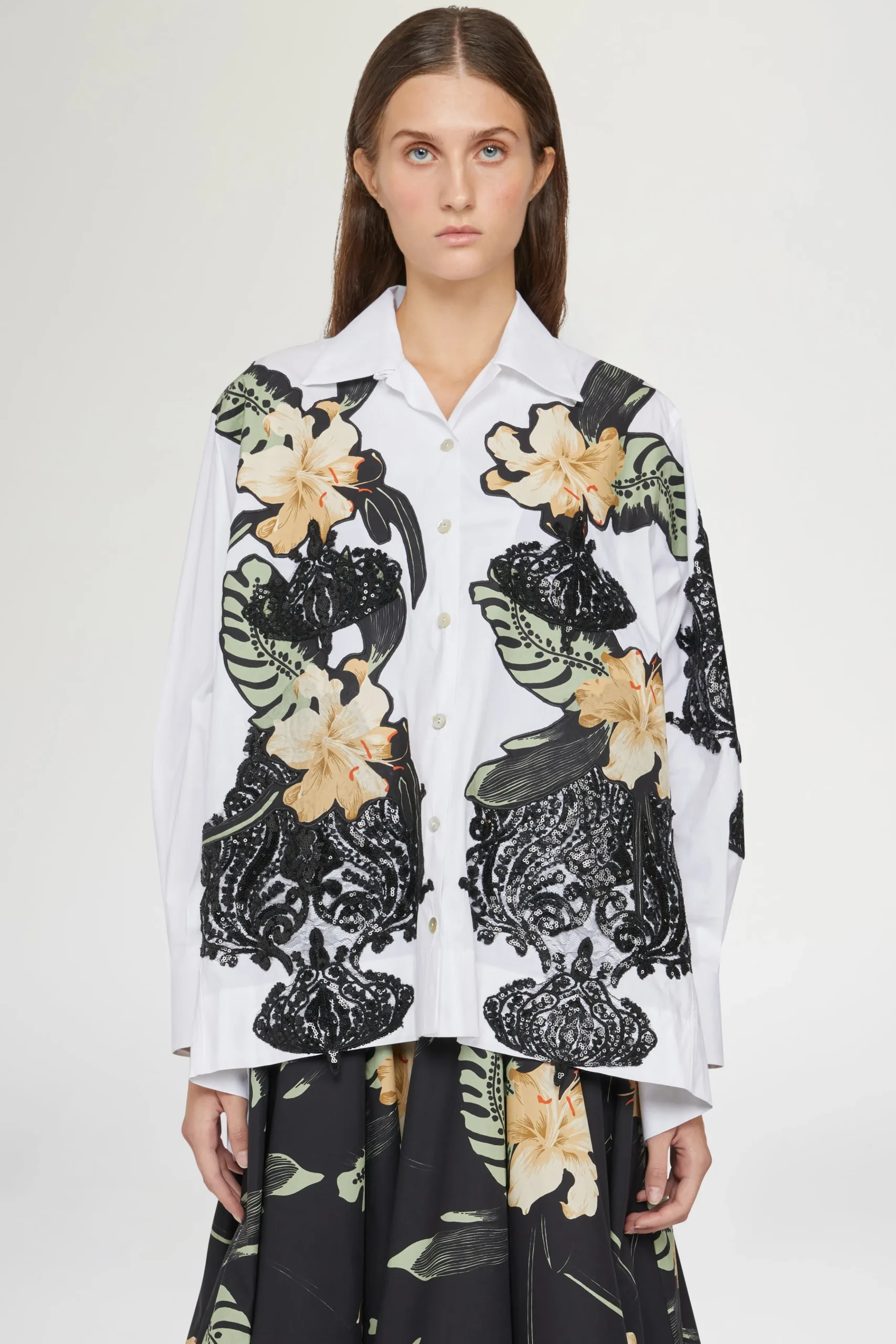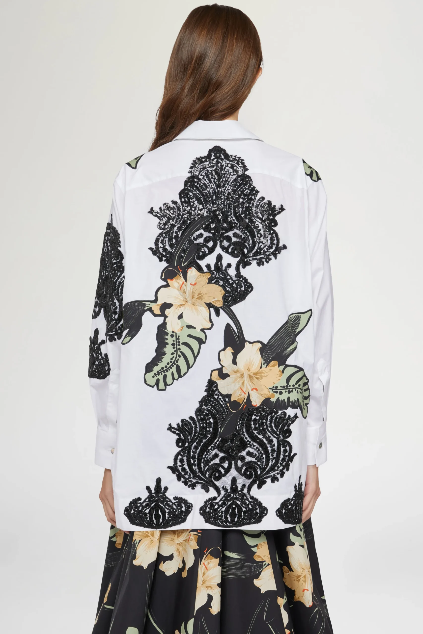 Camicia bianca in cotone con vestibilità oversize, ricamo in paillettes nere e patchwork floreali tropicali.