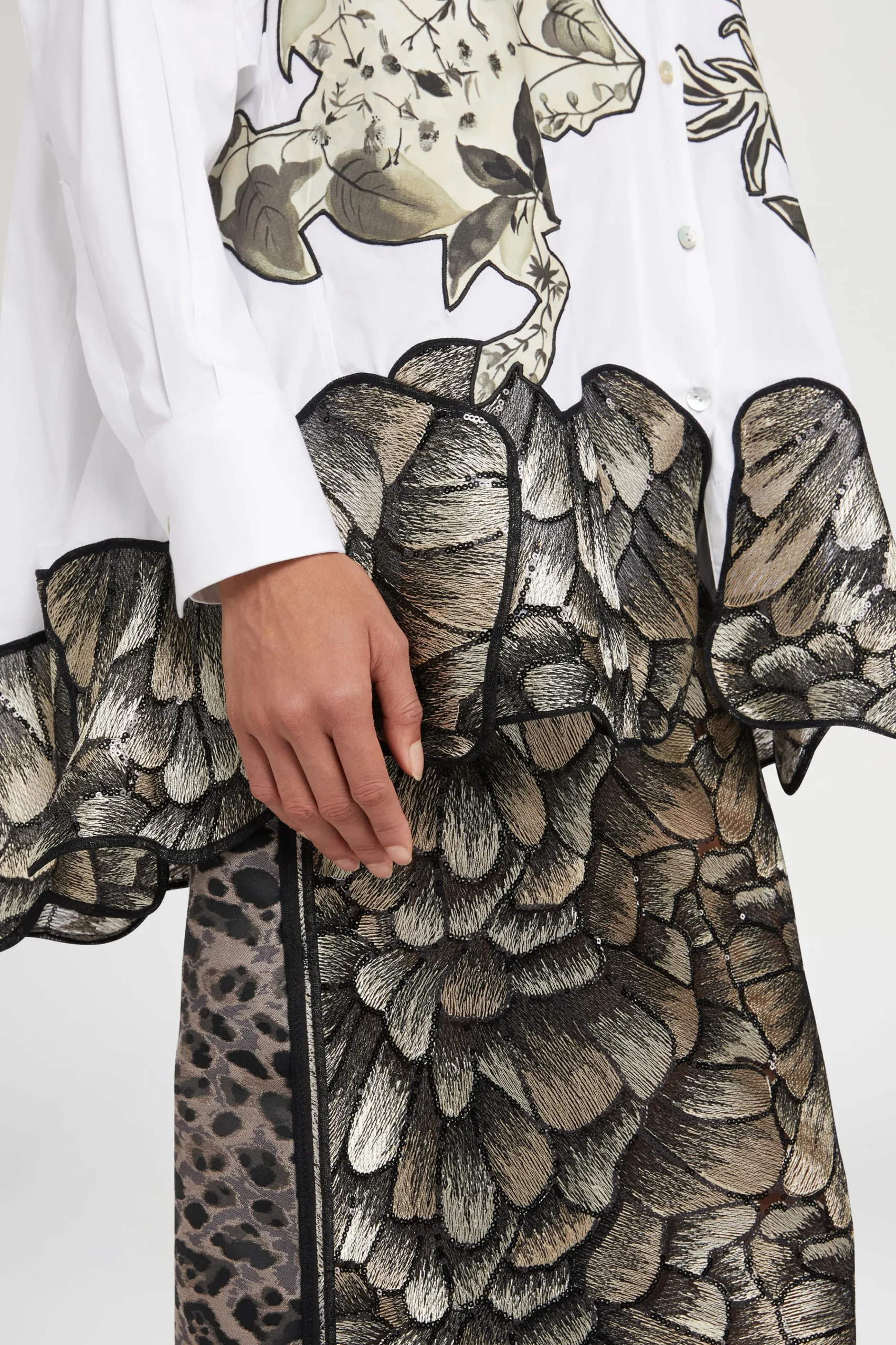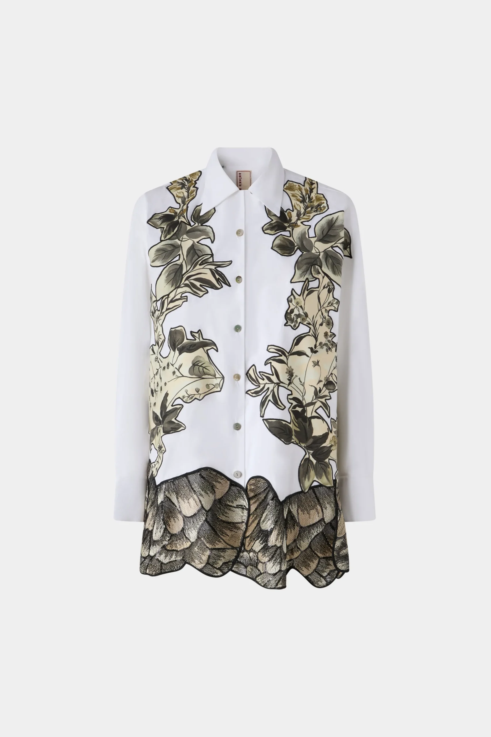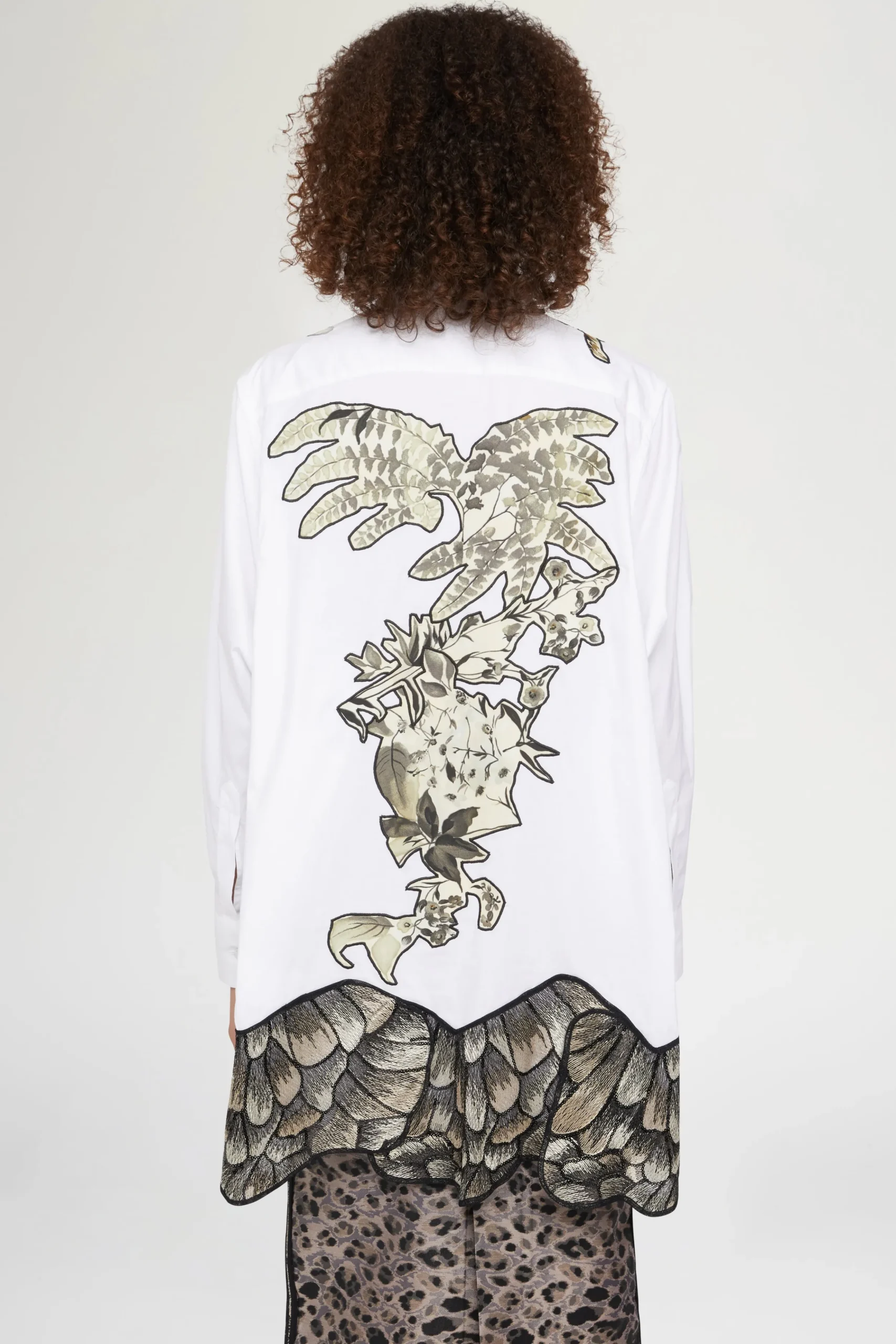 Camicia bianca in cotone con vestibilità oversize, patchwork floreali tropicali e stampa animalier sull’orlo.
