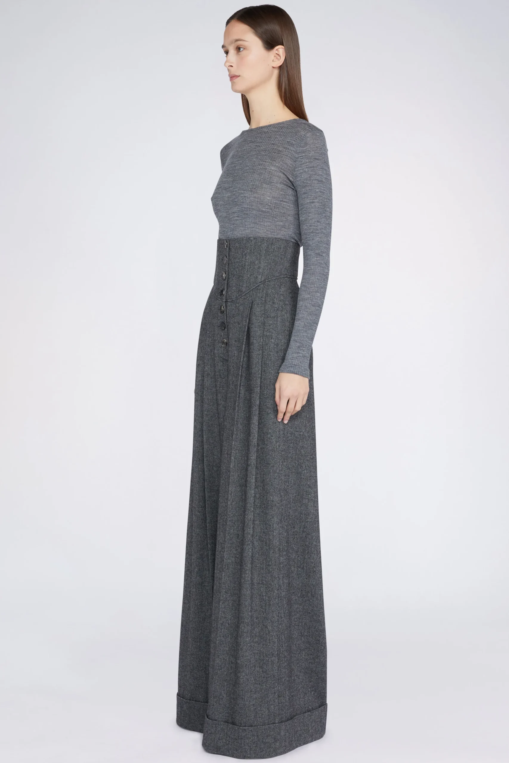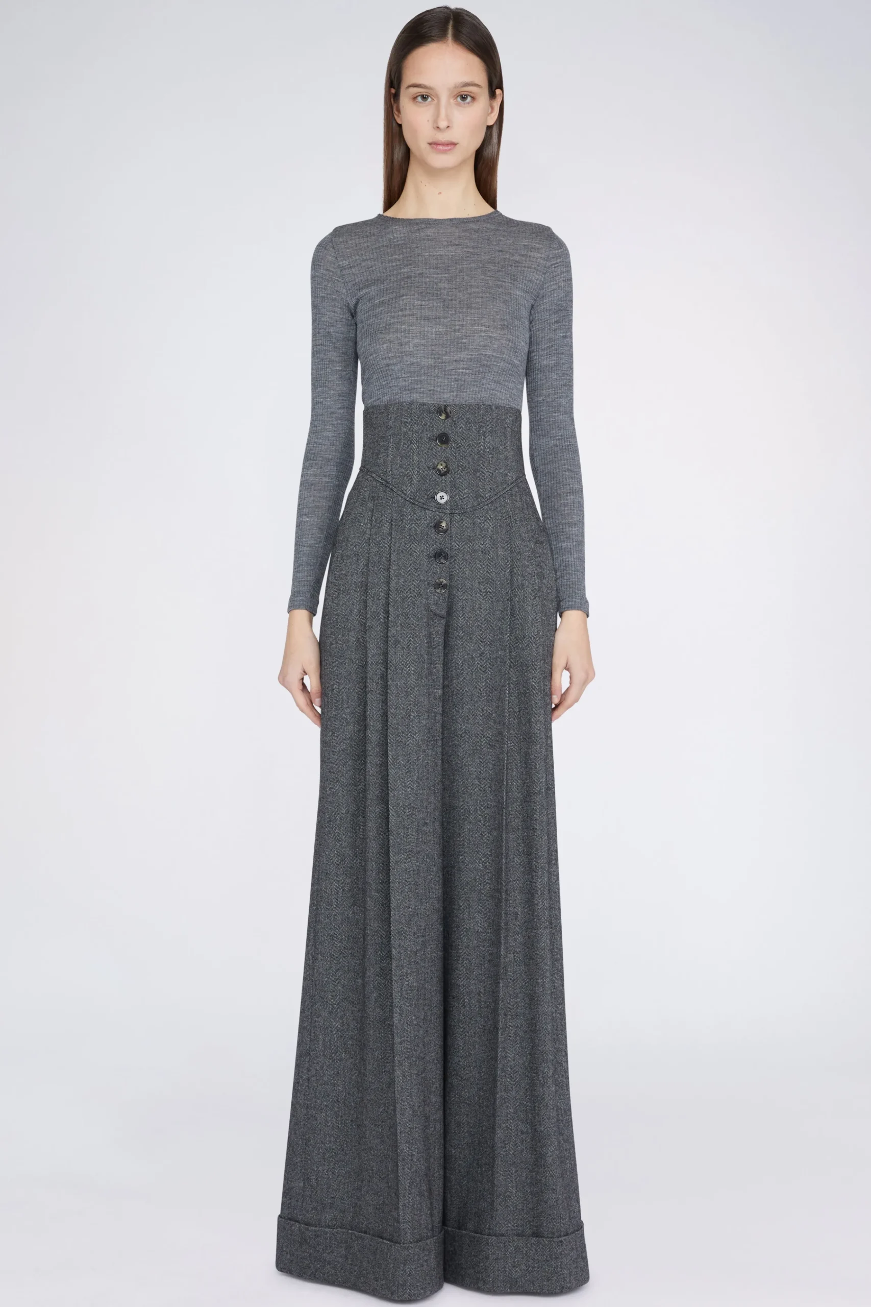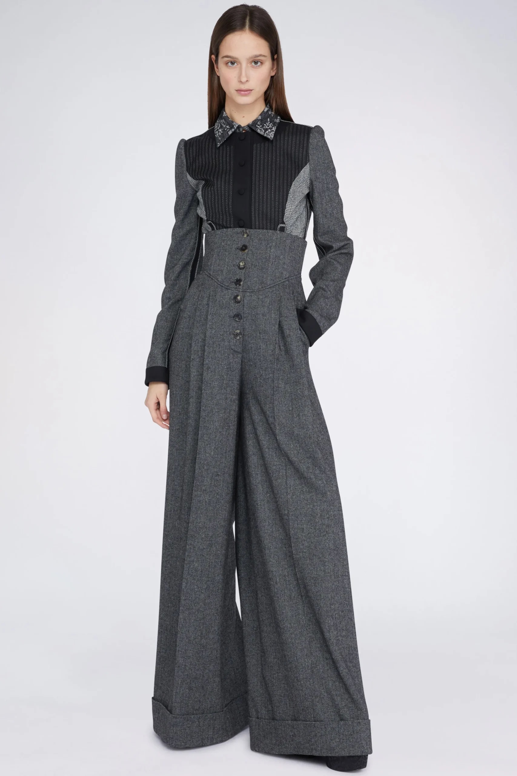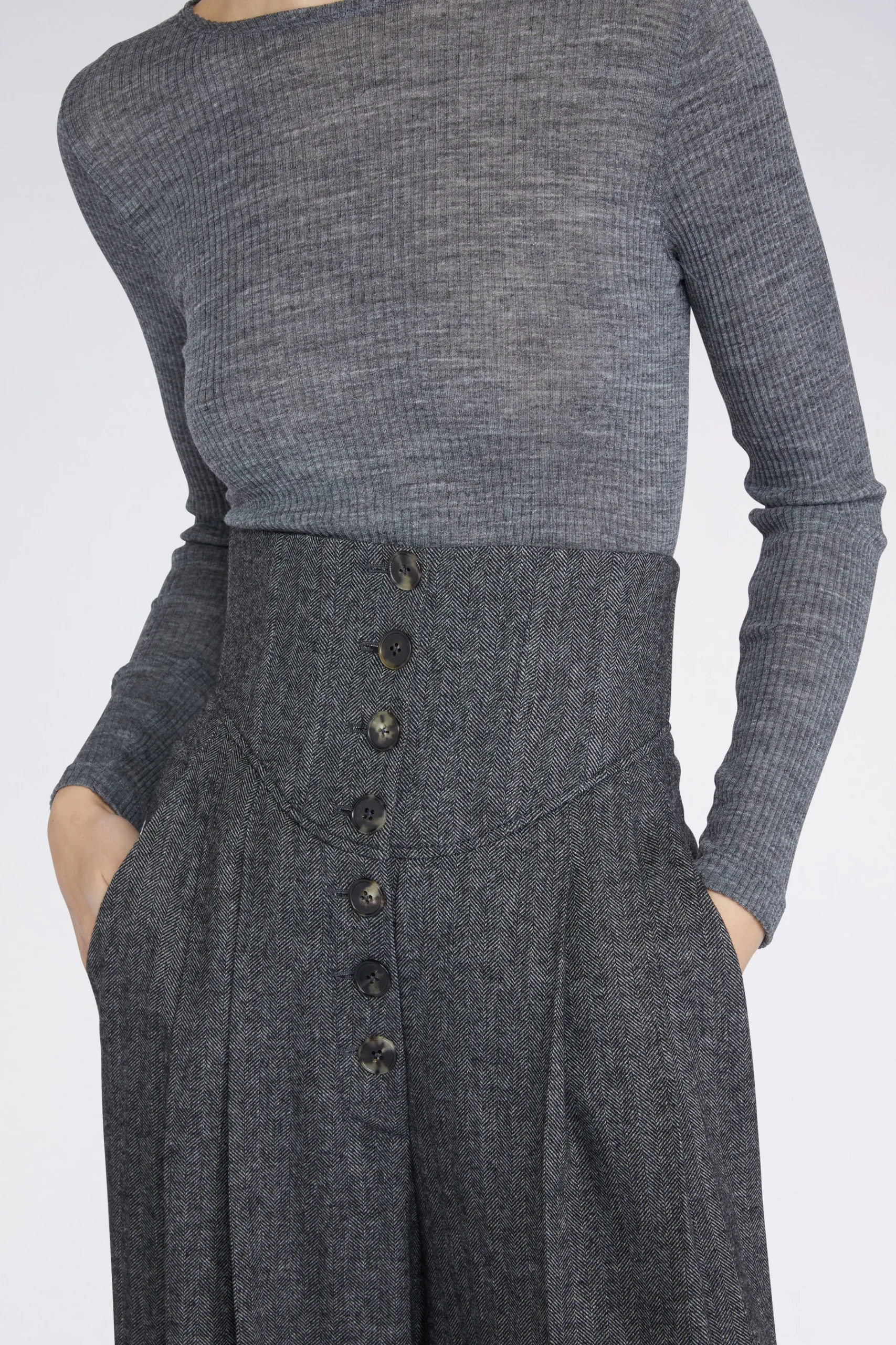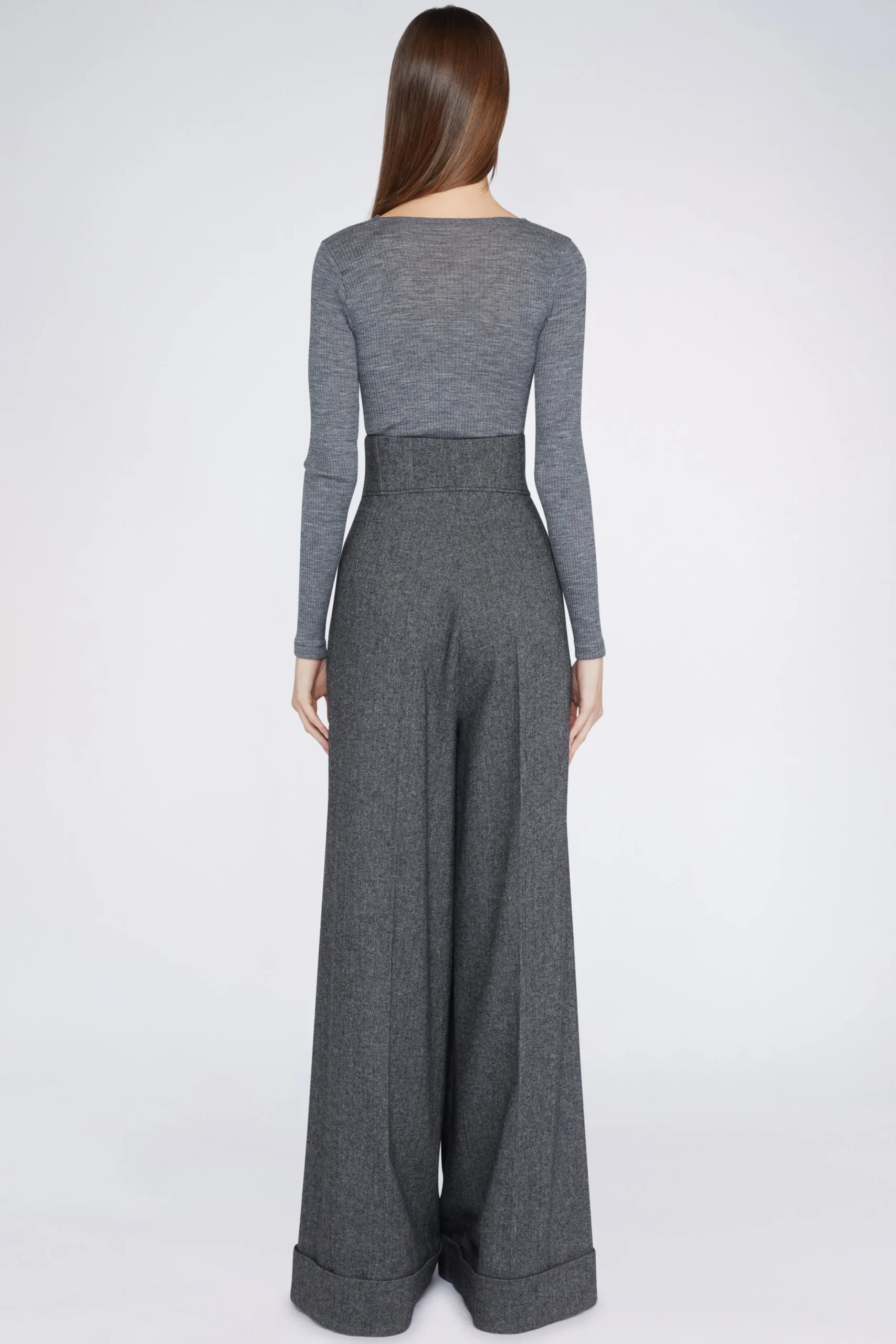 Pantaloni palazzo a vita alta realizzati in tessuto misto lana con bottoni sul davanti.