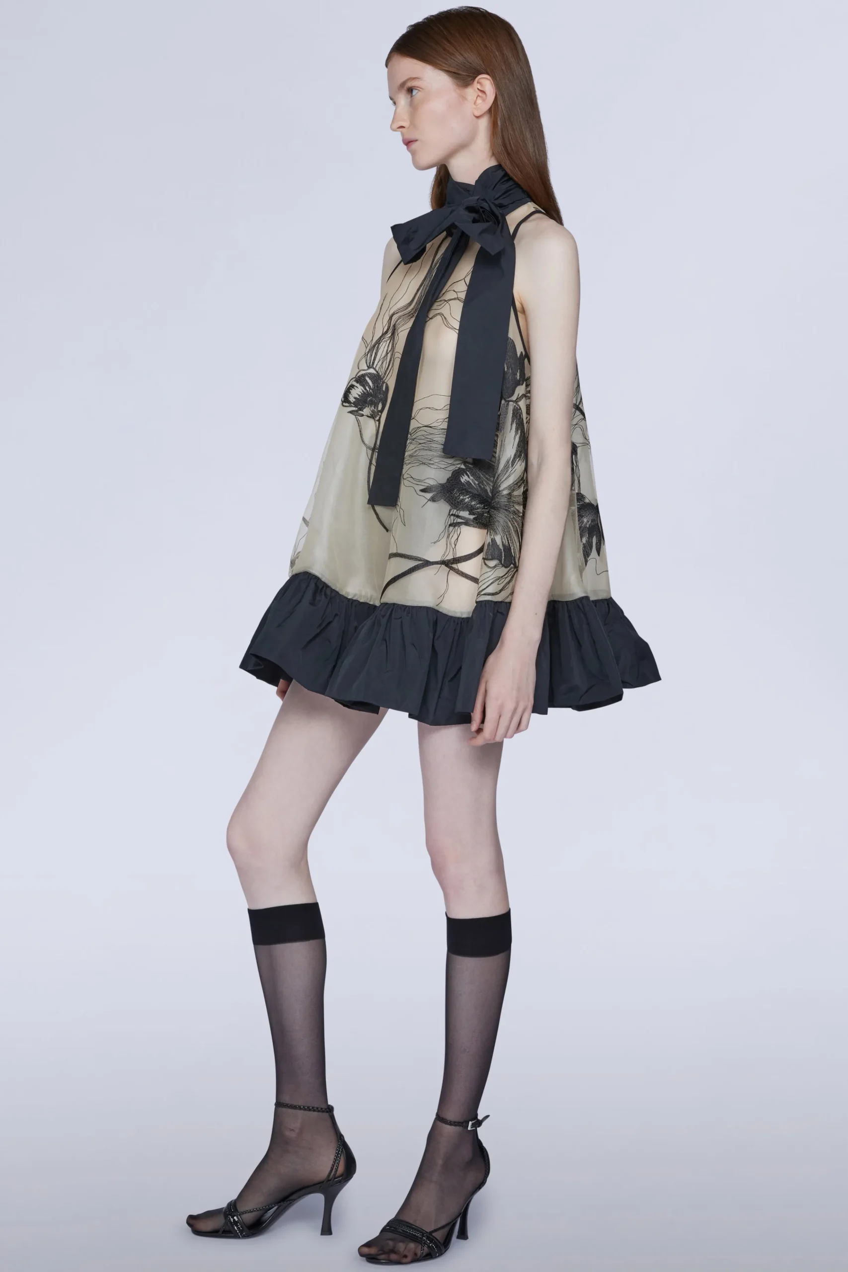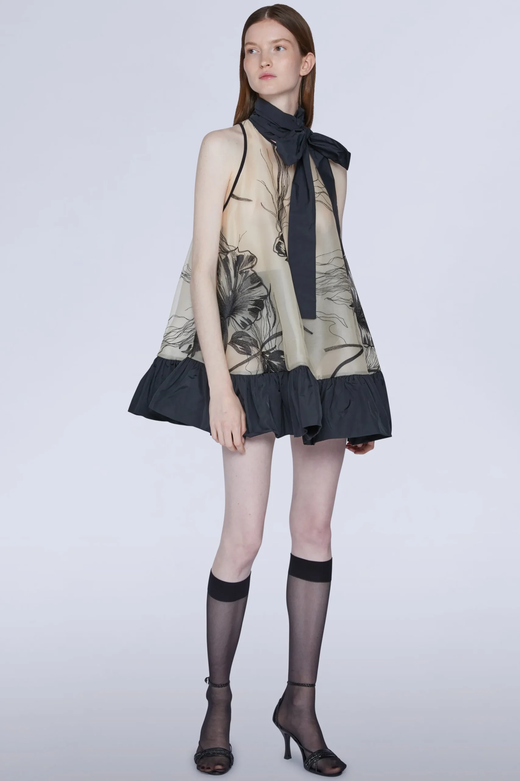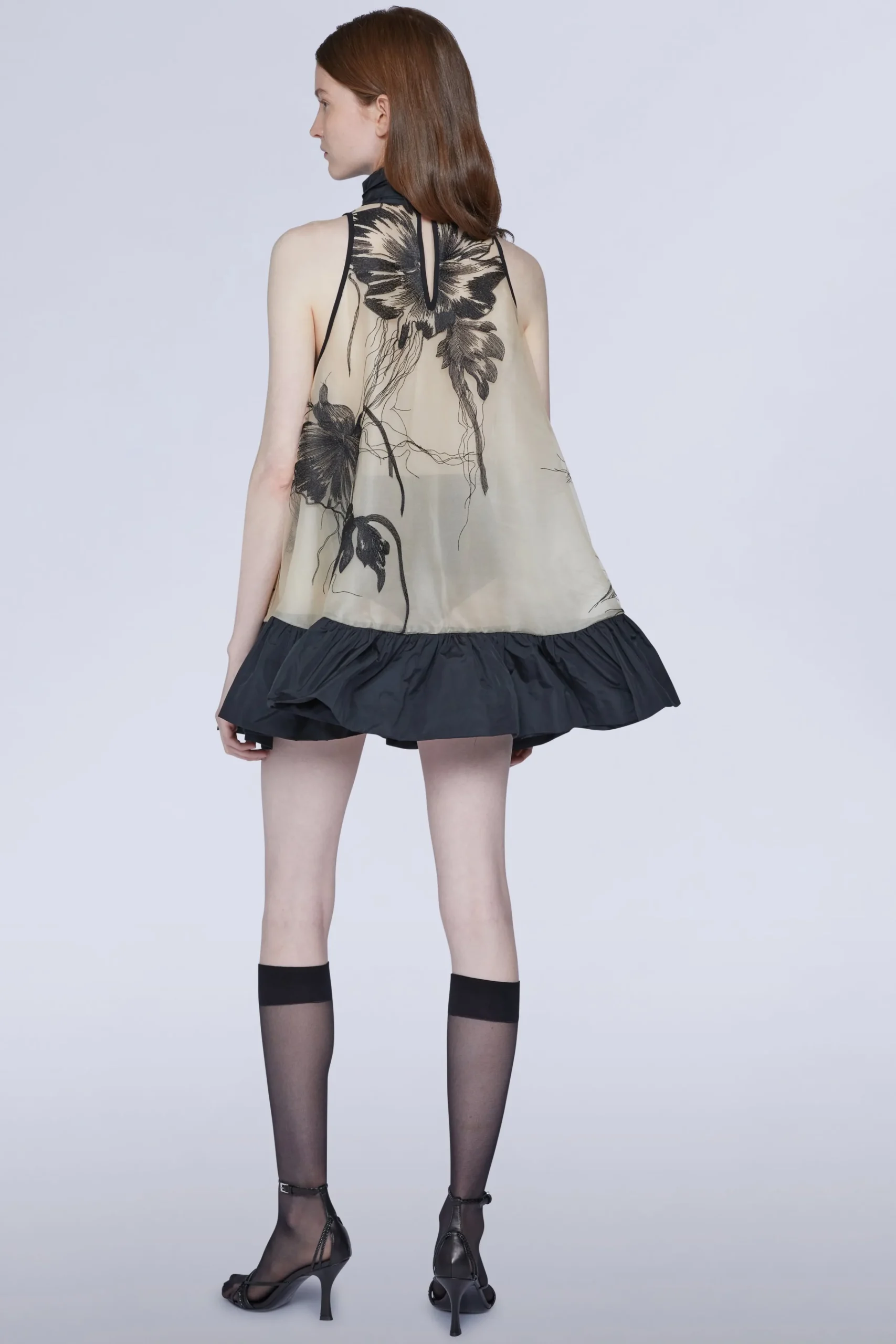 Mini abito color carne con morbide pieghe e pannelli trasparenti decorati con intricati ricami floreali neri. Viene fornito con una sottoveste in seta abbinata.