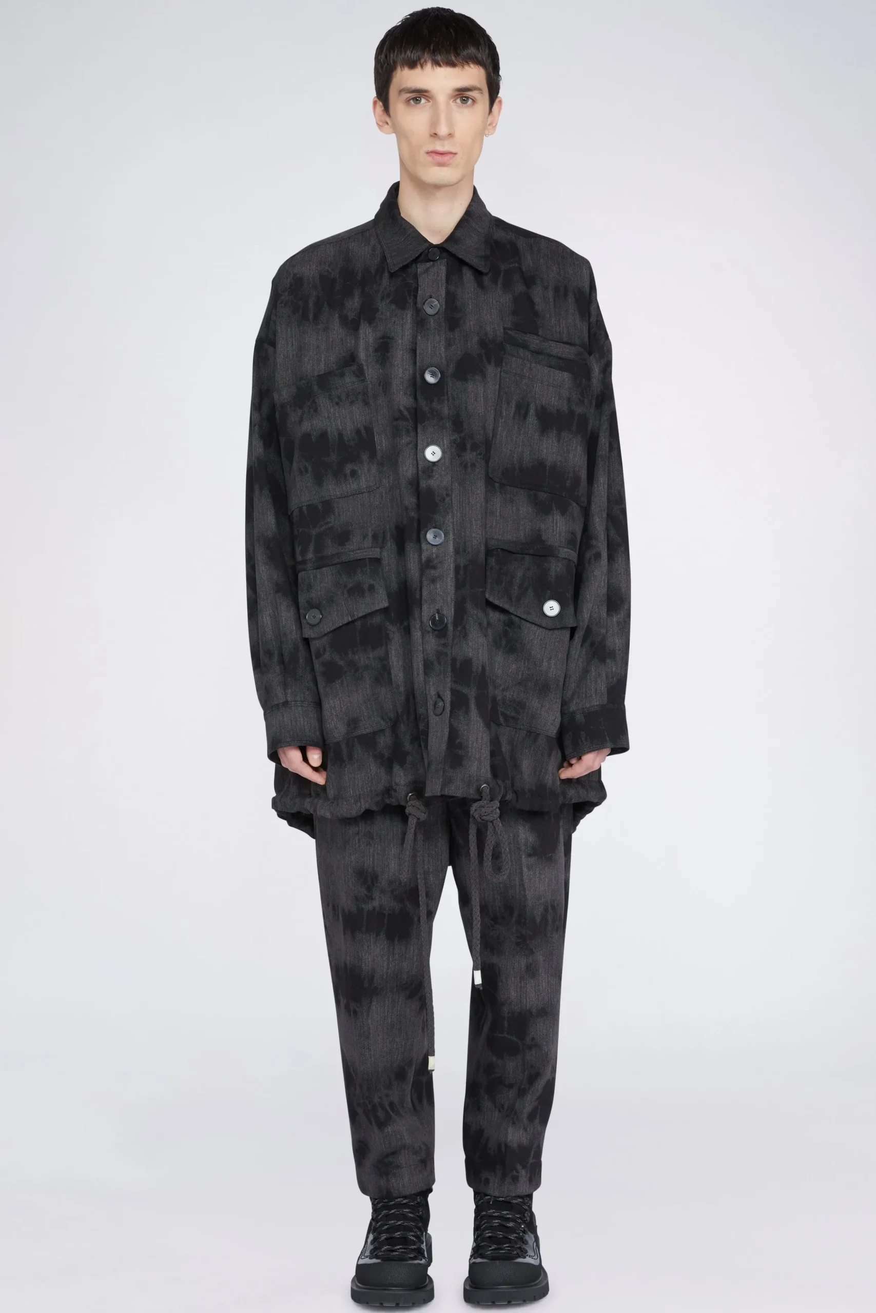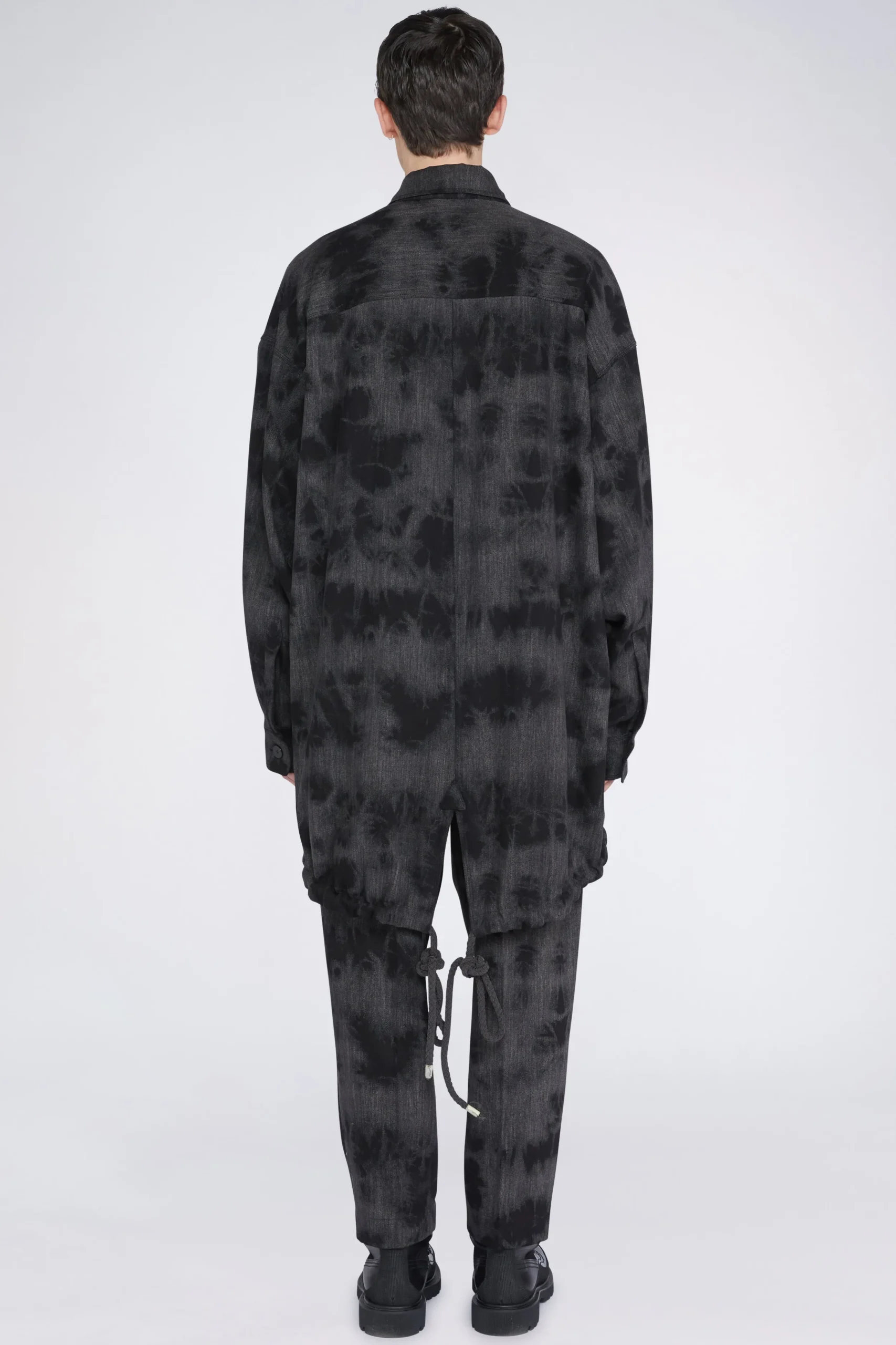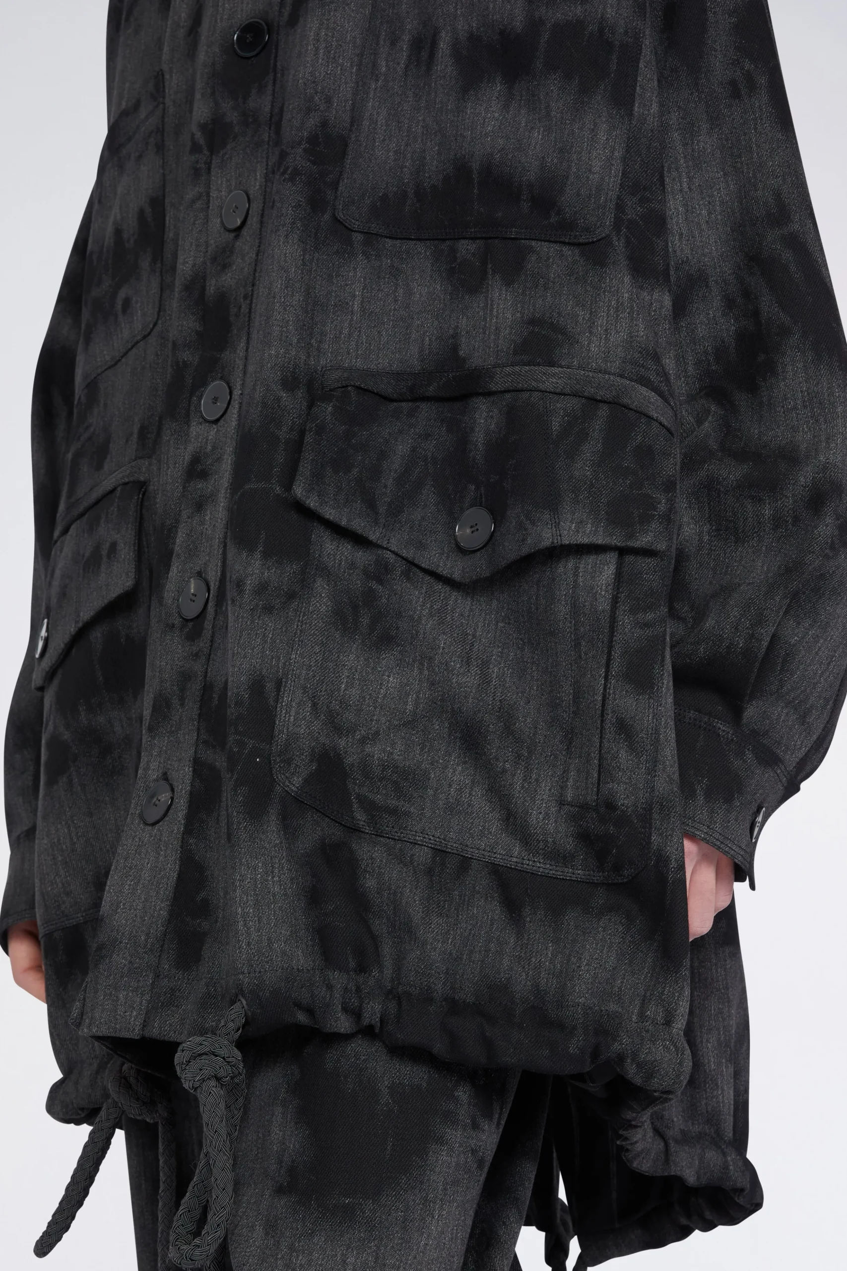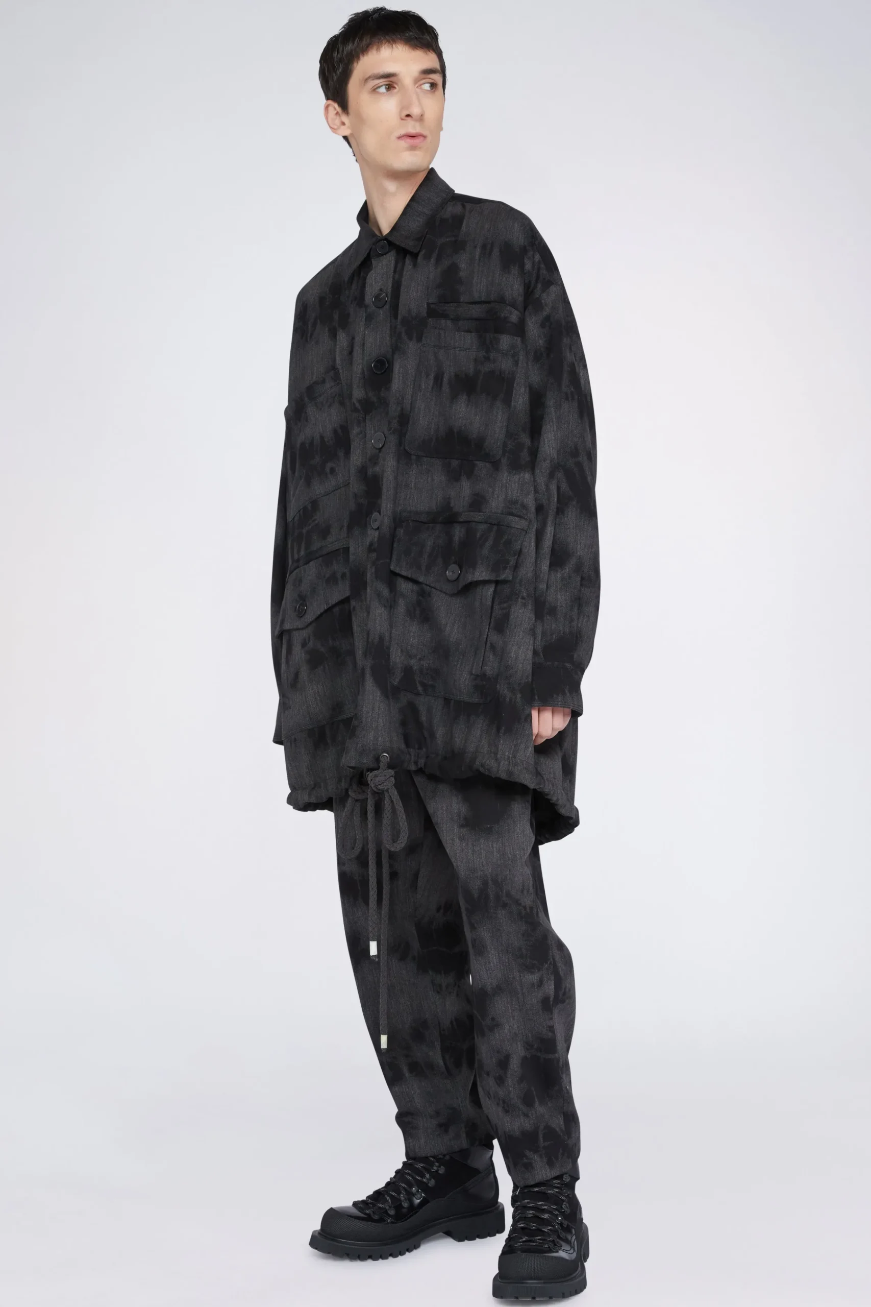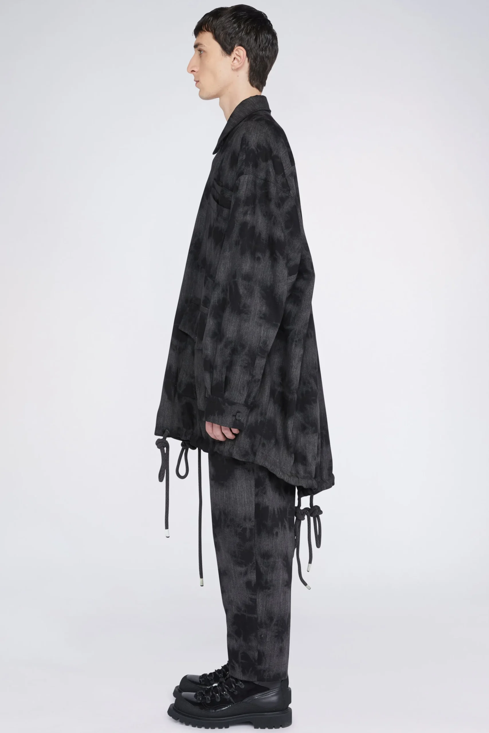 Cappotto oversize grigio scuro realizzato al 100% in cotone con motivo testurizzato tie-dye, ampie tasche frontali, chiusura con bottoni e coulisse regolabile sull’orlo per una vestibilità rilassata.