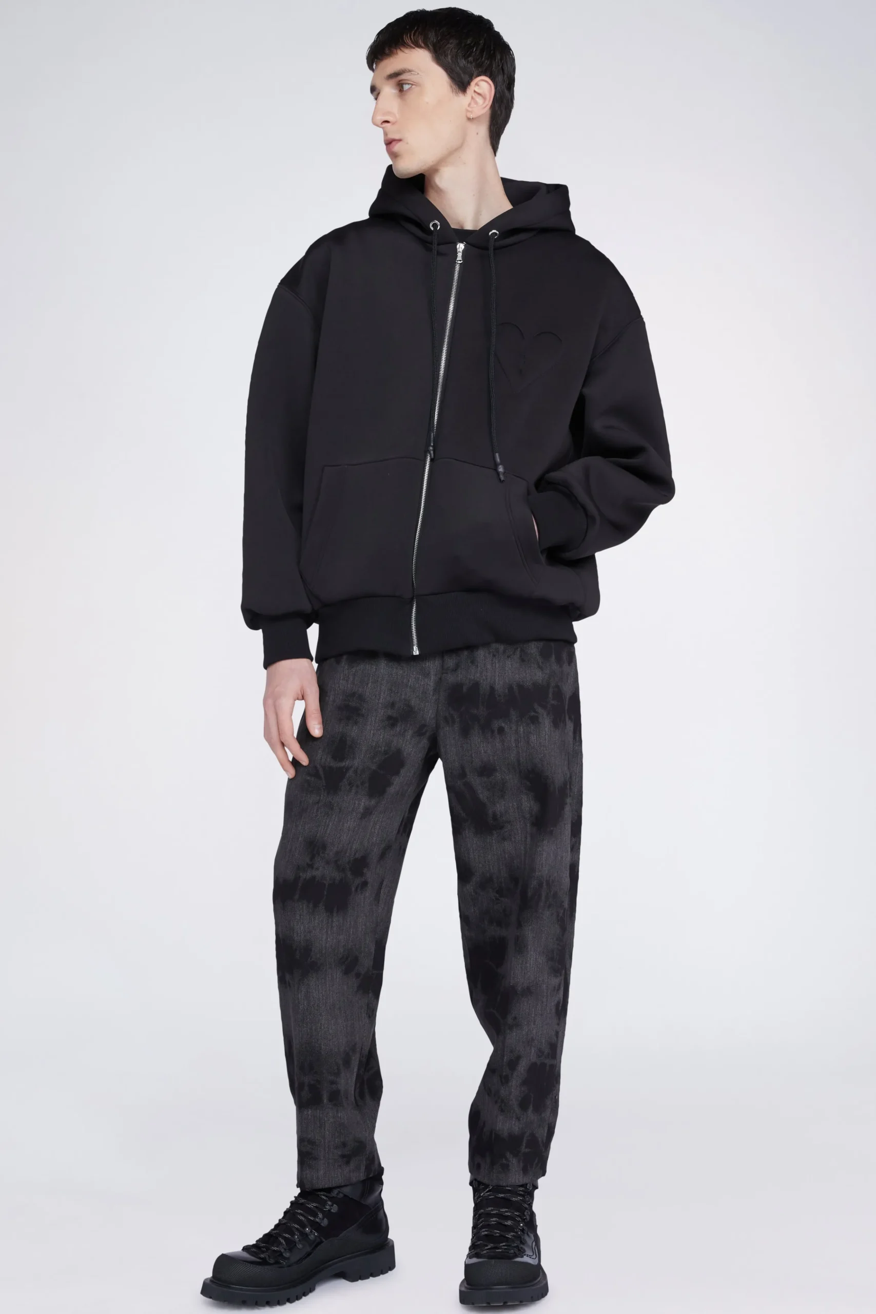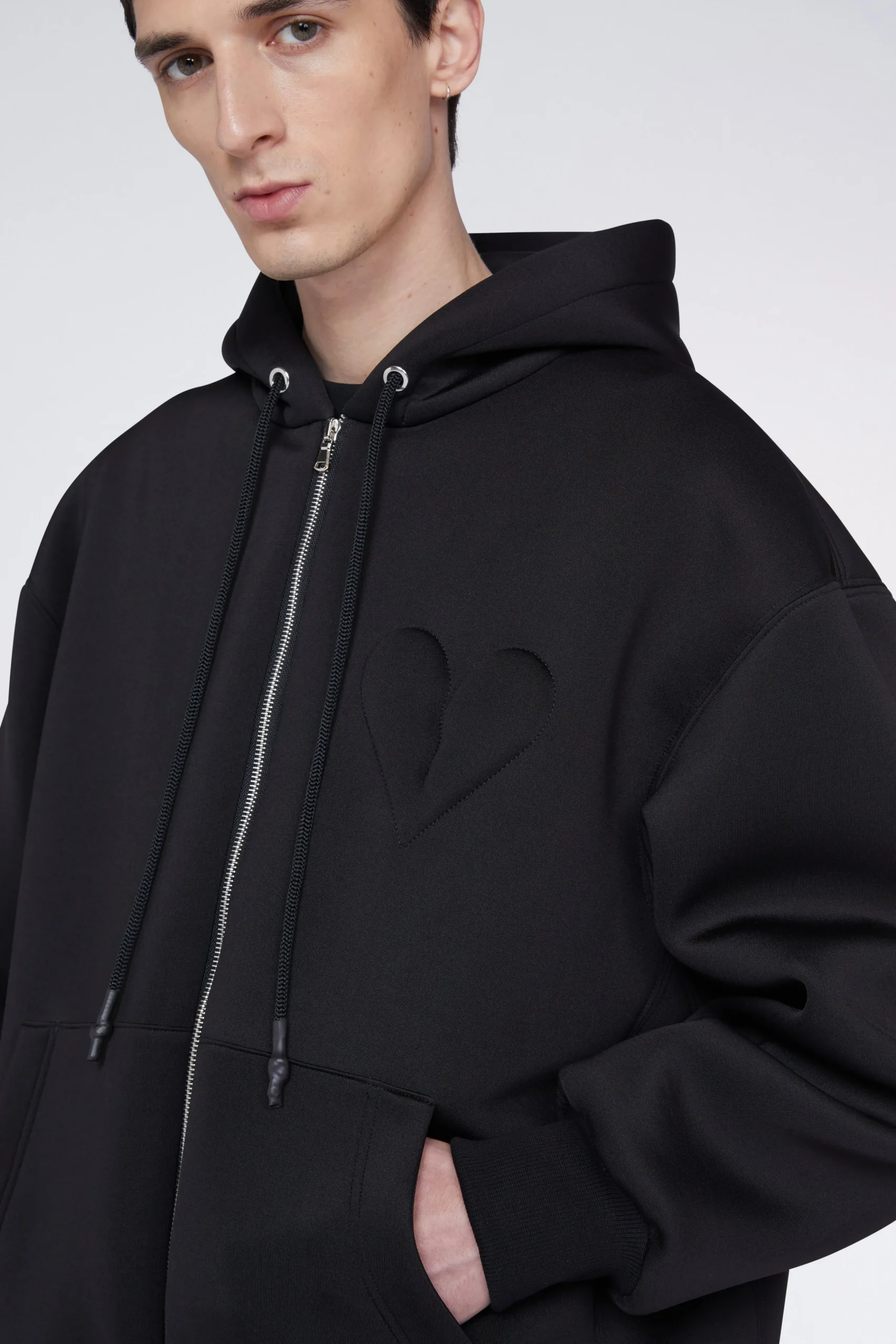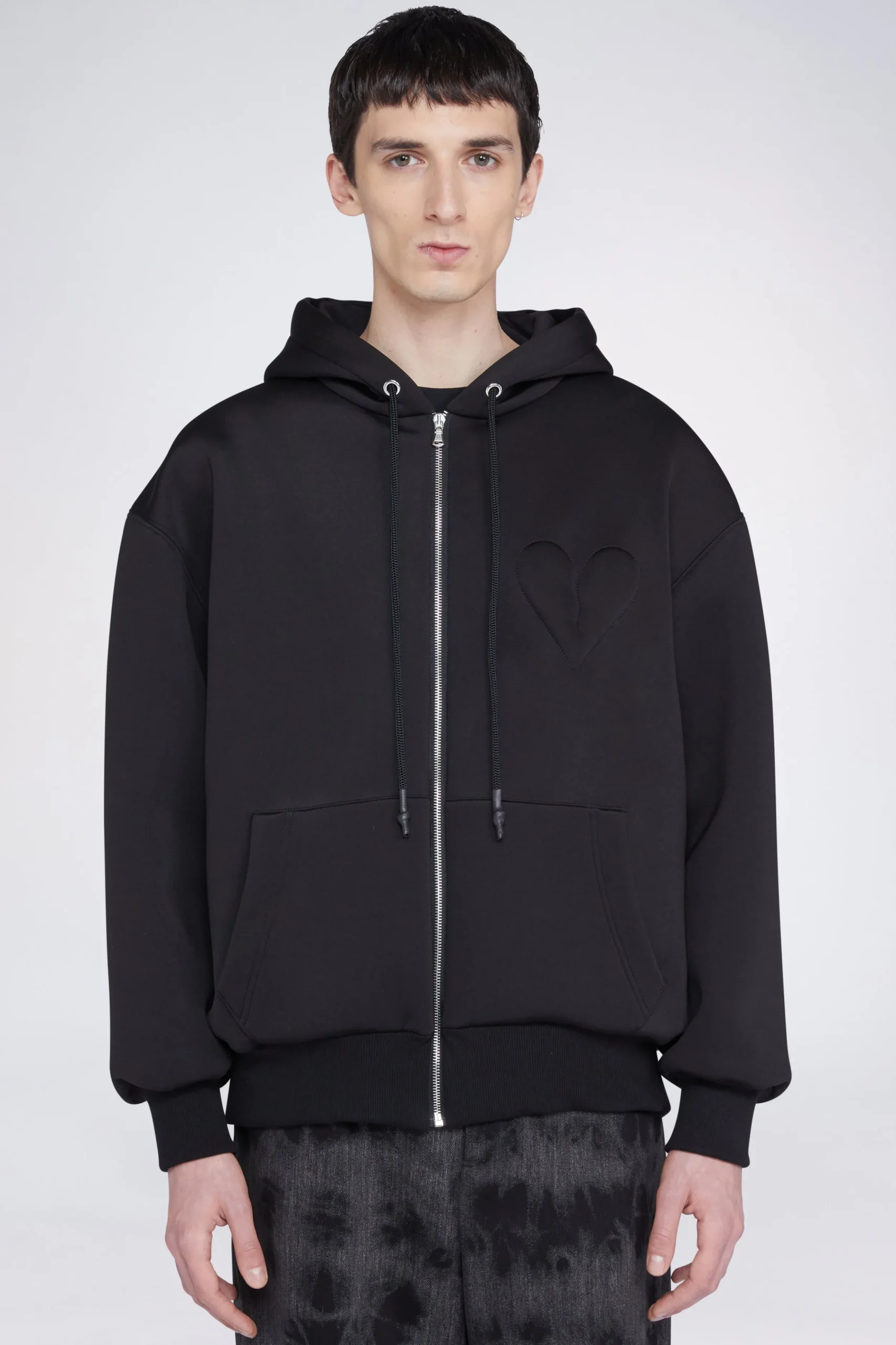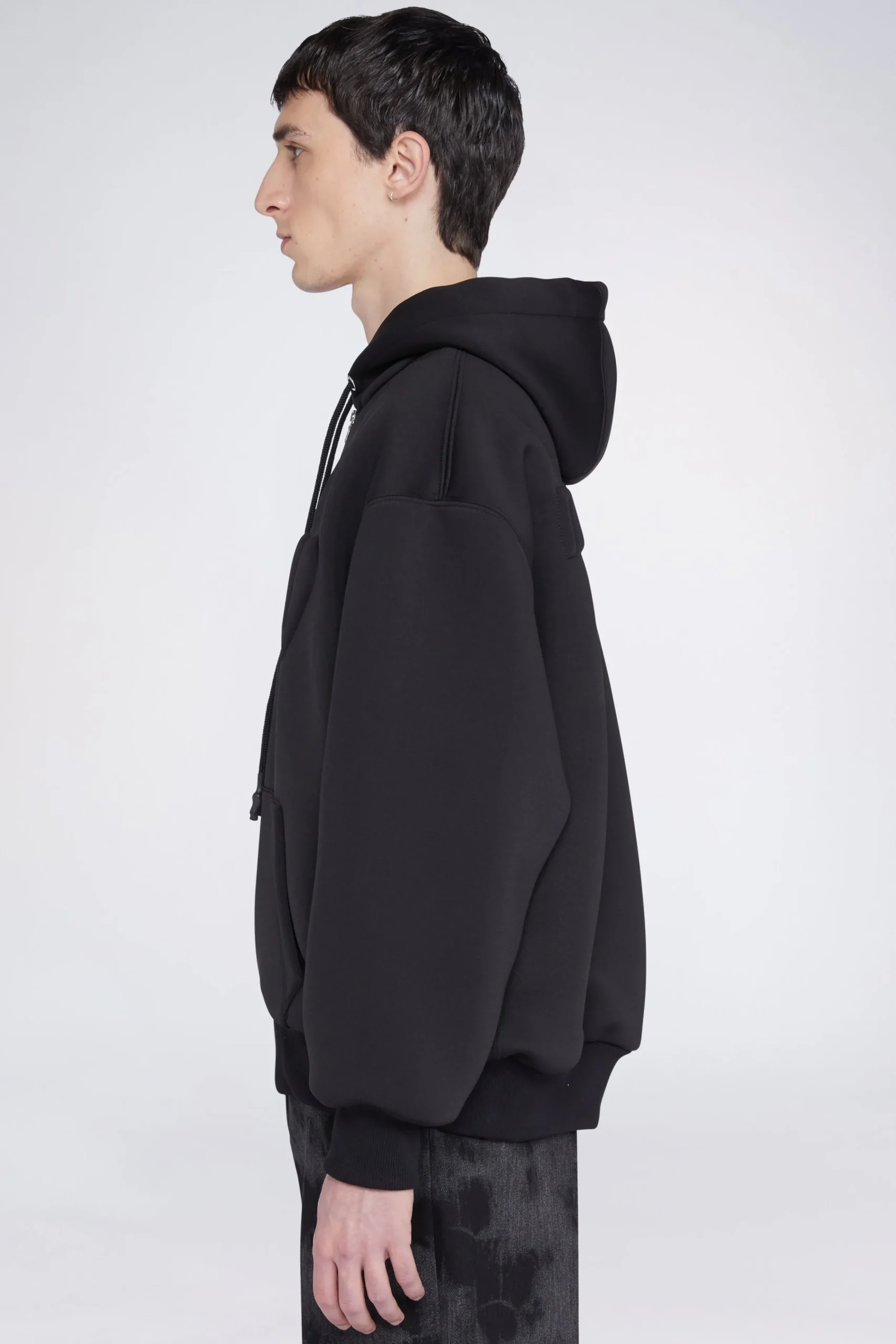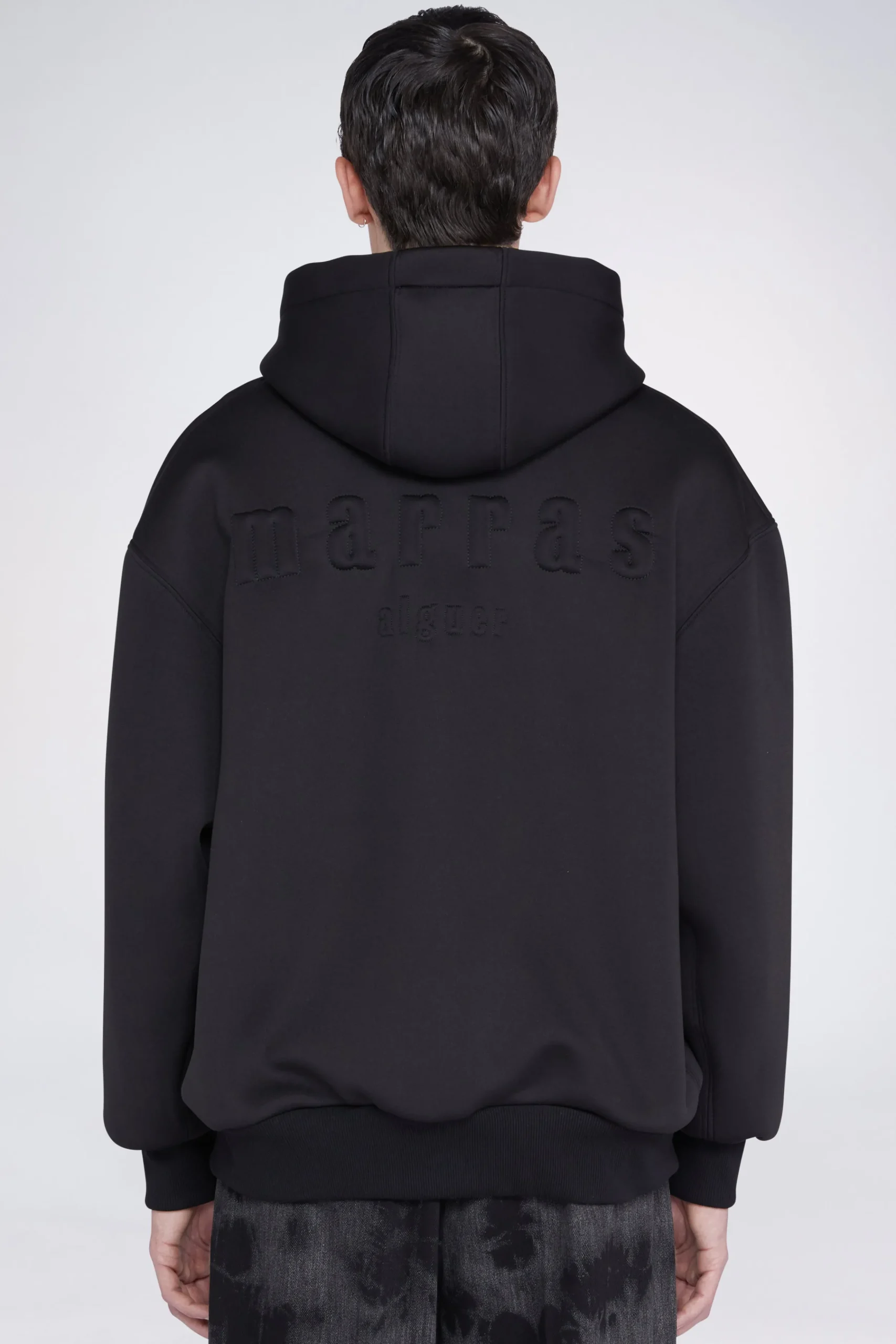 Felpa nera con zip, cappuccio, polsini a coste e logo marras tono su tono sul retro.
