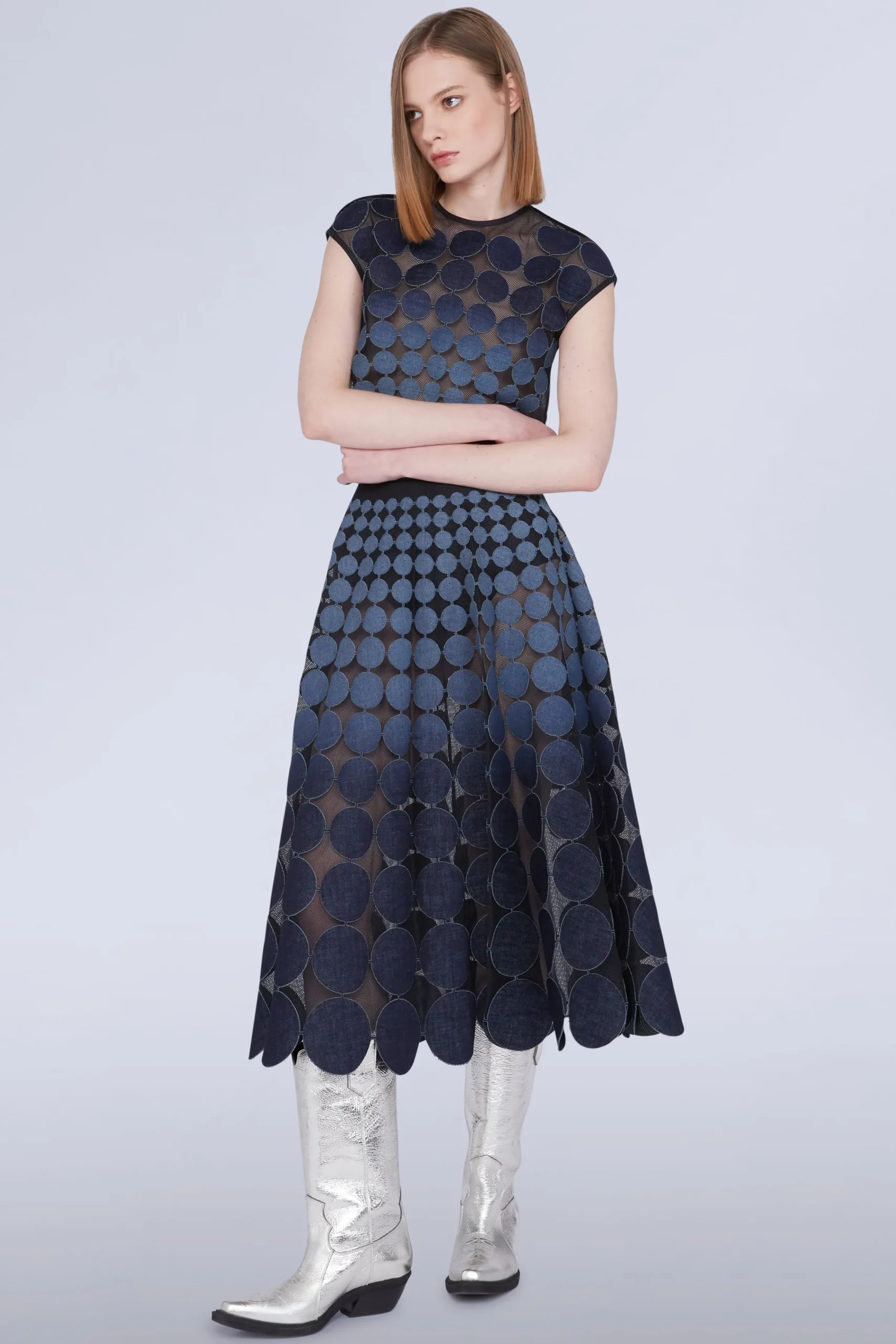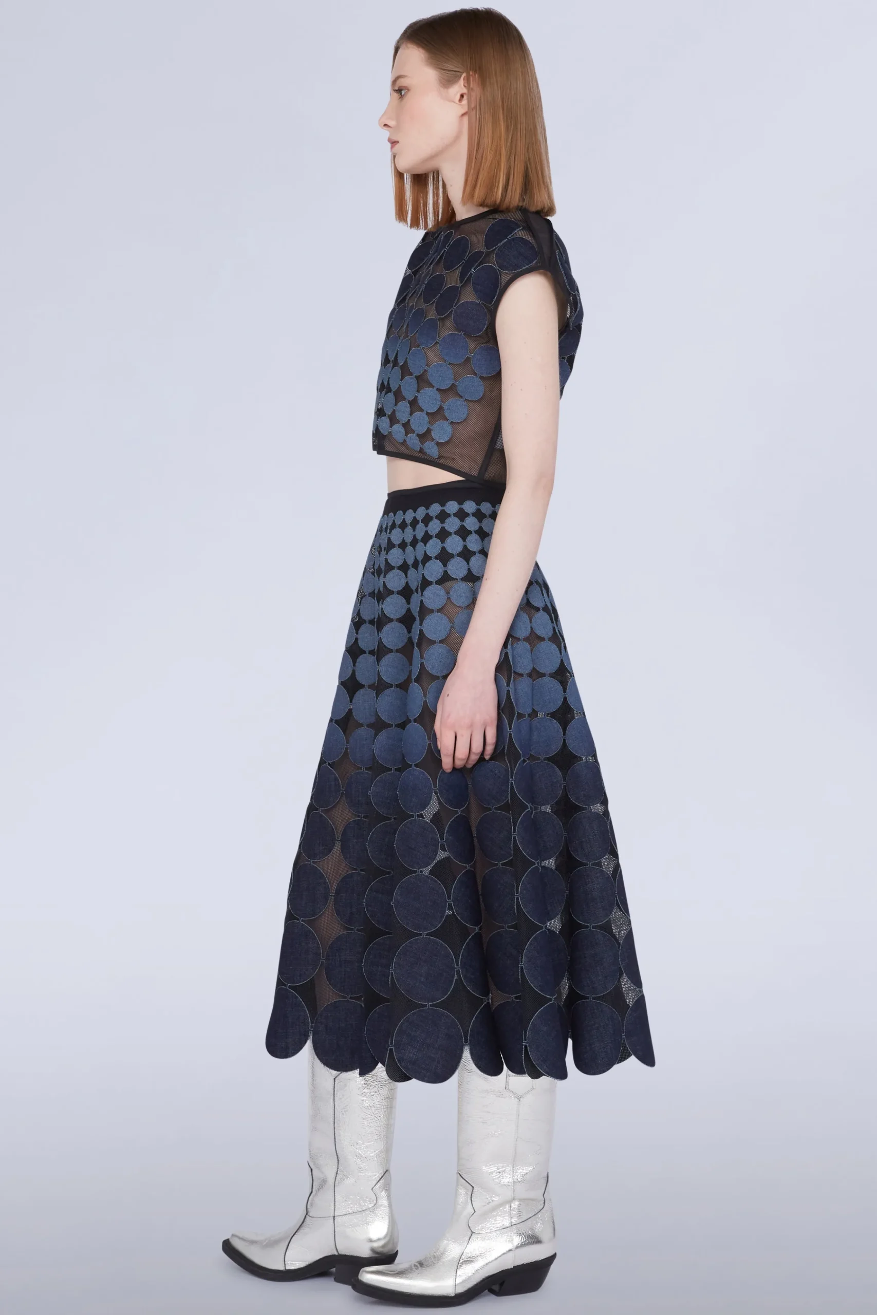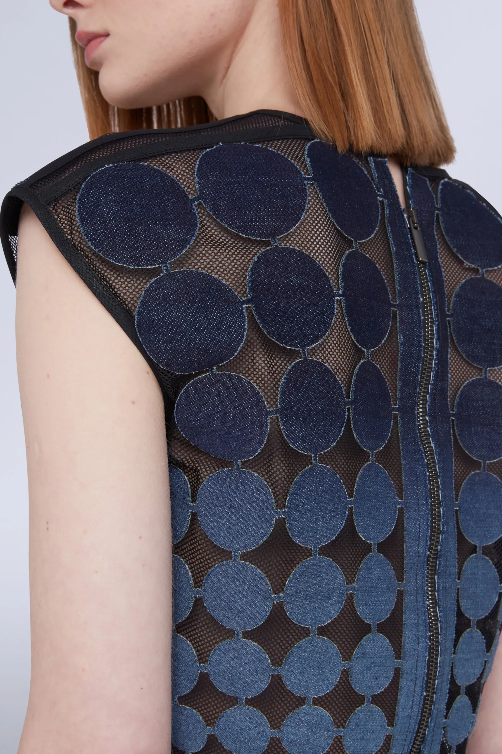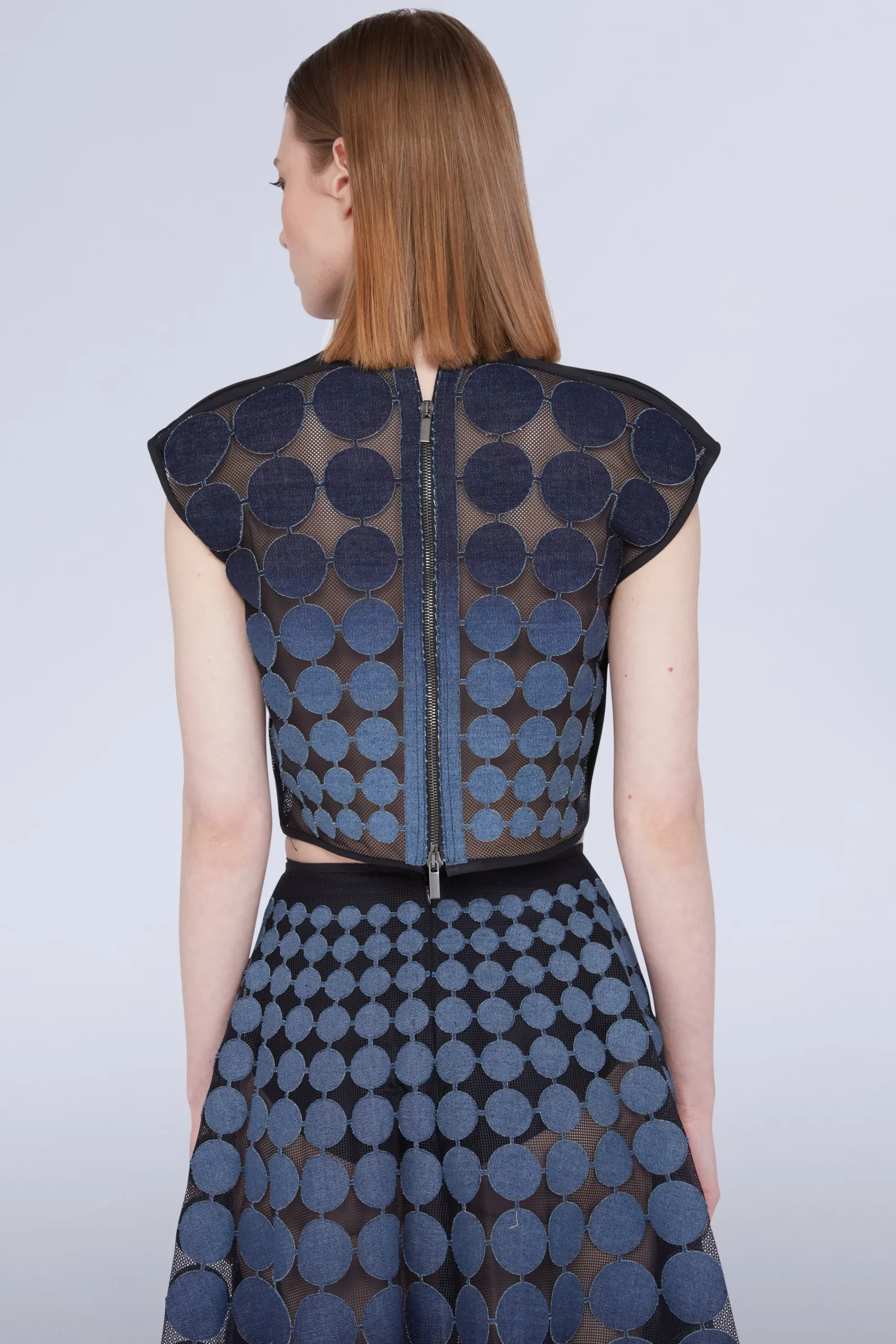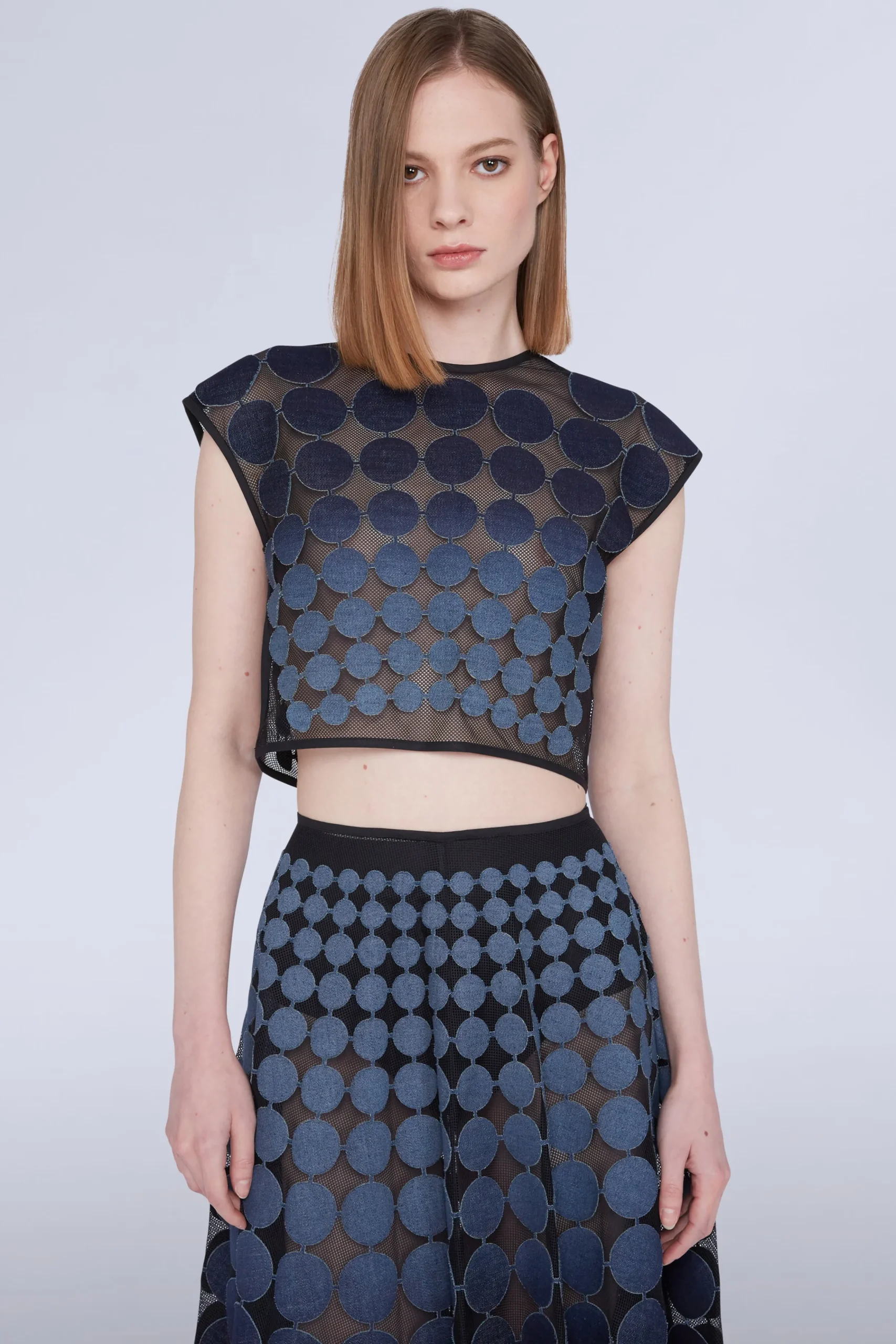Top corto con dischi circolari blu disposti su un tessuto a rete trasparente.