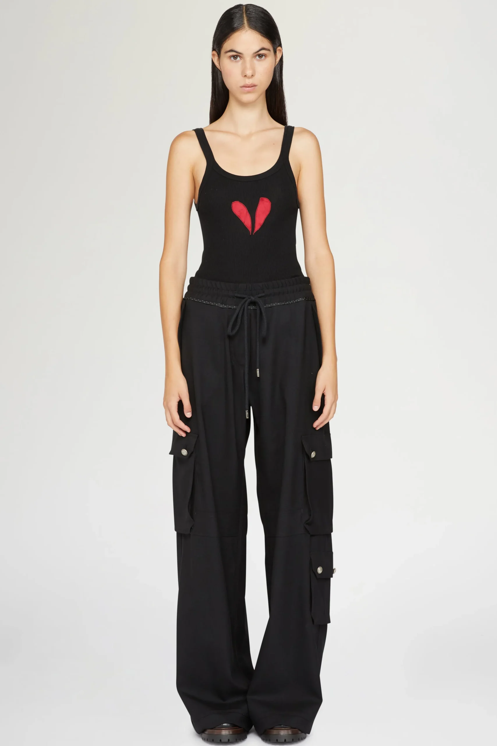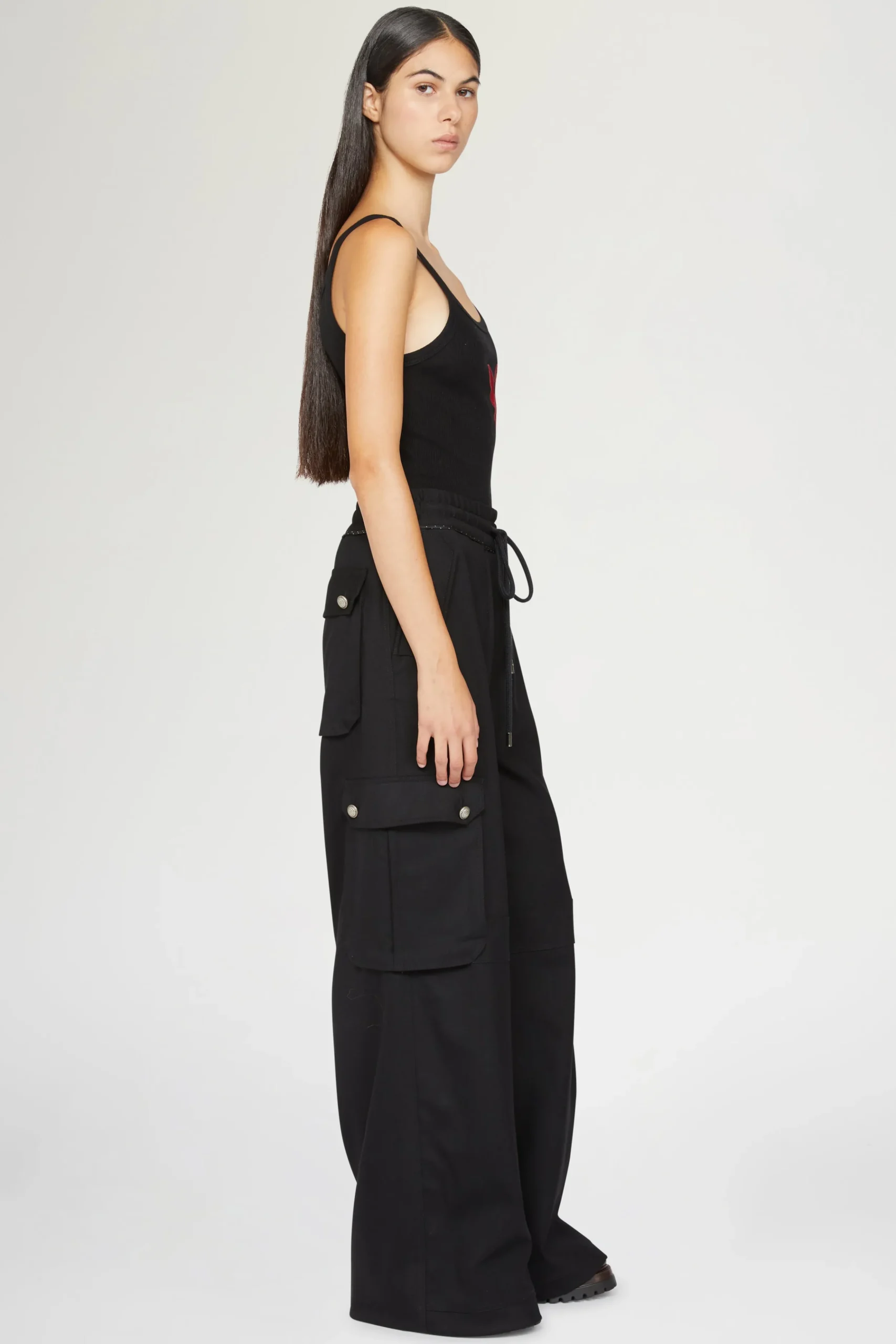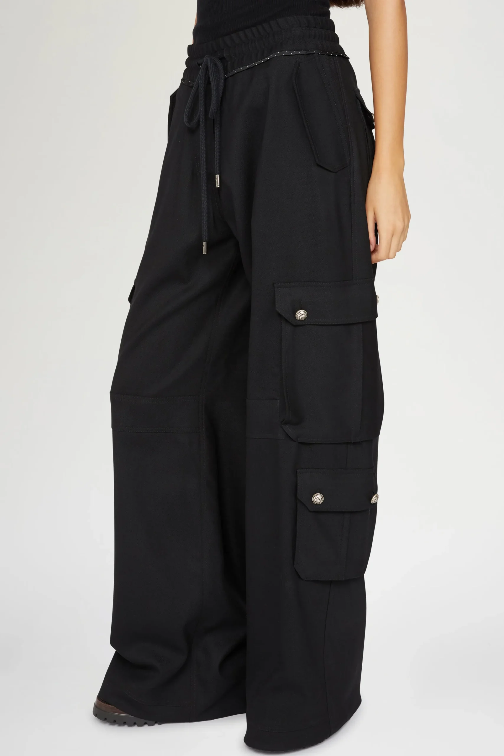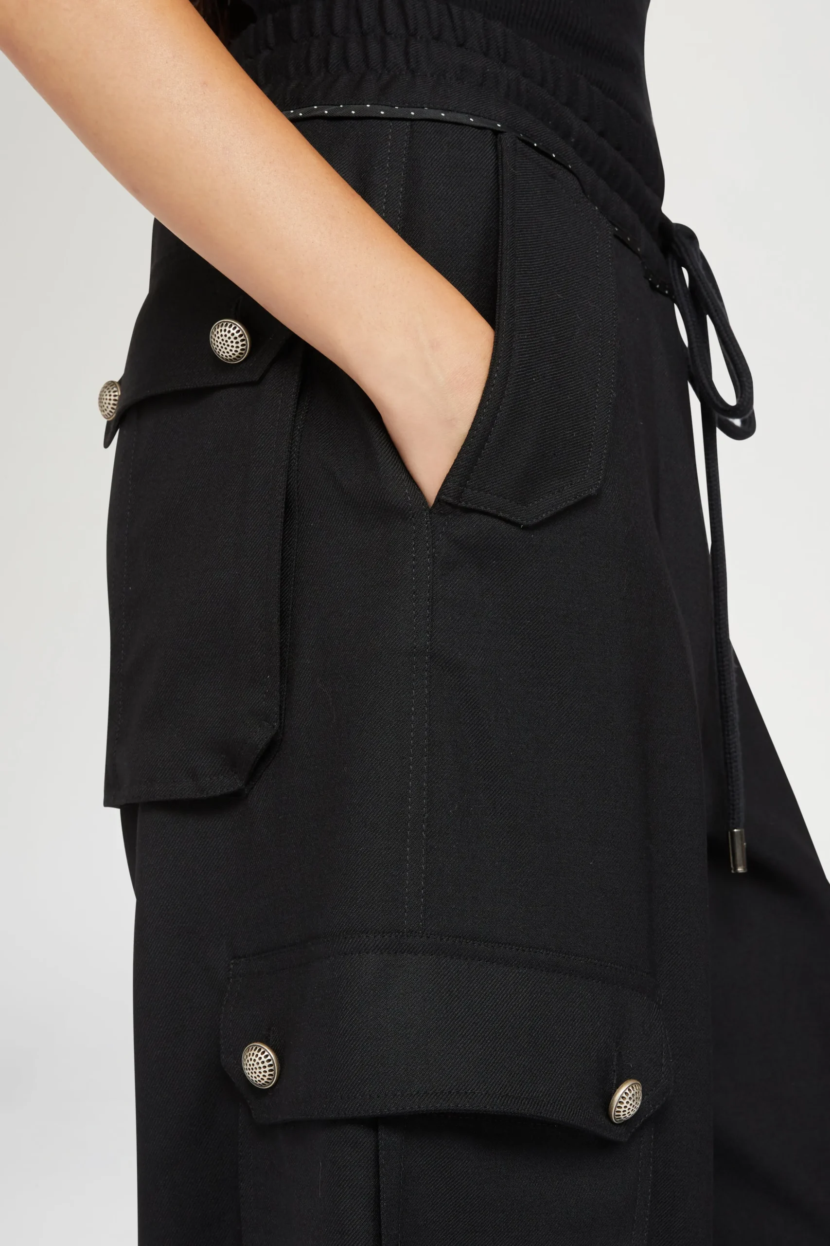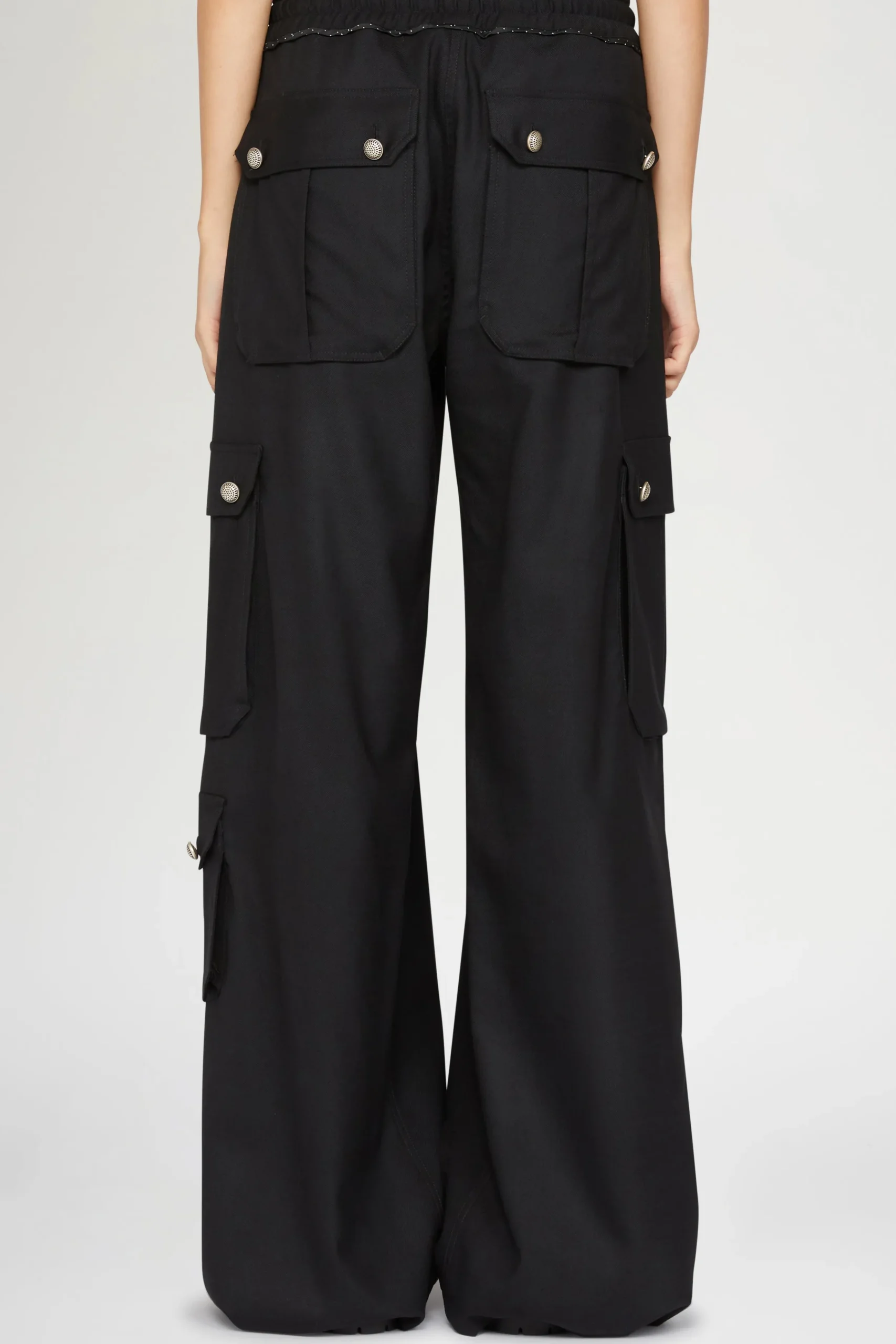 Pantaloni cargo neri a gamba larga, realizzati in tessuto misto lana, con tasche a pattina funzionali e dettagli con bottoni.