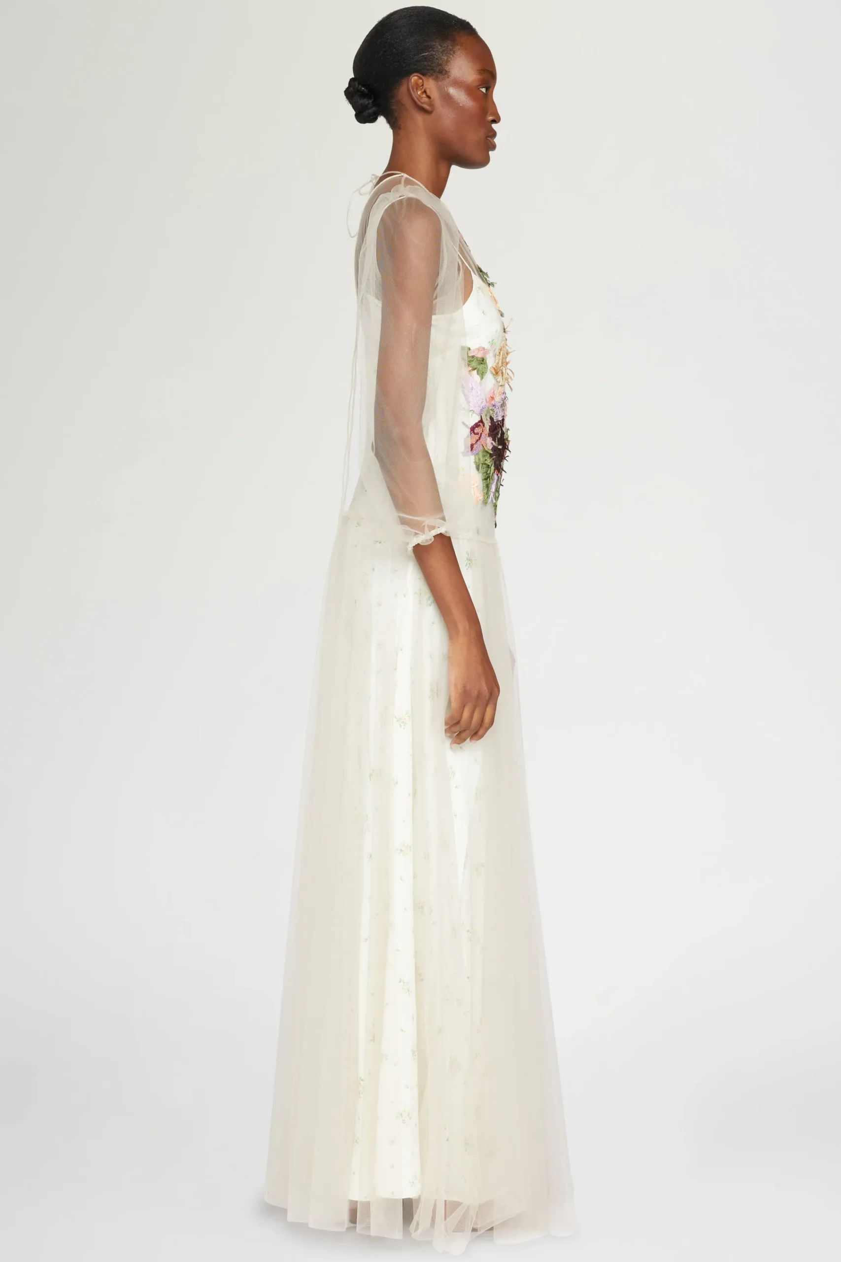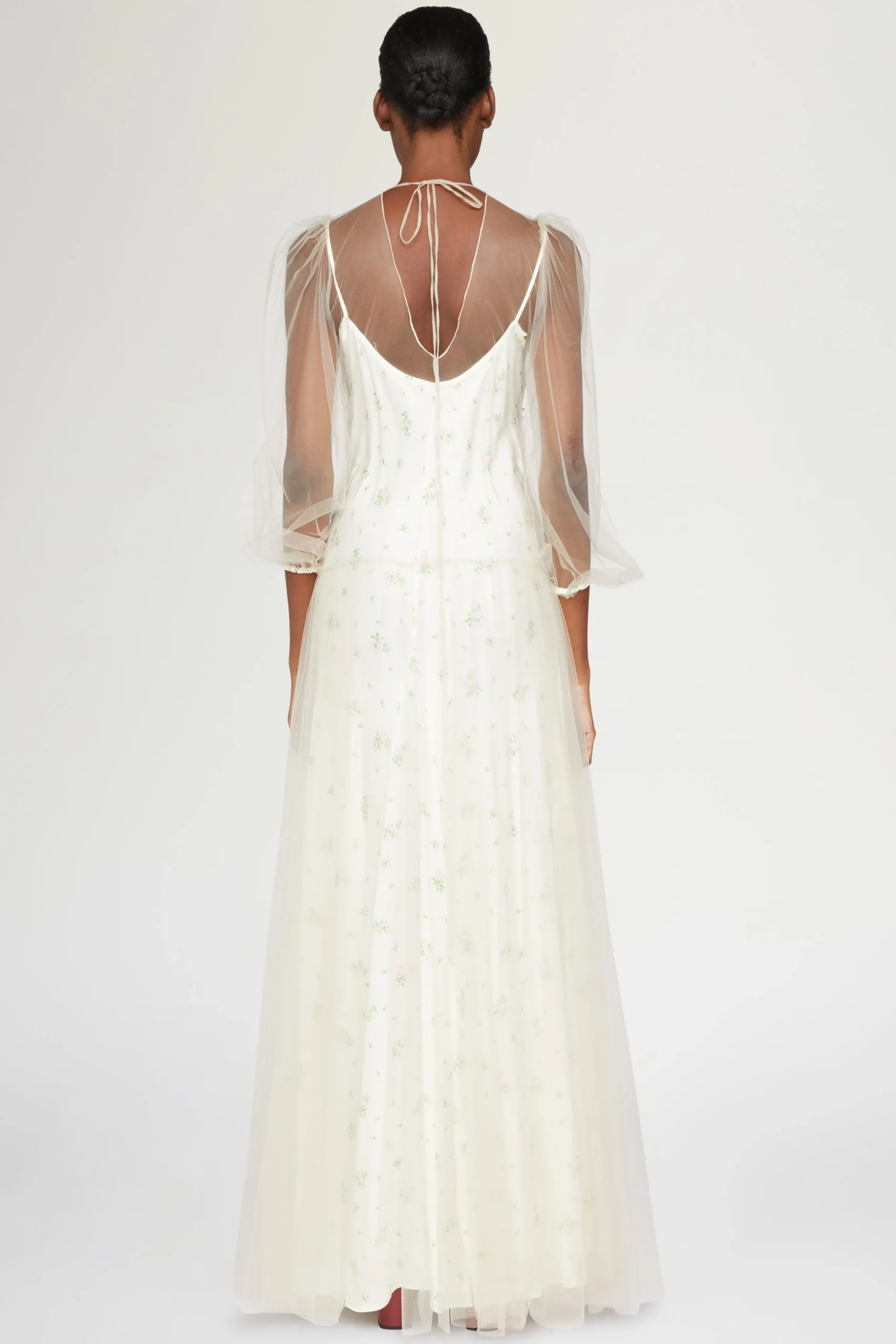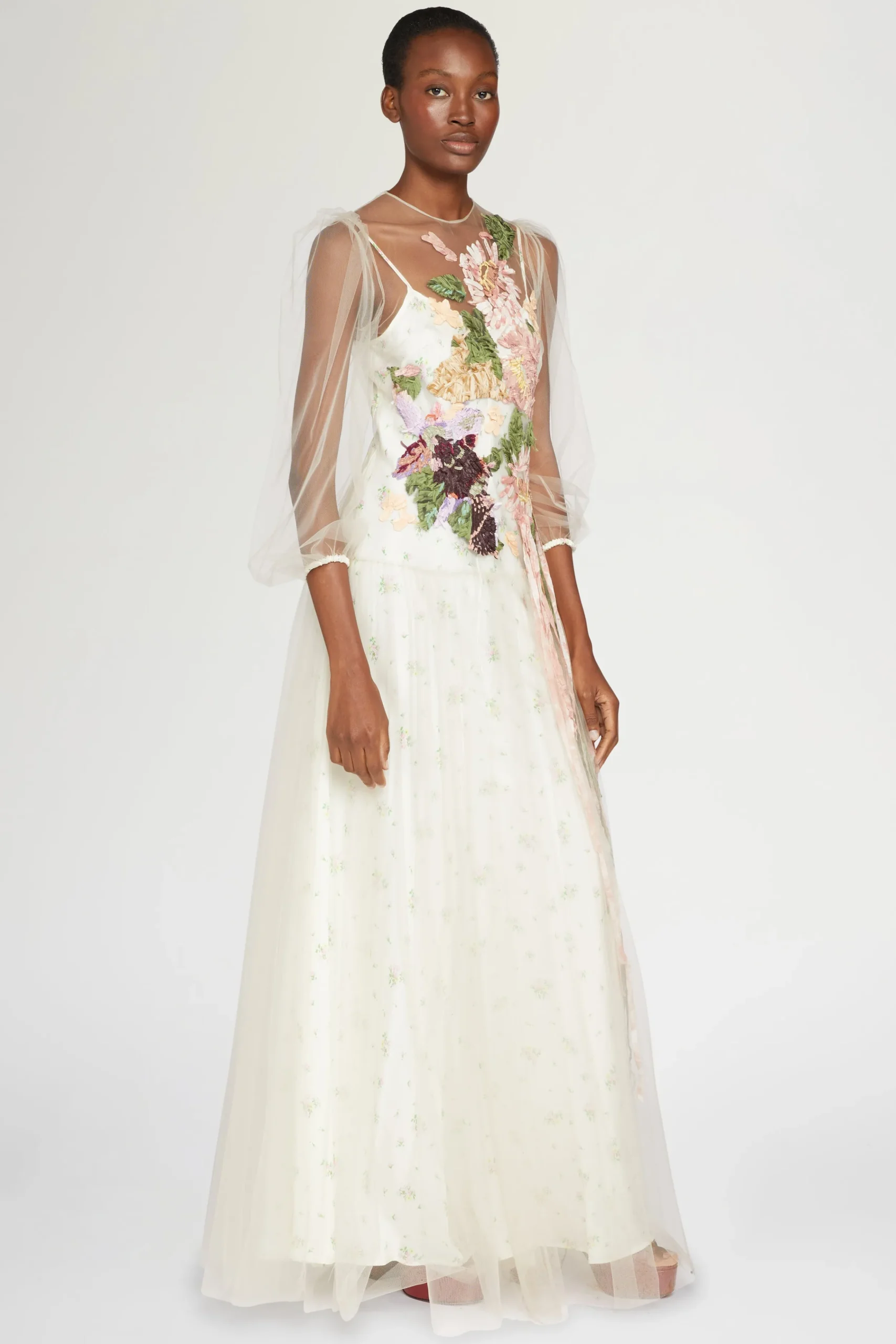 Lungo abito bianco in tessuto trasparente adornato con ricami floreali. Viene fornito con una sottoveste floreale coordinata.