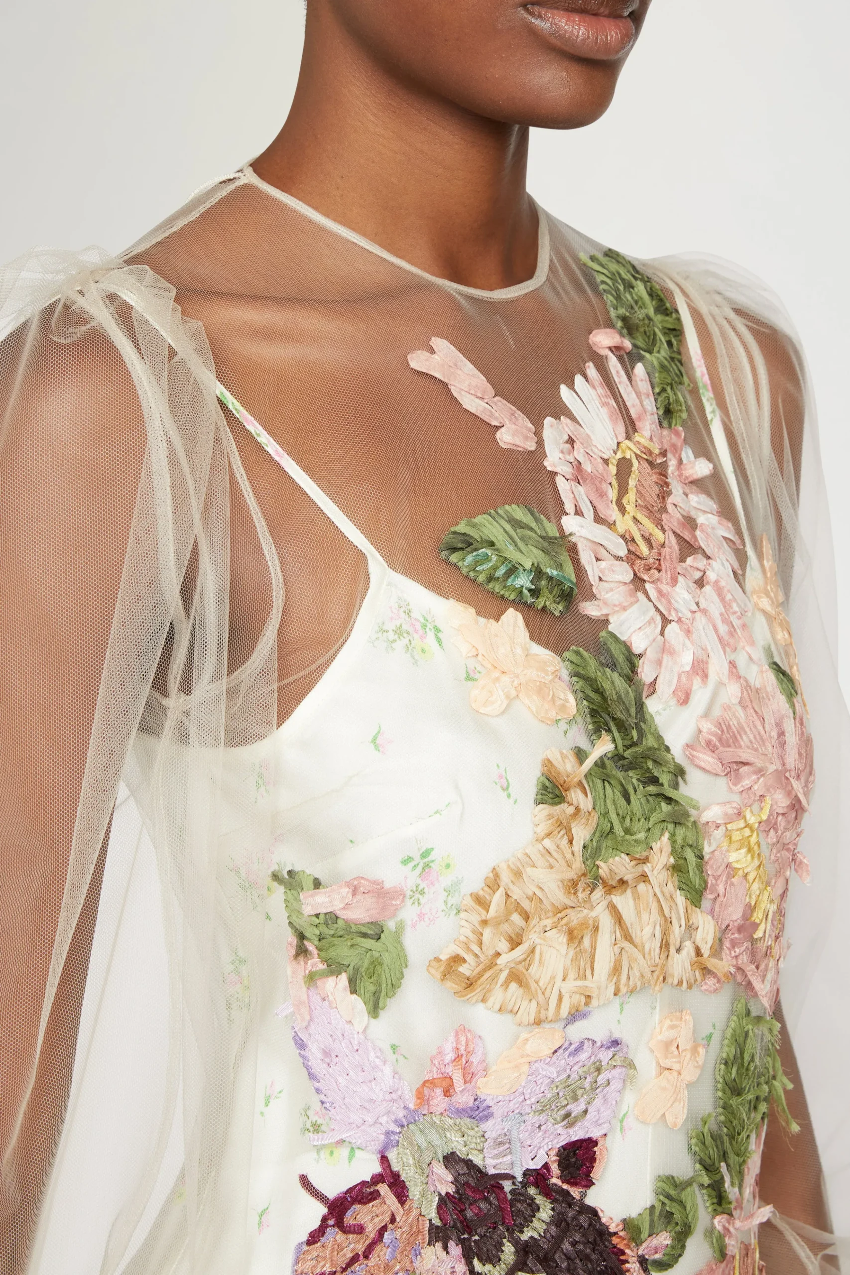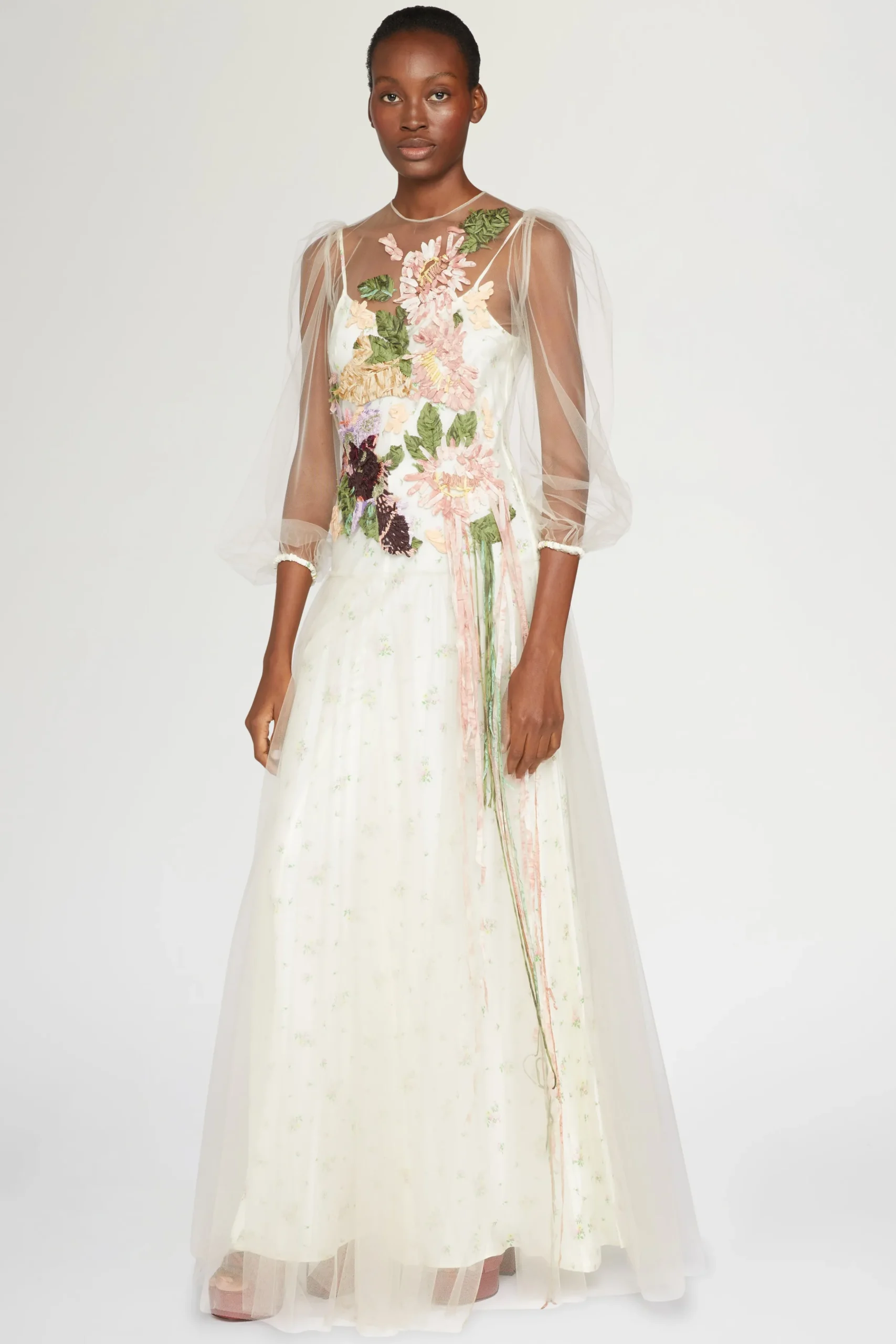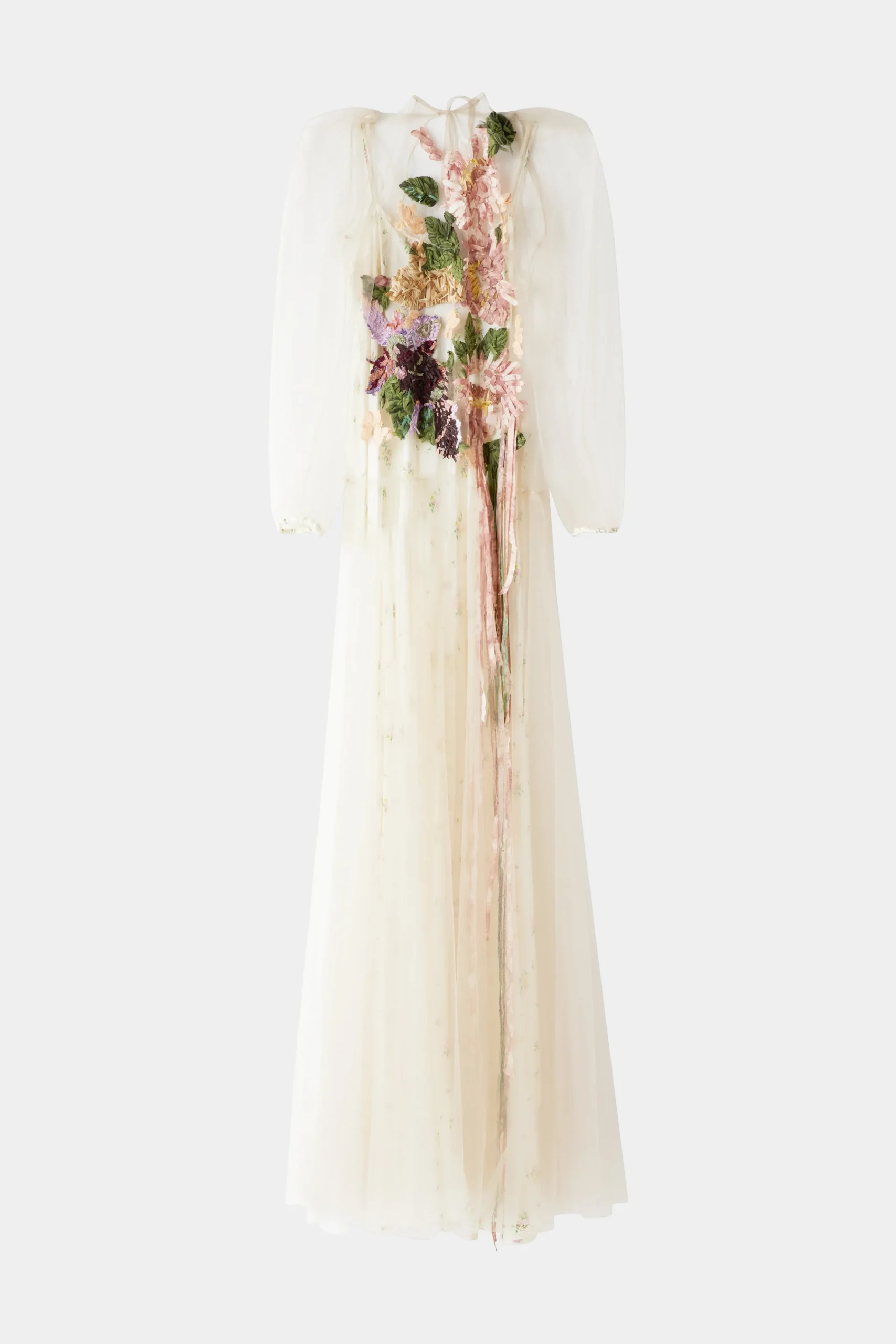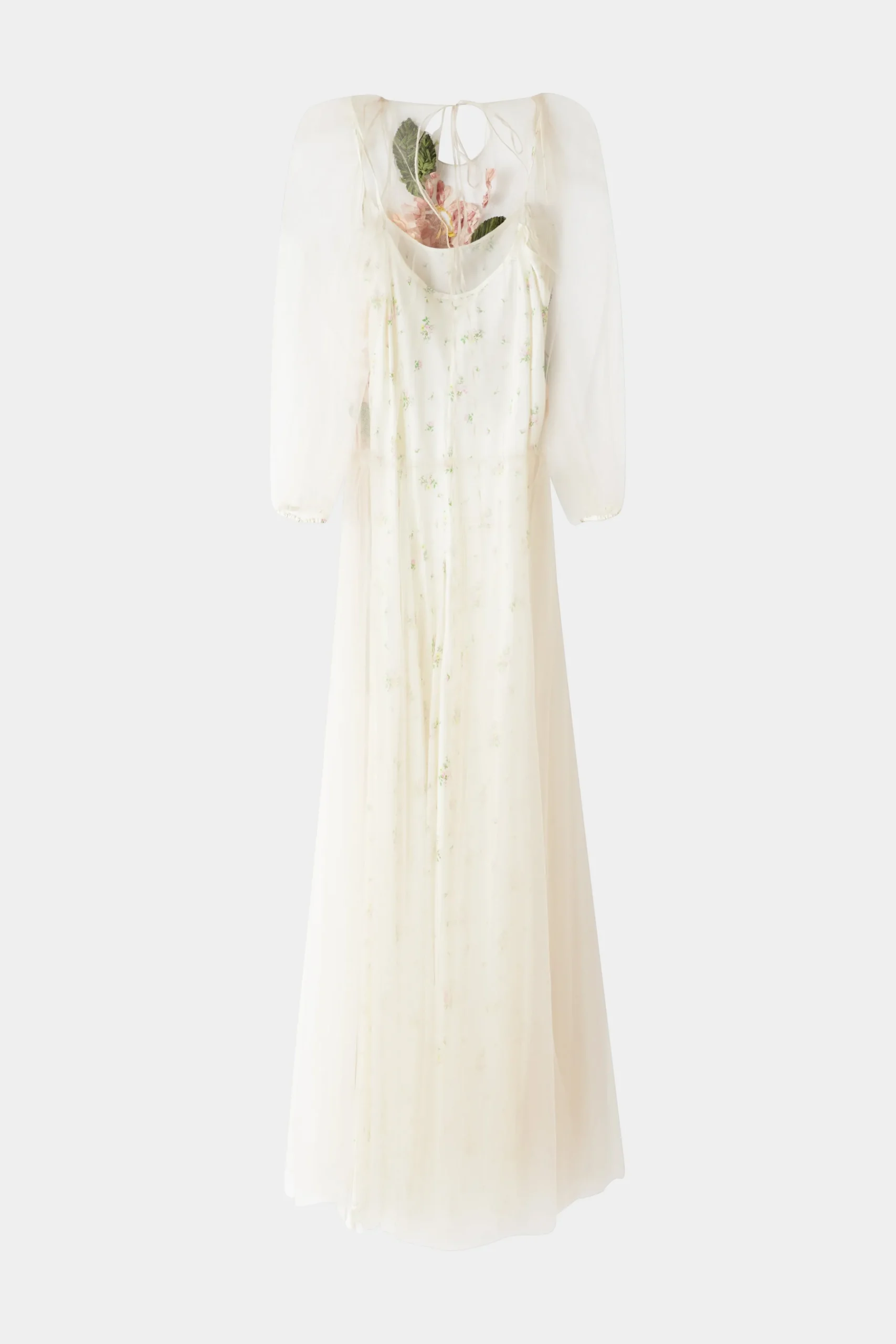 Lungo abito bianco in tessuto trasparente adornato con ricami floreali. Viene fornito con una sottoveste floreale coordinata.