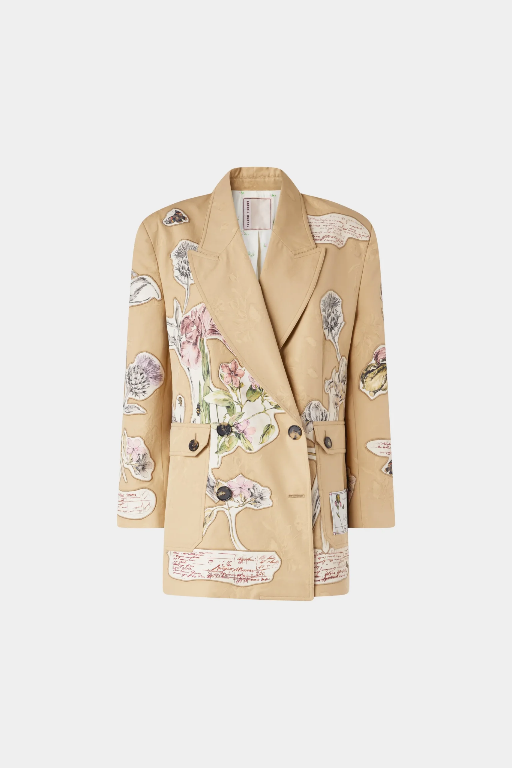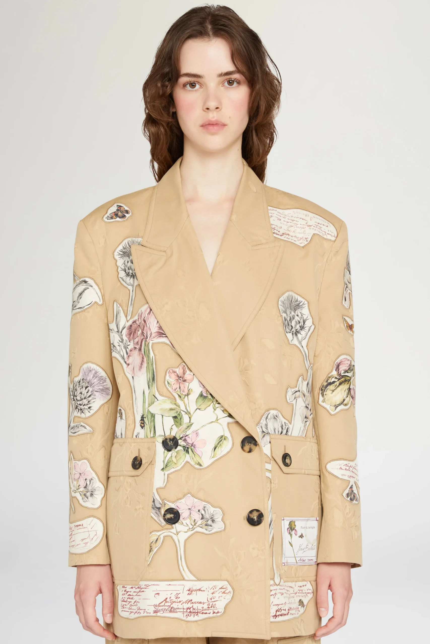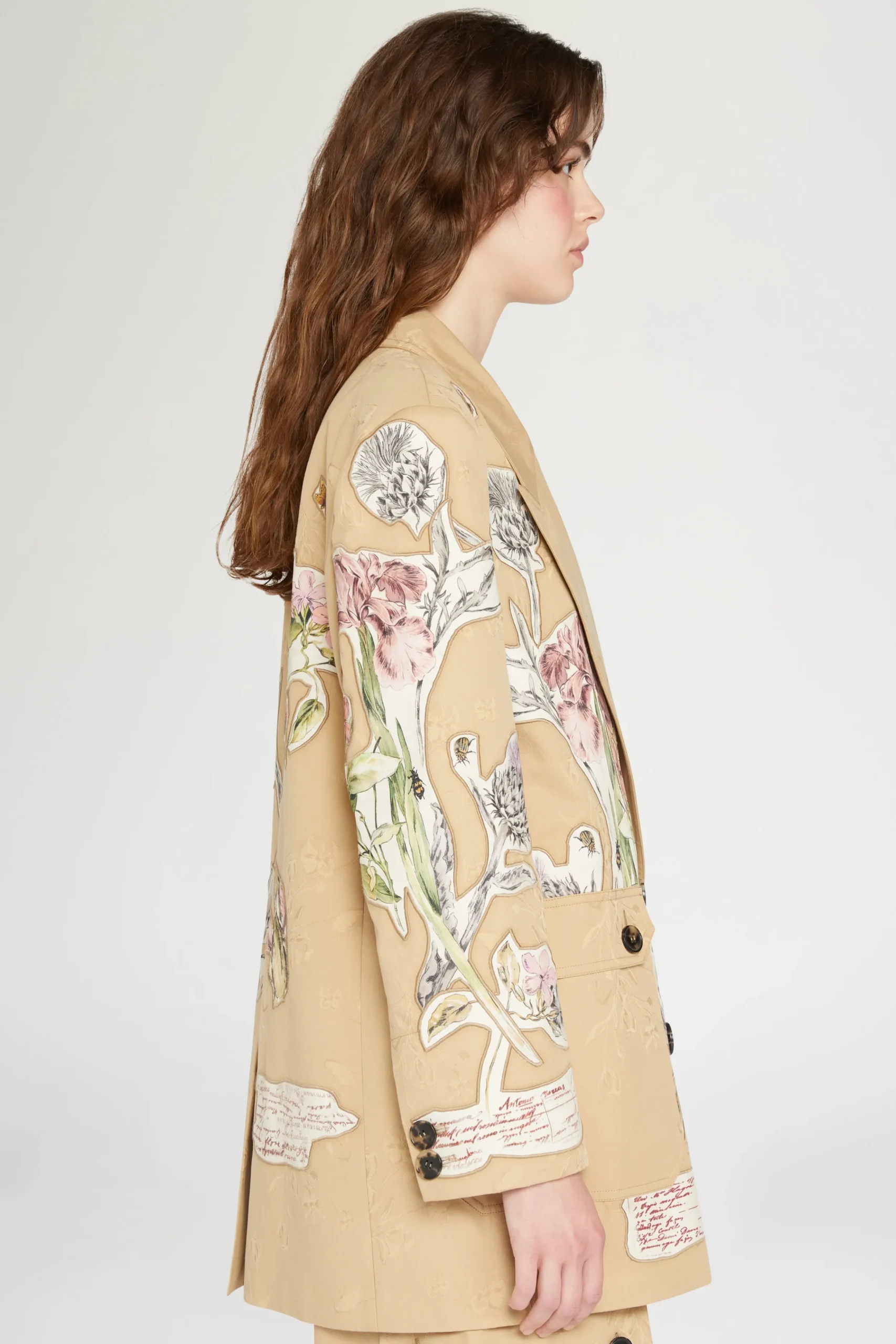 Blazer doppiopetto in 100% cotone con una silhouette su misura, caratterizzato da una base beige decorata con patchwork a tema botanico e dettagli in scrittura.