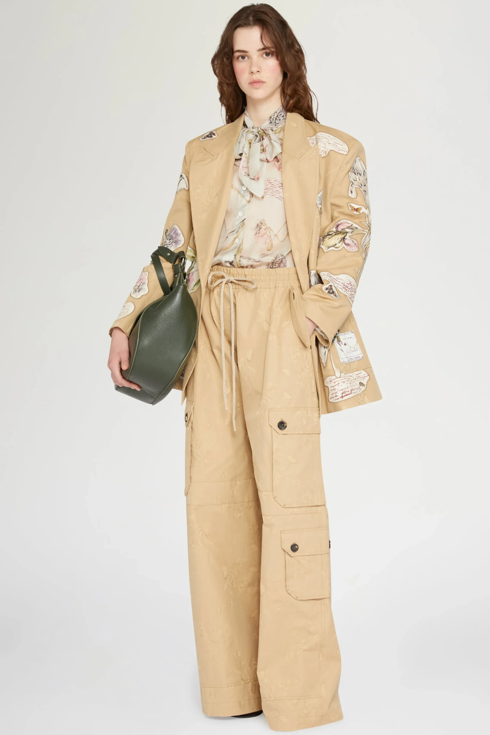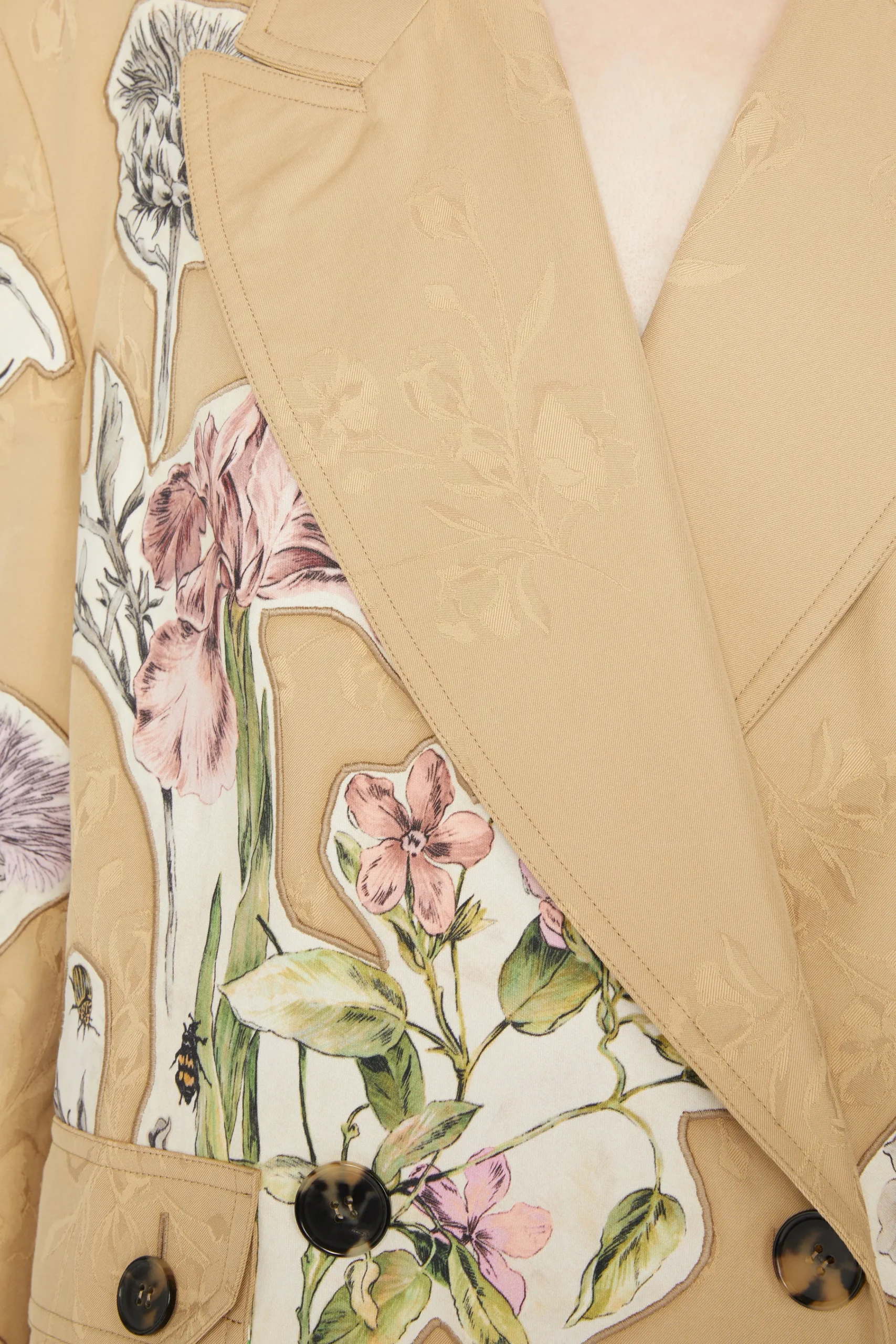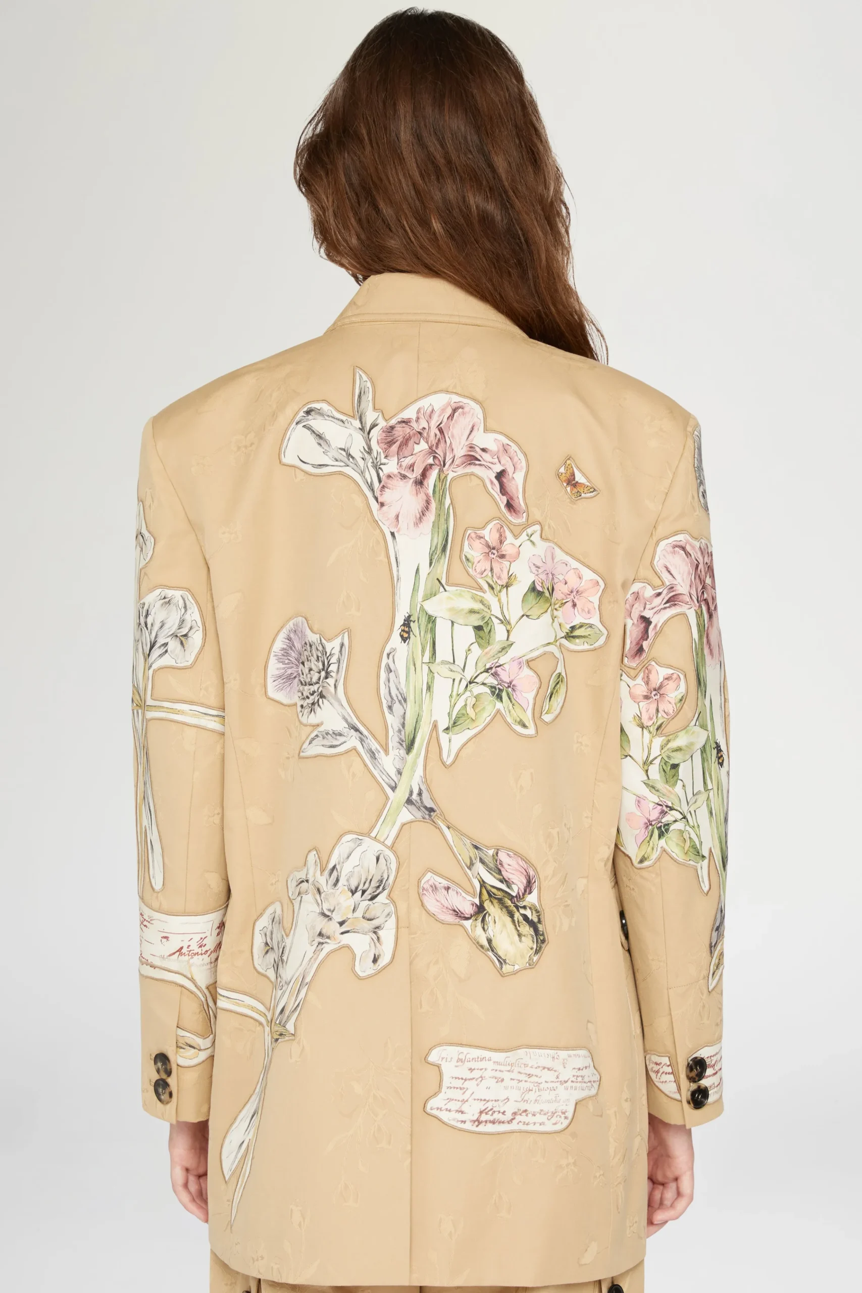 Blazer doppiopetto in 100% cotone con una silhouette su misura, caratterizzato da una base beige decorata con patchwork a tema botanico e dettagli in scrittura.