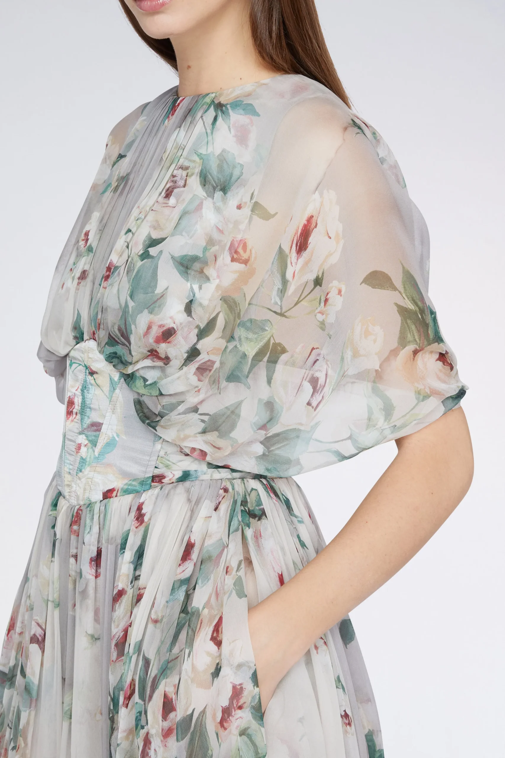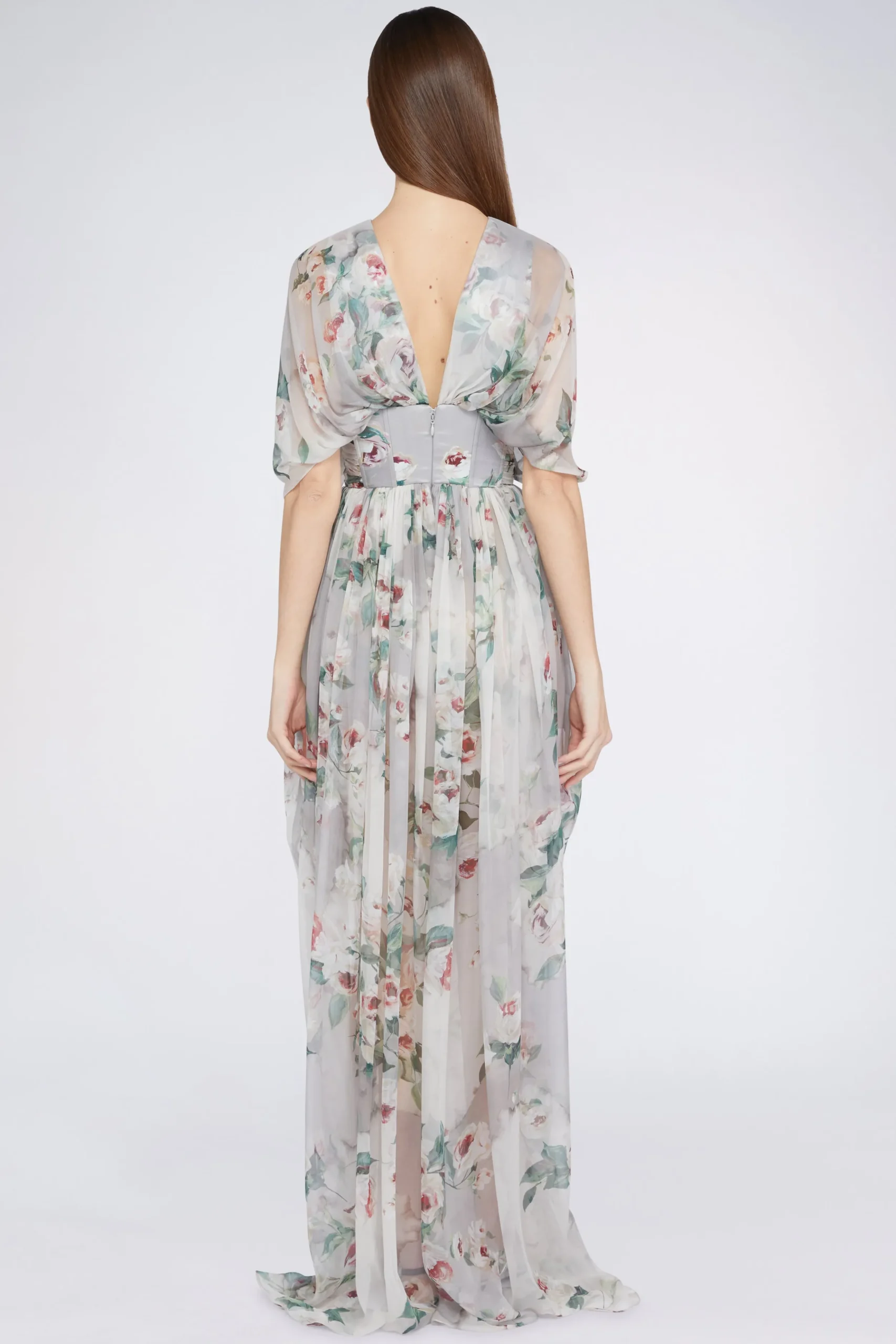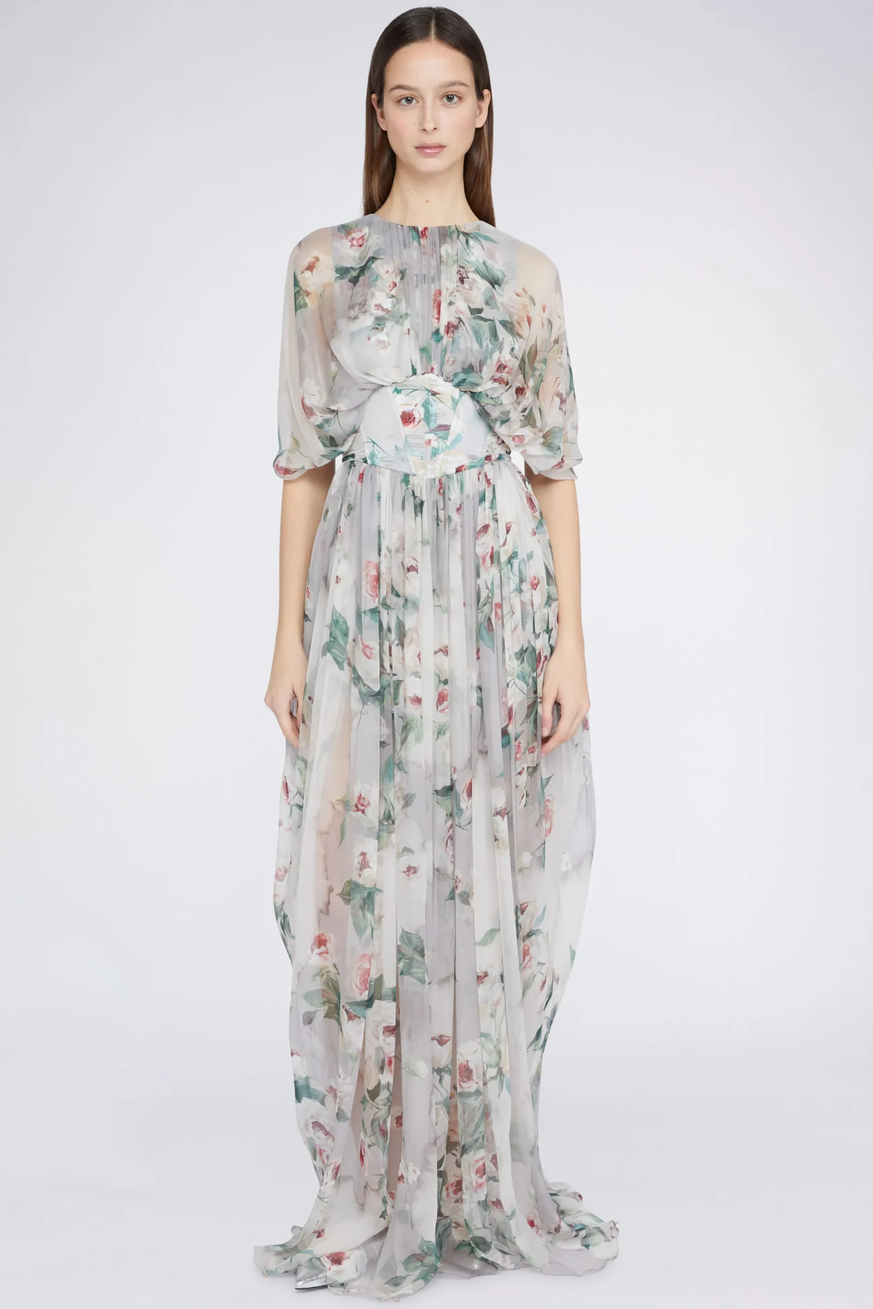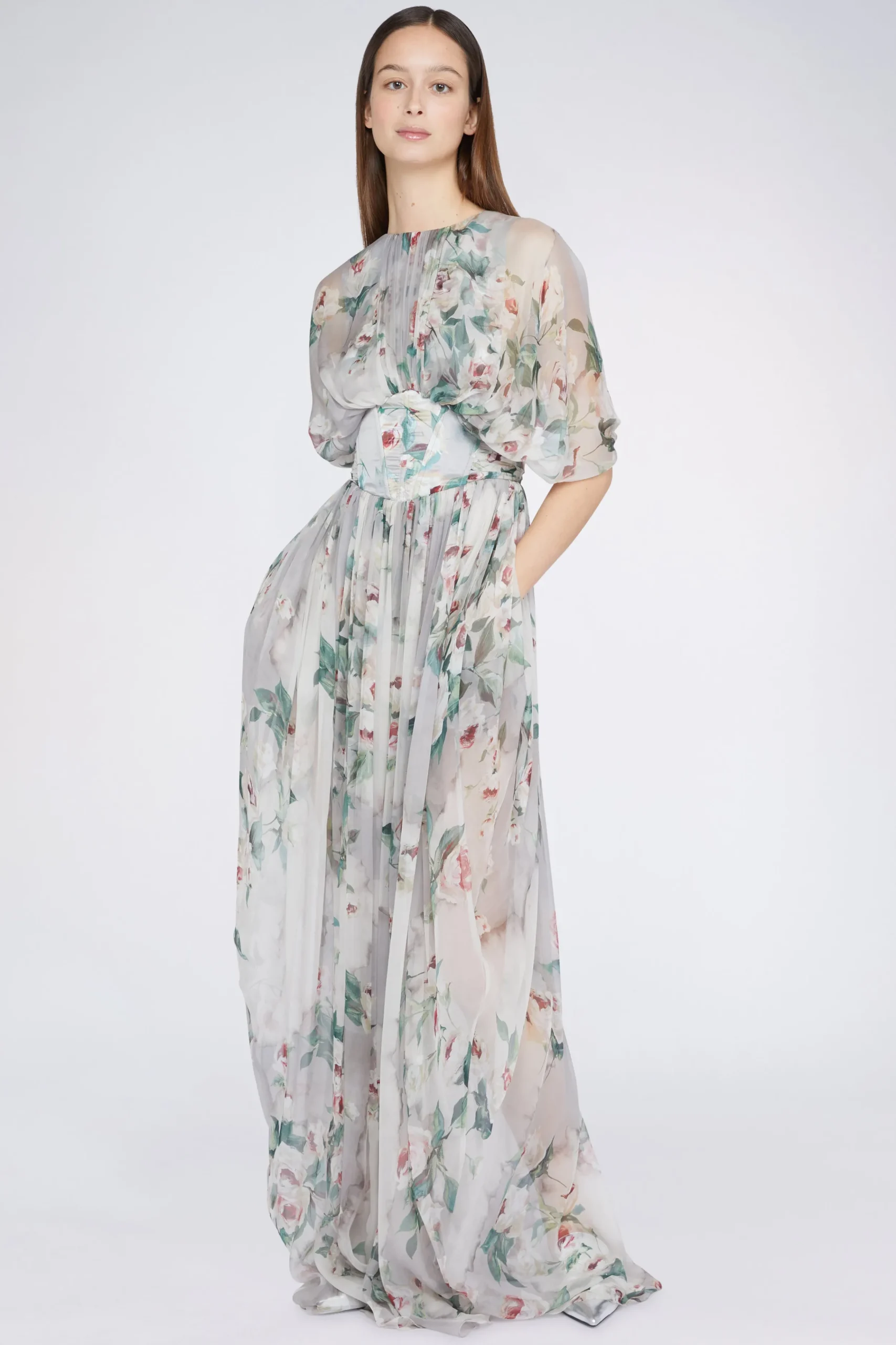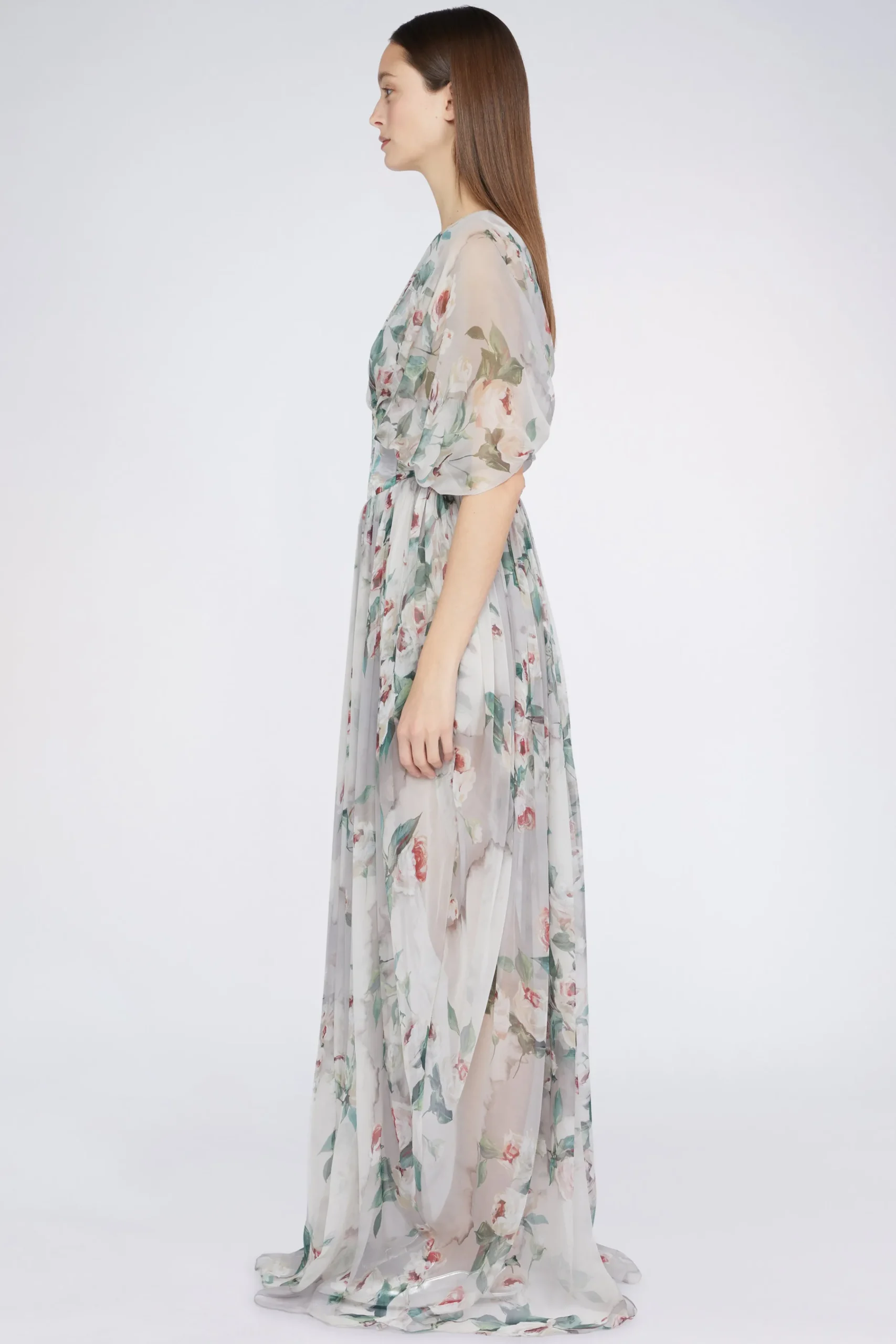 Abito lungo in seta maxi con silhouette fluida, vita cinchata e maniche ampie. Presenta una delicata stampa floreale su un tessuto grigio trasparente.