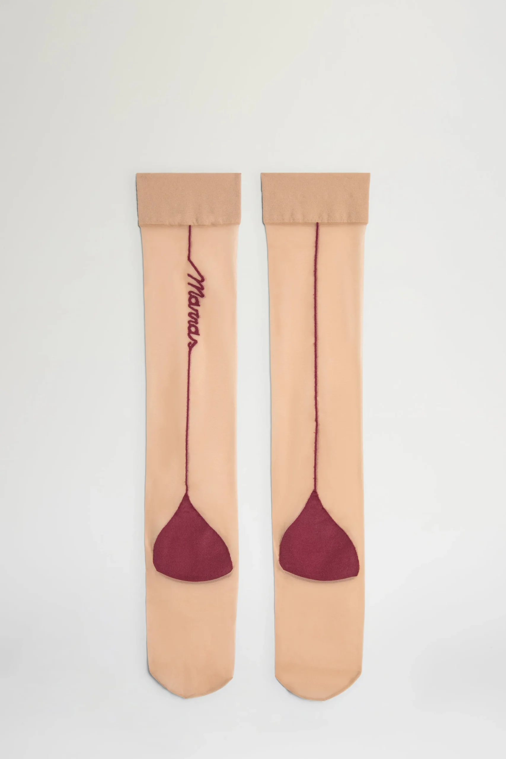 Calze trasparenti color carne al ginocchio con logo bordeaux Marras e linea sul retro.
