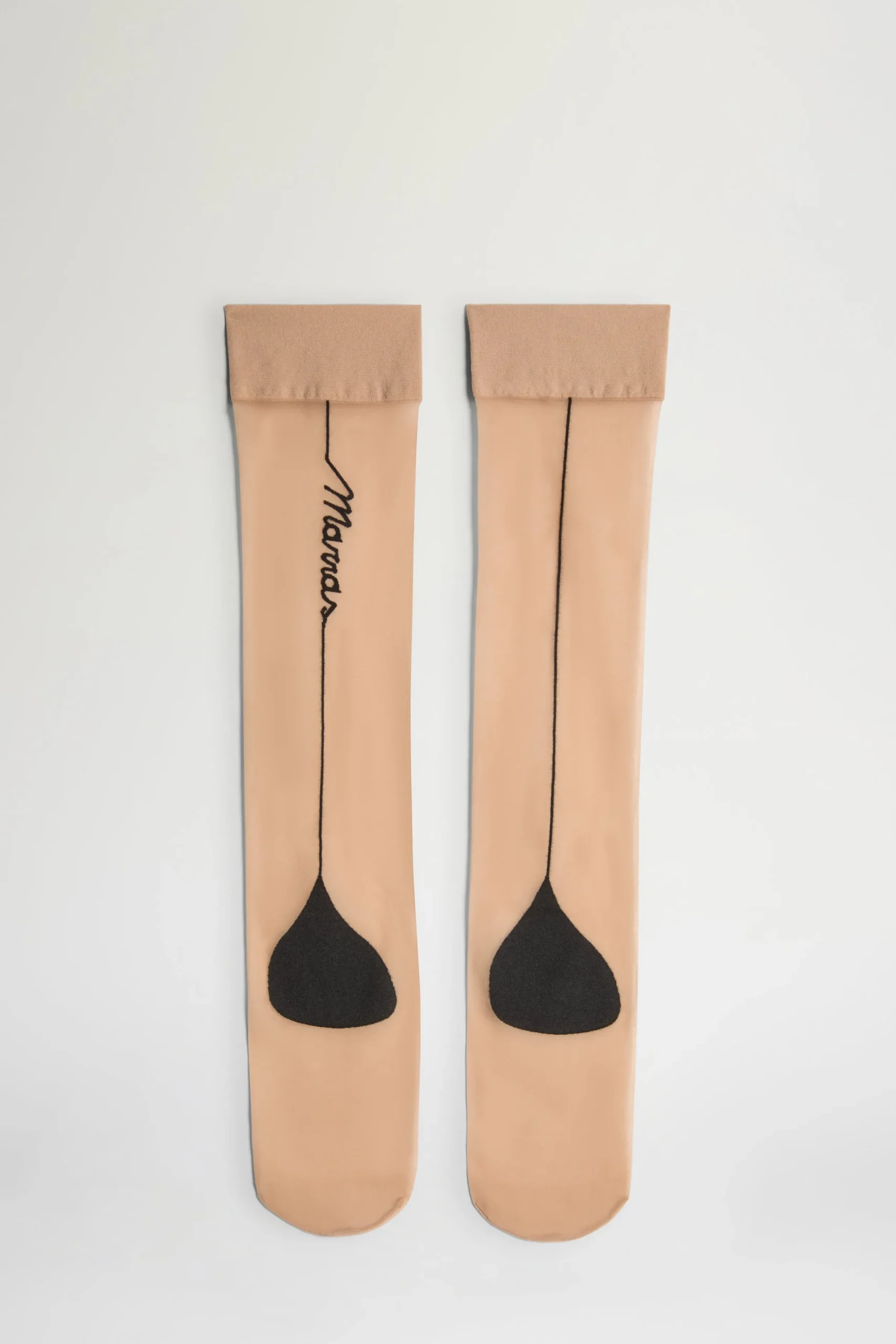 Calze trasparenti color carne fino al ginocchio con logo Marras nero e linea sul retro.