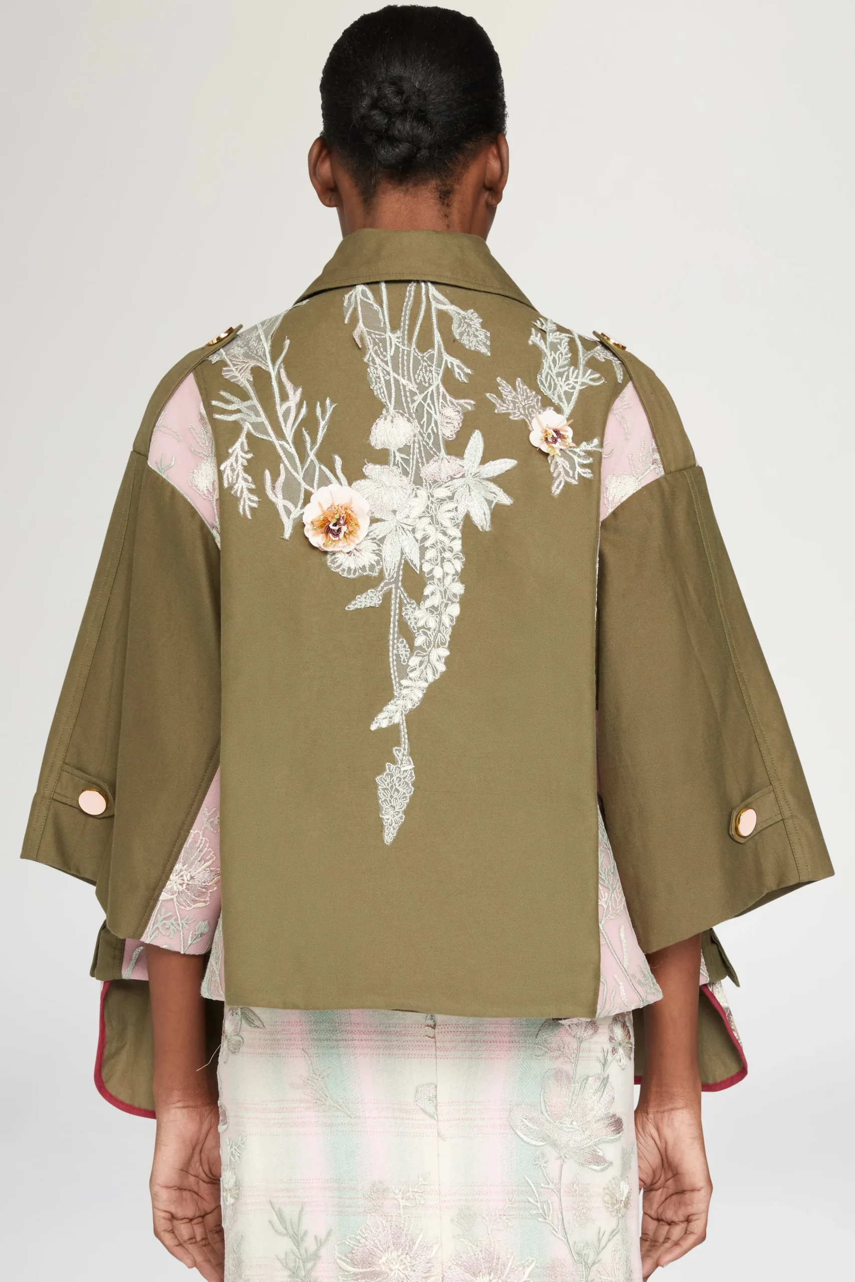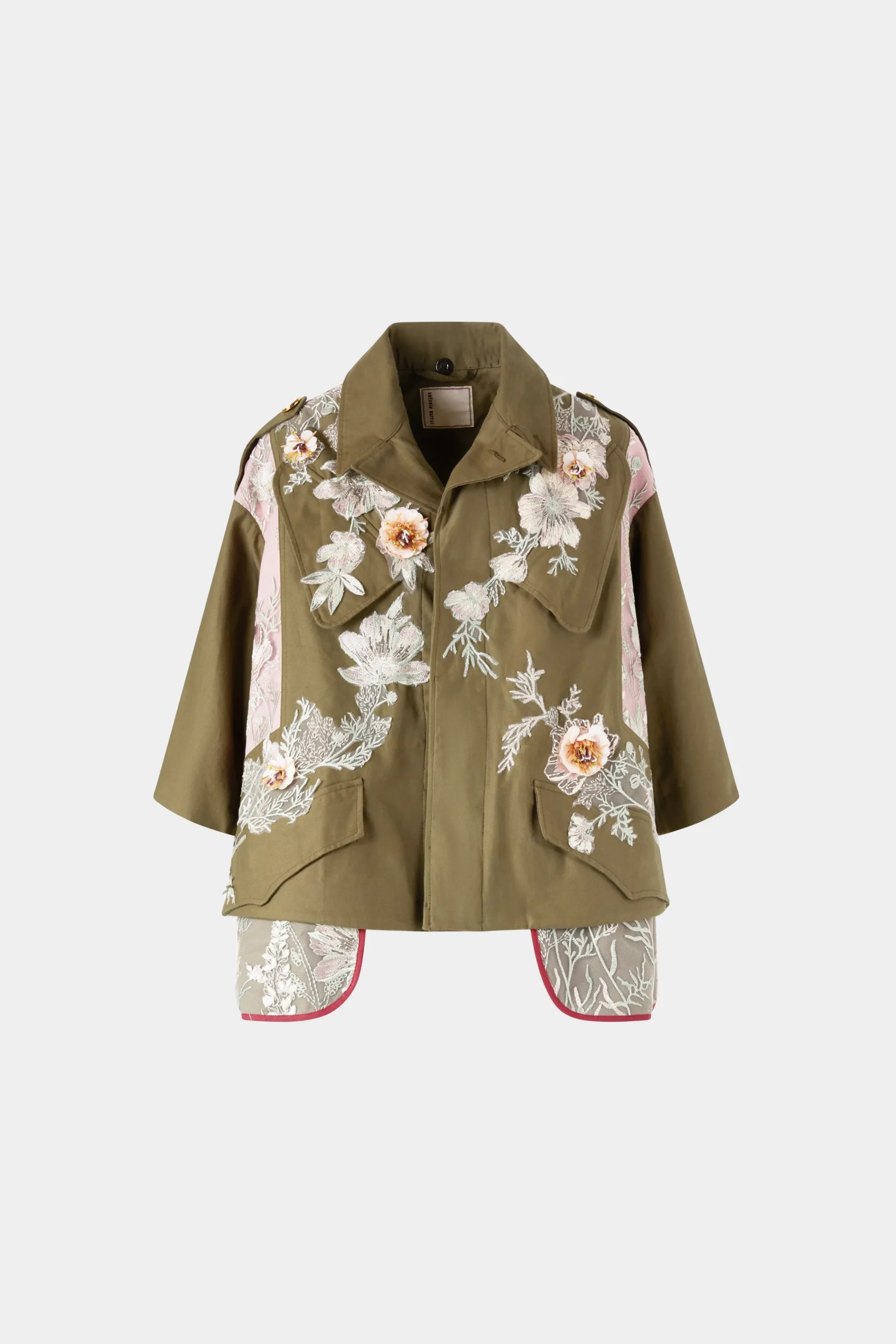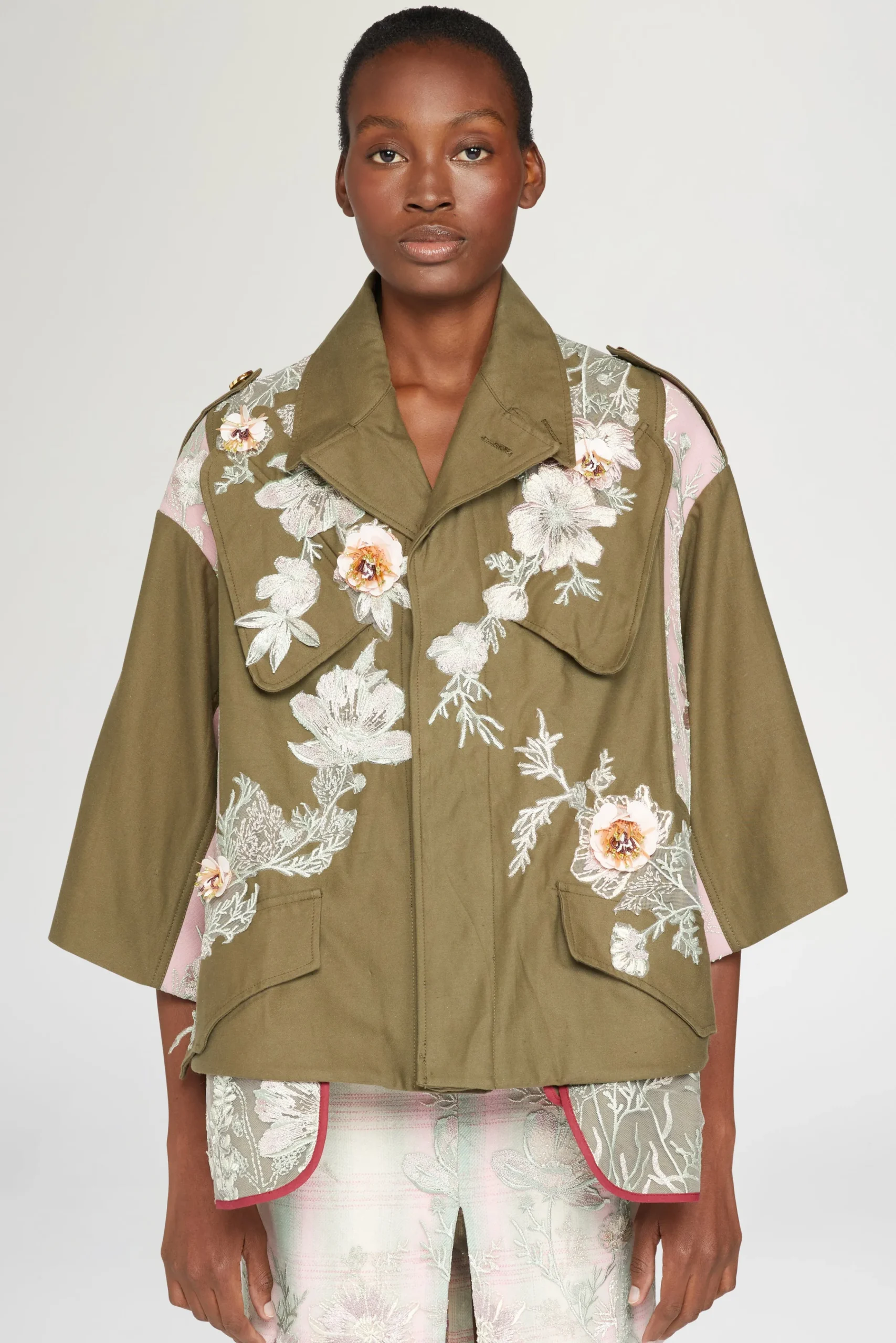 Parka corto in cotone verde oliva, adornato con ricami floreali rosa e tasche a toppa.