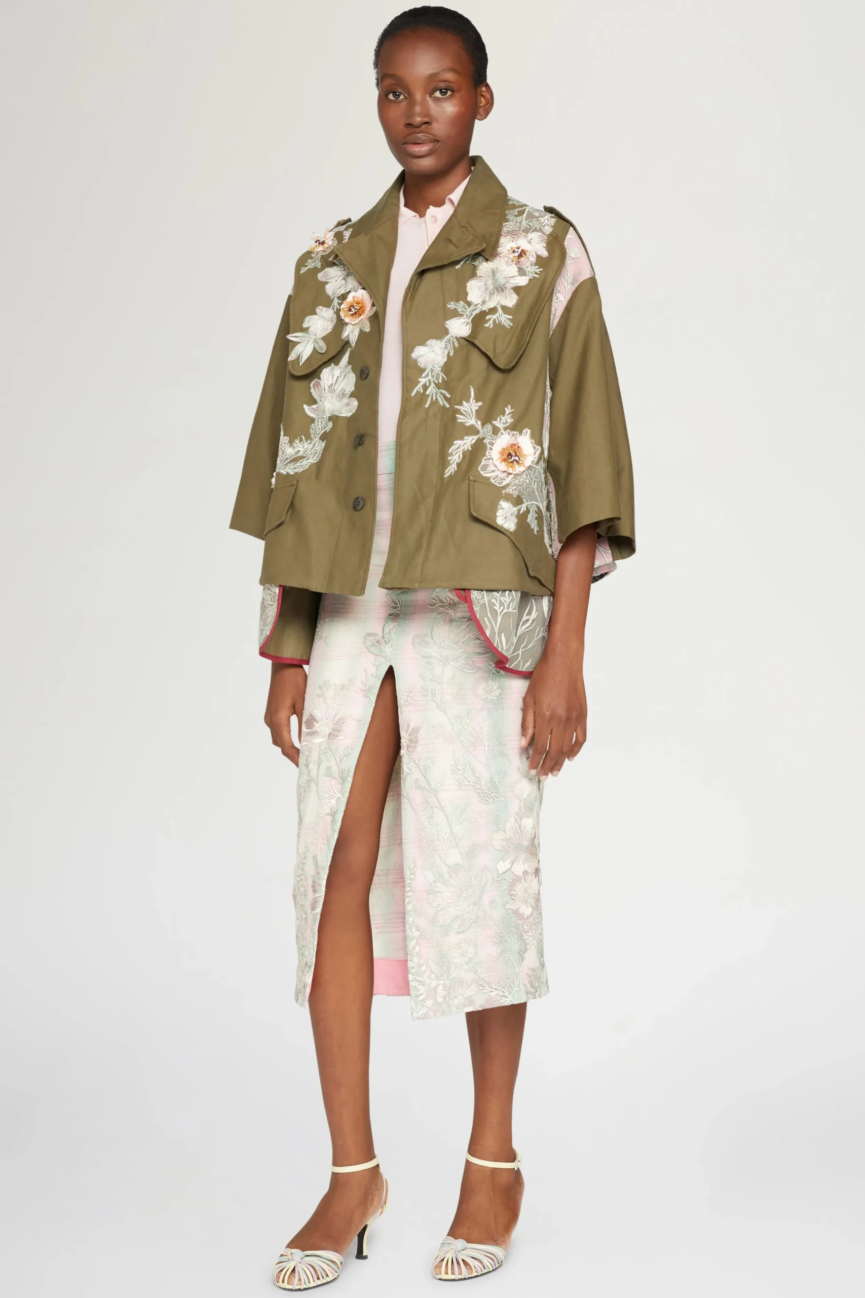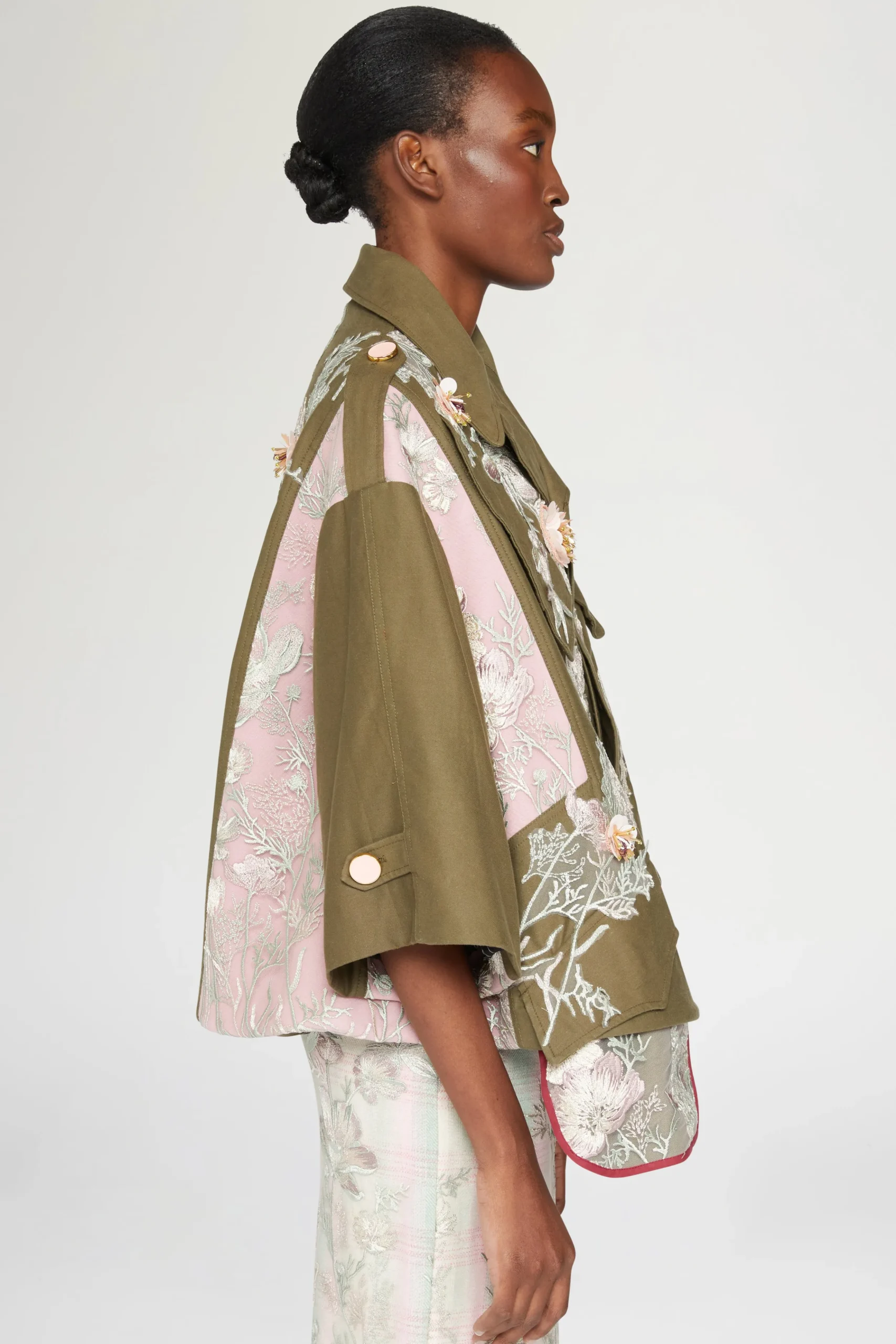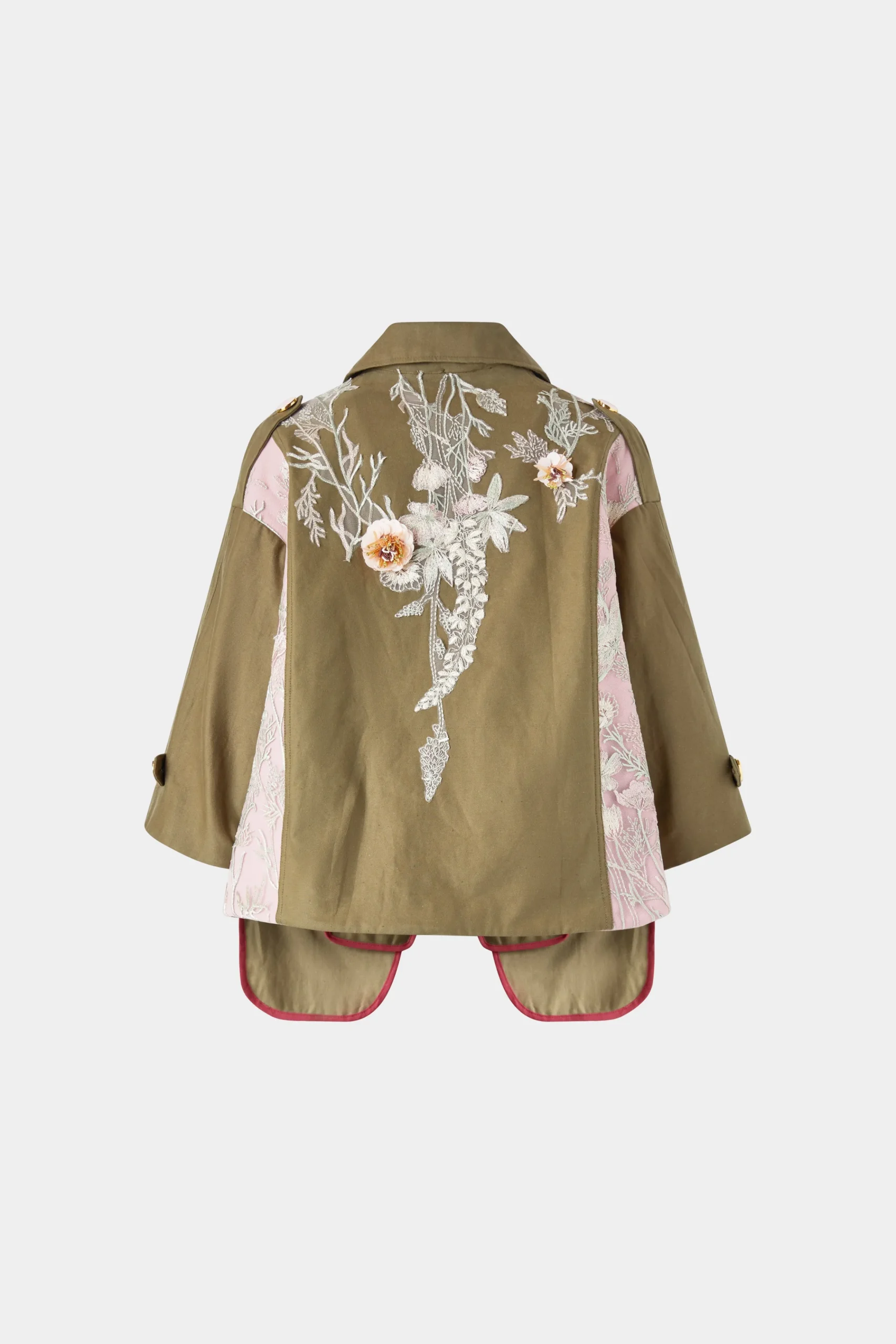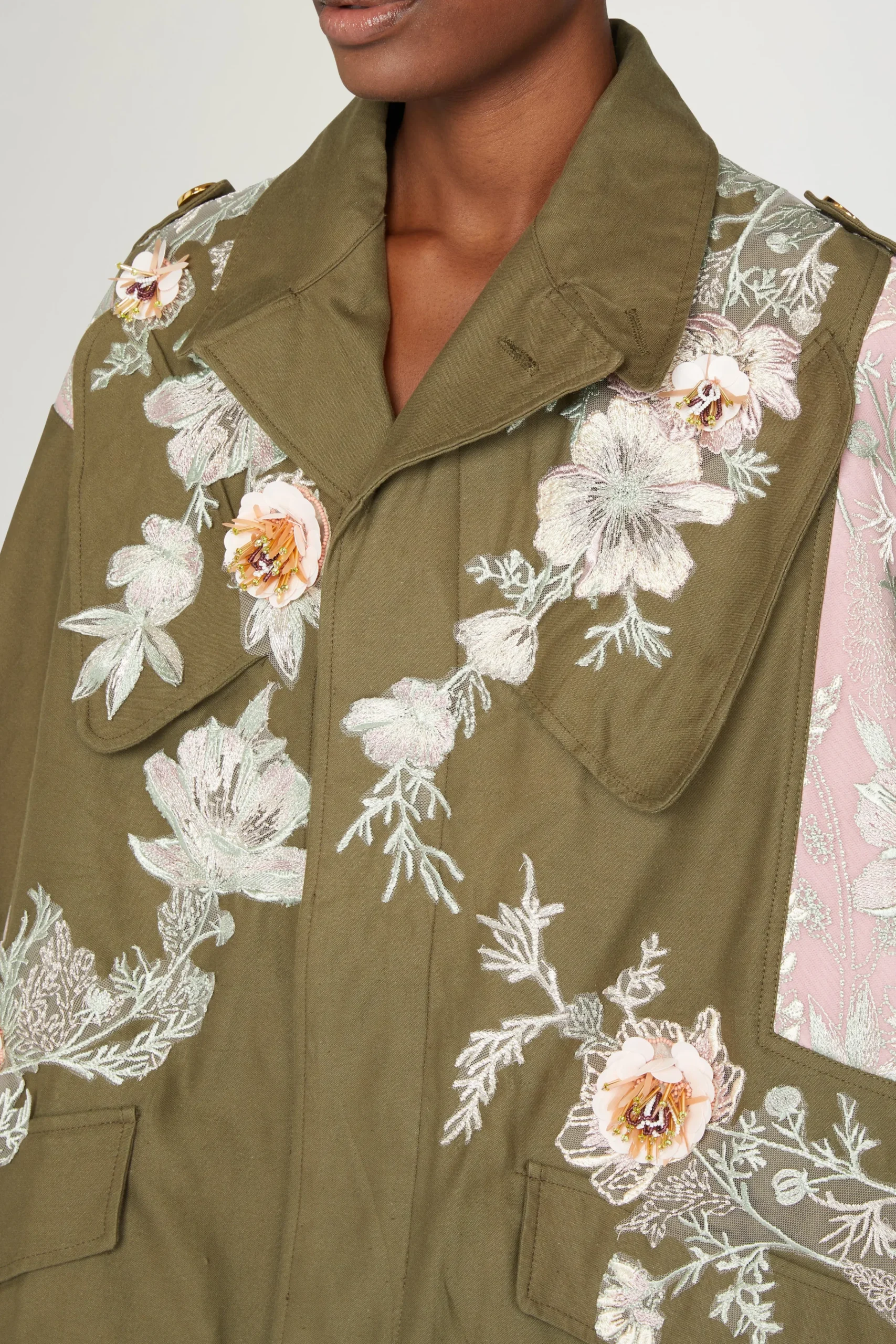 Parka corto in cotone verde oliva, adornato con ricami floreali rosa e tasche a toppa.