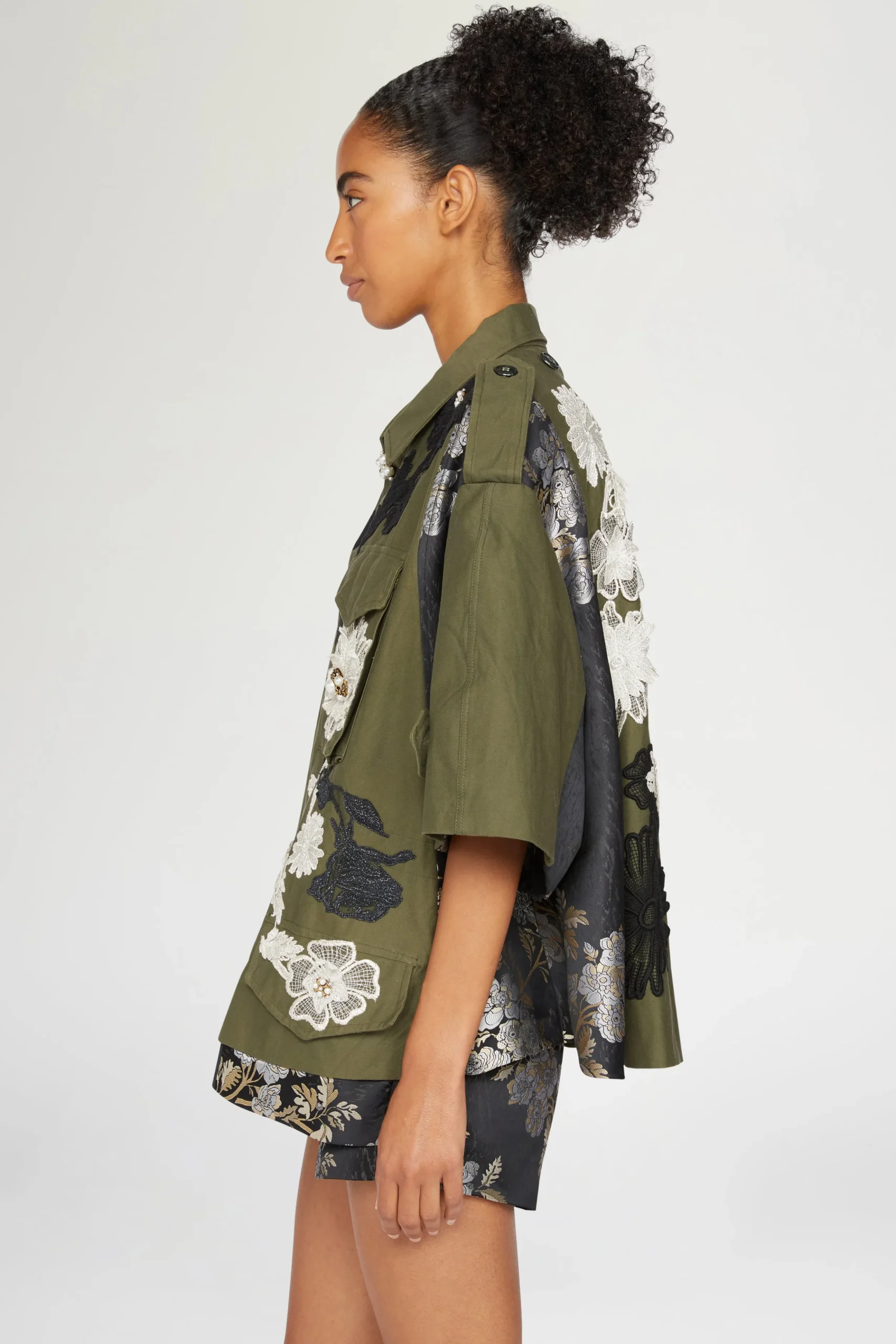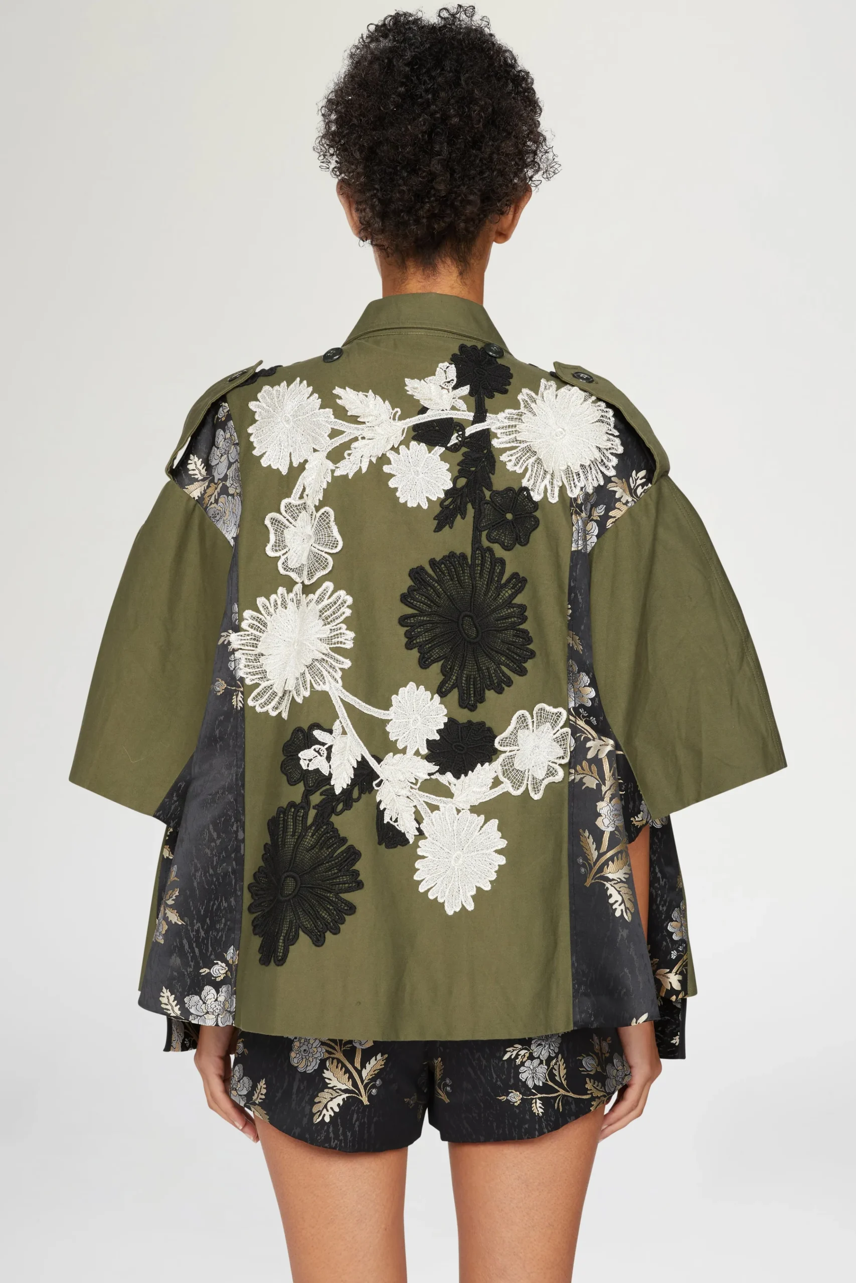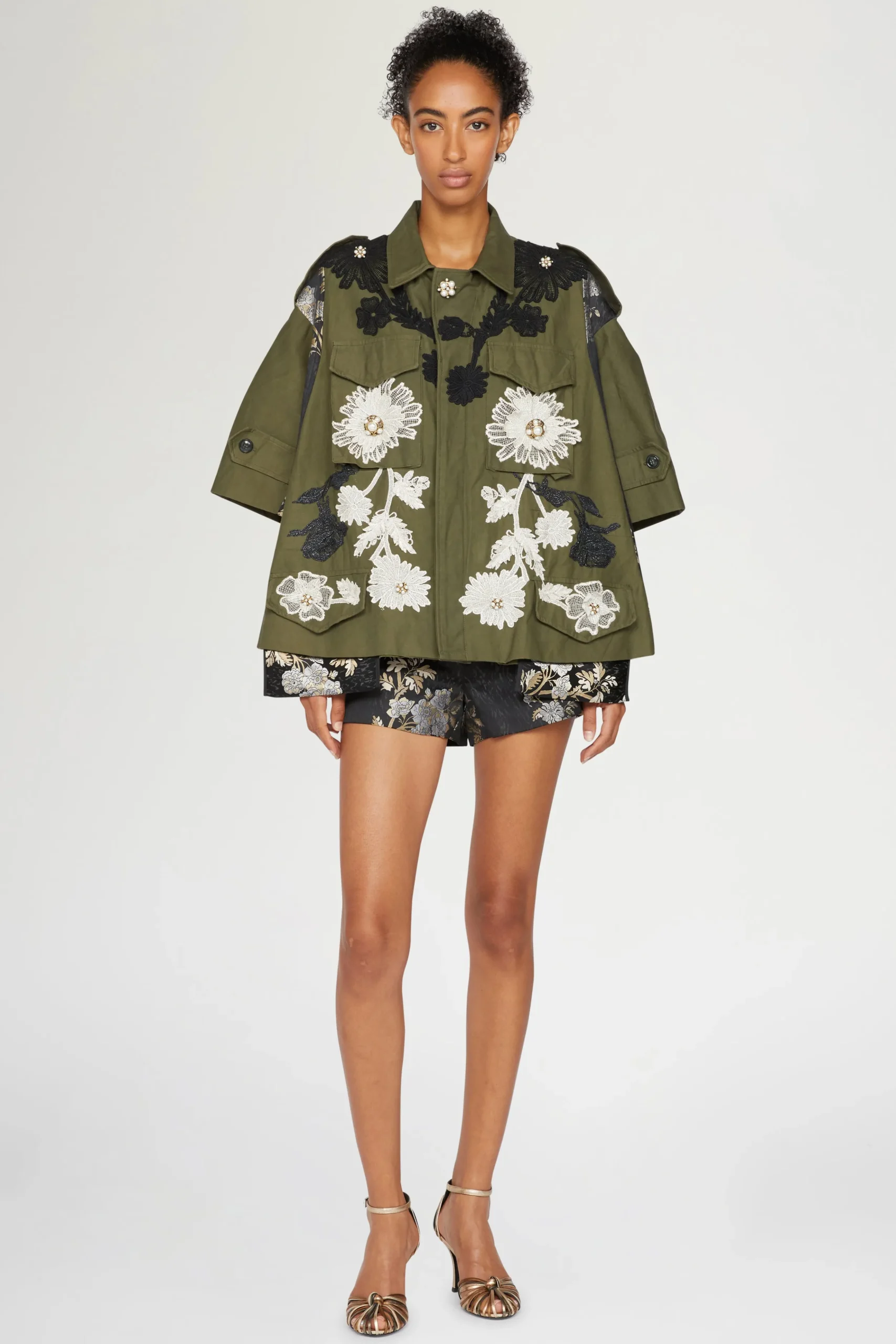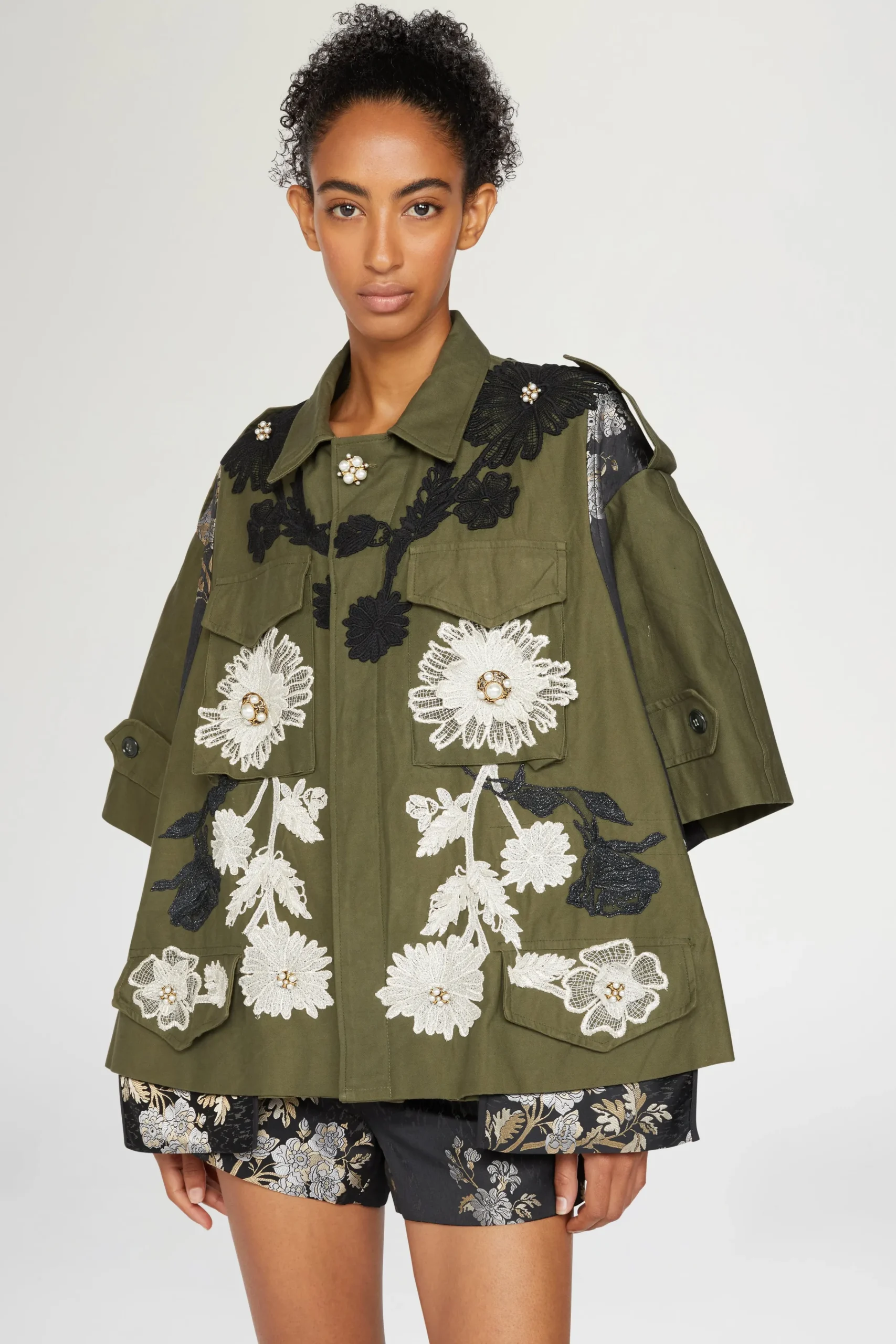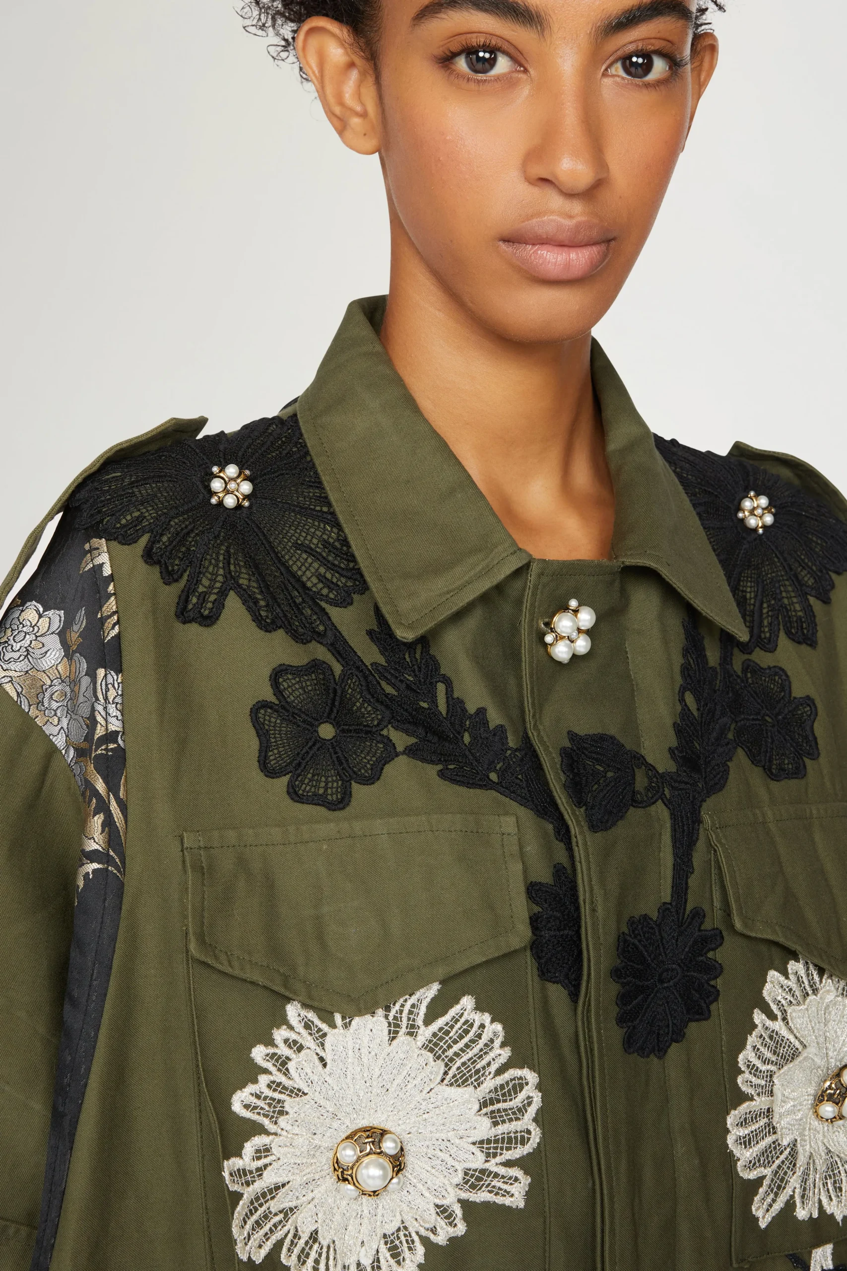 Parka verde oliva con disegno di ricami floreali, toppe jacquard sulle spalle e sul retro.