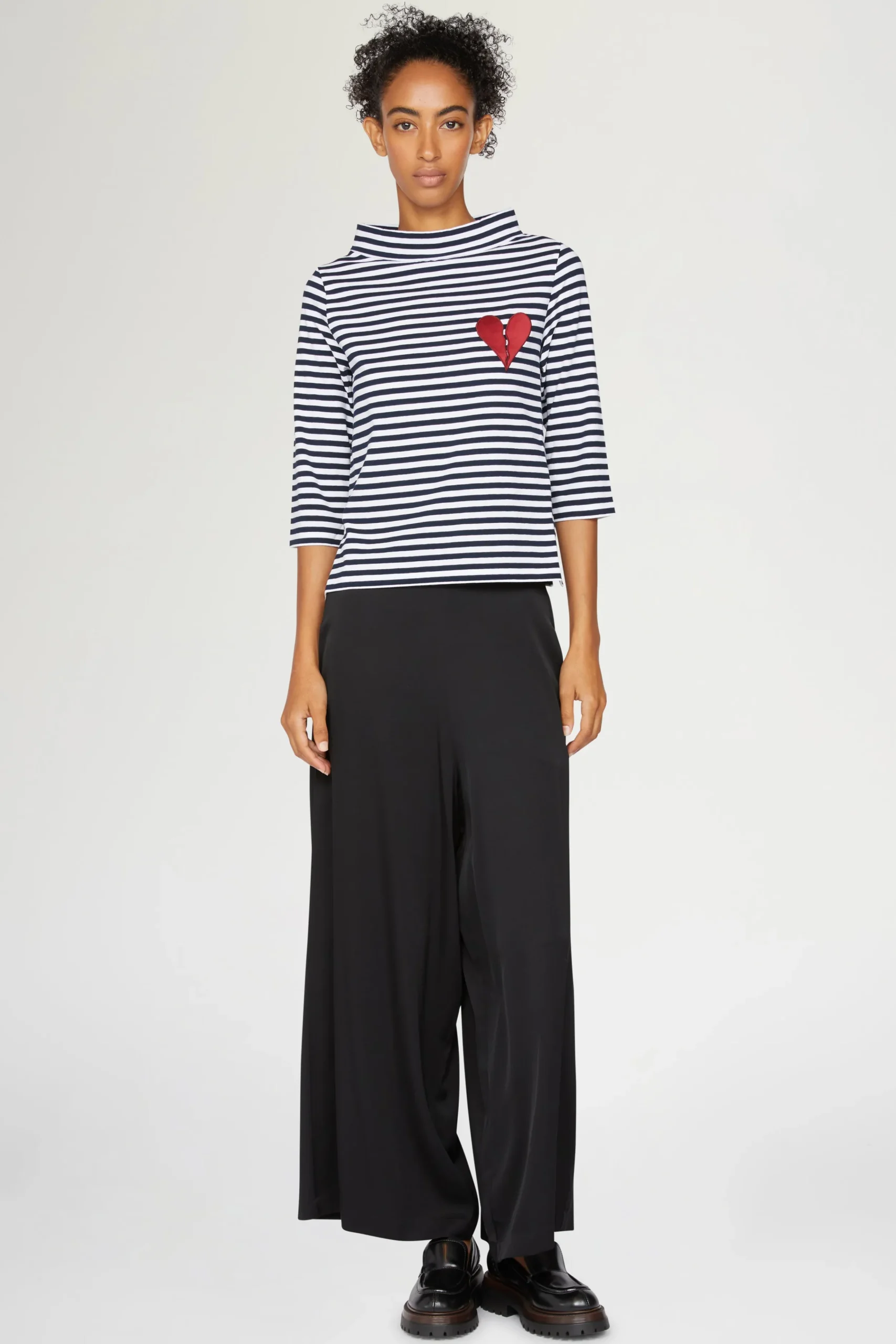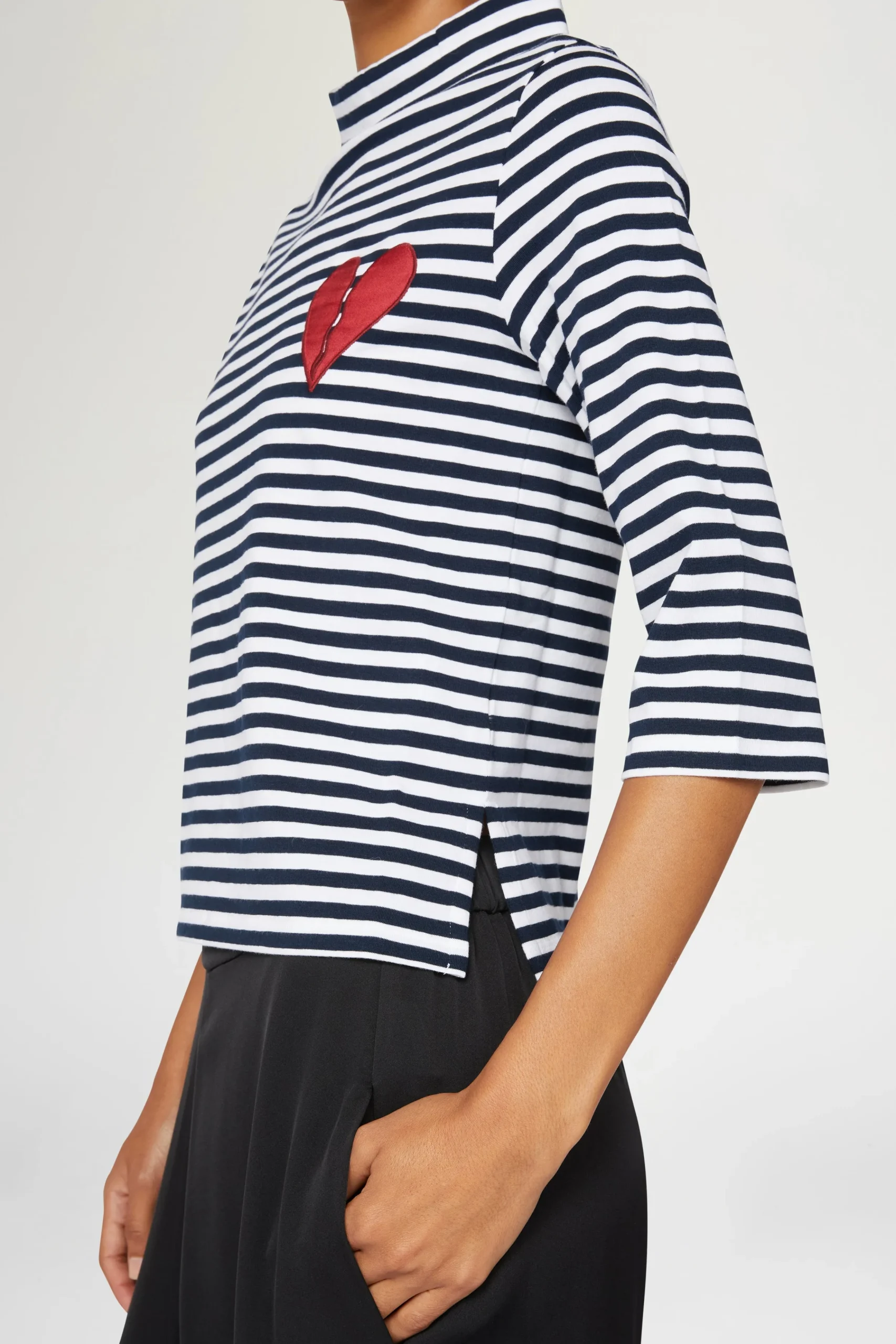 T-shirt a righe blu e bianche con maniche a 3/4, collo alto e cuore spezzato.