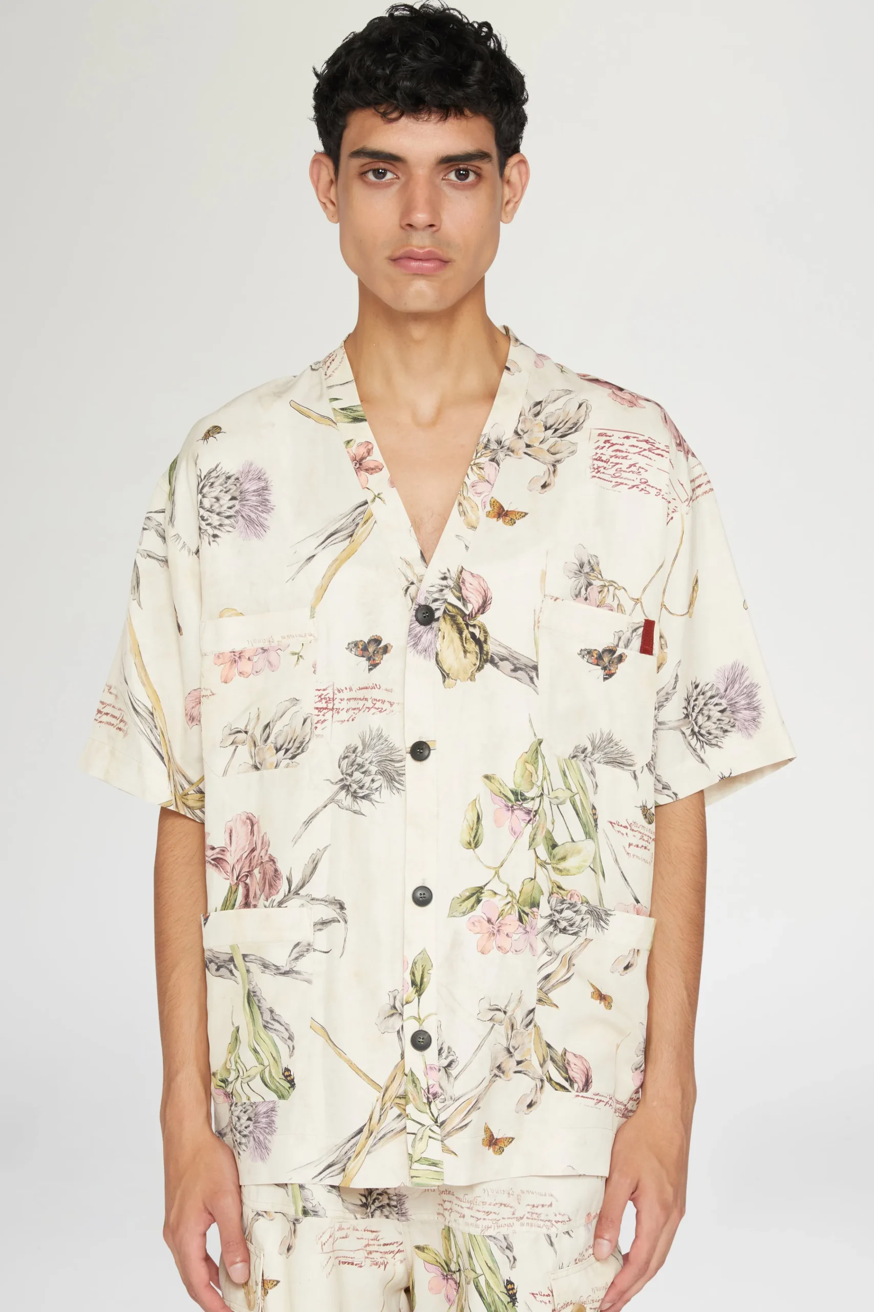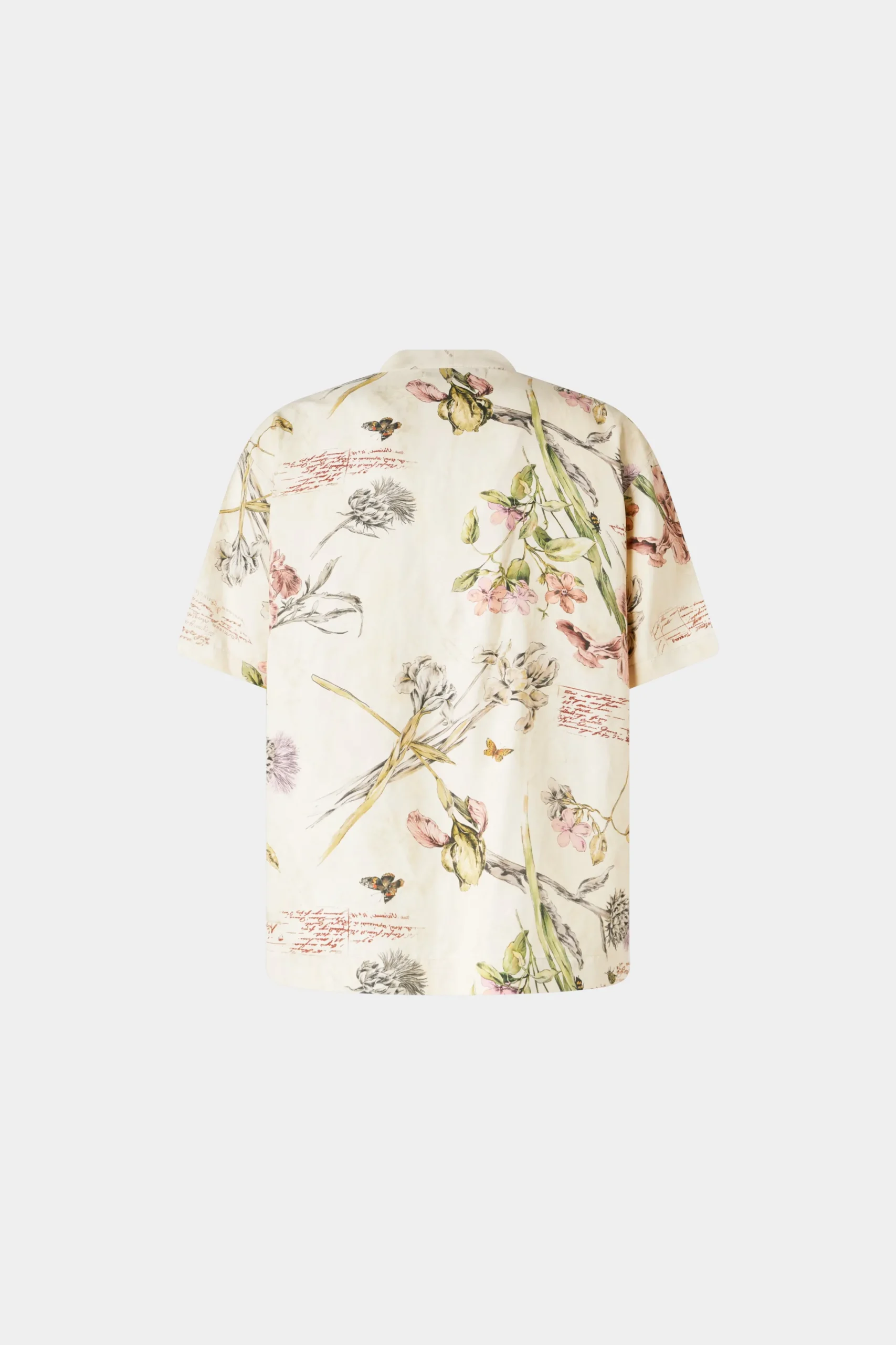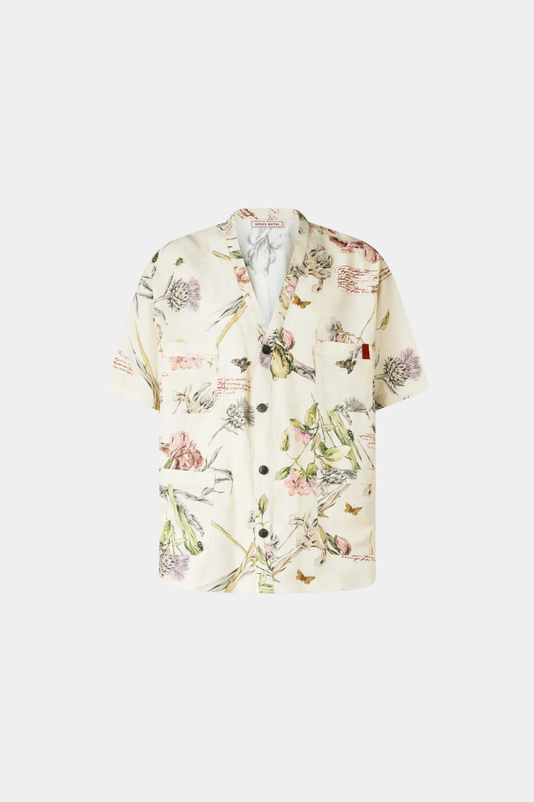 Una camicia a maniche corte dal taglio rilassato con un colletto a bande e tasche con delicata stampa floreale.