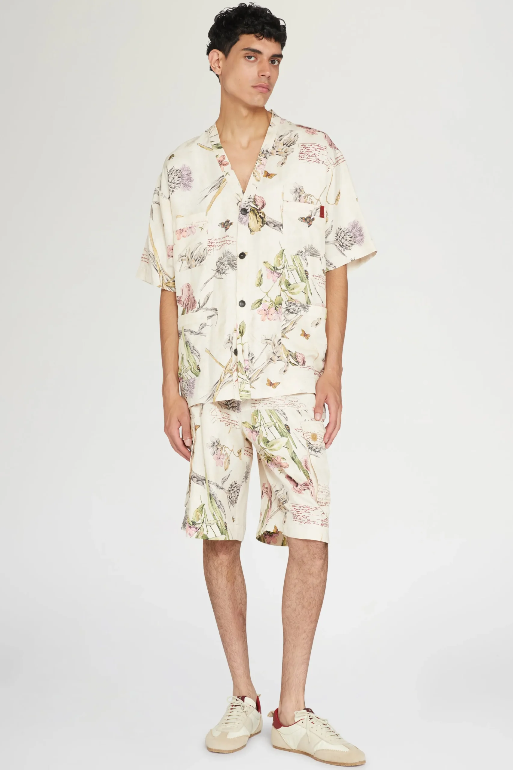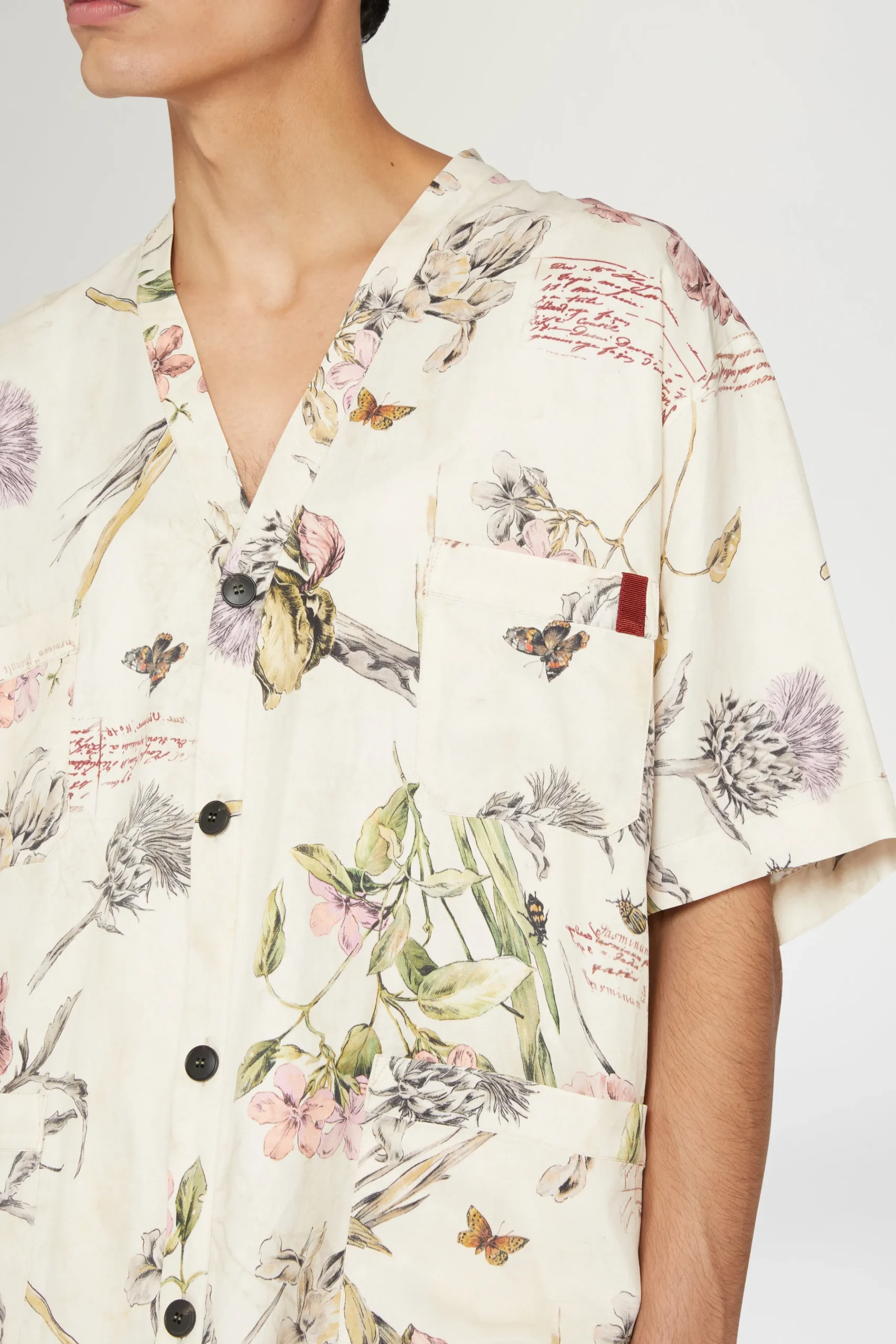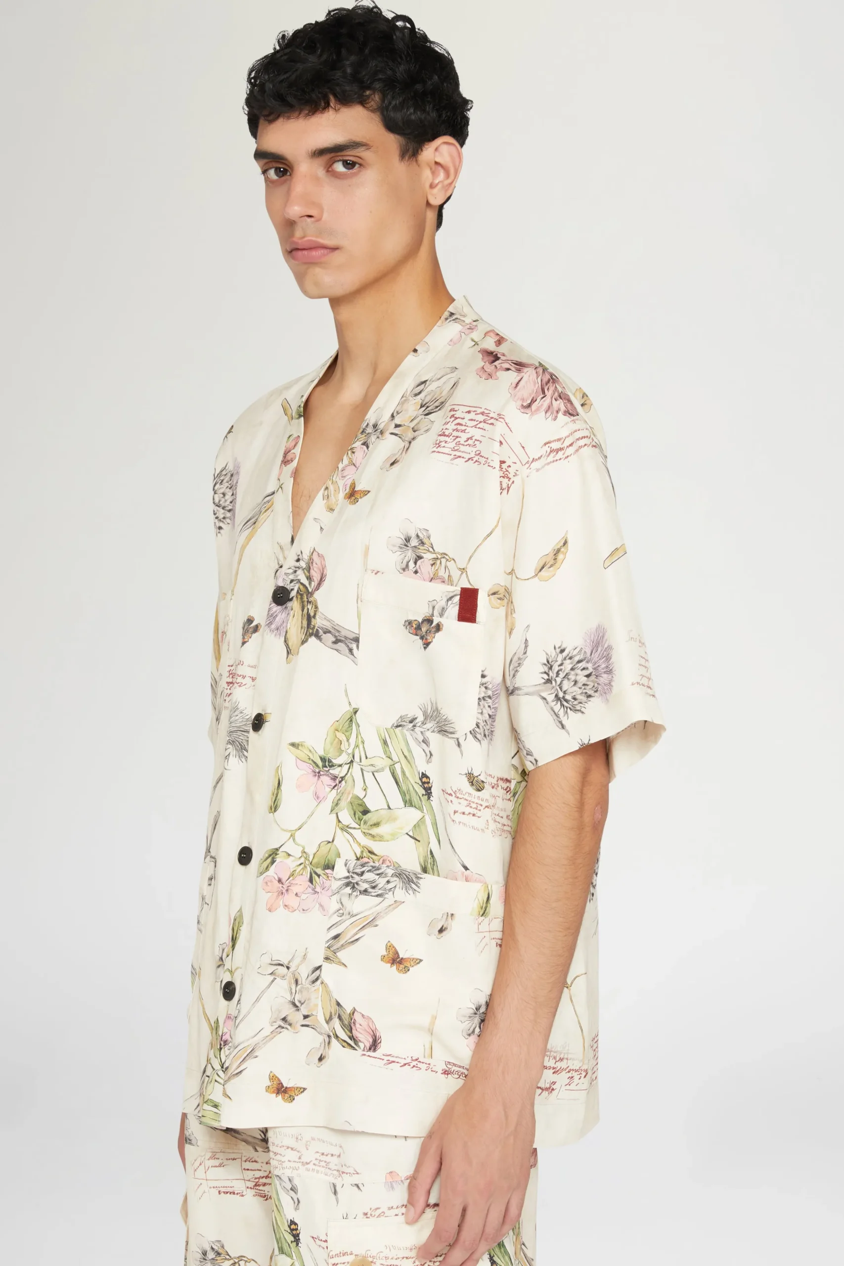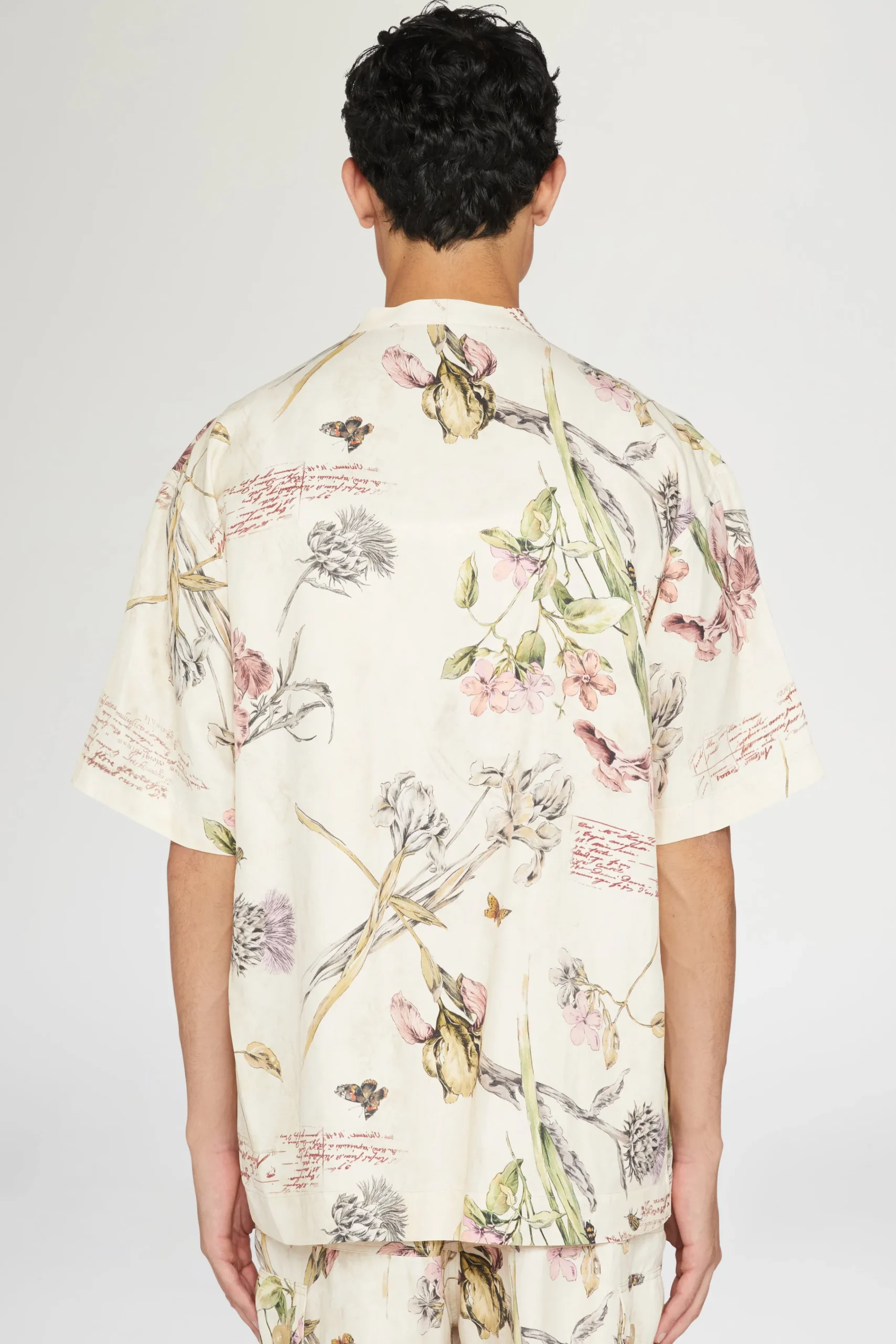 Una camicia a maniche corte dal taglio rilassato con un colletto a bande e tasche con delicata stampa floreale.