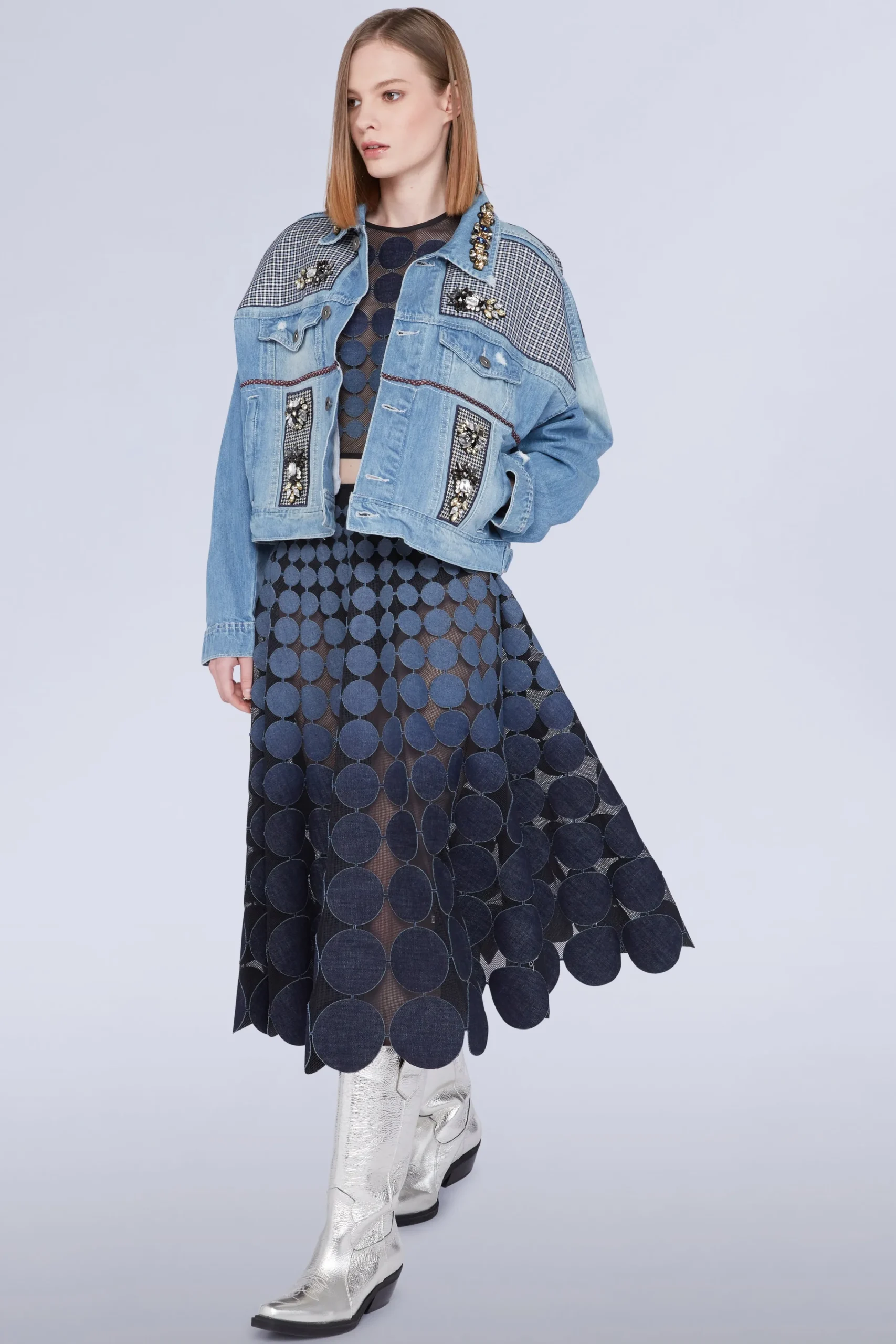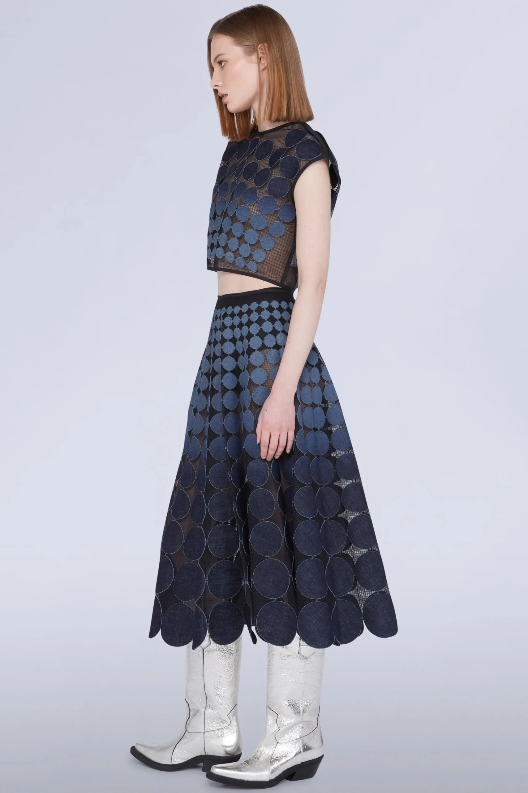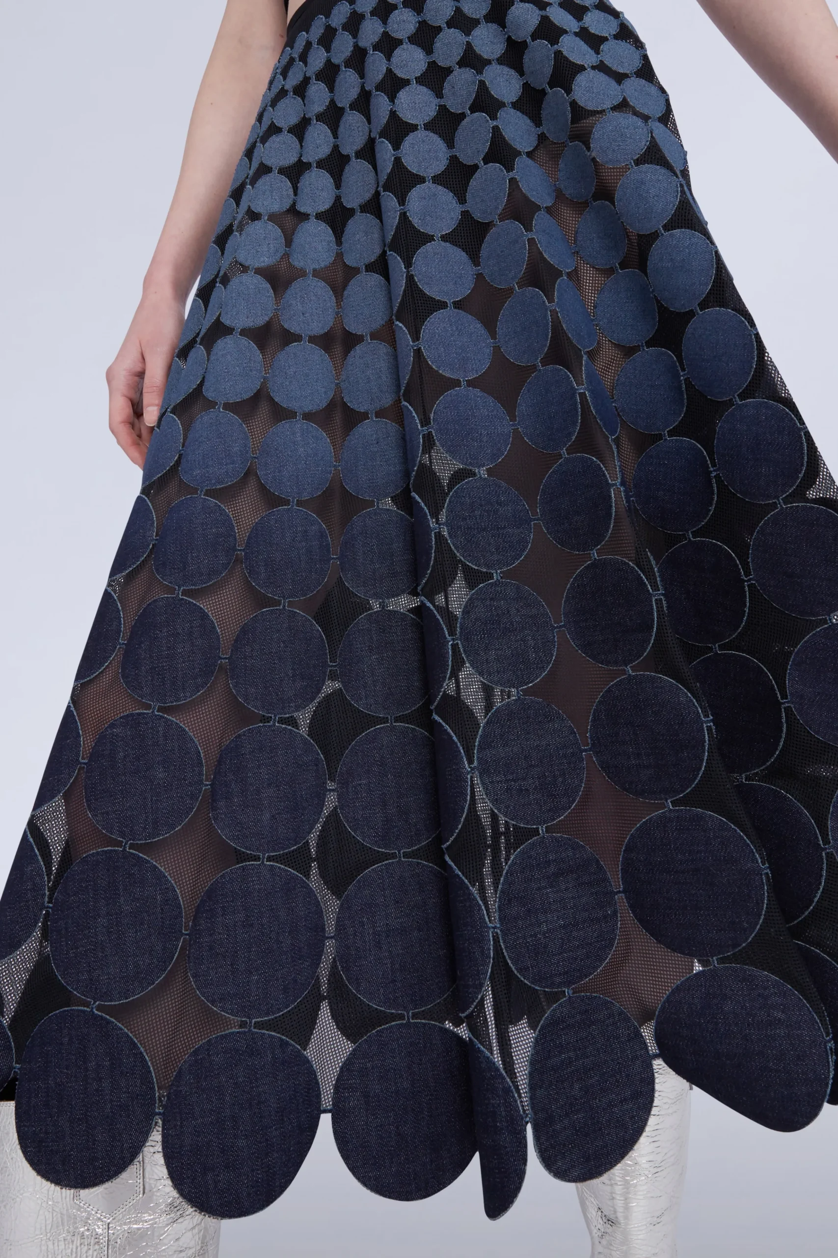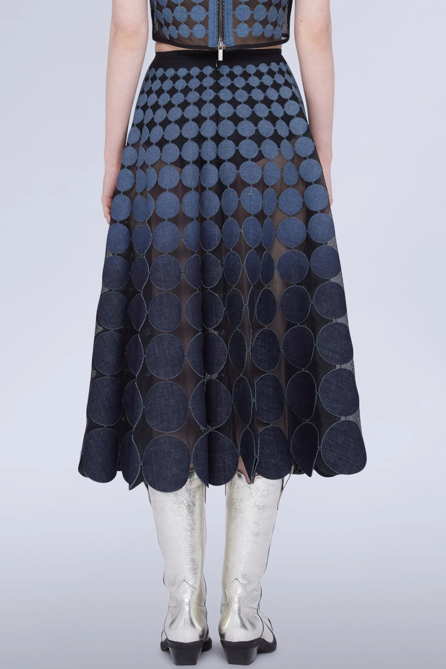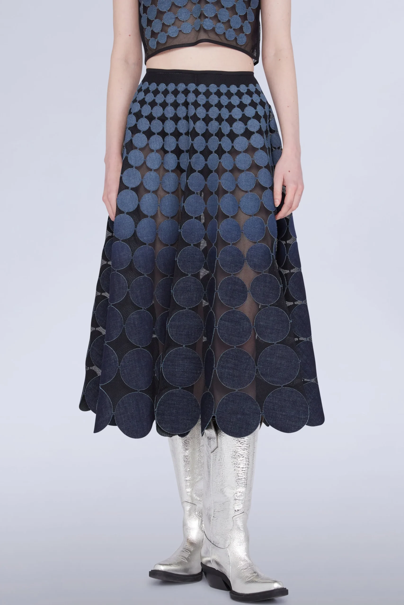 Gonna midi con dischi circolari blu disposti su un tessuto a rete trasparente.