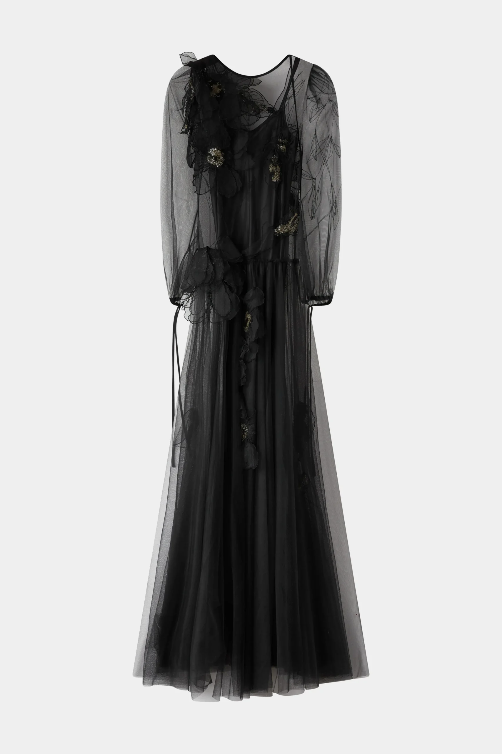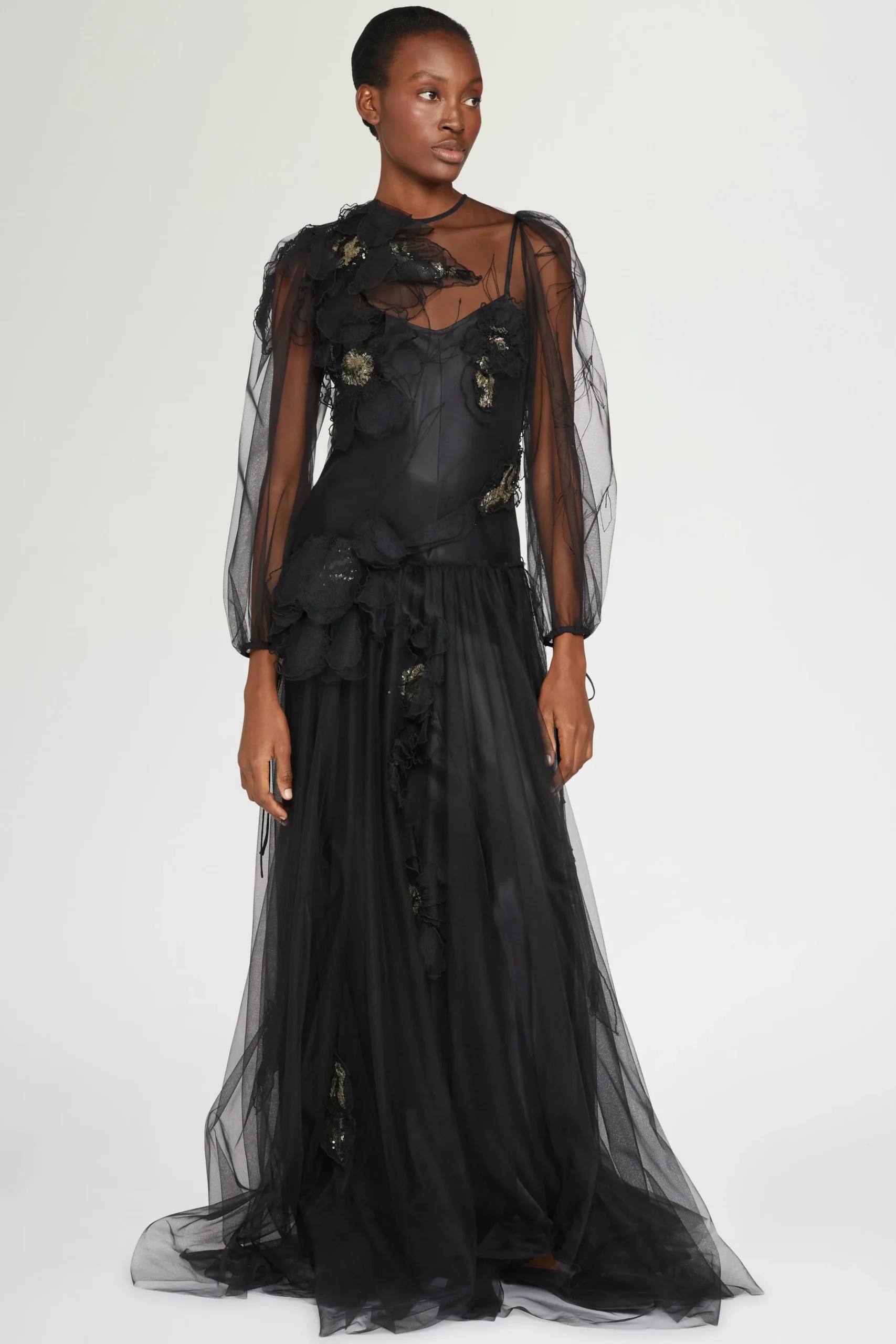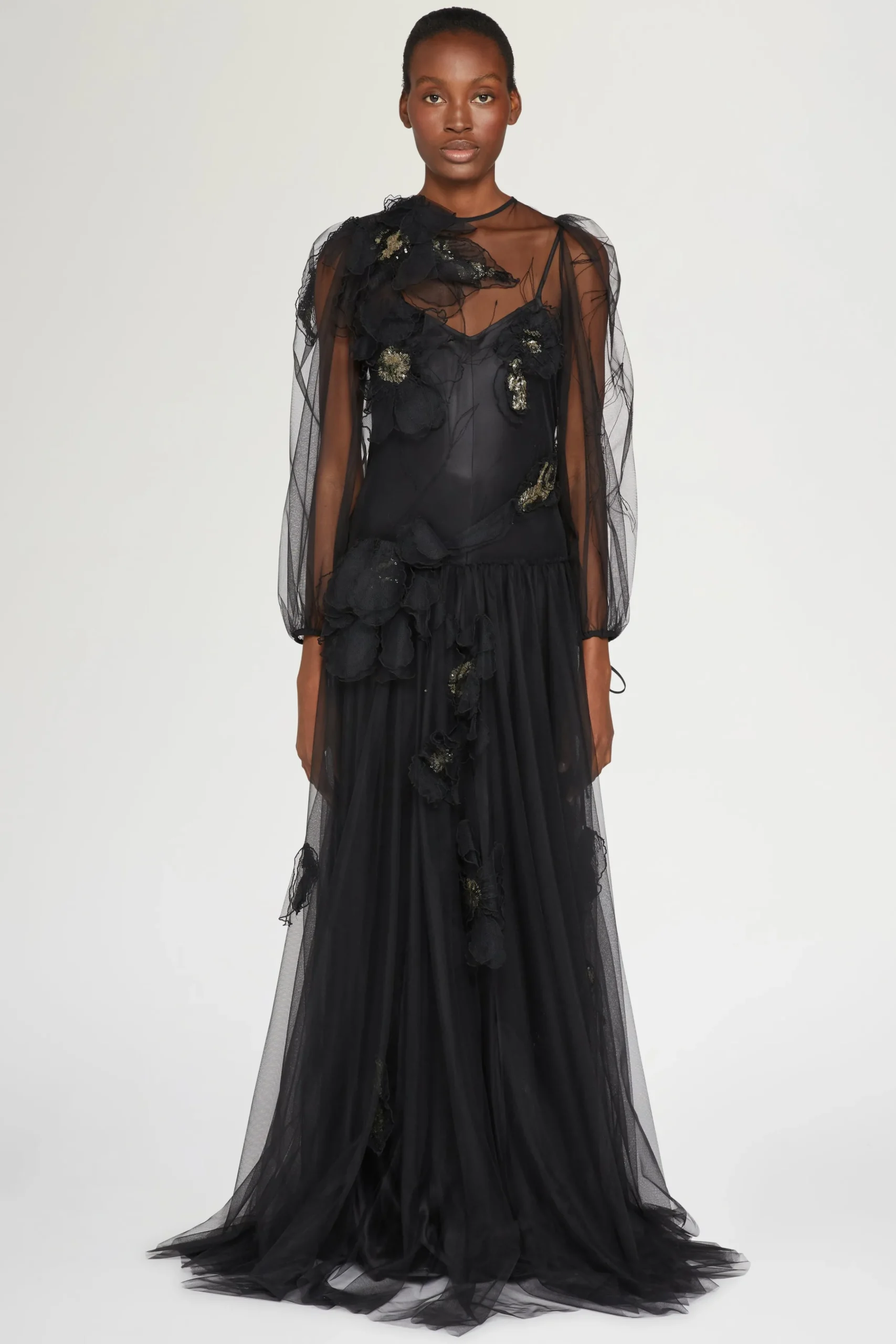 Abito da sera elegante nero con maniche in tulle trasparente, applicazioni floreali 3D e una silhouette fluida.