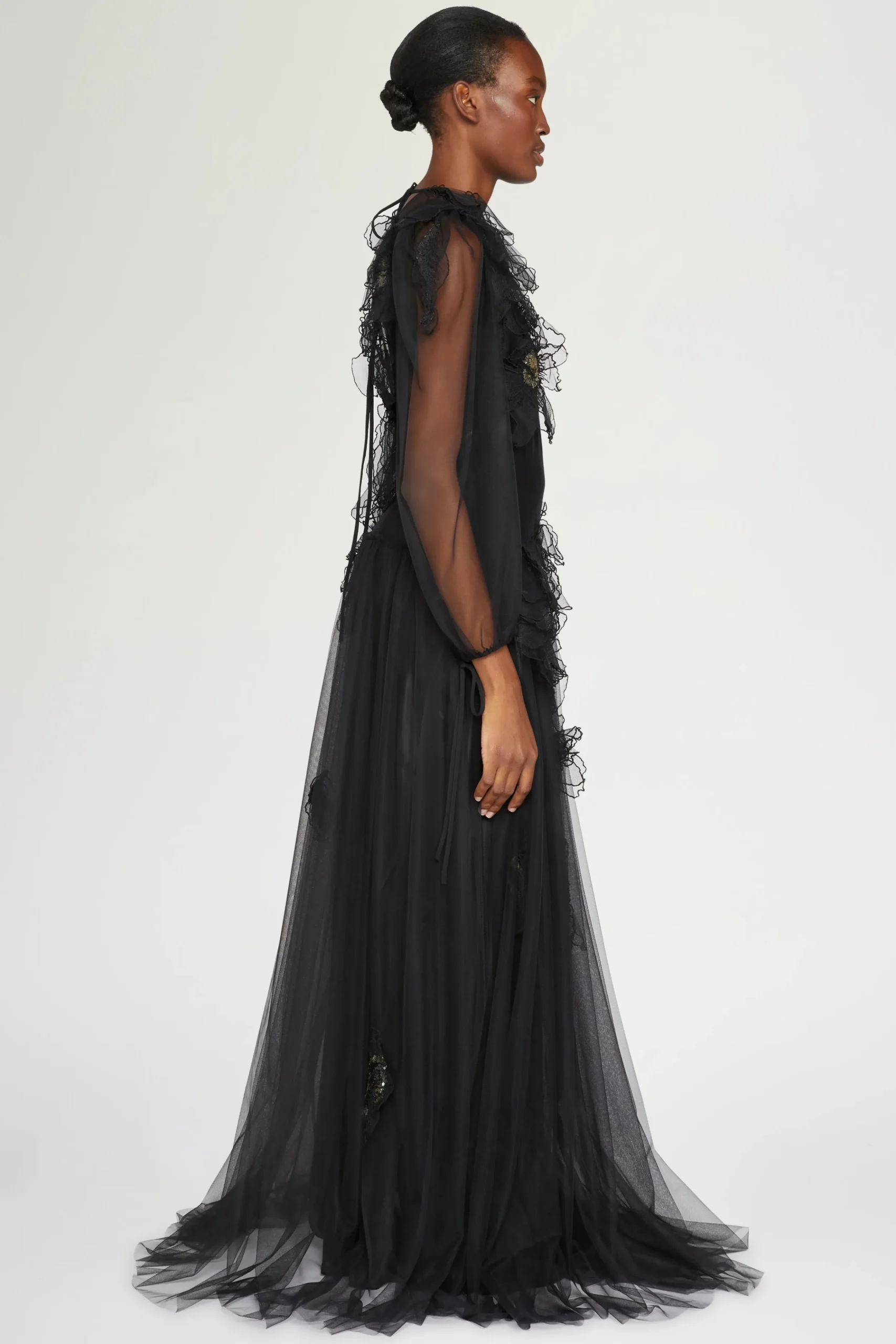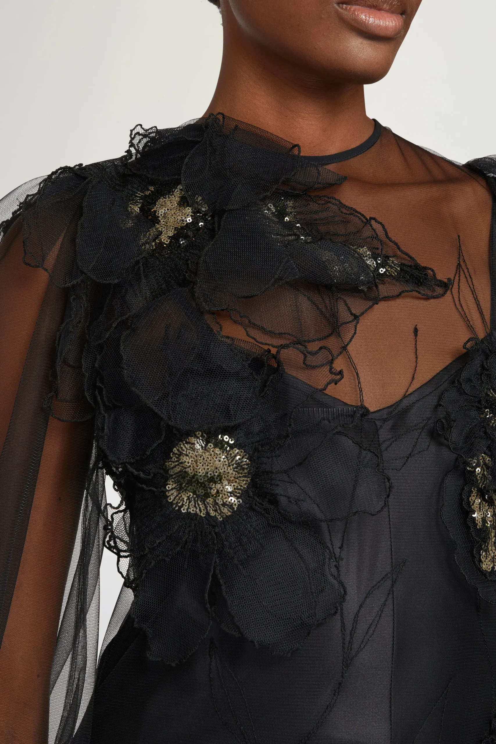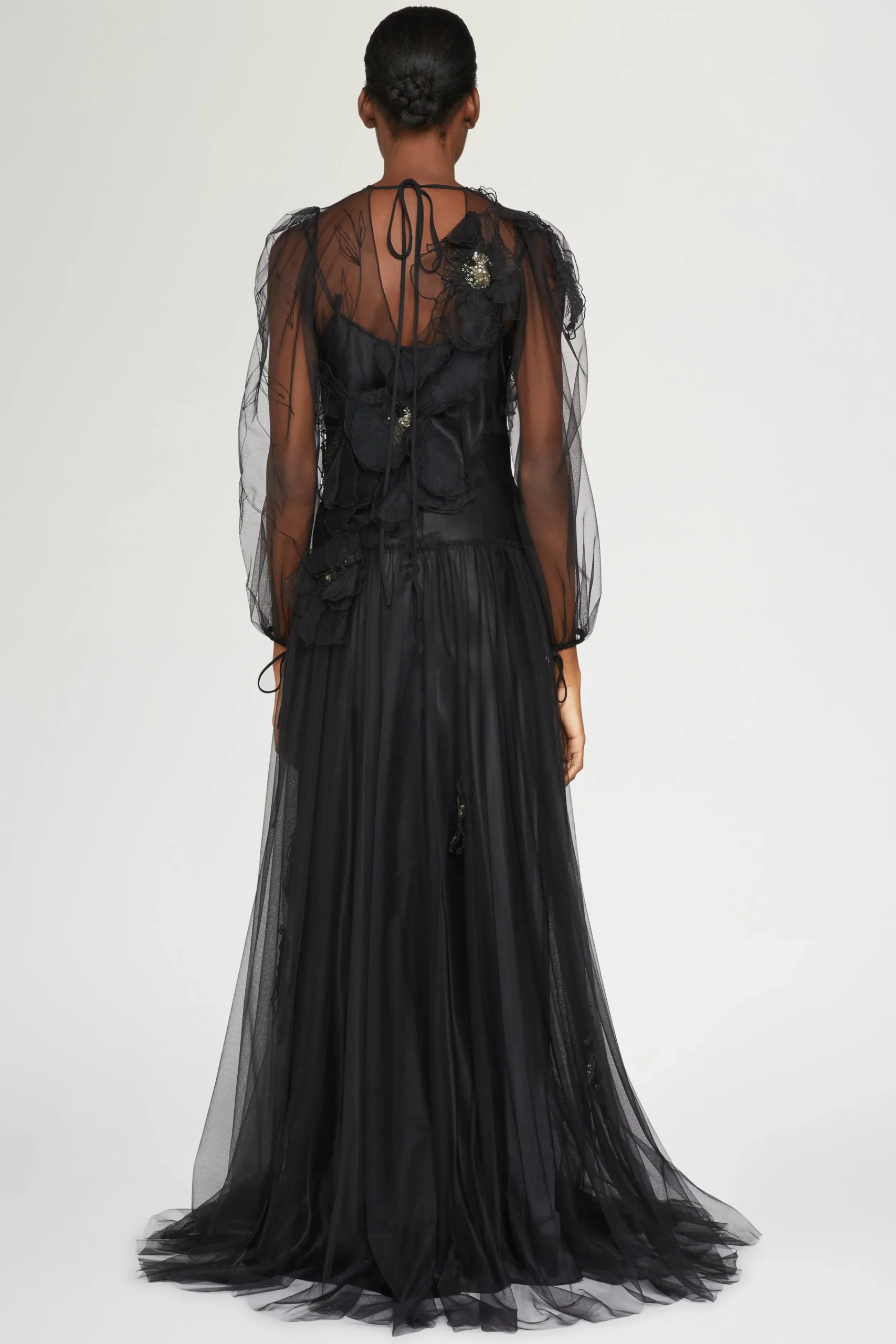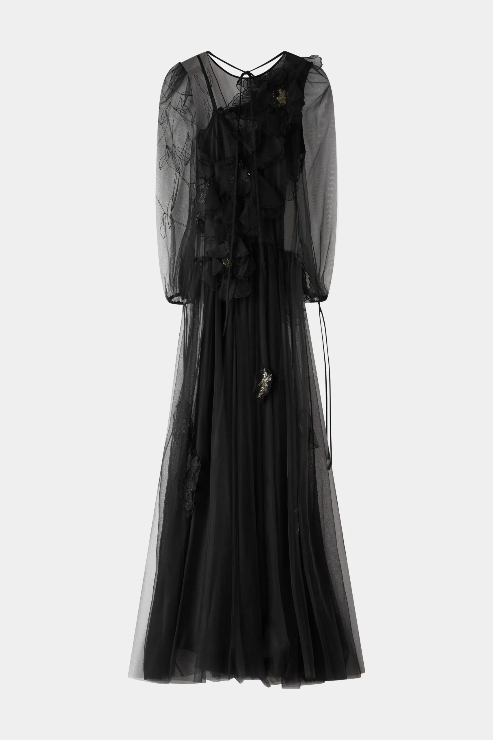 Abito da sera elegante nero con maniche in tulle trasparente, applicazioni floreali 3D e una silhouette fluida.