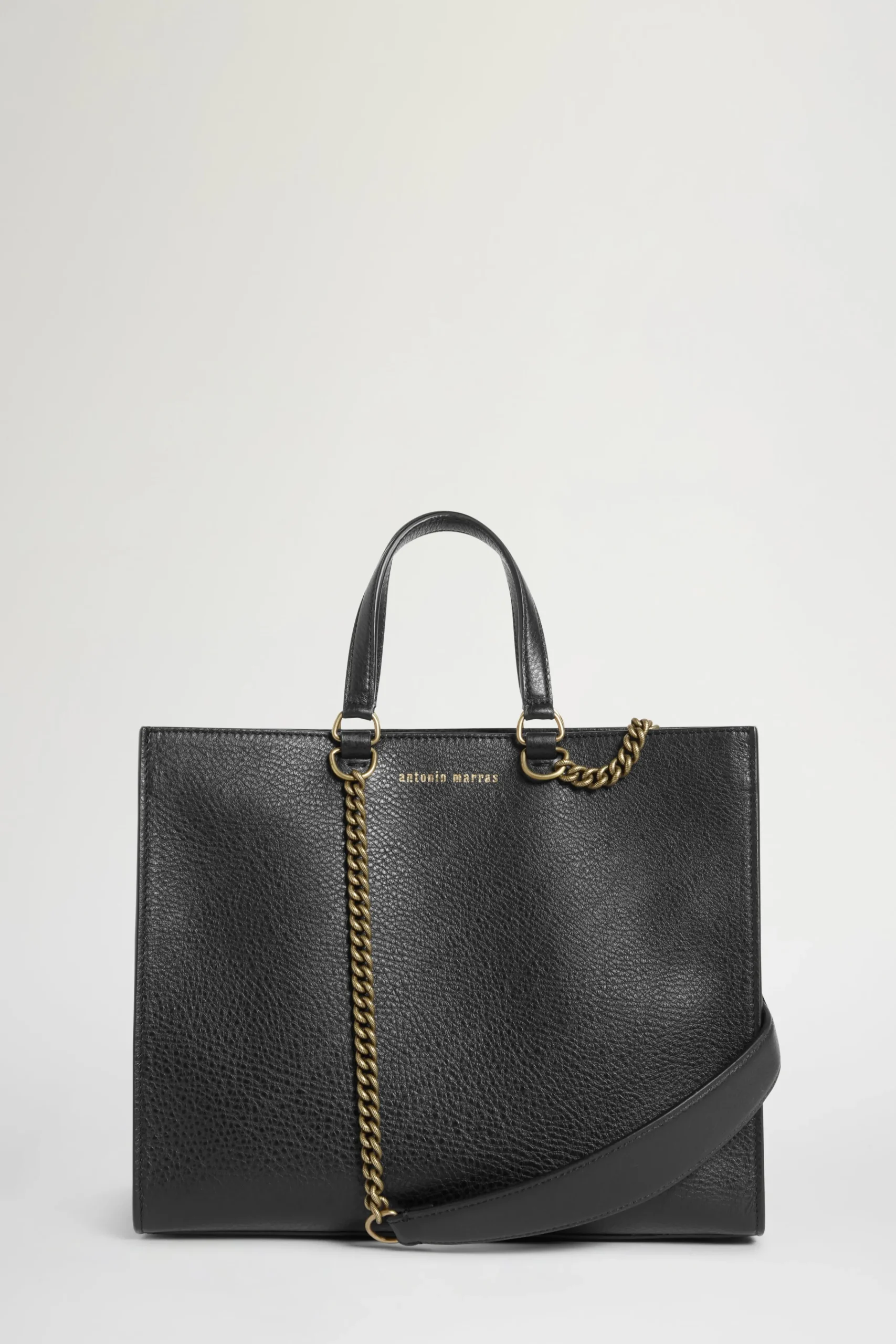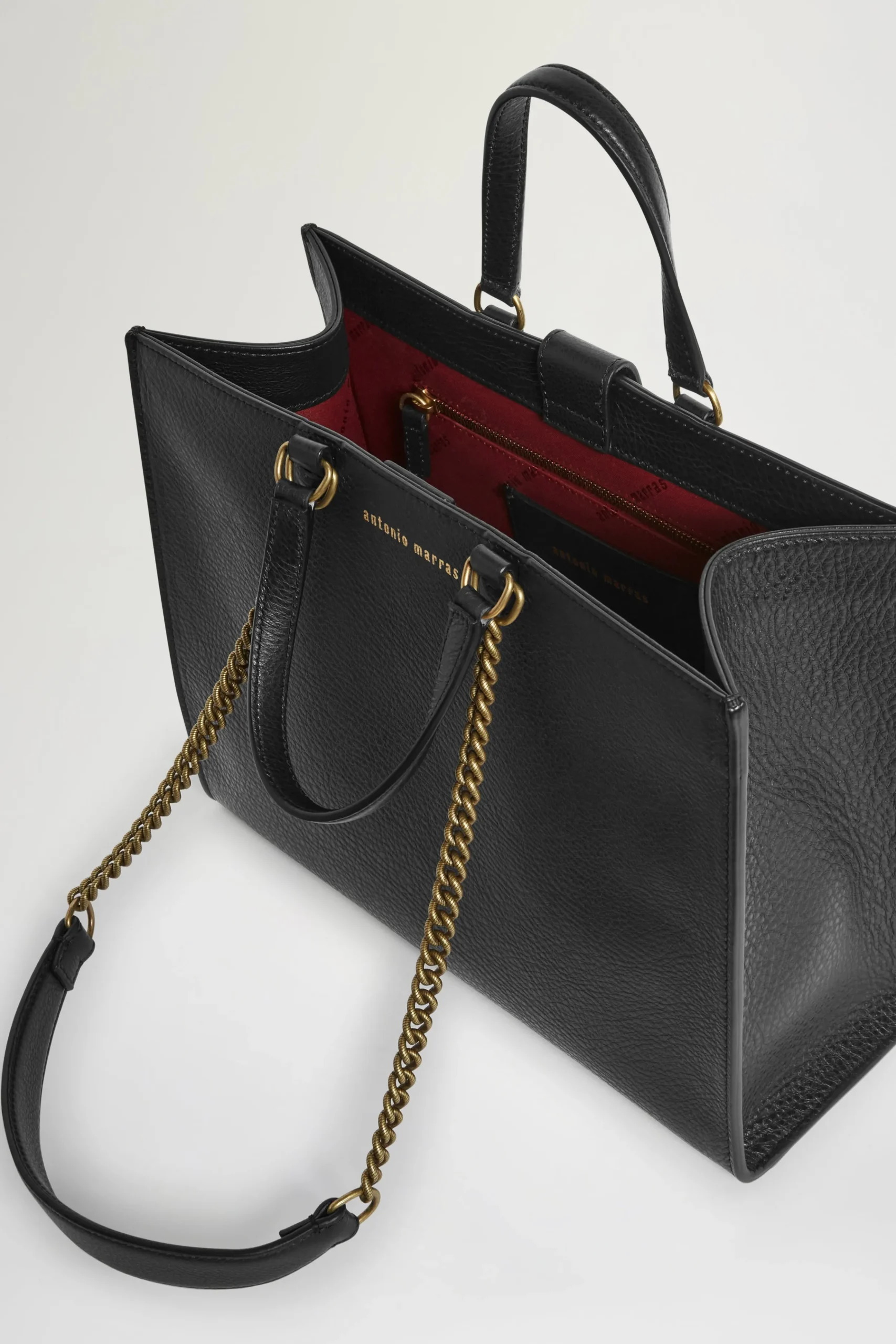 Borsa tote media realizzata in 100% pelle, con manici piccoli e manici a catena con una tracolla. Può essere portata a mano o a spalla.