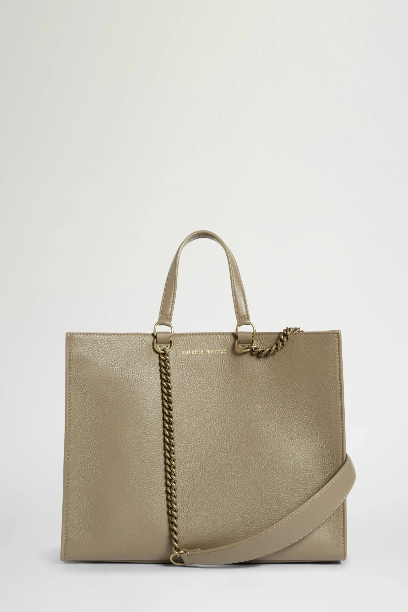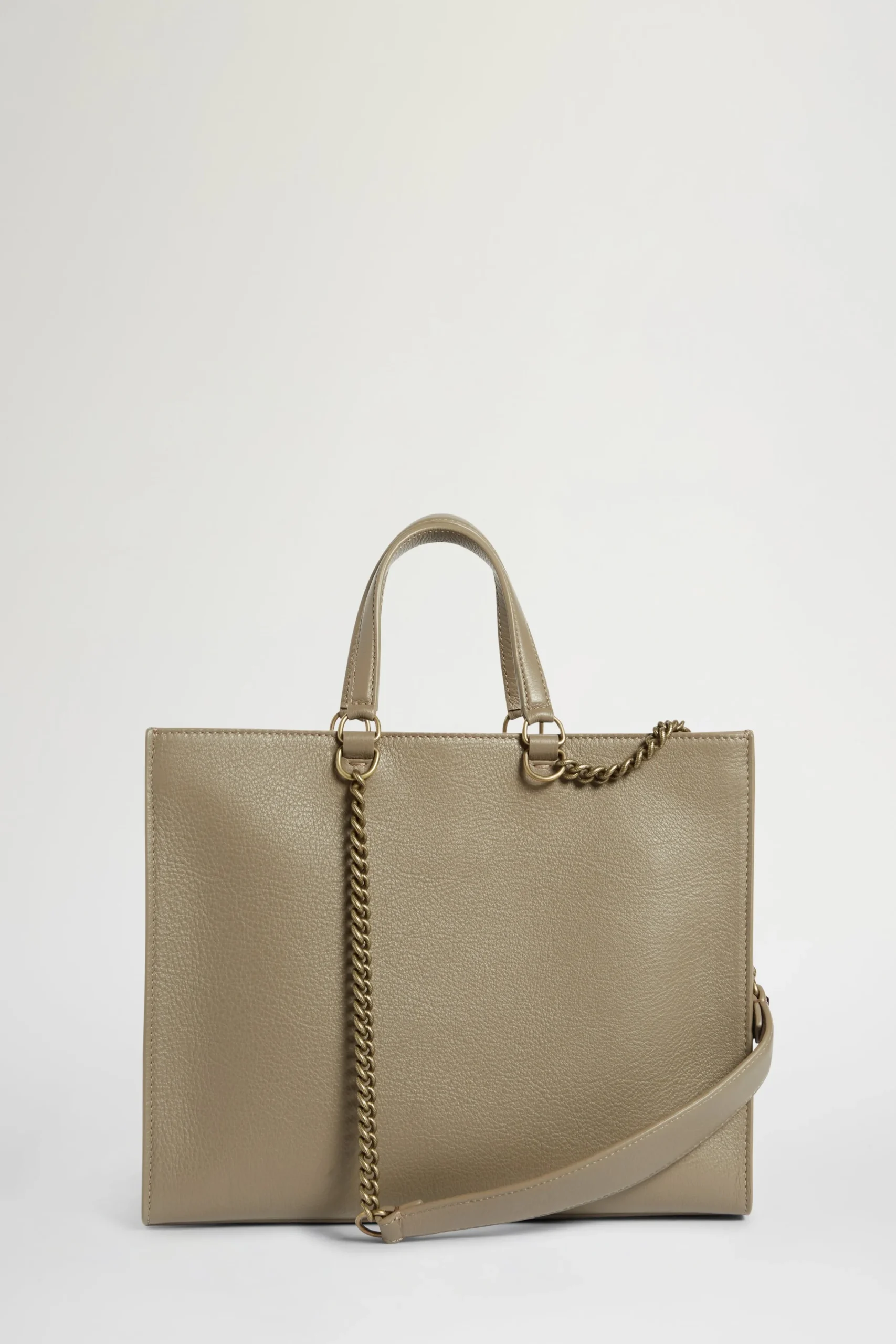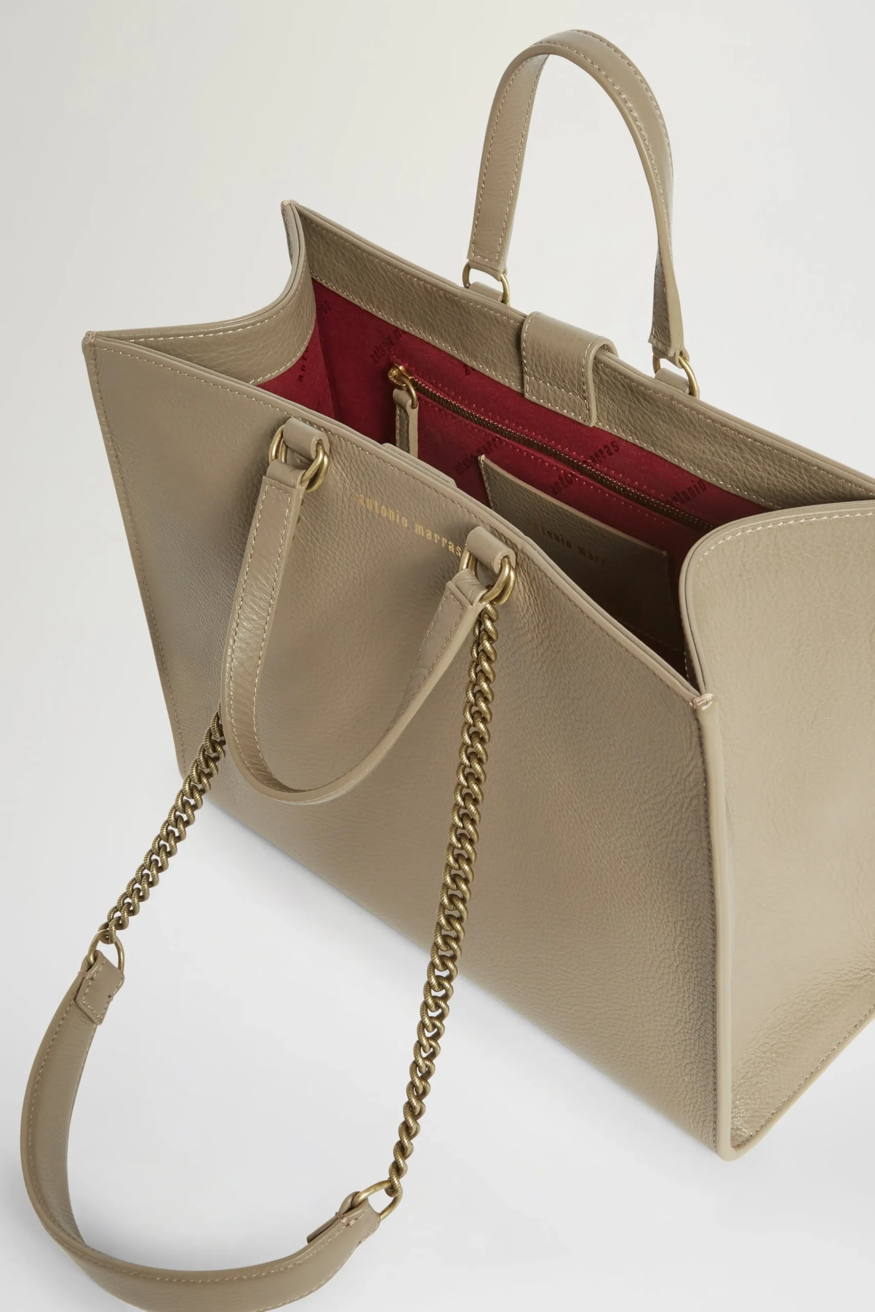 Borsa tote media realizzata in 100% pelle, con manici piccoli e manici a catena con tracolla. Può essere portata a mano o a spalla.