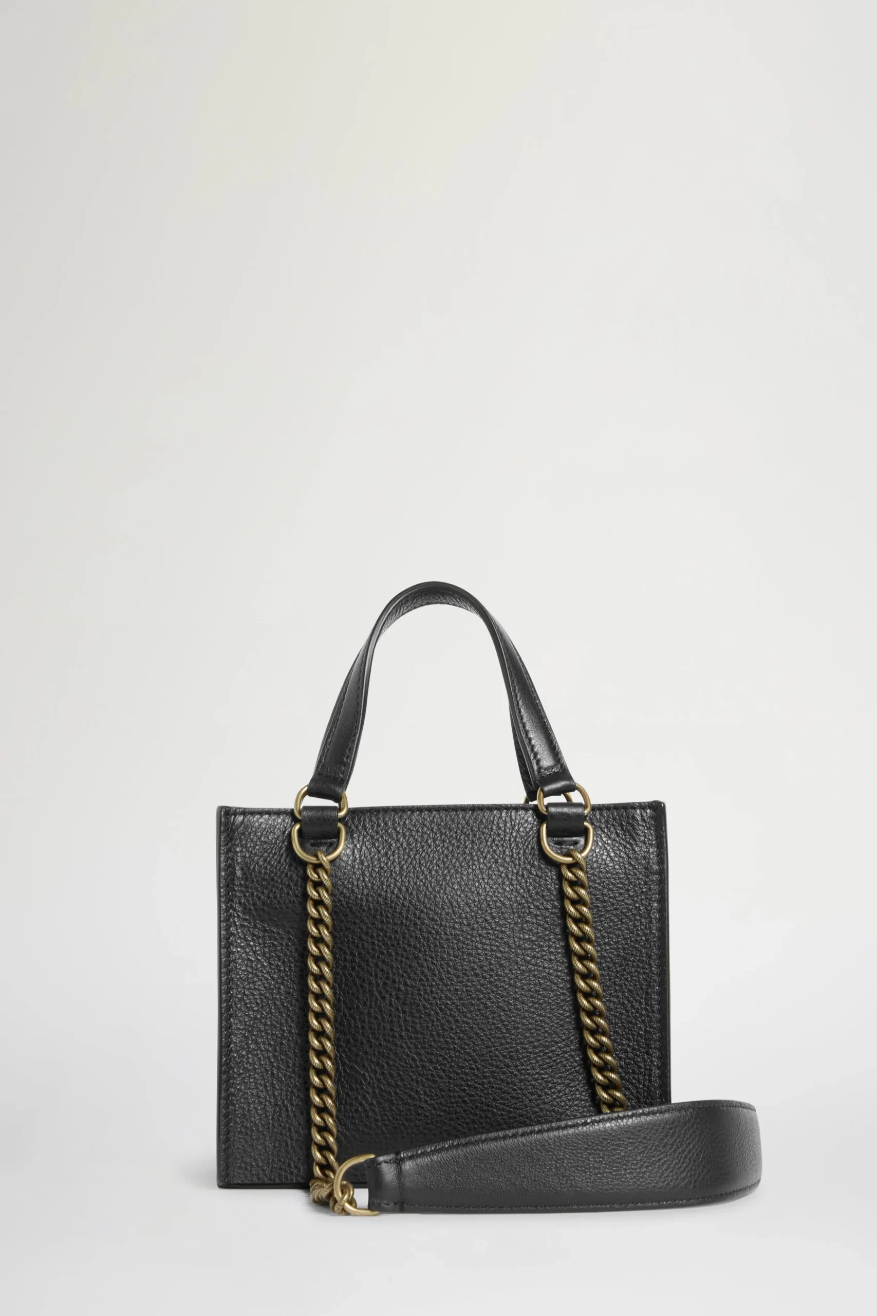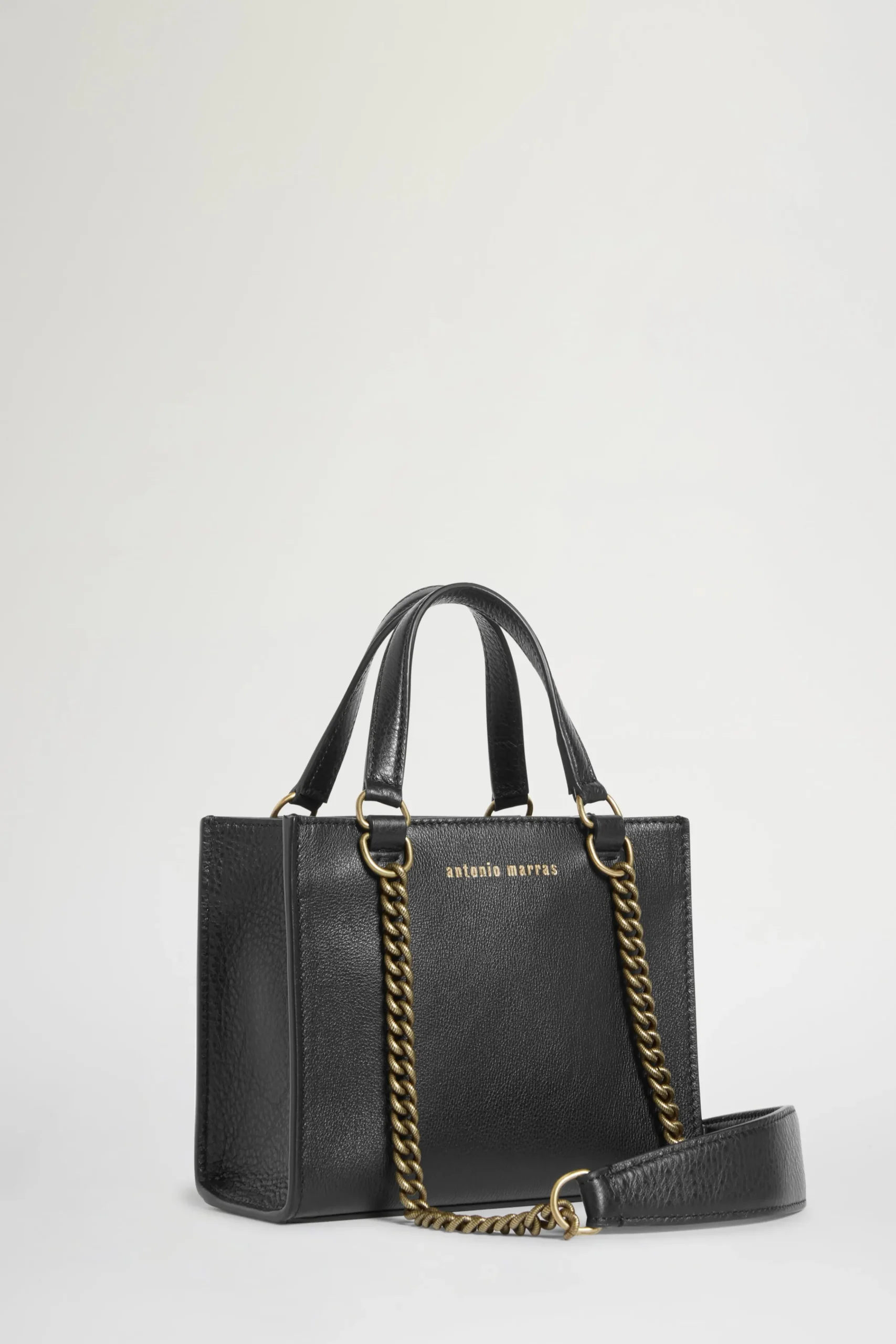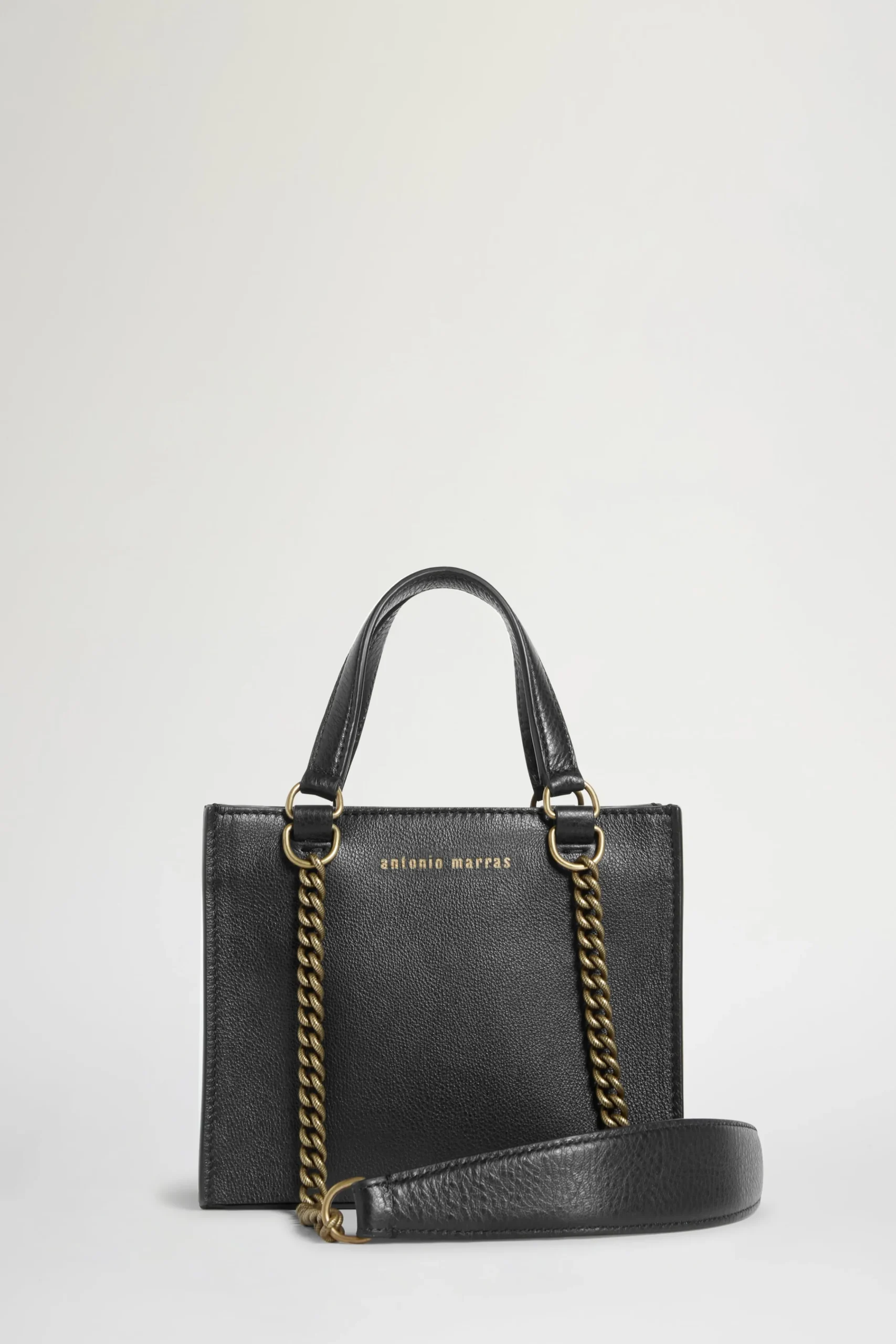 Mini borsa a tracolla realizzata in 100% pelle, con manici piccoli e manici a catena con una tracolla. Può essere portata a mano o a spalla.