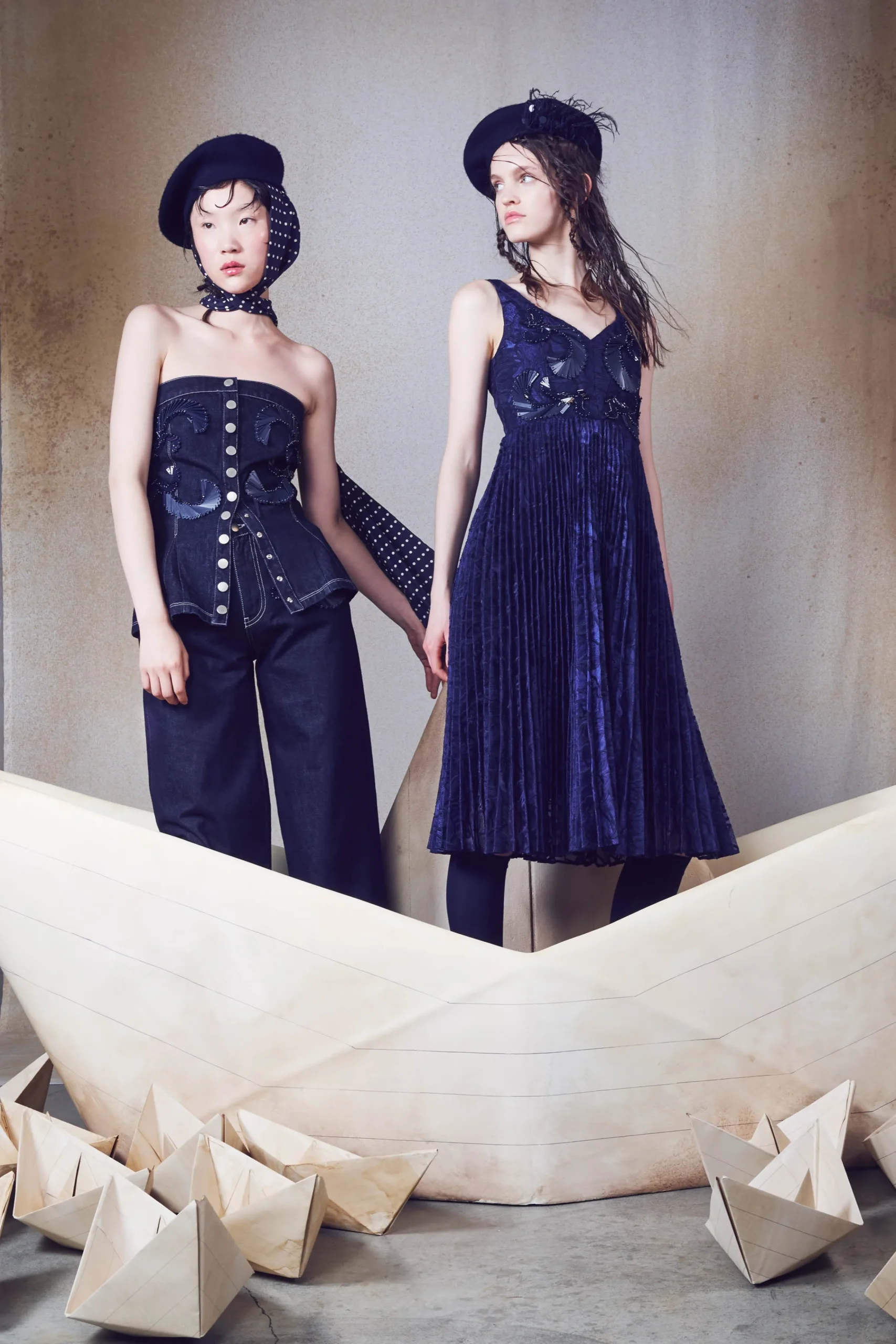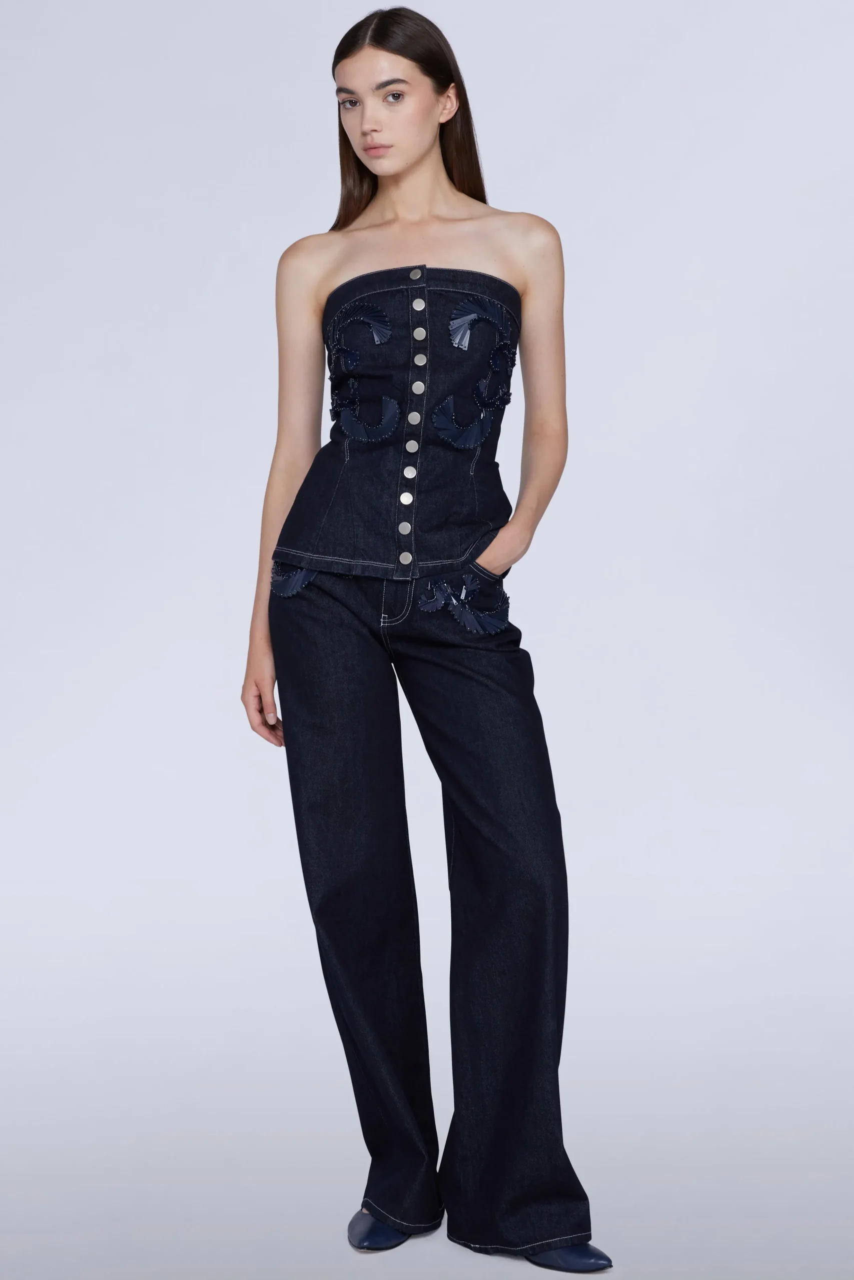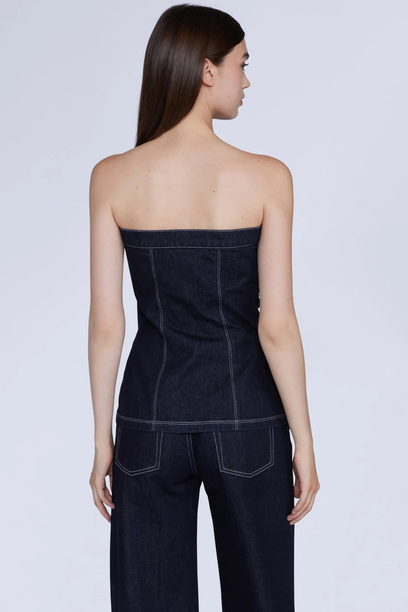 Top senza spalline con chiusura con bottoni e ricami di paillettes.