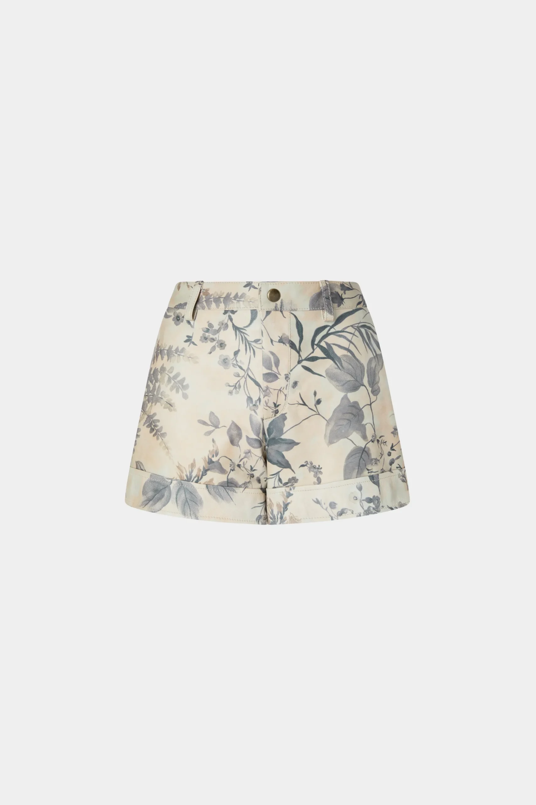 Pantaloni corti eleganti in morbida pelle con risvolti e stampa floreale tropicale.