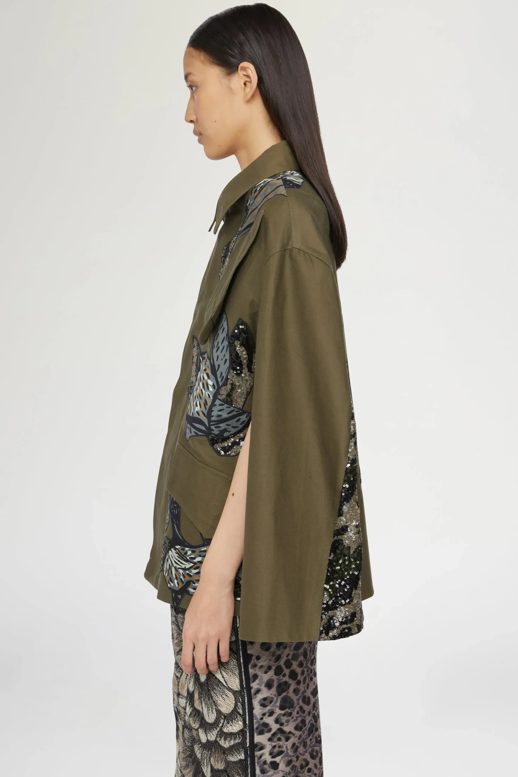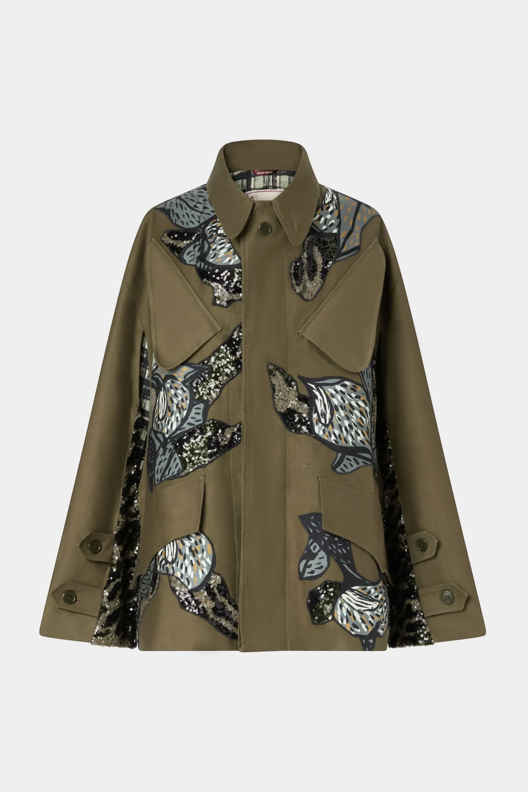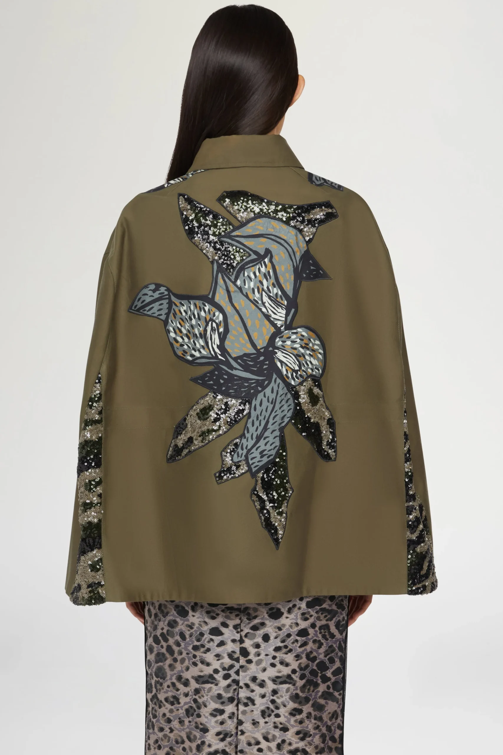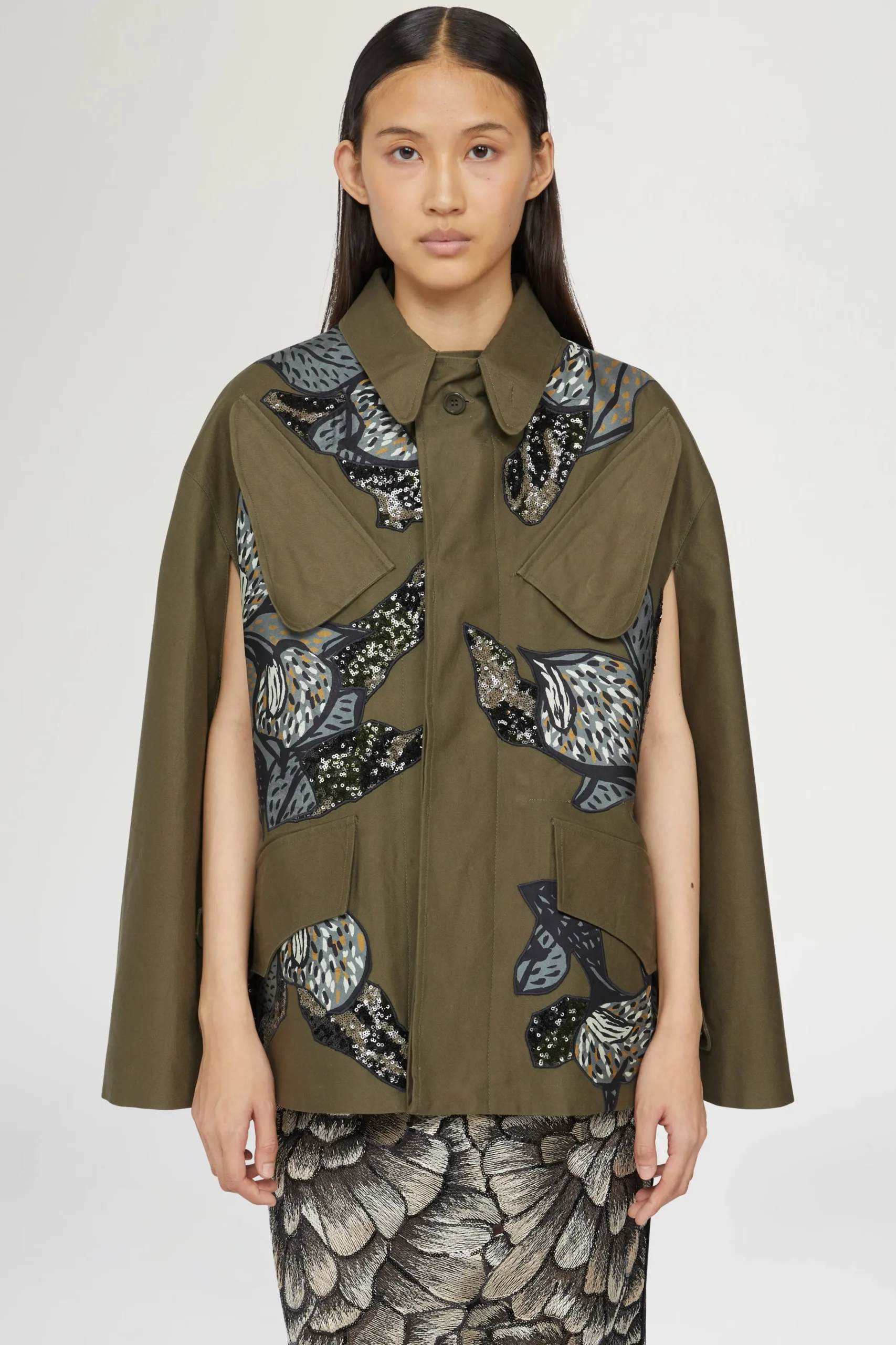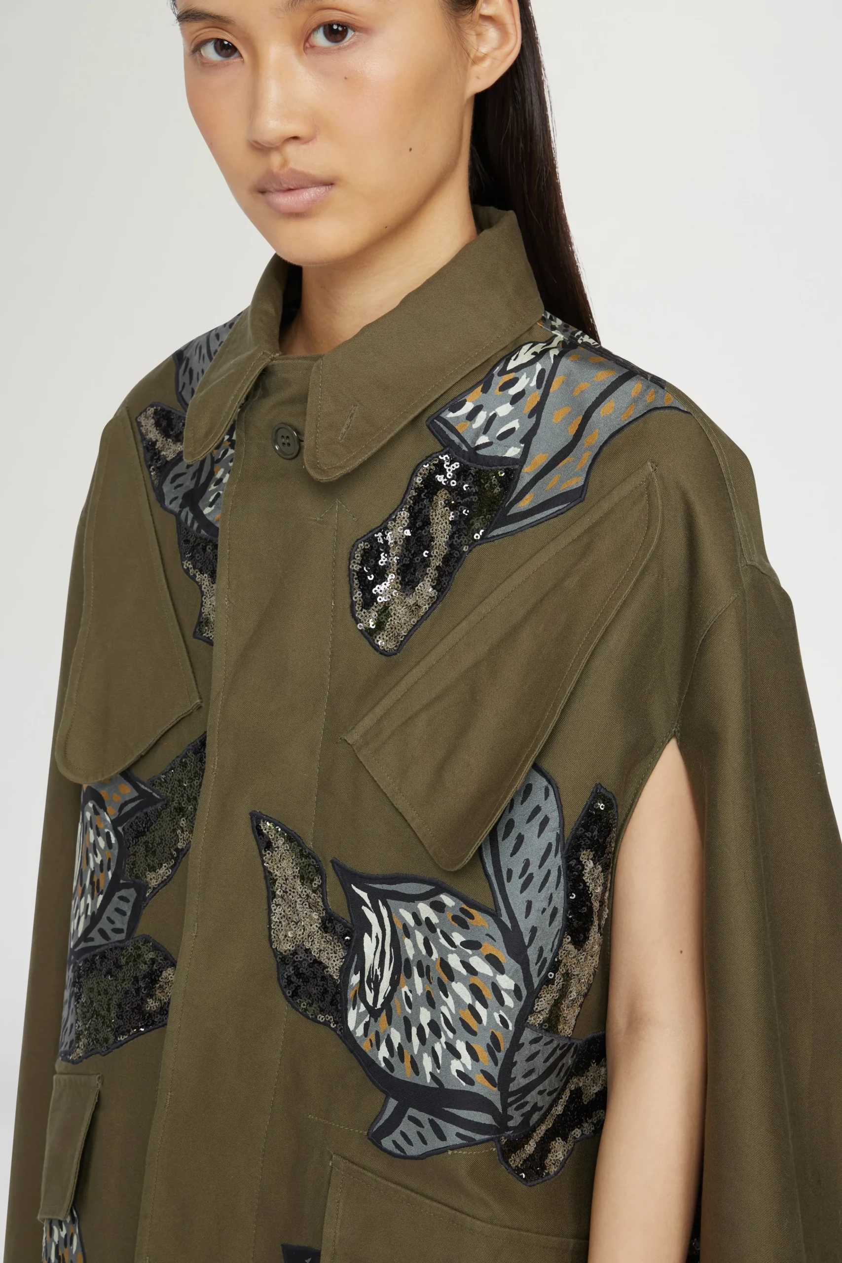 Parka verde militare in stile mantella con applicazioni floreali astratte e ricami con paillettes. Caratterizzato da ampi fori per le braccia, tasche frontali e una silhouette strutturata.