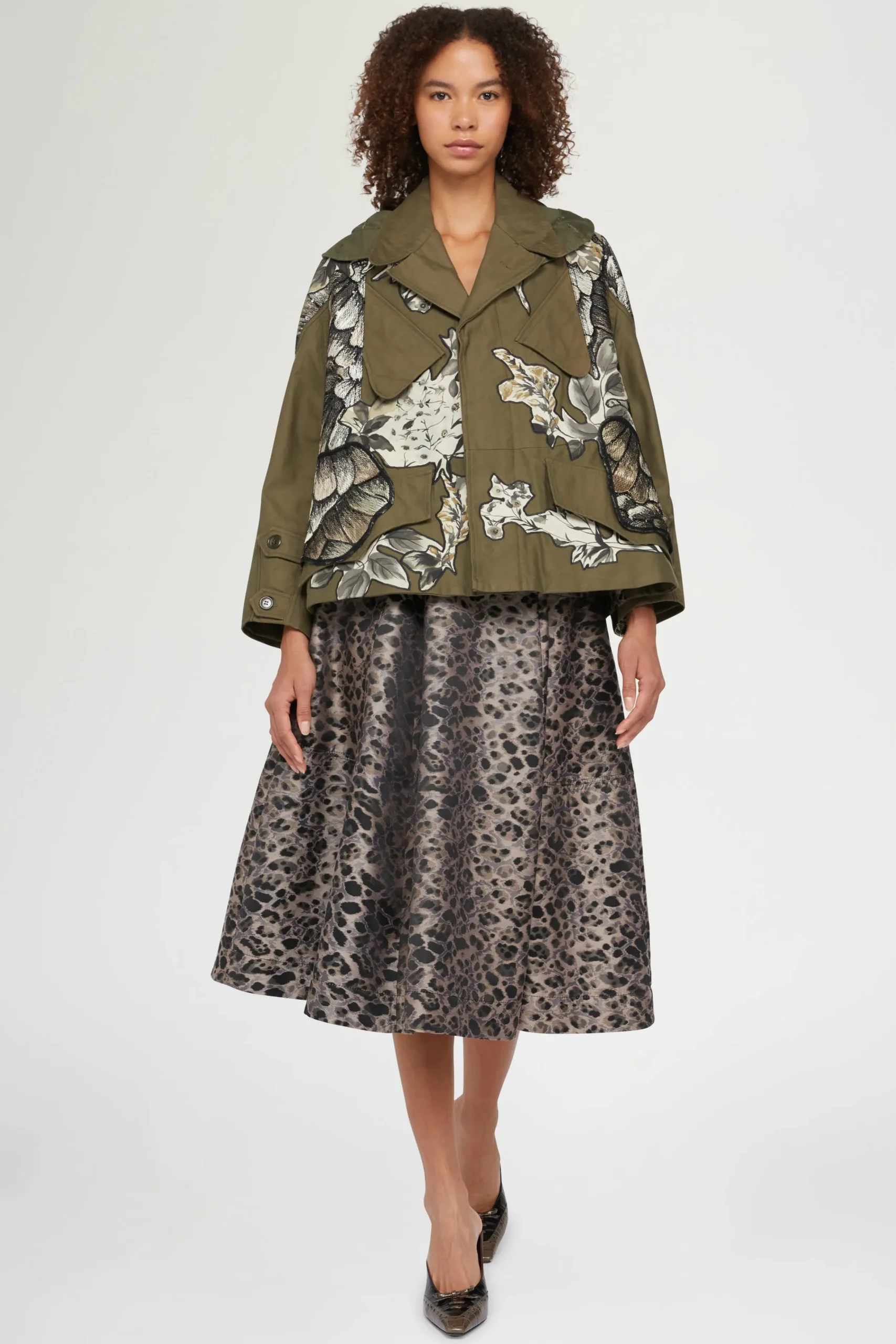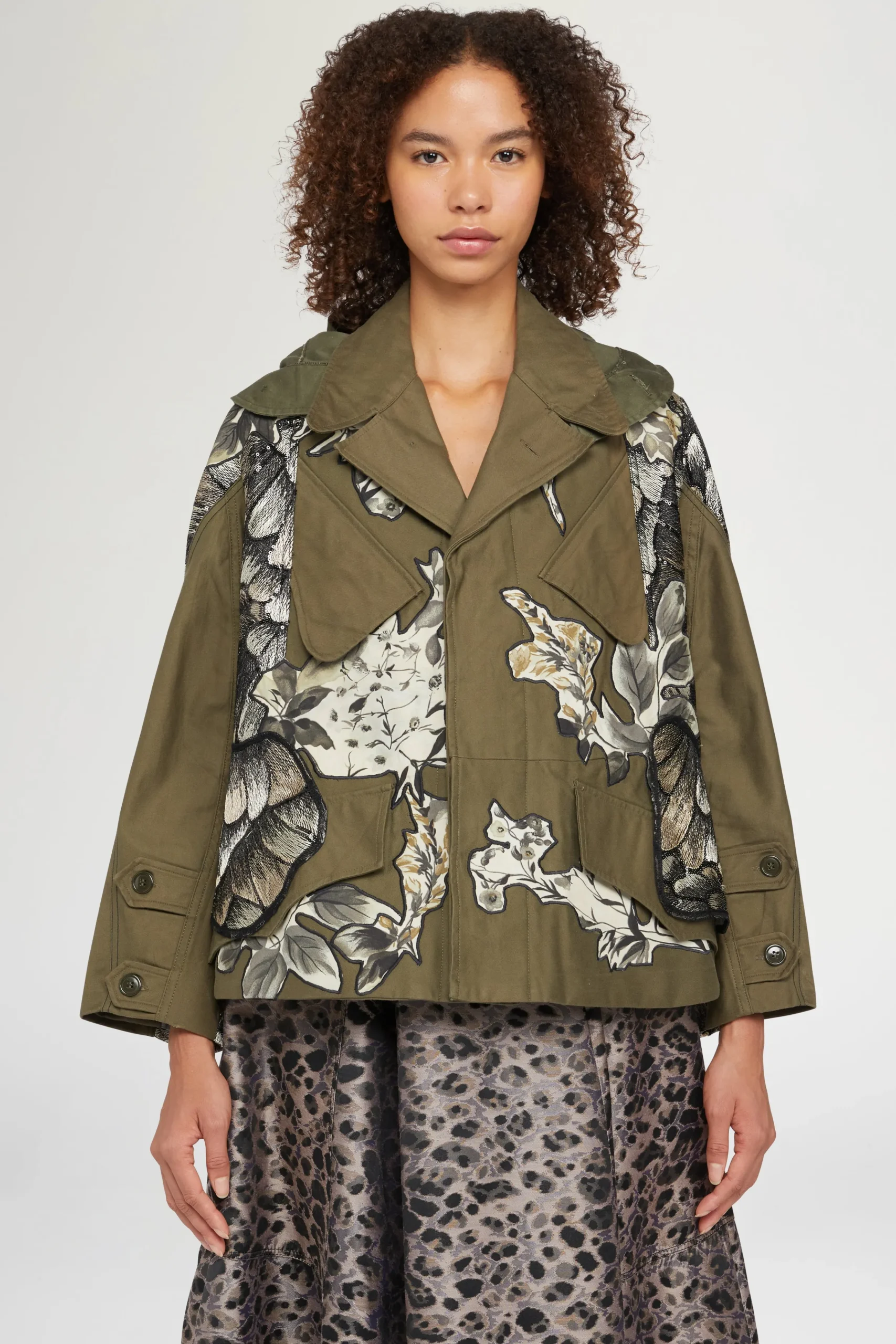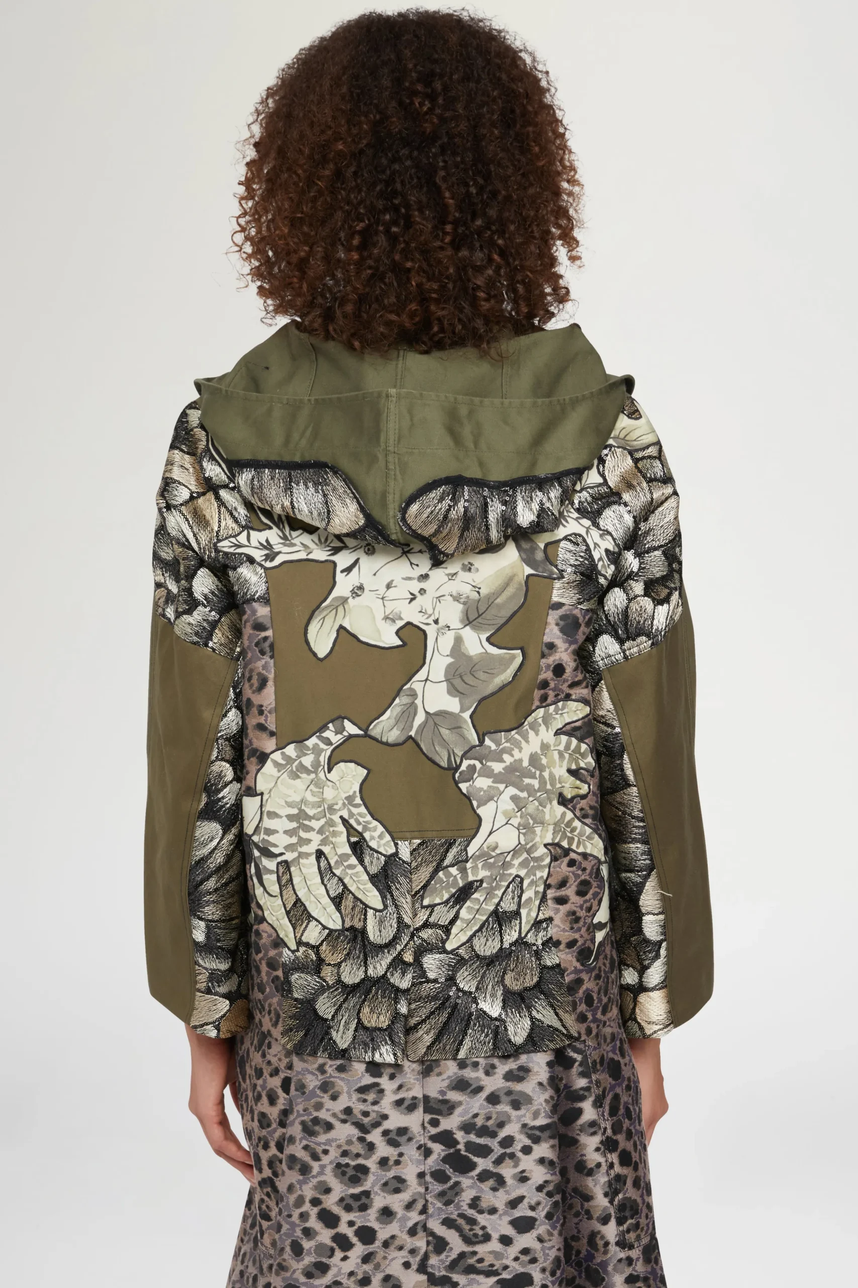 Parka corto verde militare in cotone con applicazioni floreali a contrasto e dettagli ricamati in rilievo. Design oversize con tasche frontali e bottoni decorativi su maniche e spalle.