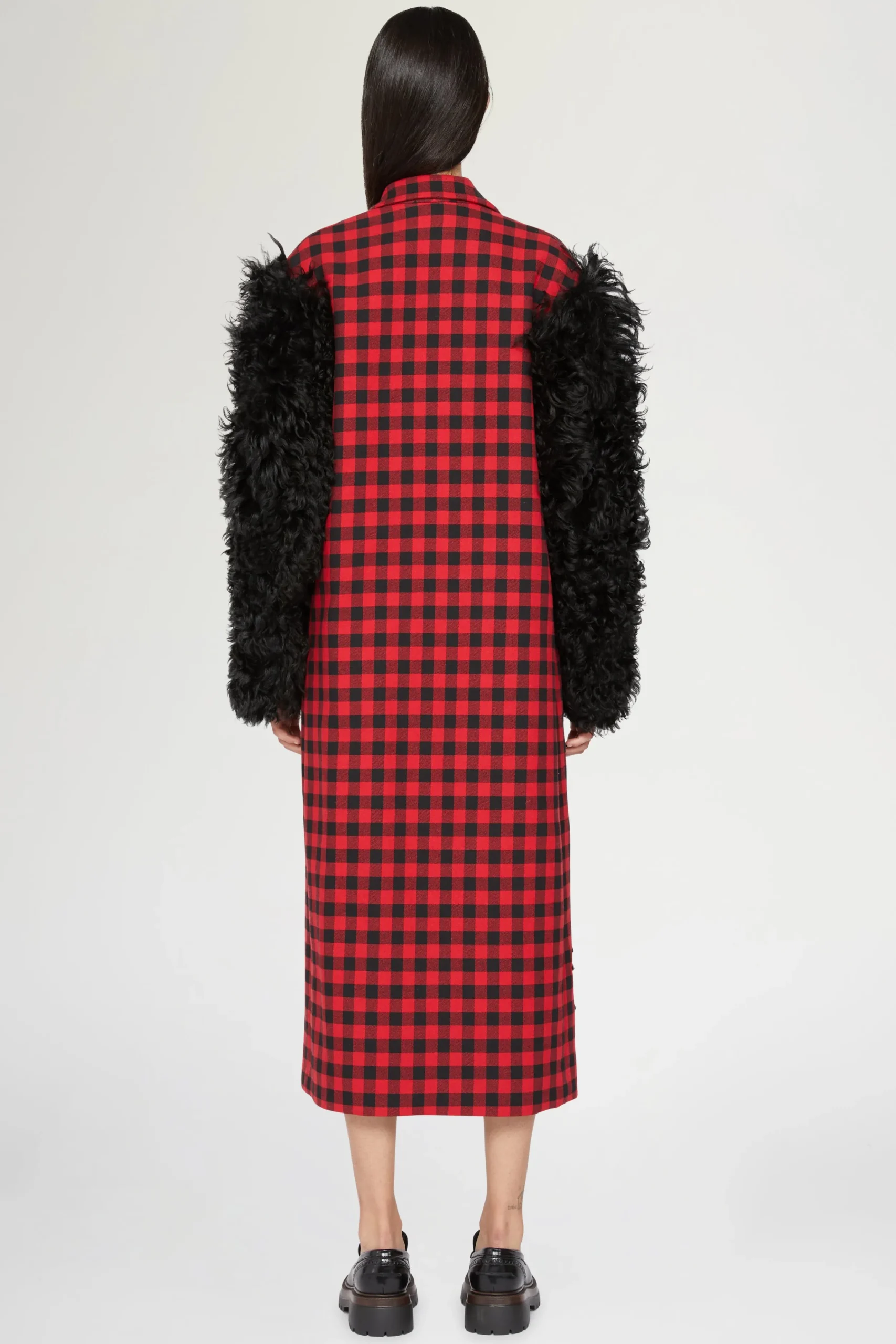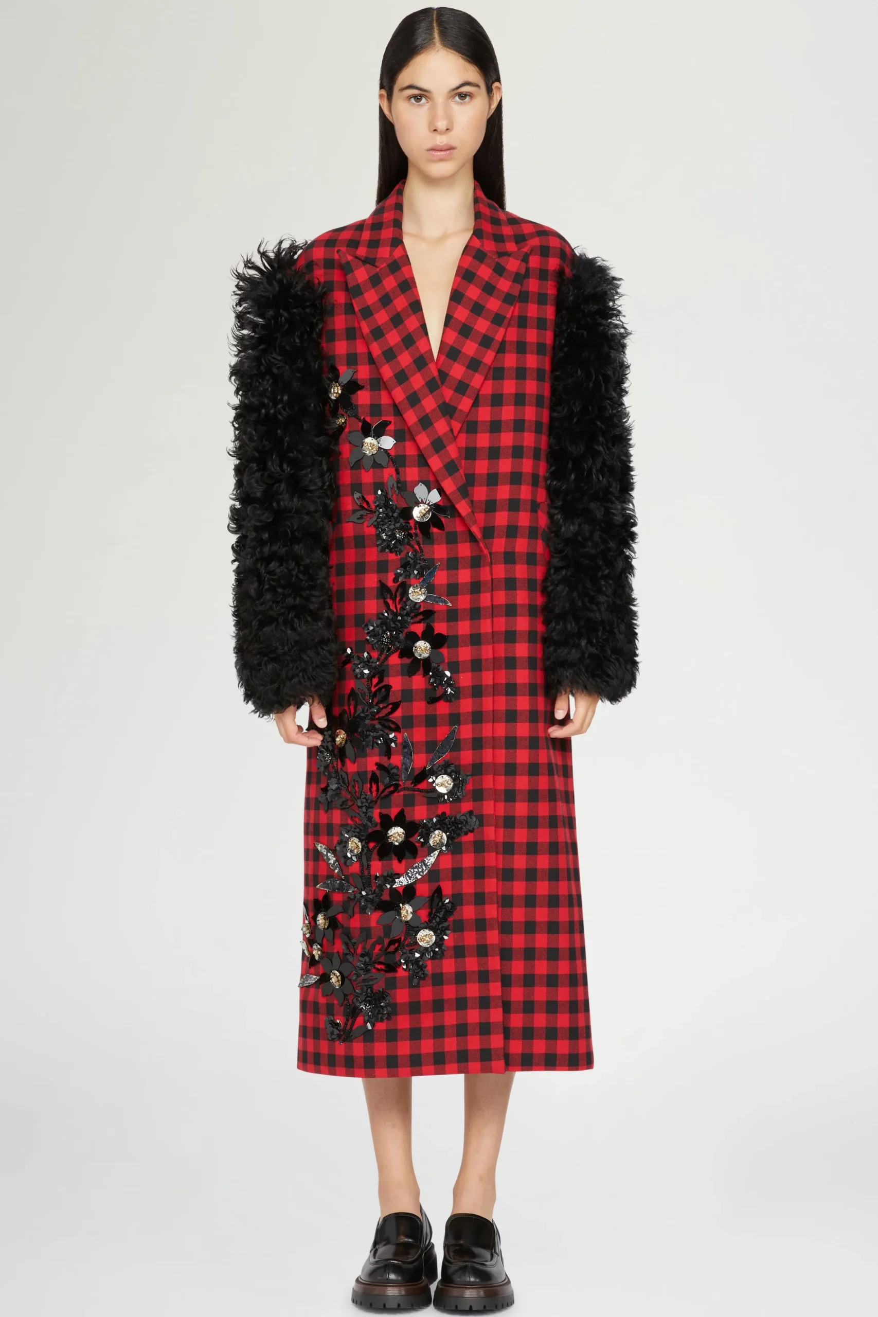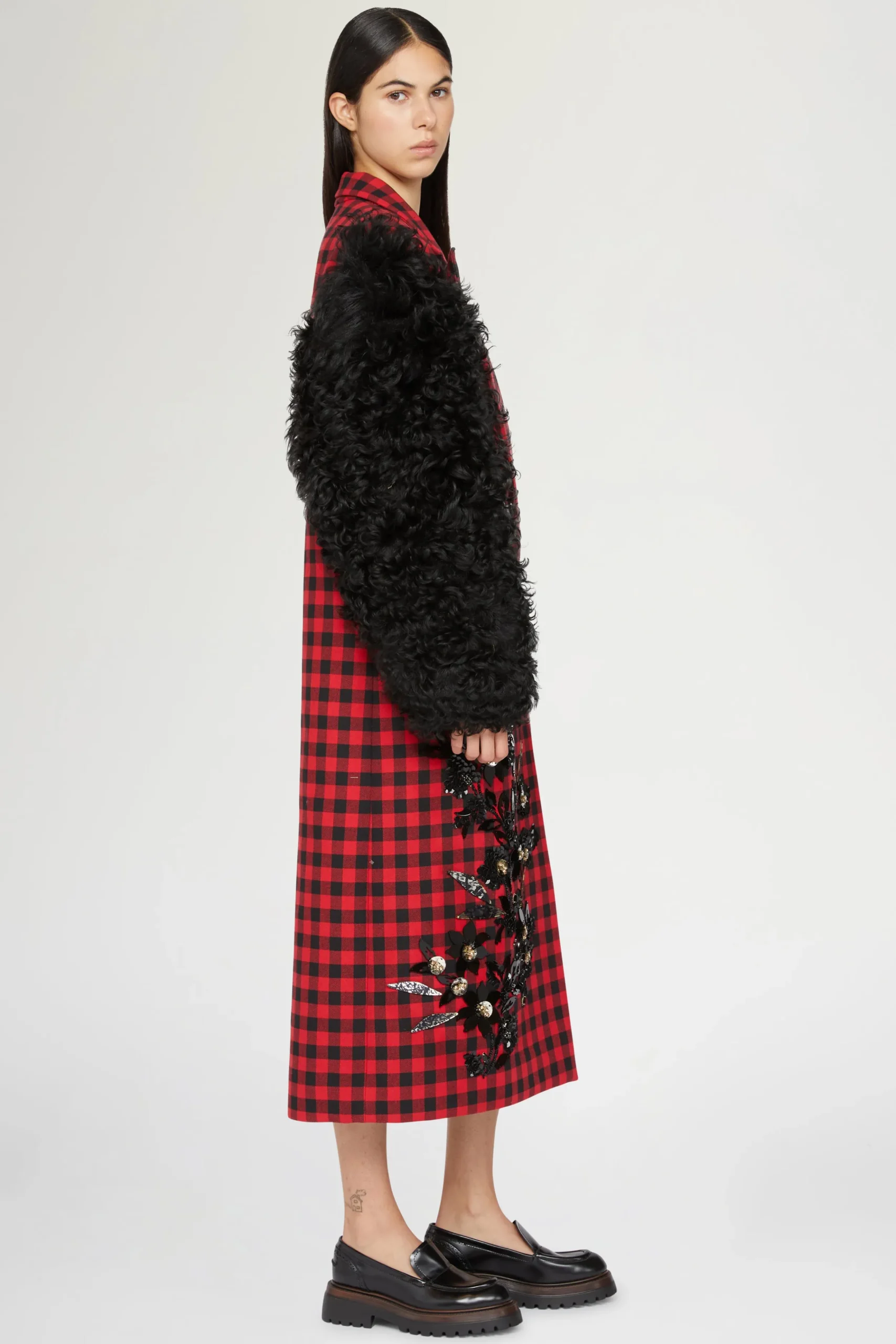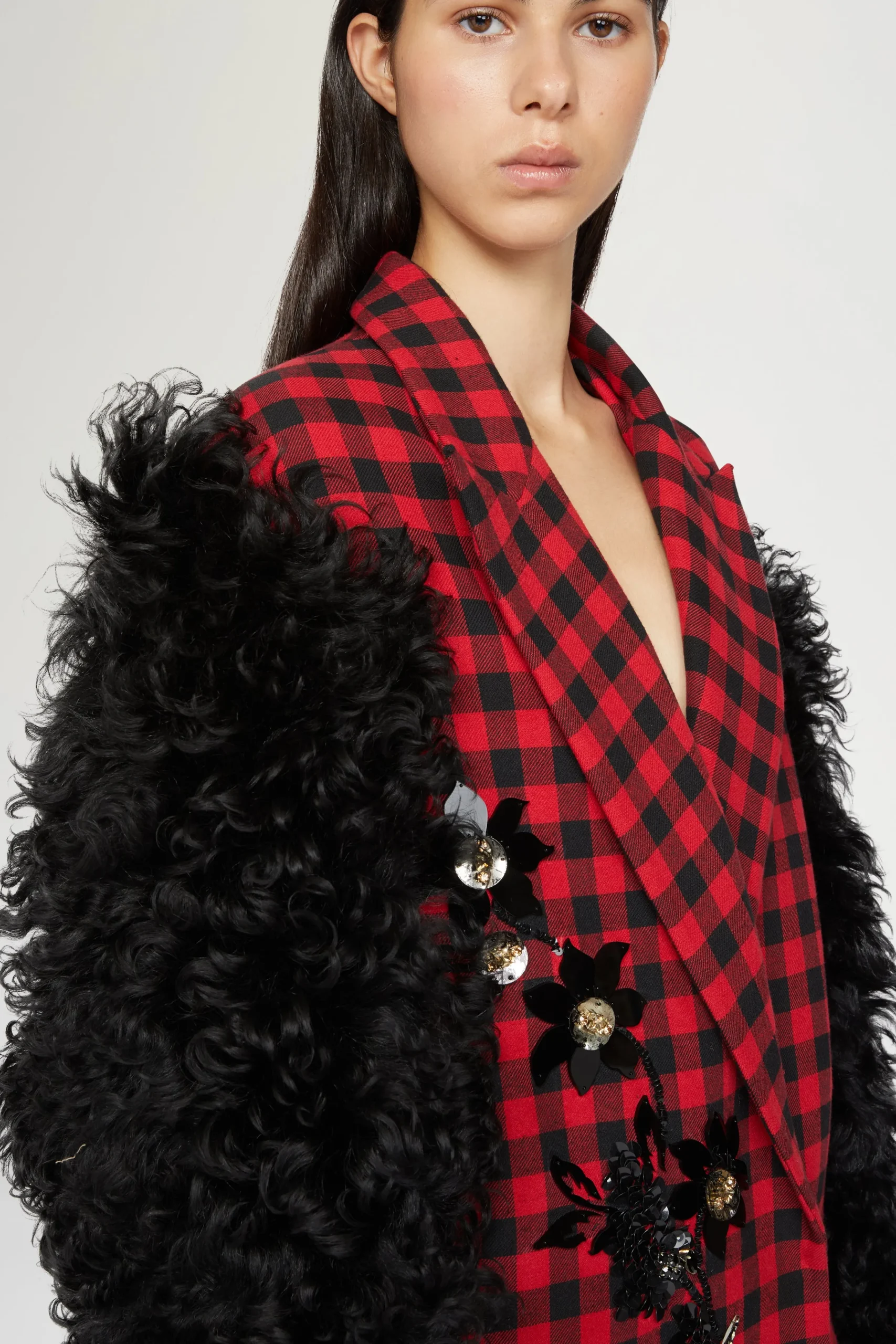 Cappotto a quadri rossi e neri con lussuose maniche in pelliccia di montone Kalgan e applicazioni floreali.