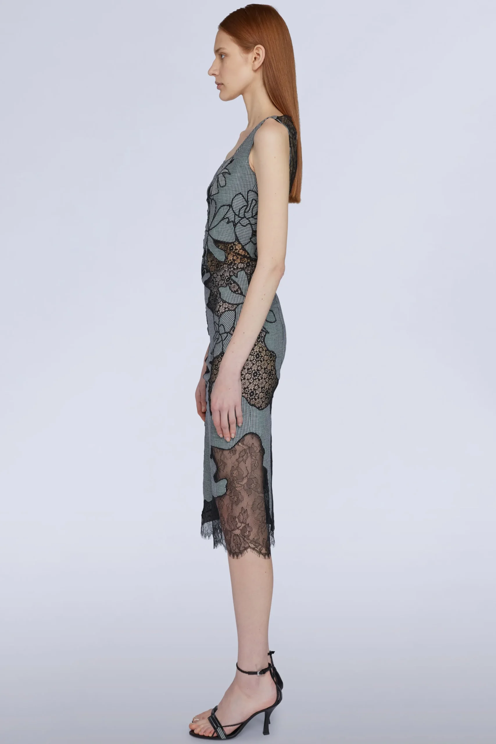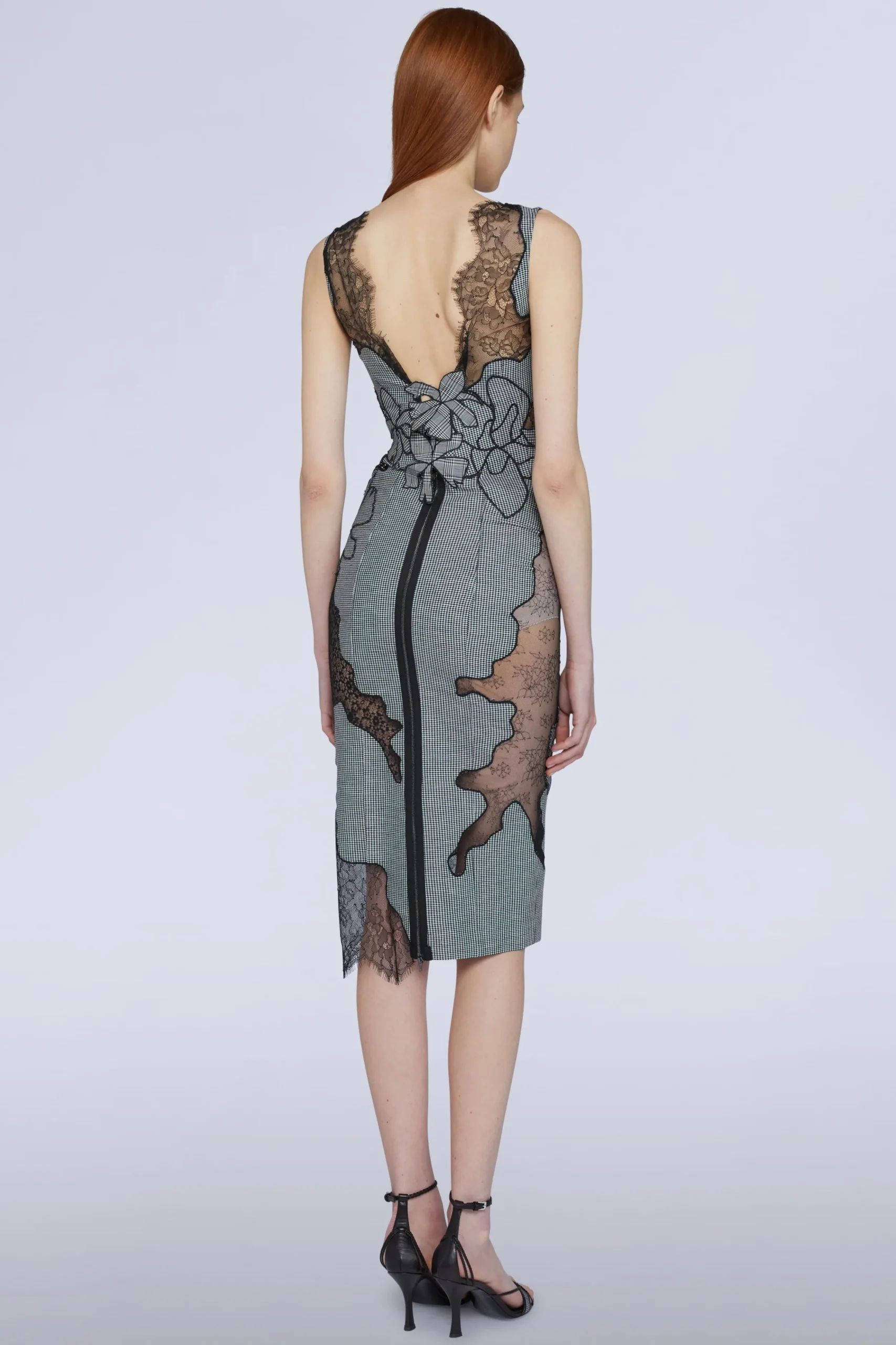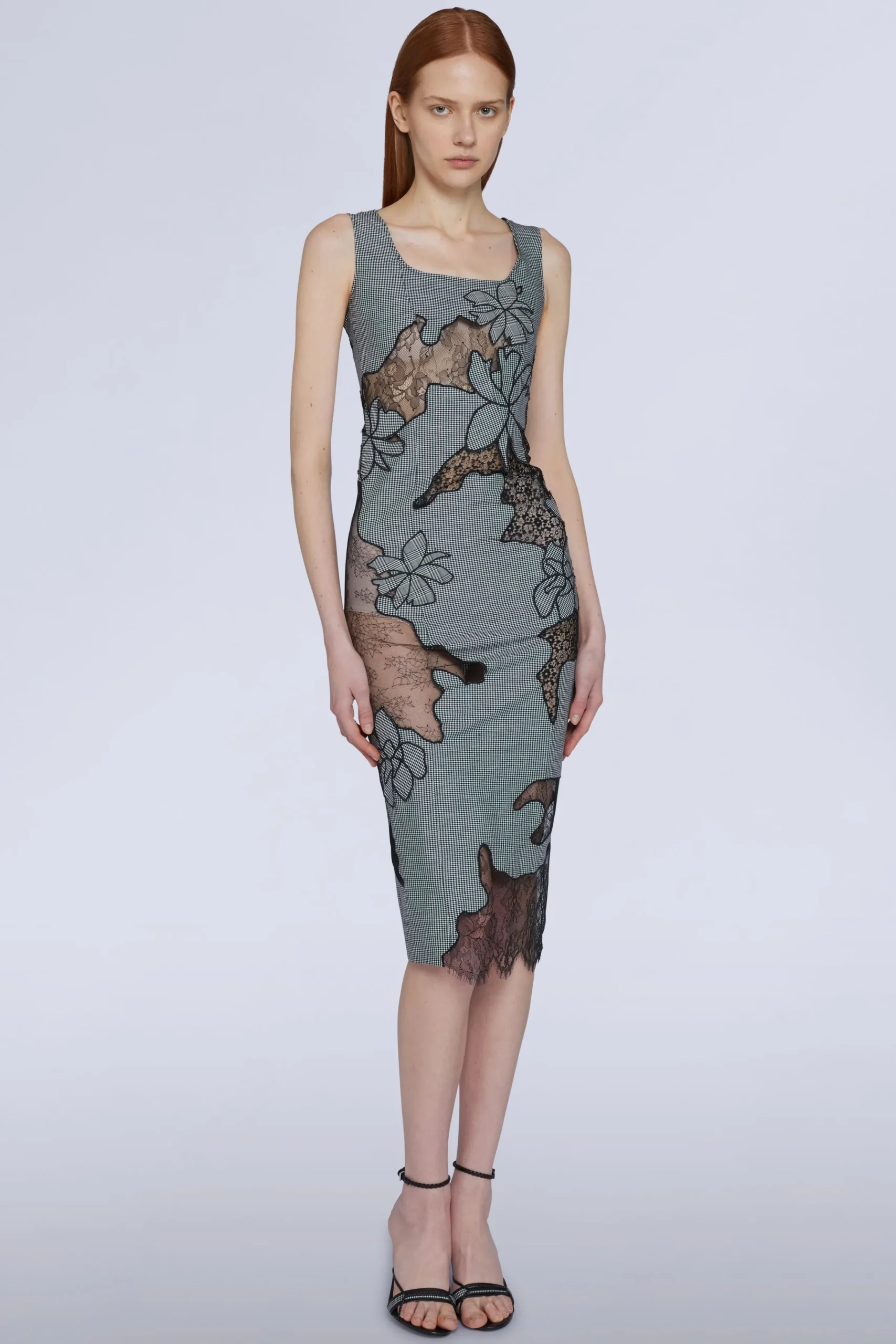 Abito midi con motivo a quadri, con dettagli in pizzo e trasparenze.