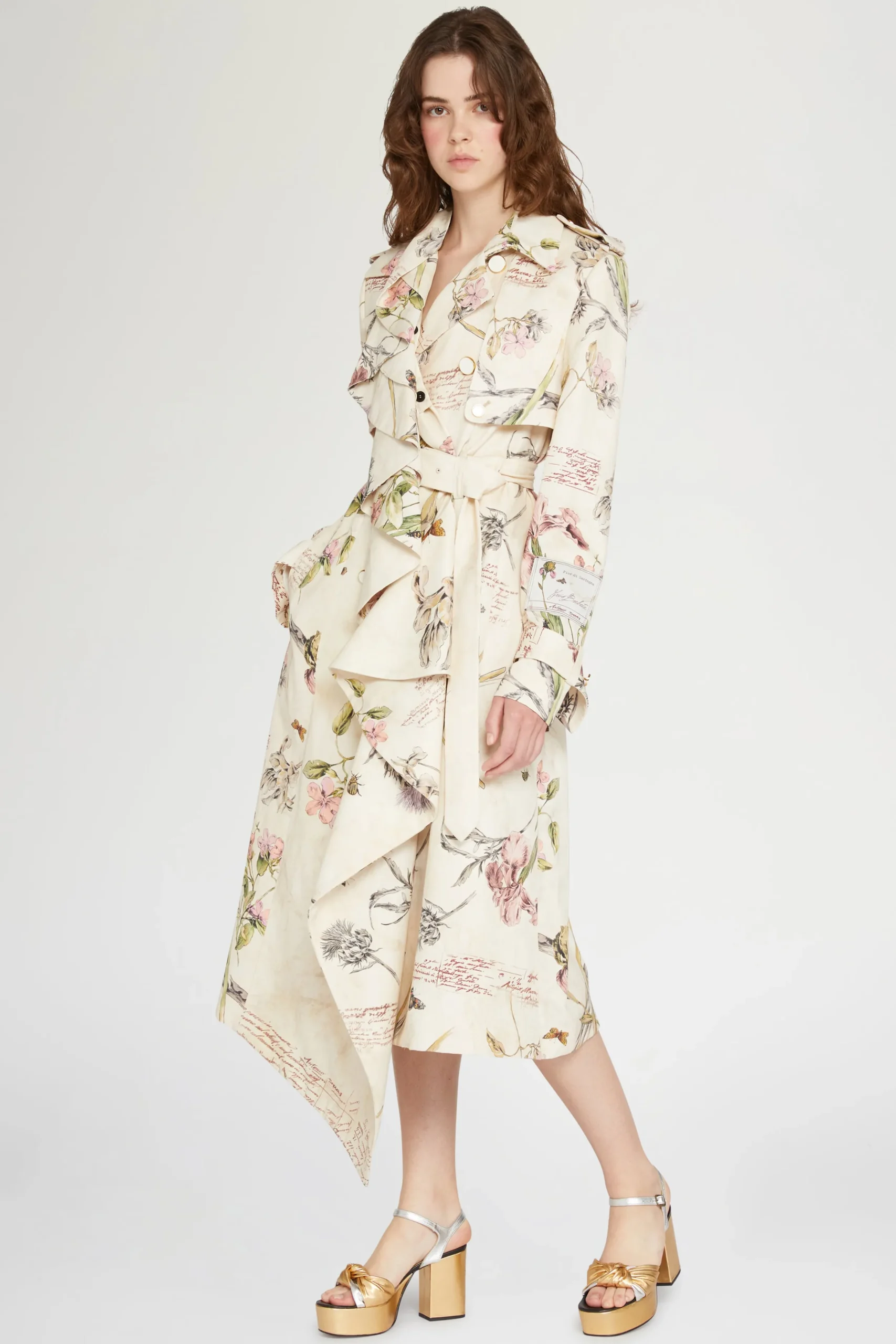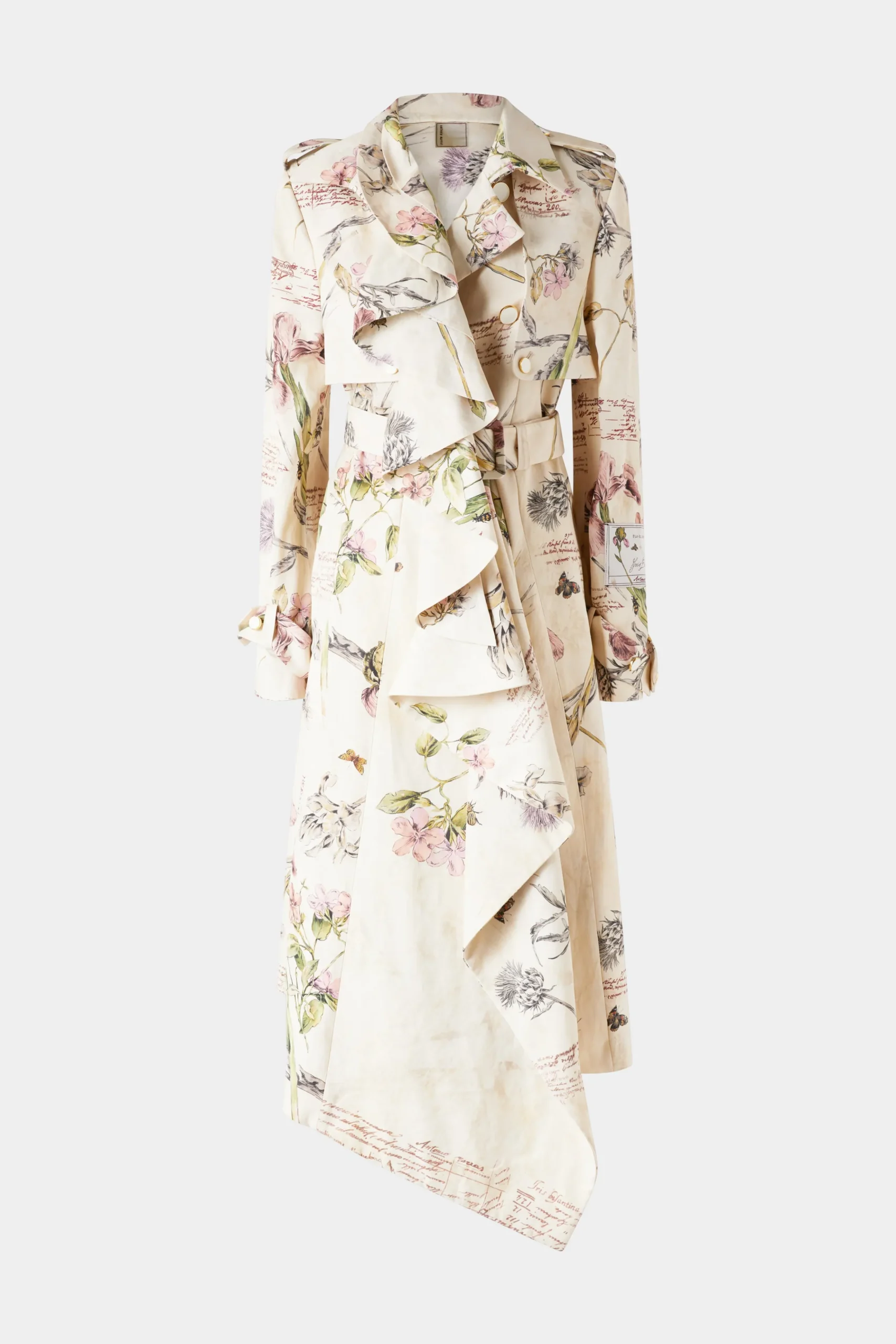 Cappotto lungo asimmetrico con cintura coordinata, volant staccabili e delicata stampa floreale.
