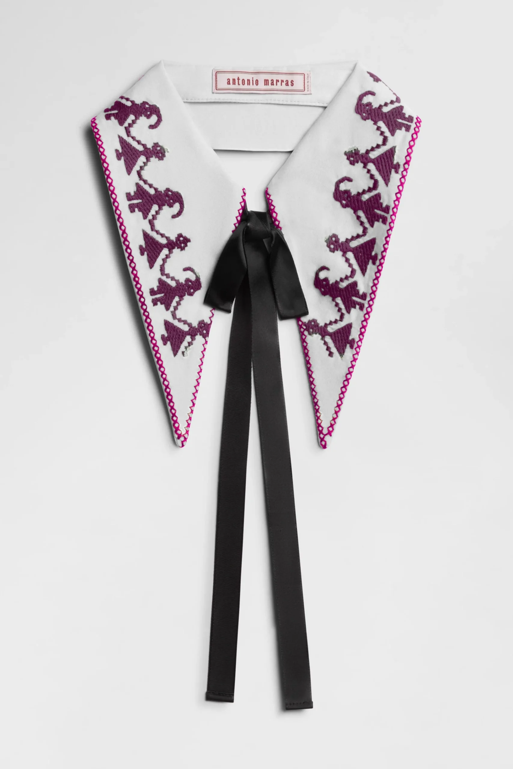 Colletto bianco staccabile in cotone 100% con finiture in pizzo rosso, disegno ricamato bordeaux e cravatta nera a nastro.