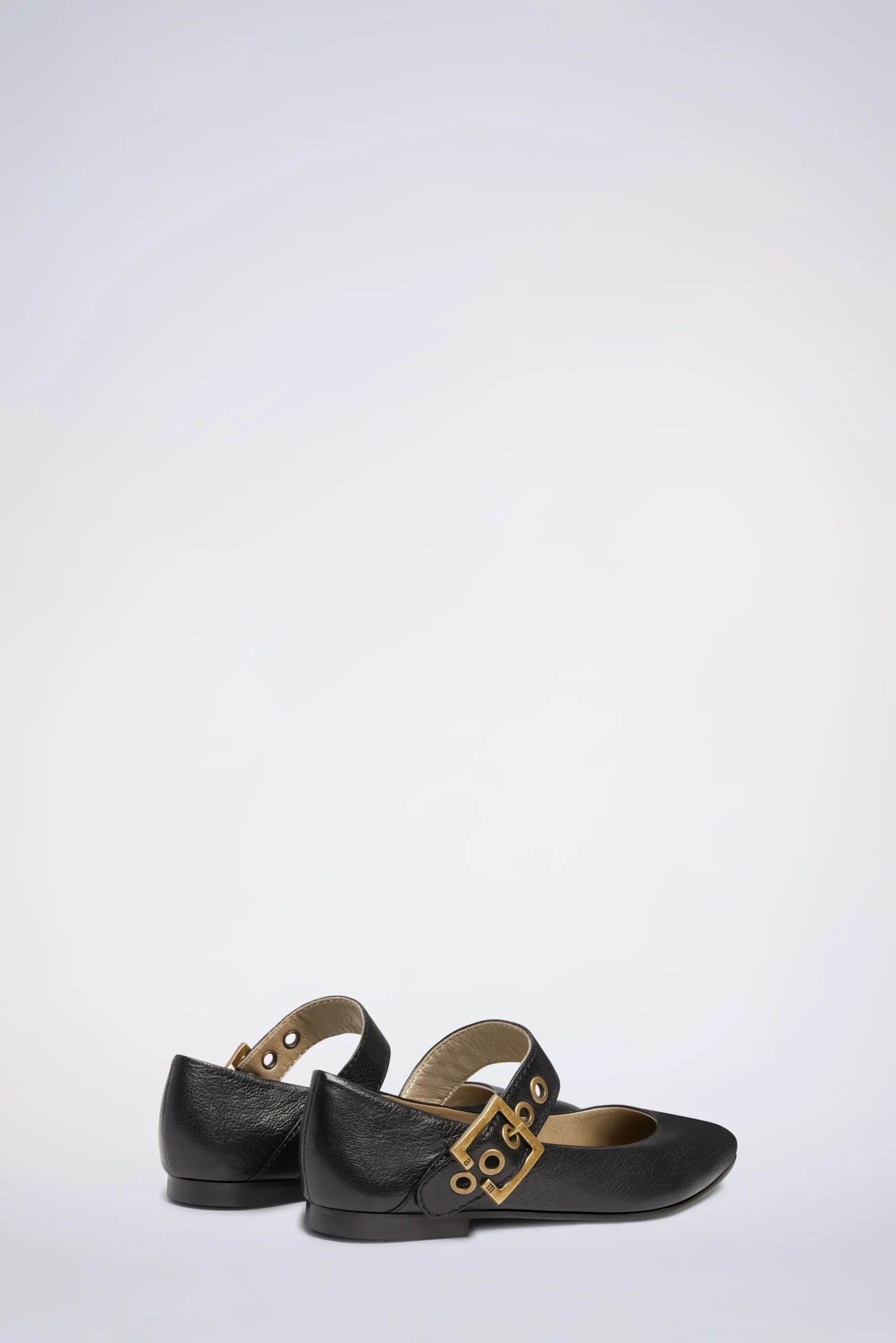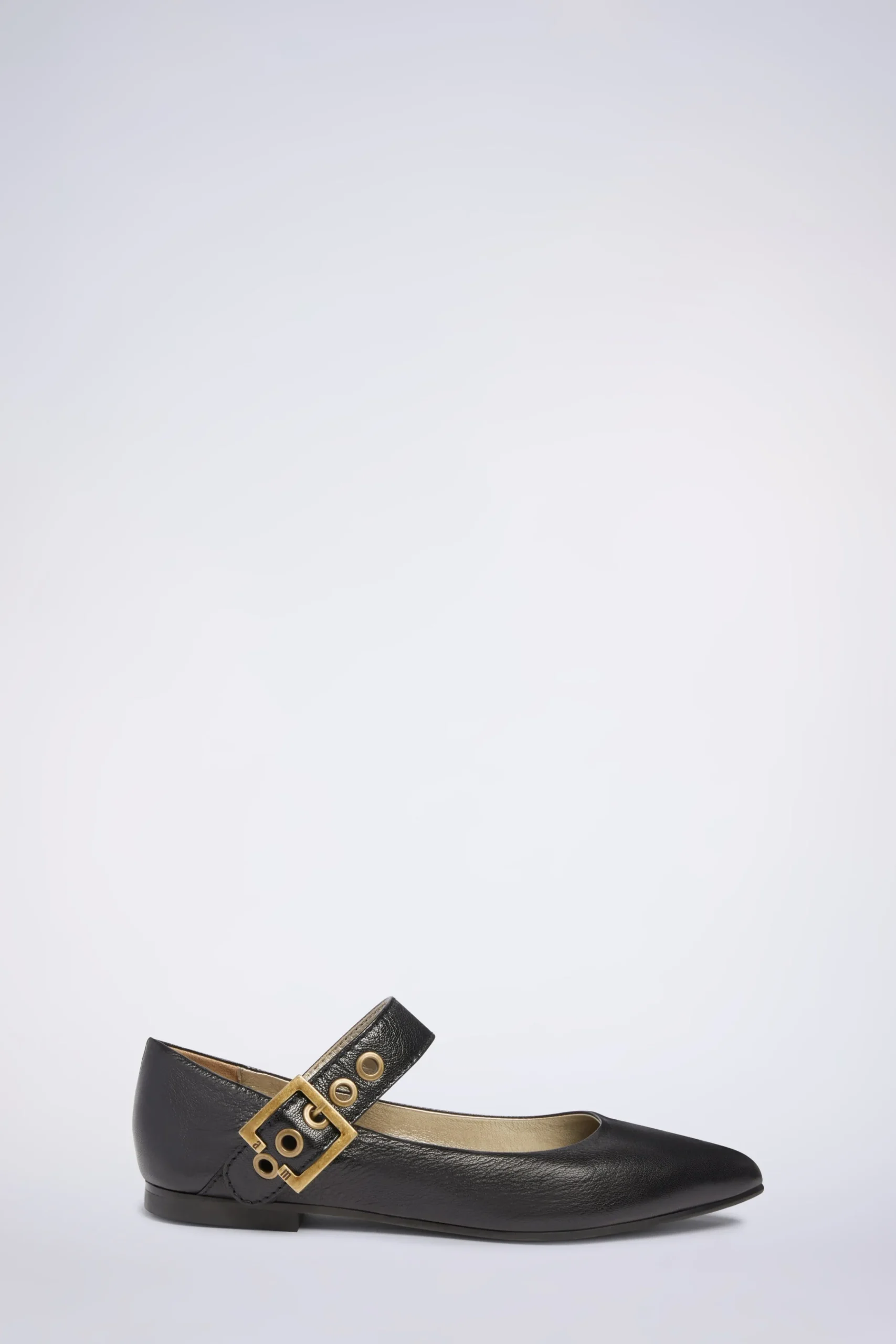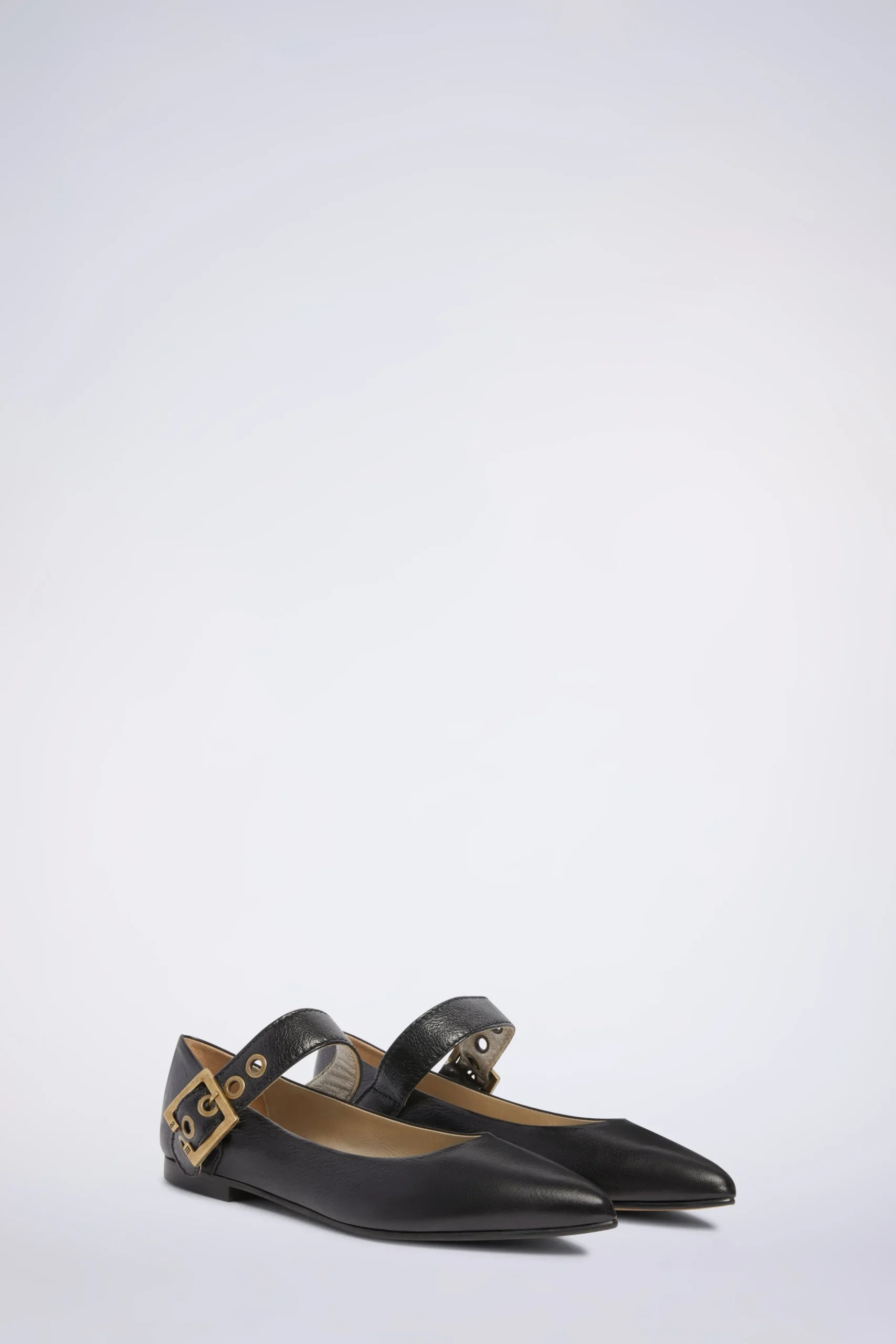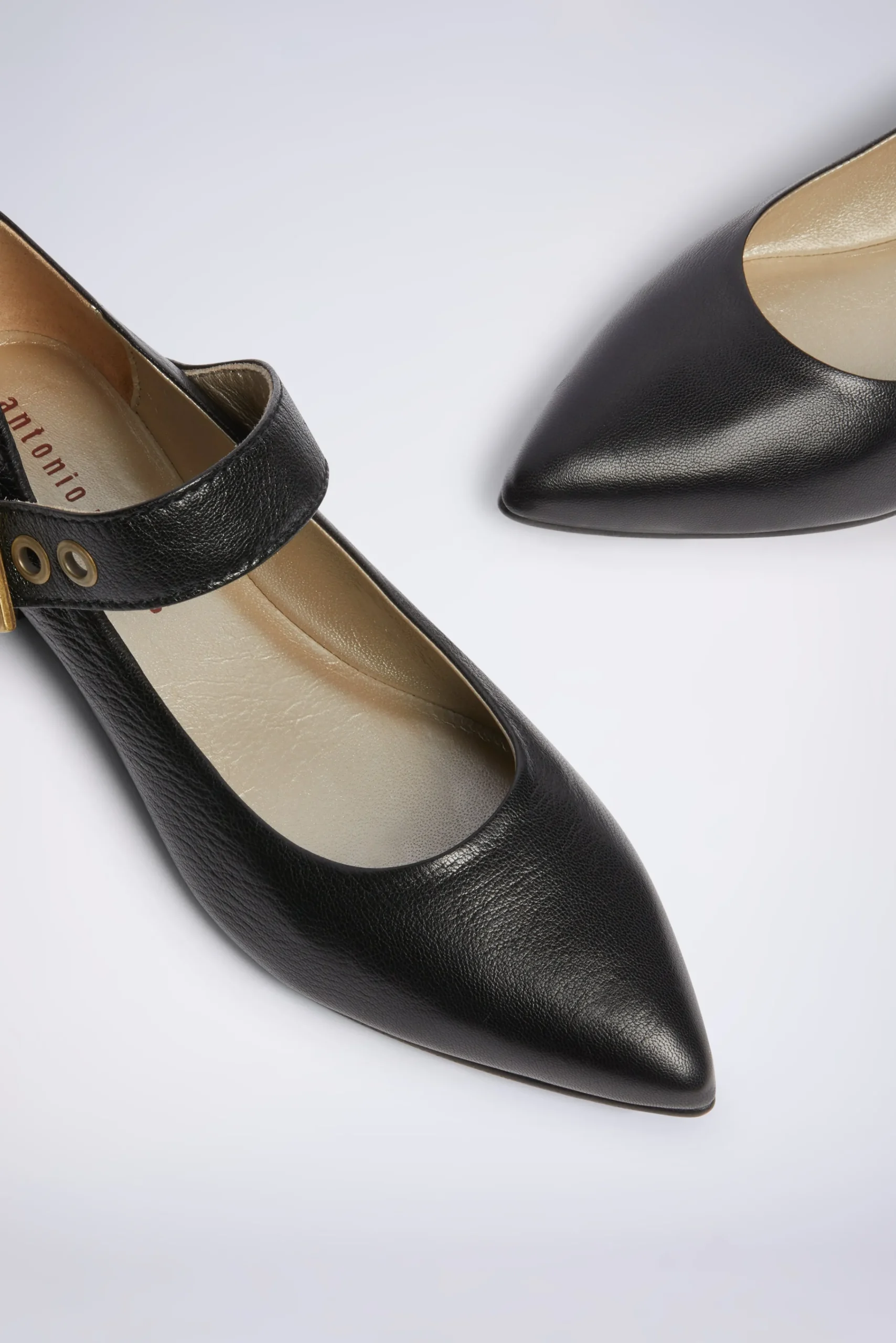 Ballerine in pelle nera con punta affusolata e cinturino morbido.