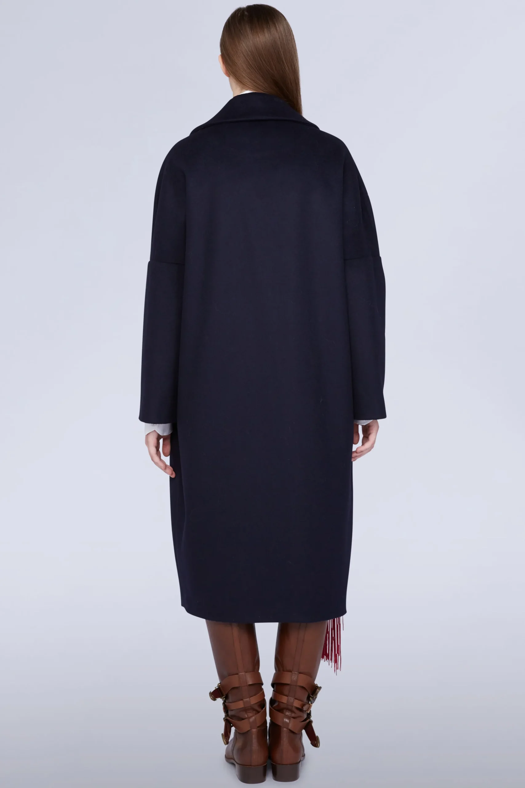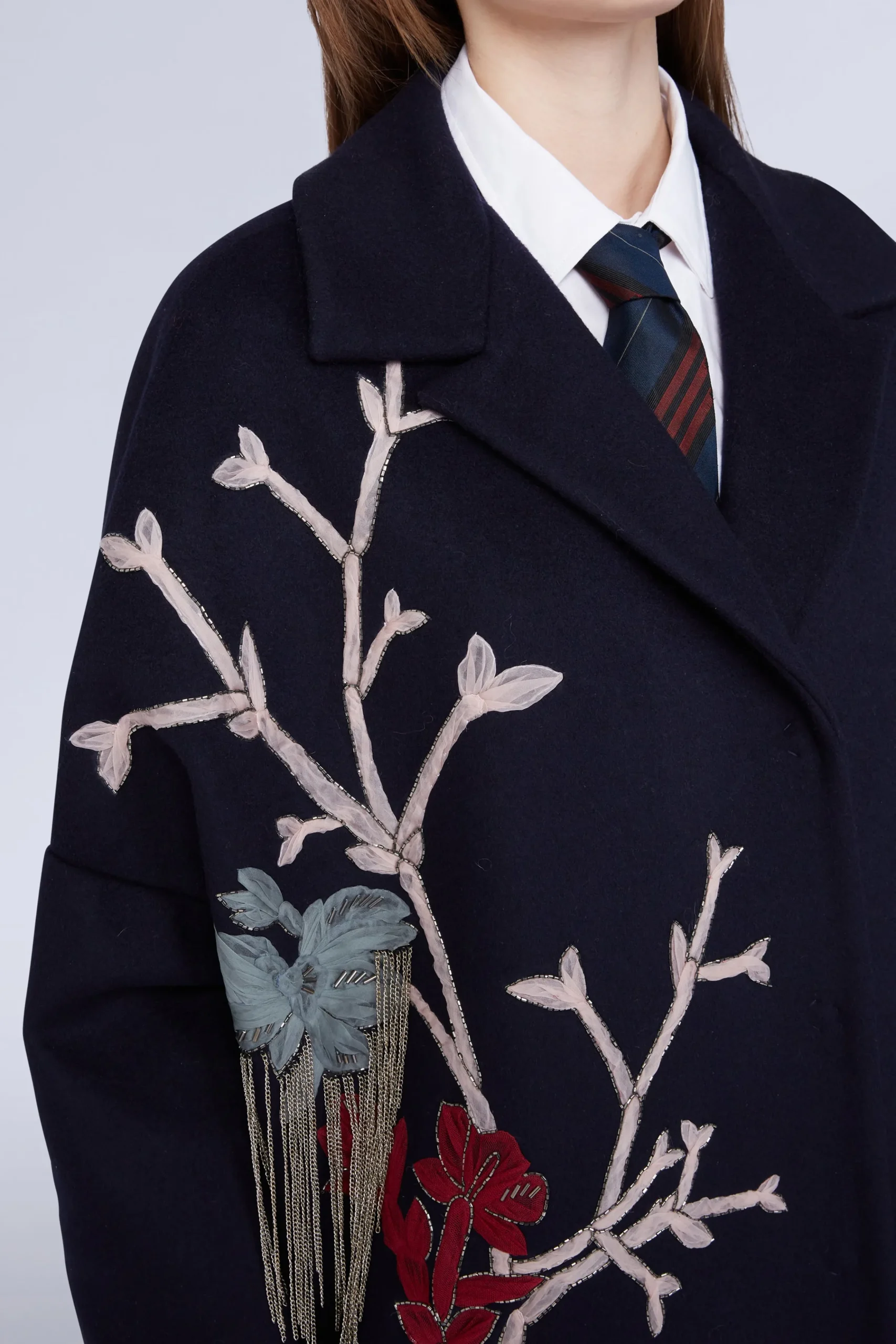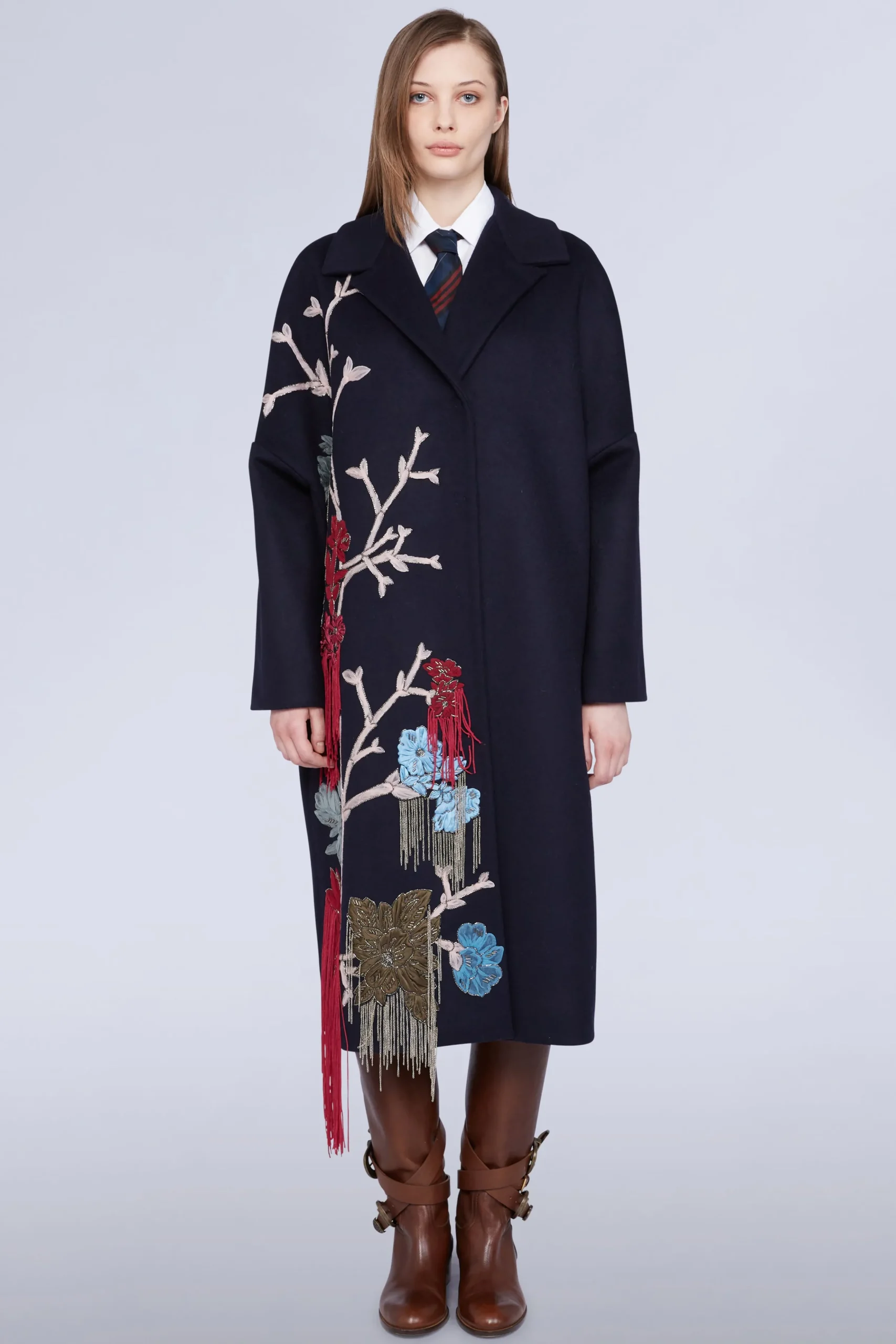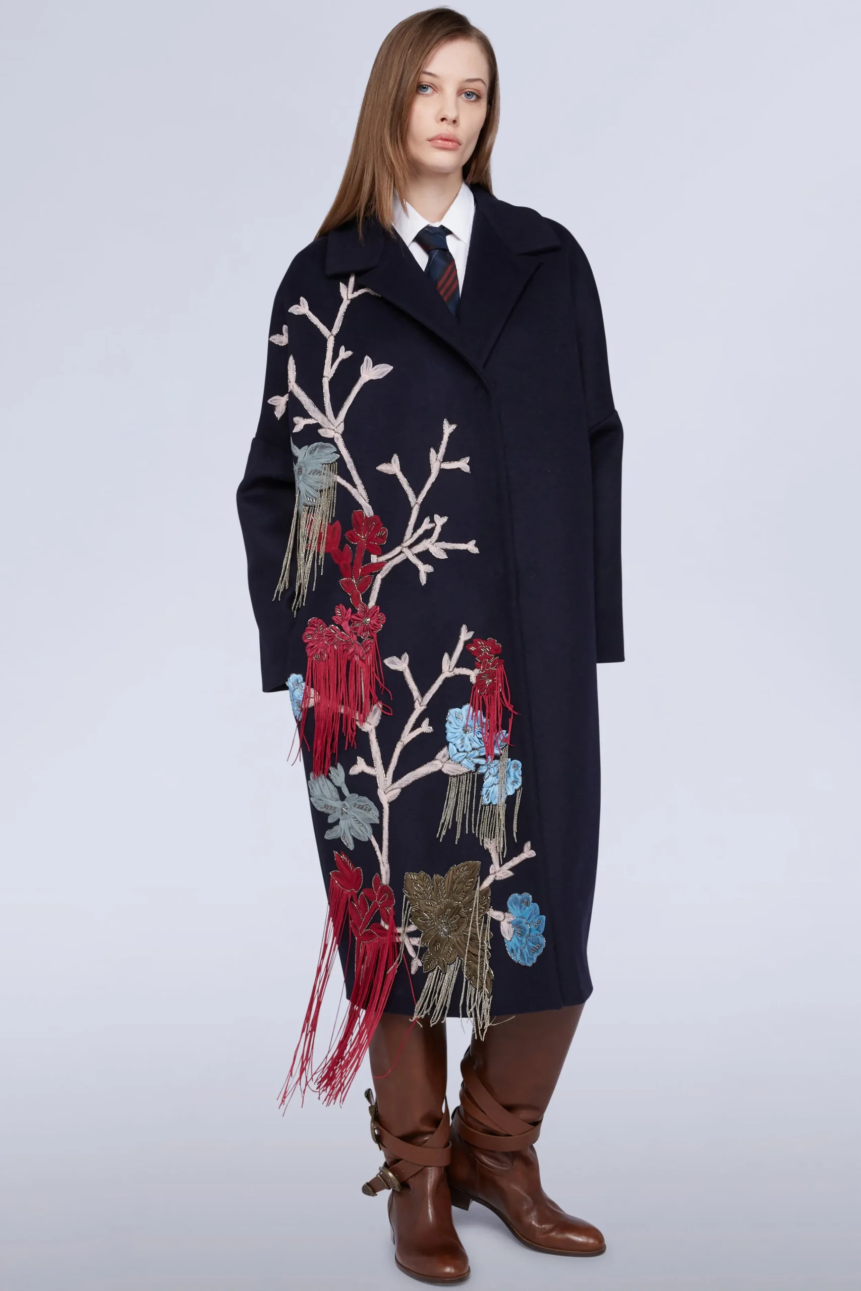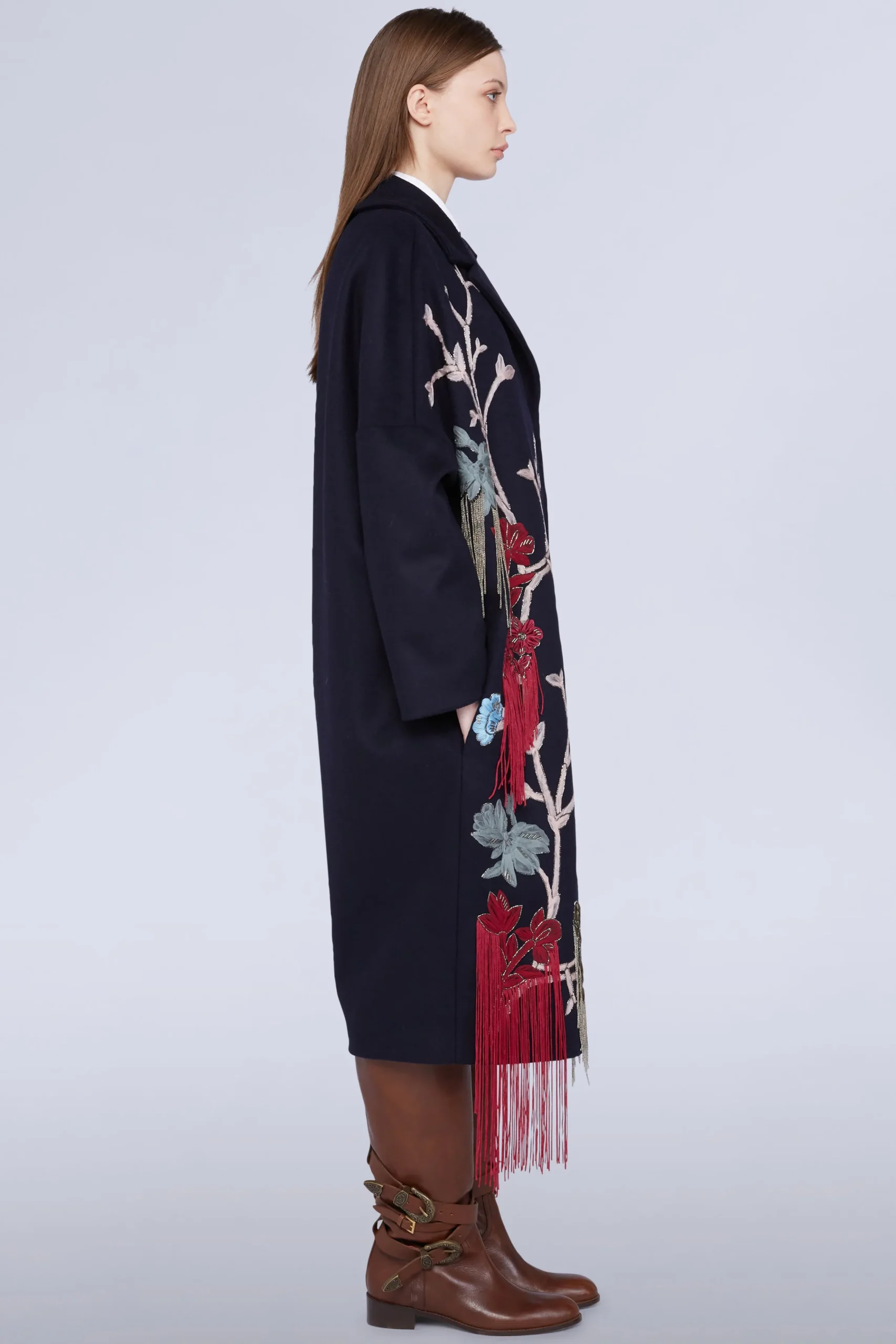 Cappotto blu scuro da donna vestibilità oversize, caratterizzato da vivaci ricami floreali con dettagli con frange per un look di tendenza.